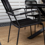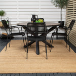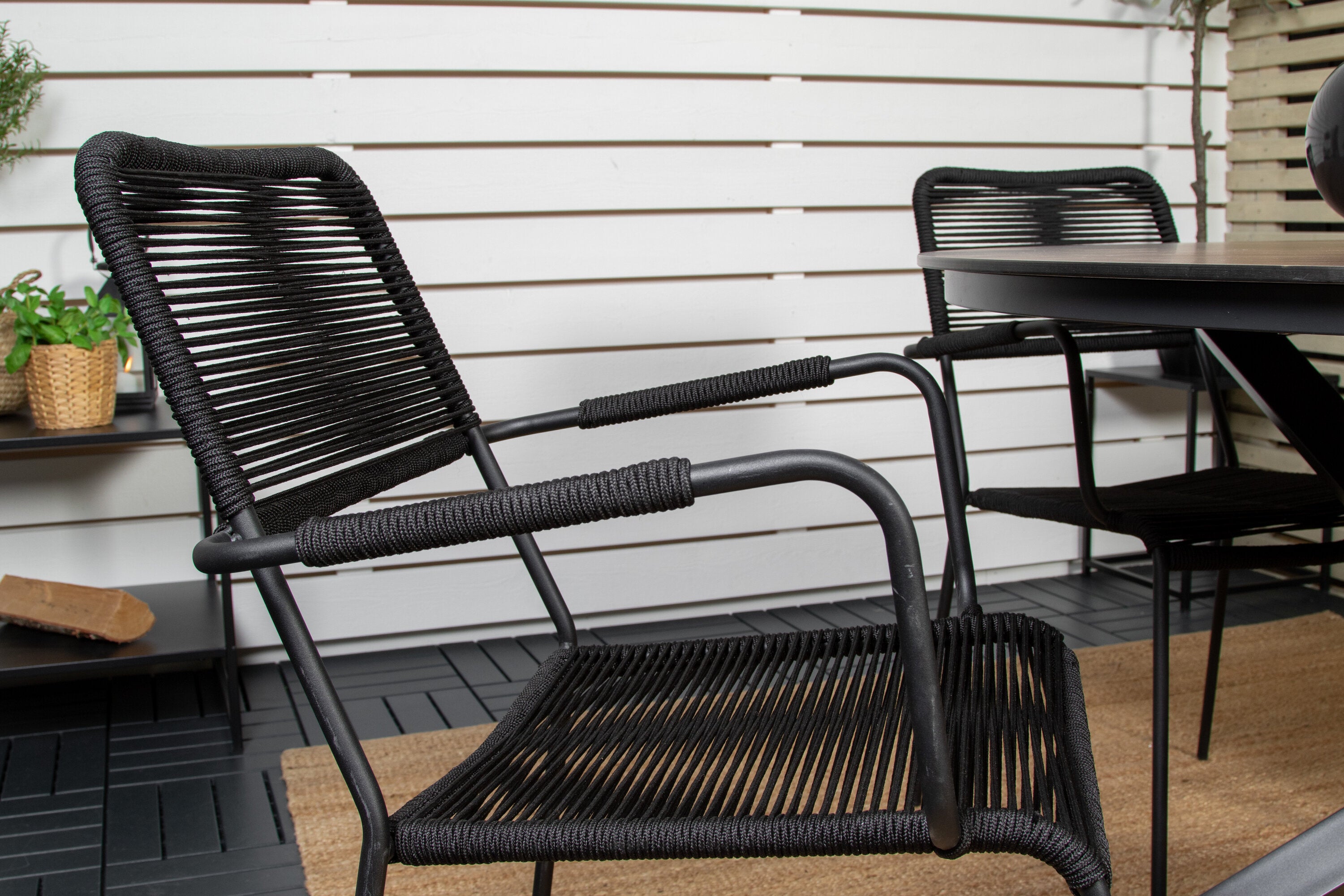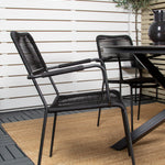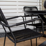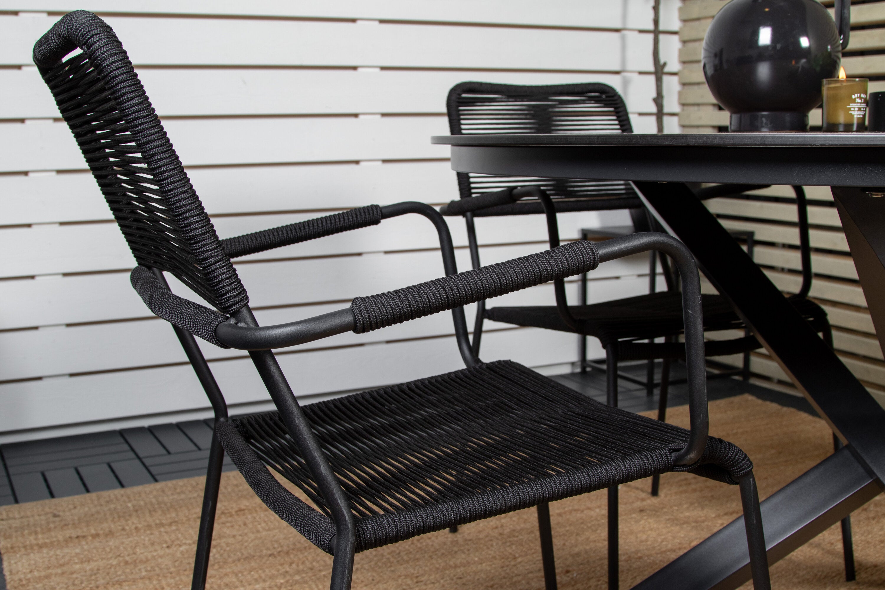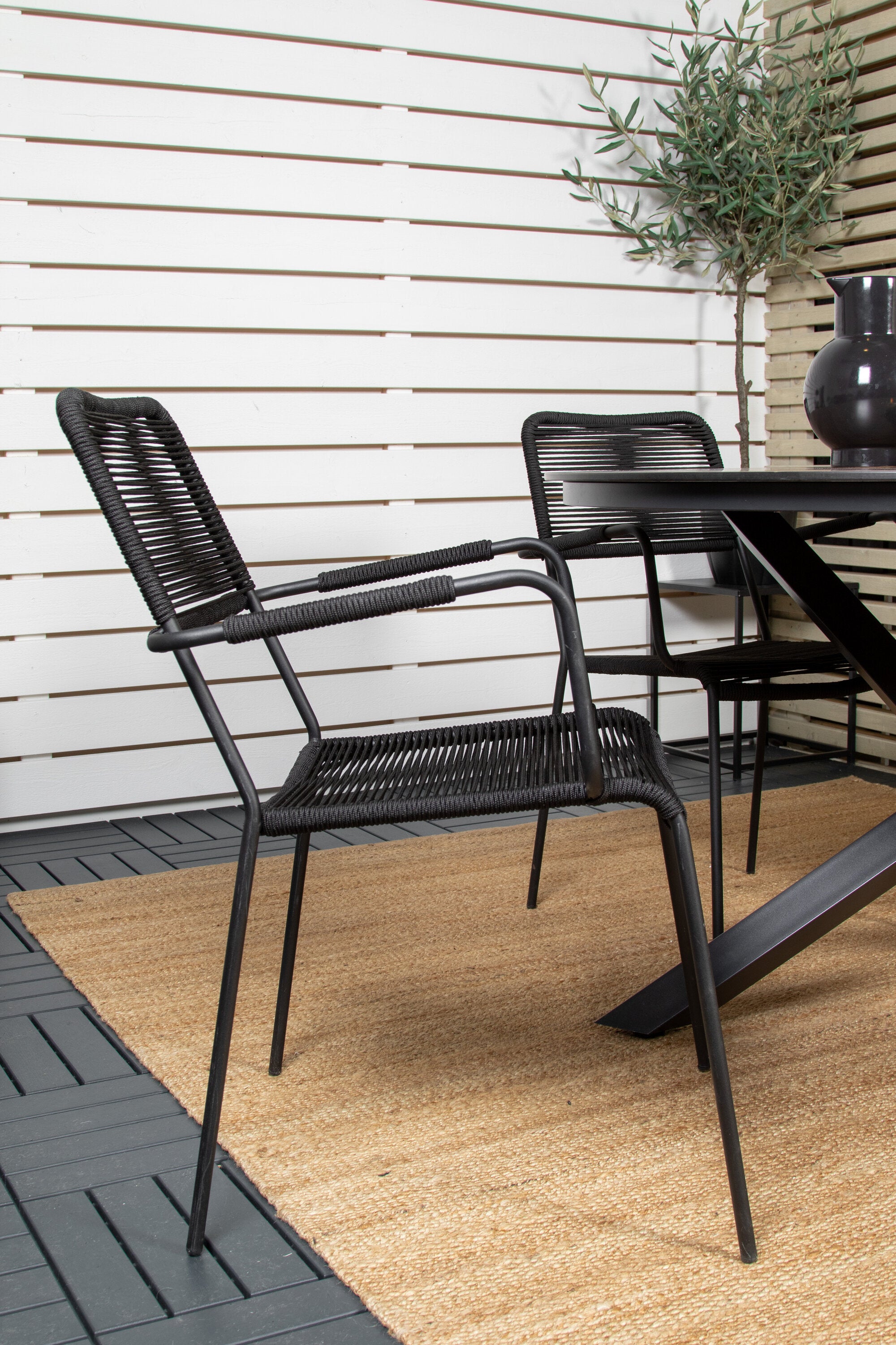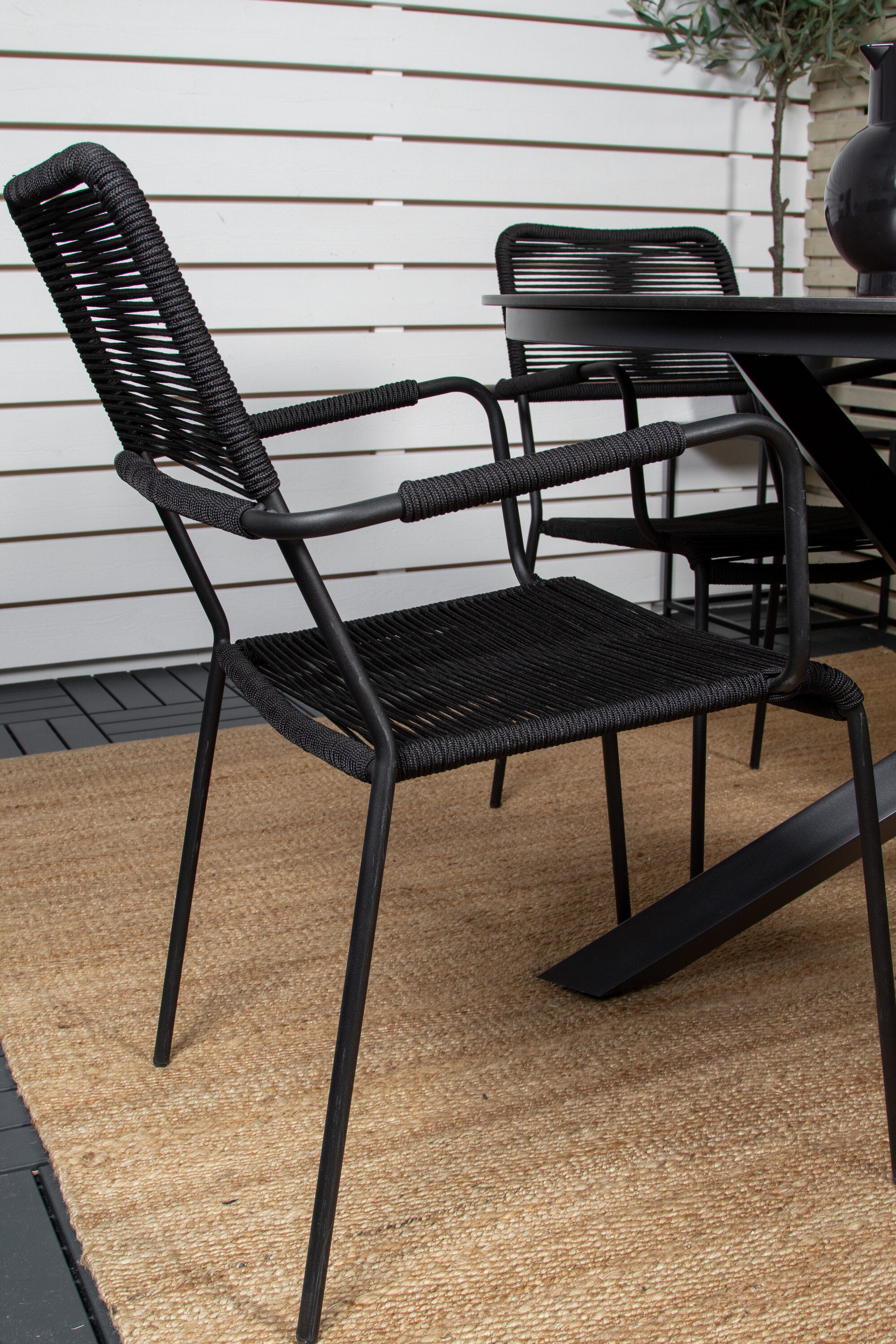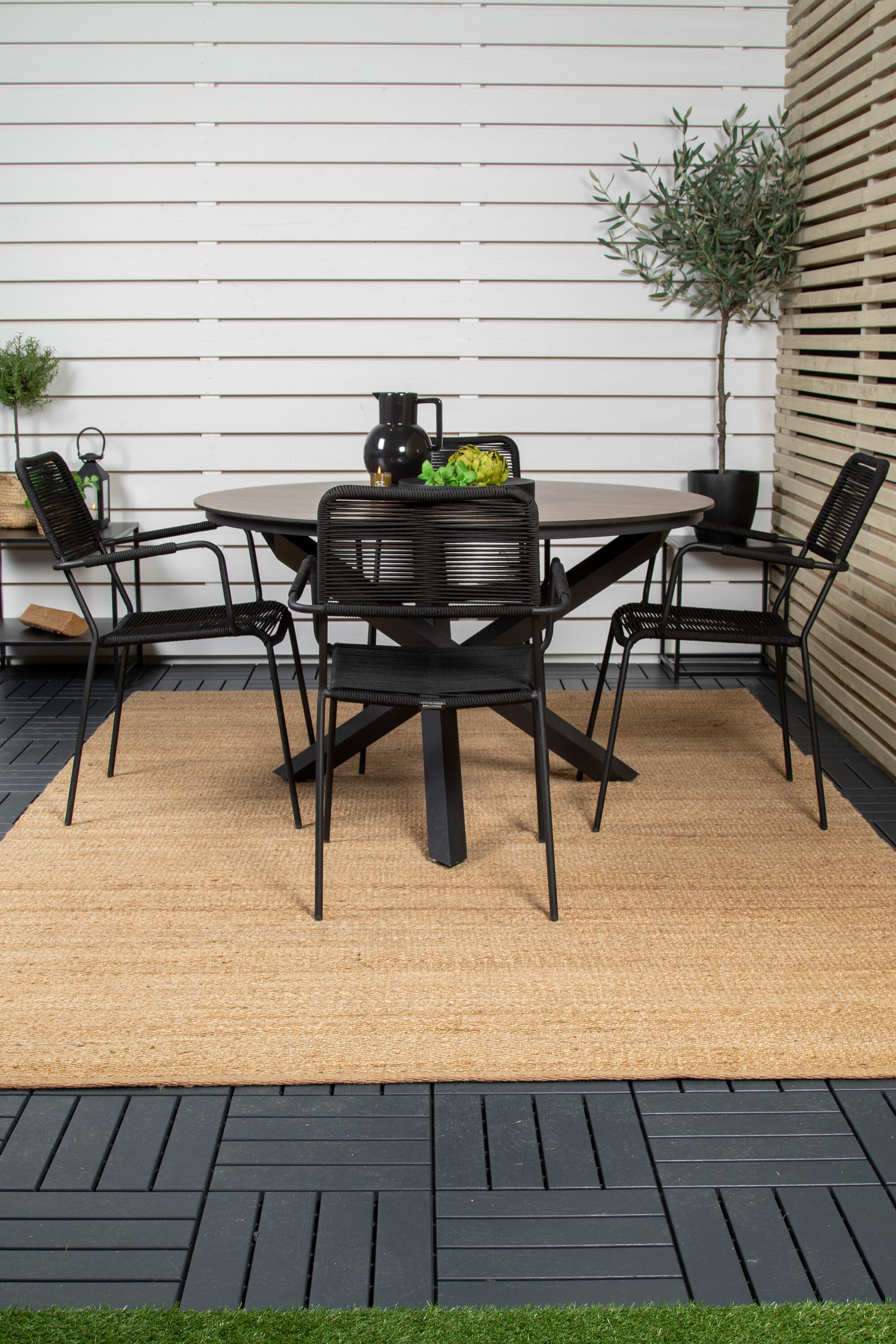 Klasická skupina potravin, která se hodí do většiny domácností! Jídelní stůl lama spolu s jídelními židlemi ze série Lindos se sedákem z černého tkaného provazu. Jako stvořené pro ty, kteří chtějí ve venkovním prostoru nebo na balkóně vytvořit útulný a moderní pocit.