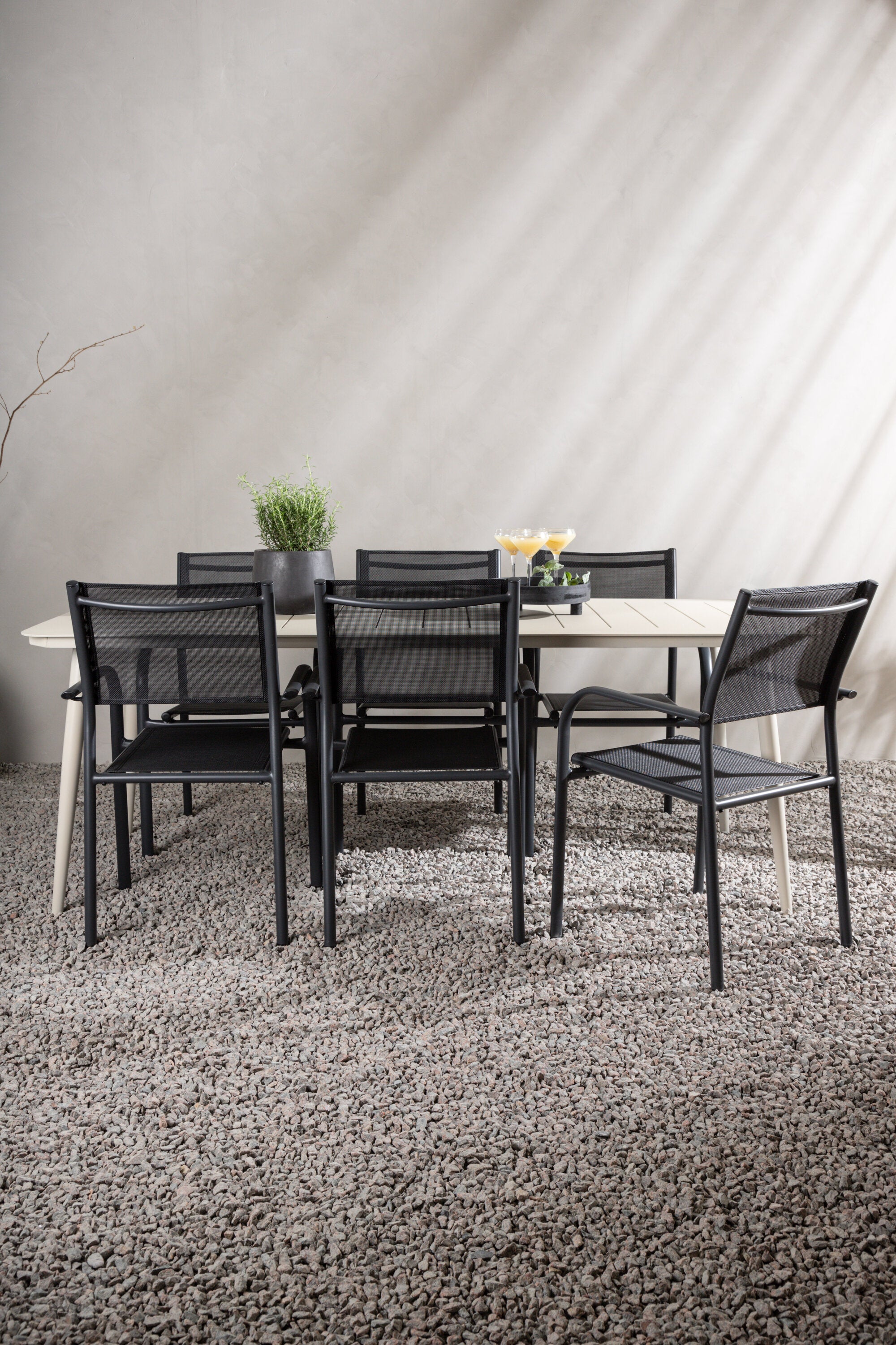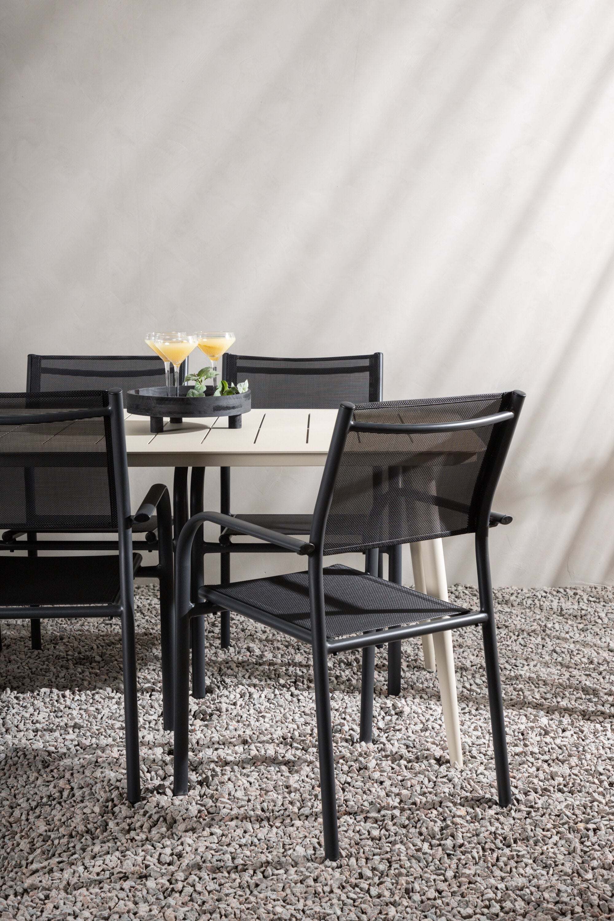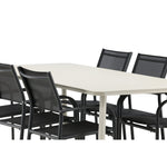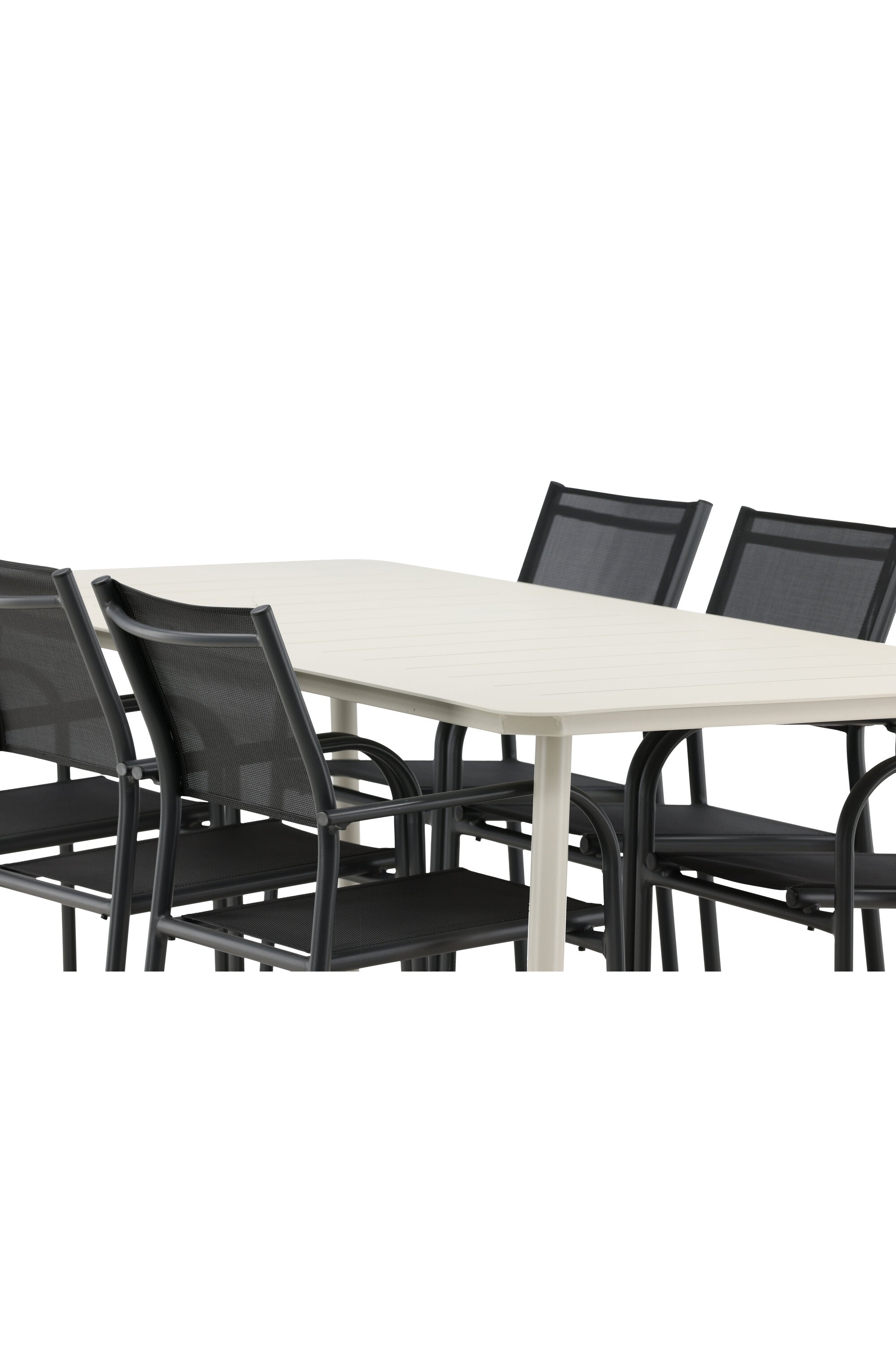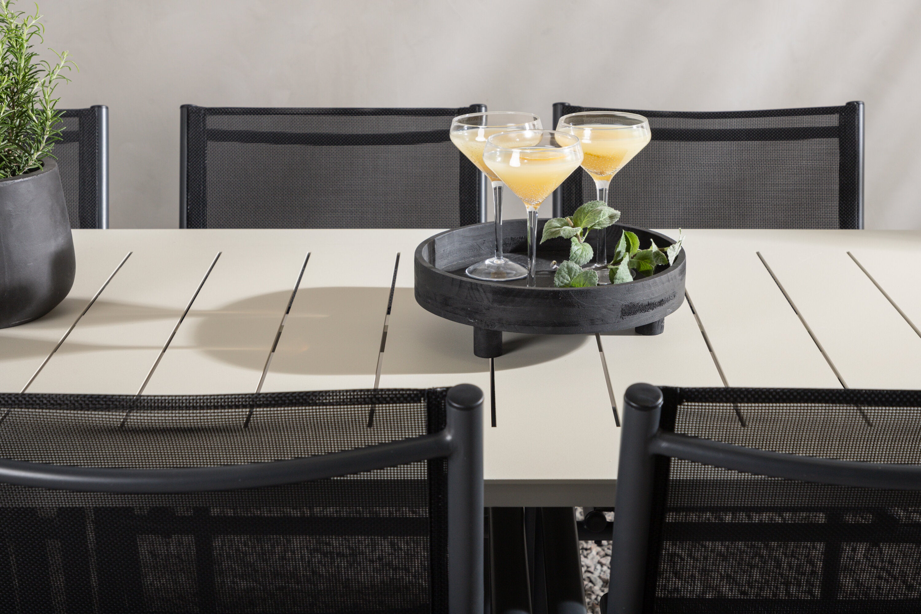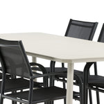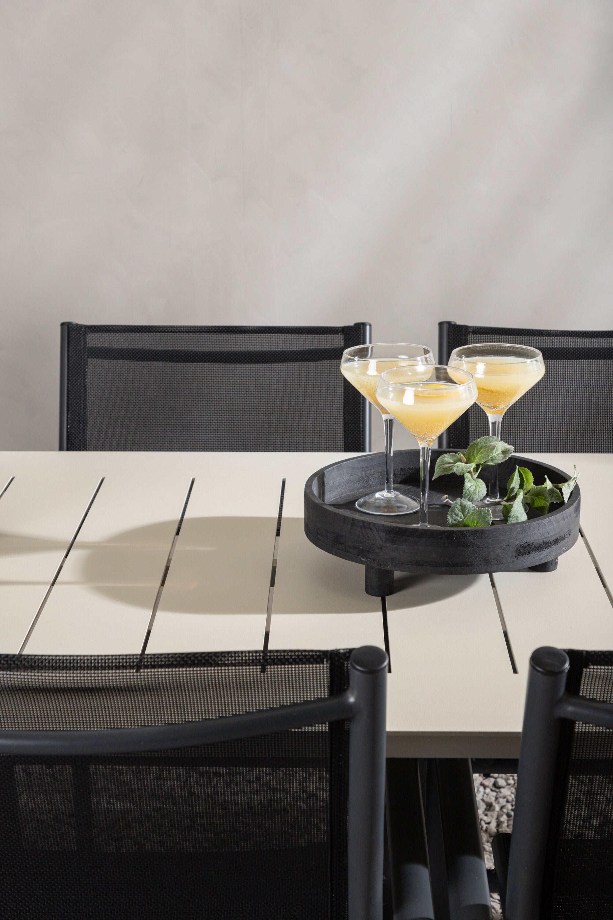 Je to zápas - moderní barevná shoda, která ve venkovním prostoru vytváří módní dojem. Stůl Lina má minimalistický design v bílé/béžové oceli, s obdélníkovou deskou stolu a měkkými zaoblenými hranami. Nohy stolu se snadno rozšiřují a působí stabilním dojmem. Rozměry: 200x90 cm. Zde spolu s pohodlnými jídelními židlemi ze série Santorini. Židle mají rovné severské tvary s integrovanými područkami v hliníku a sedákem z černého textilu. Nechť je čas zde vrcholem dne!