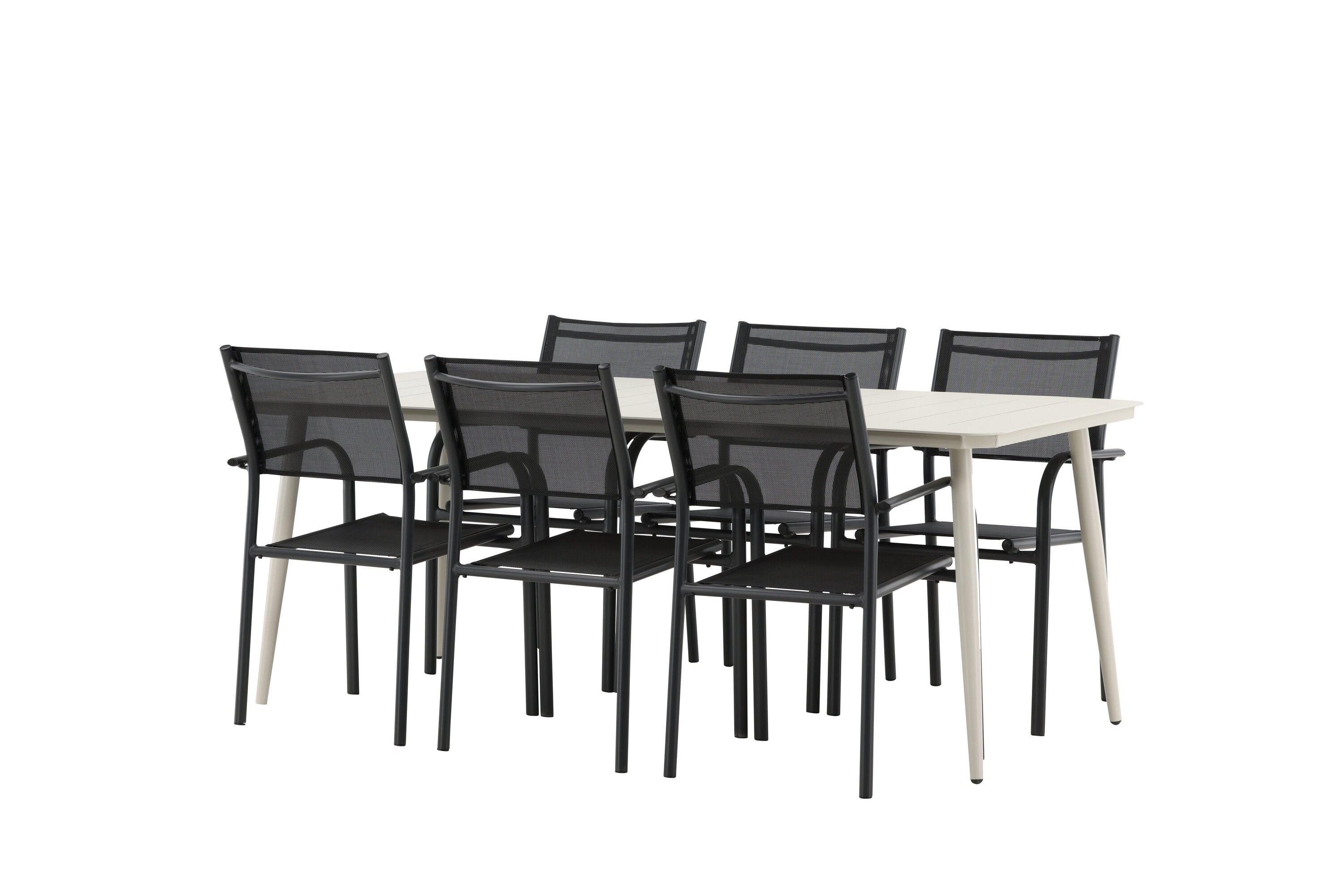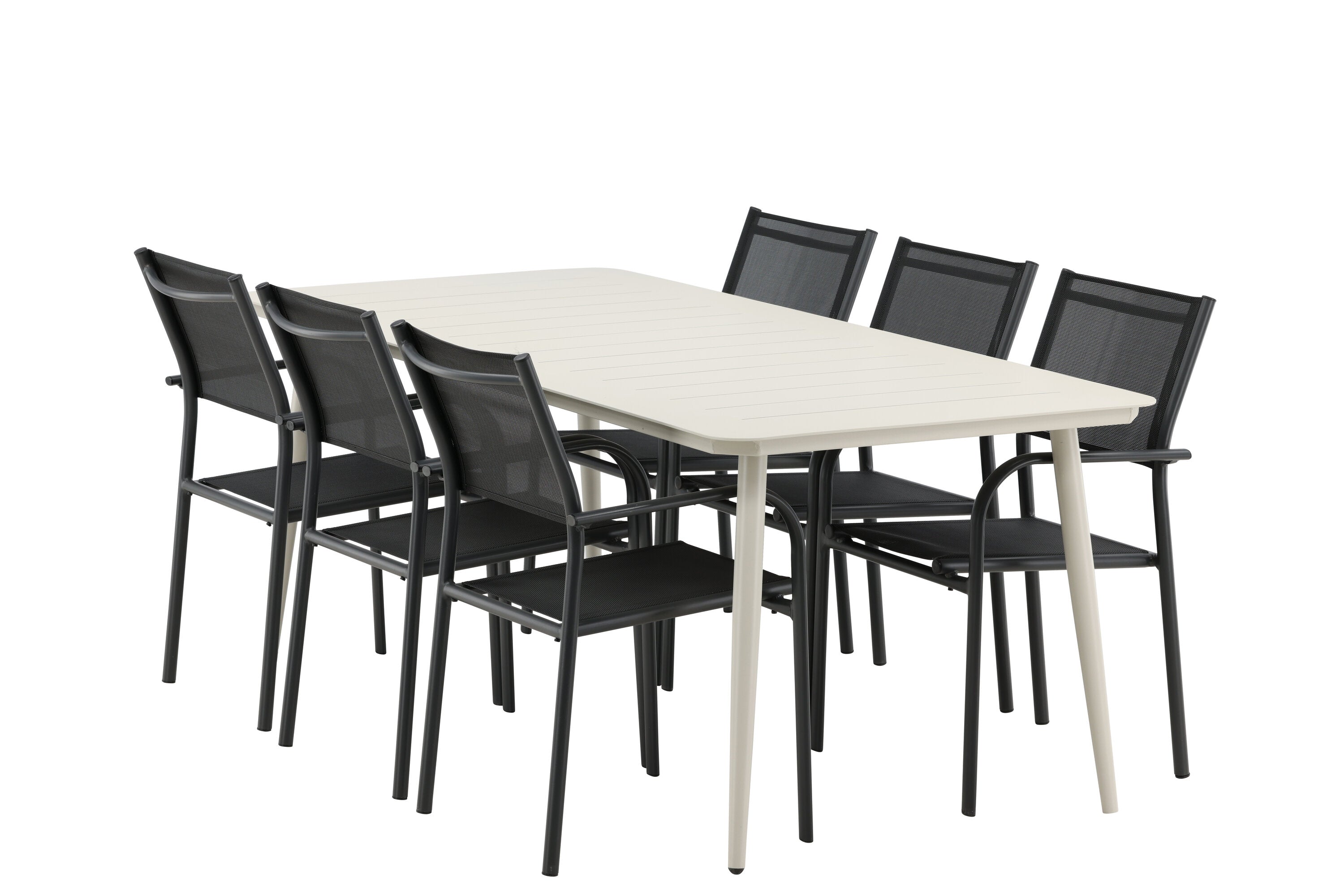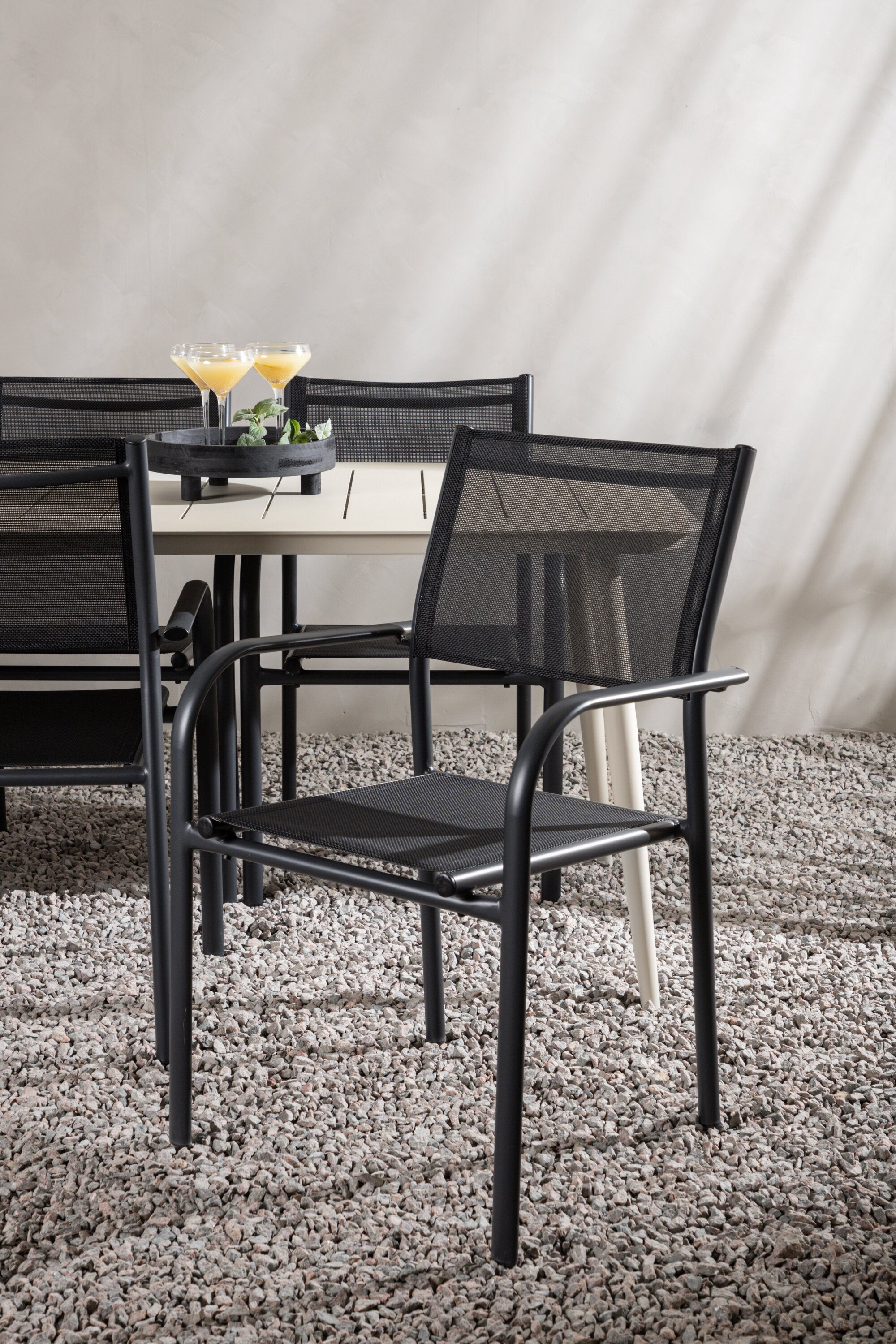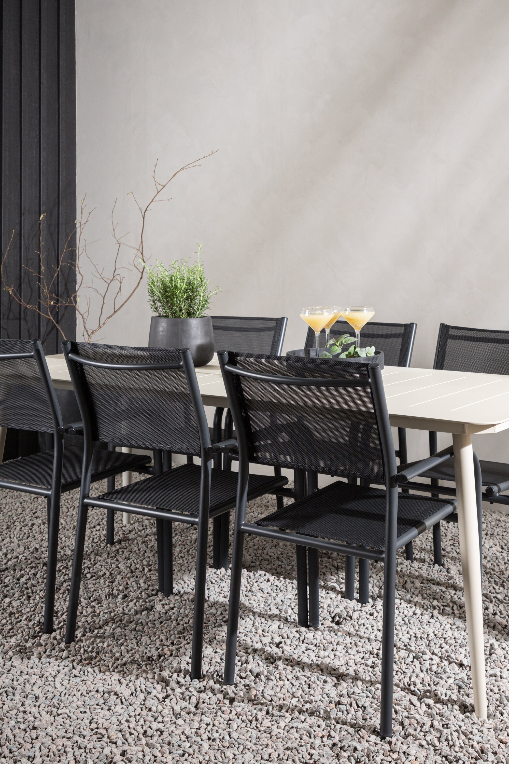 Je to zápas - moderní barevná shoda, která ve venkovním prostoru vytváří módní dojem. Stůl Lina má minimalistický design v bílé/béžové oceli, s obdélníkovou deskou stolu a měkkými zaoblenými hranami. Nohy stolu se snadno rozšiřují a působí stabilním dojmem. Rozměry: 200x90 cm. Zde spolu s pohodlnými jídelními židlemi ze série Santorini. Židle mají rovné severské tvary s integrovanými područkami v hliníku a sedákem z černého textilu. Nechť je čas zde vrcholem dne!