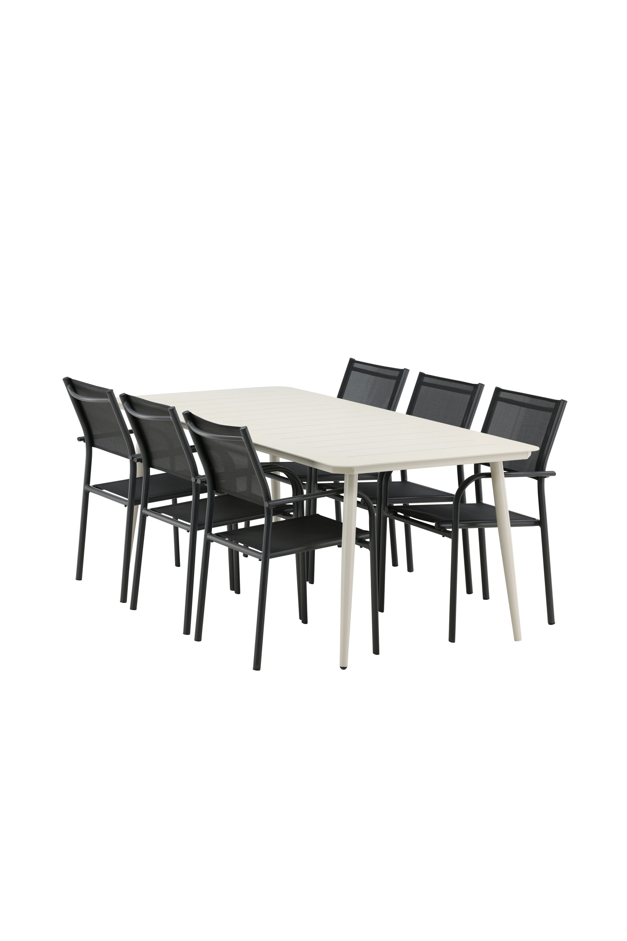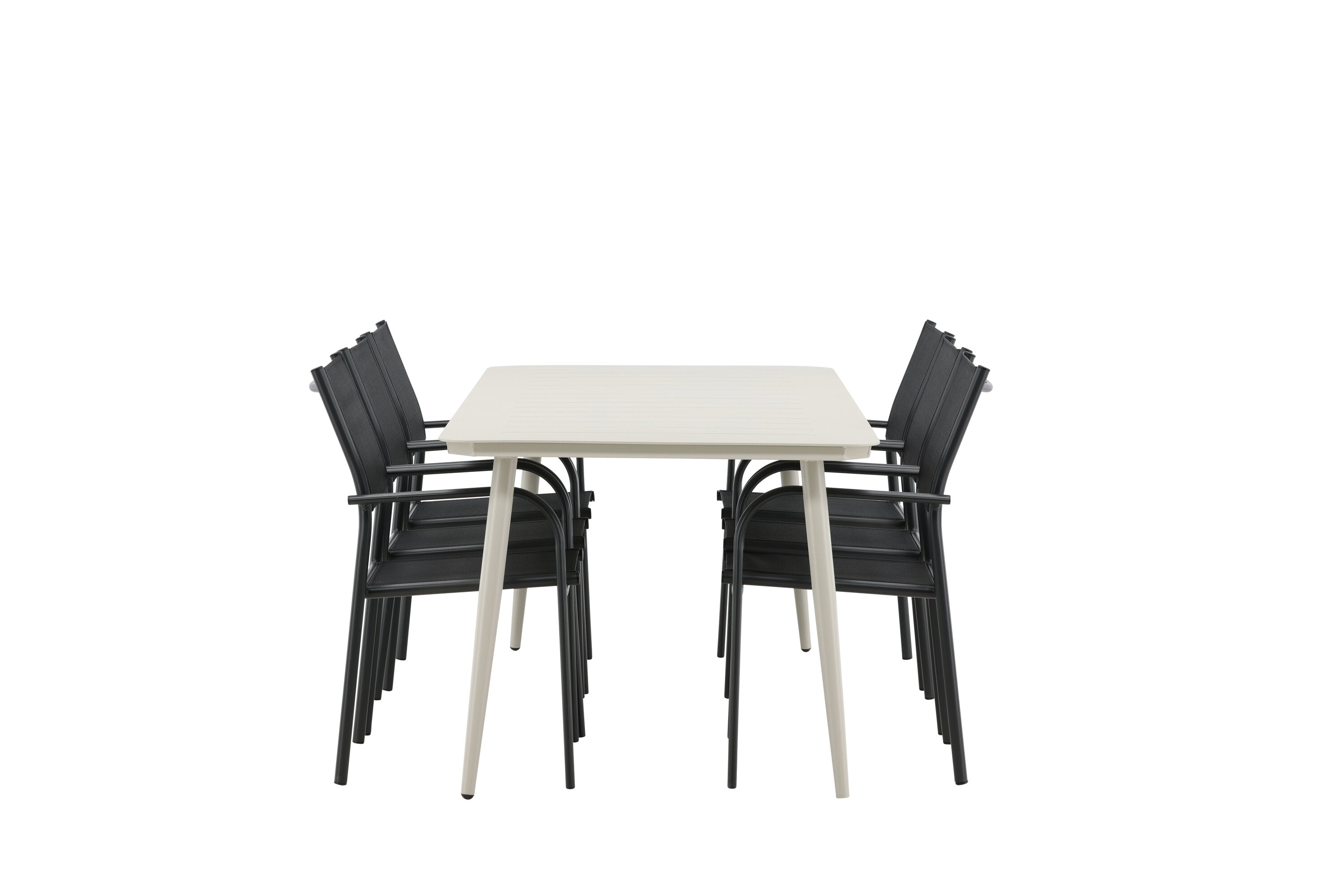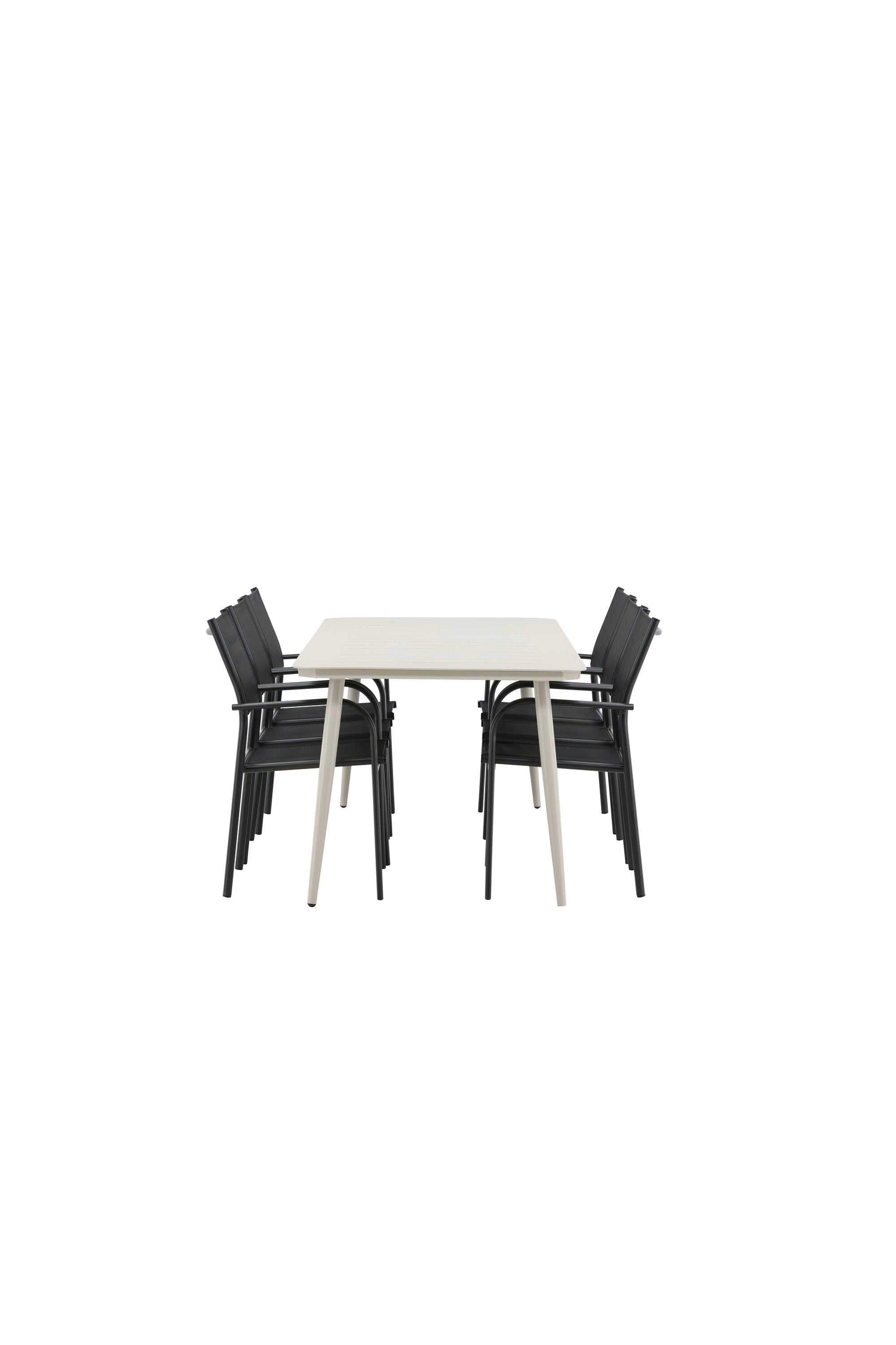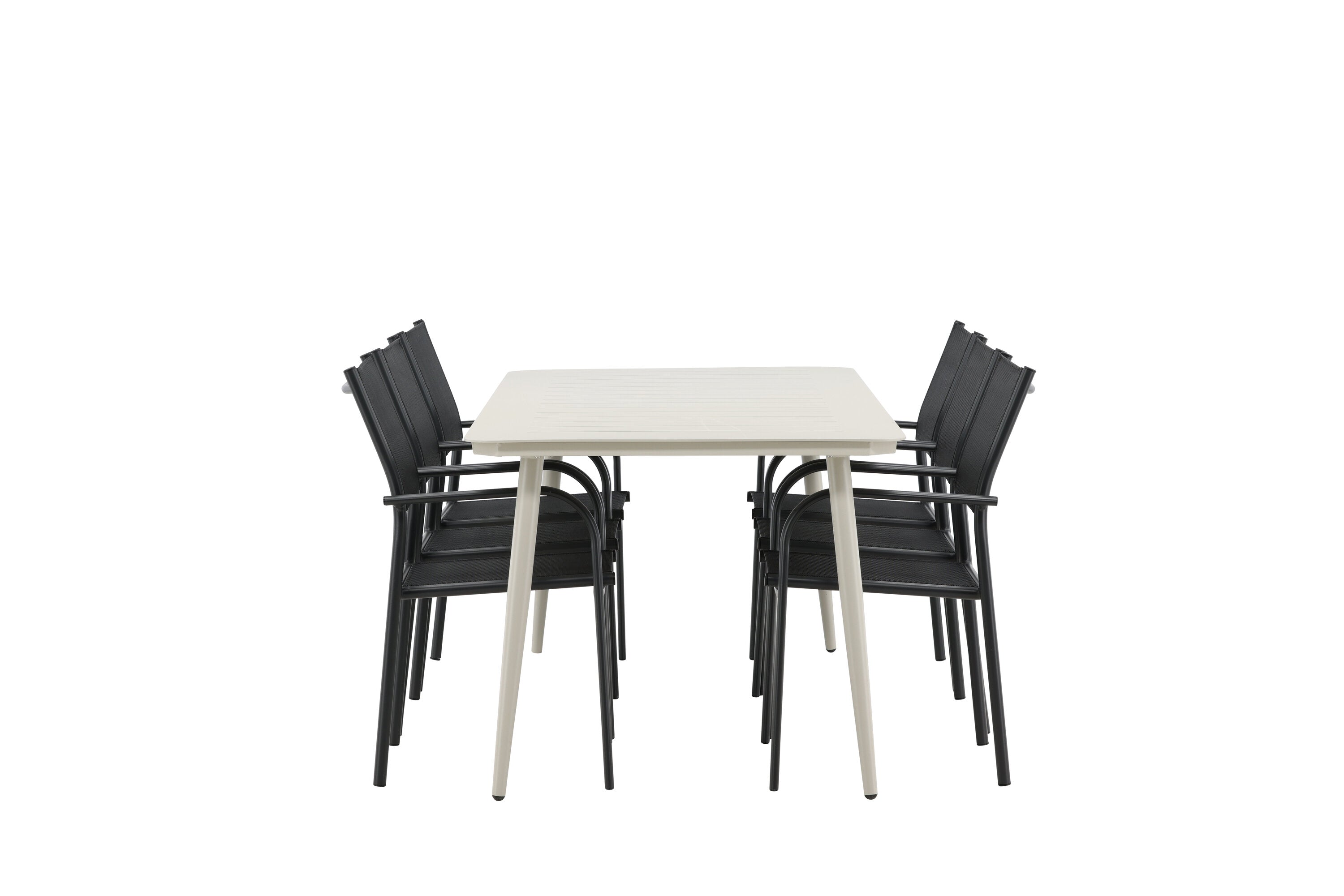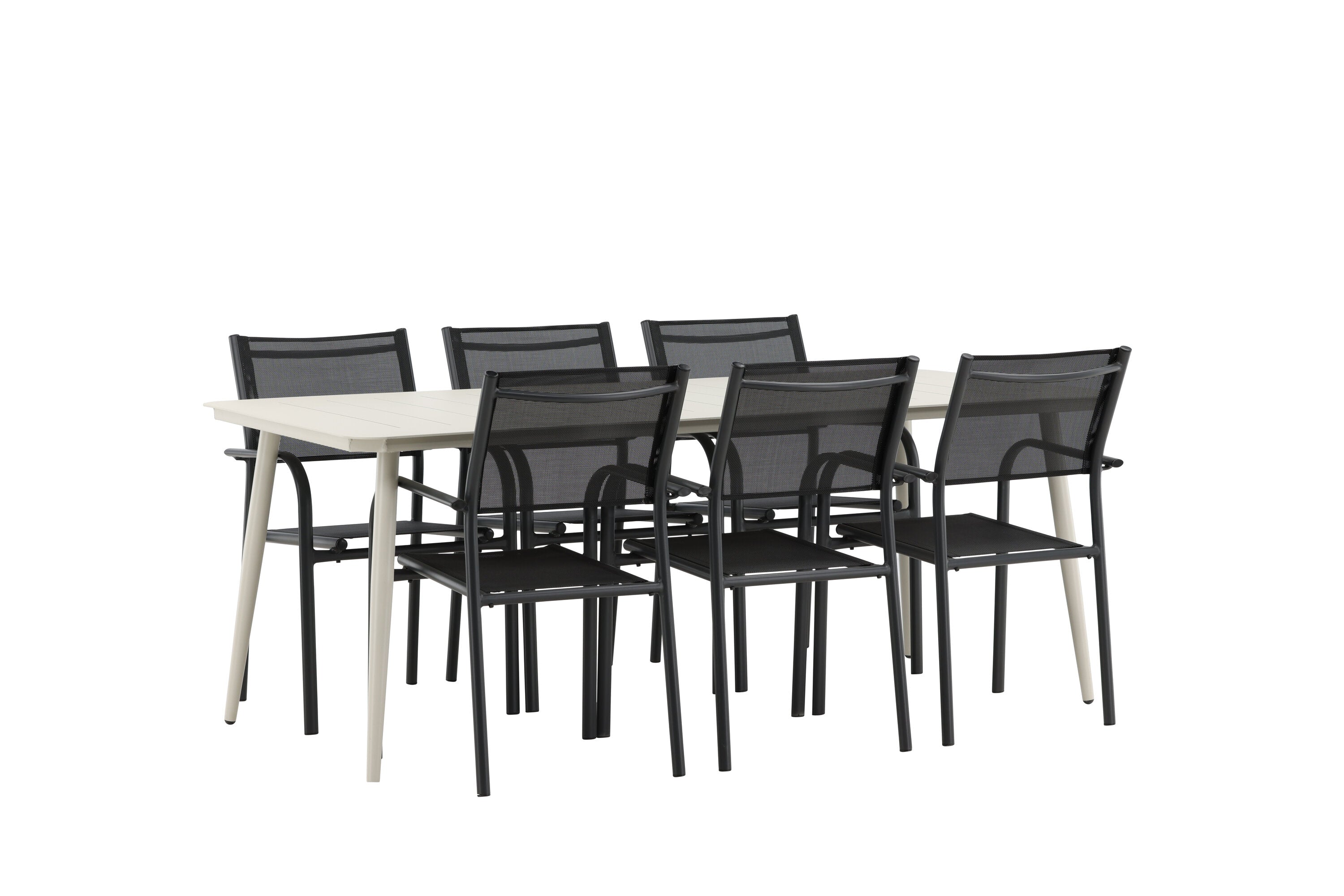 Je to zápas - moderní barevná shoda, která ve venkovním prostoru vytváří módní dojem. Stůl Lina má minimalistický design v bílé/béžové oceli, s obdélníkovou deskou stolu a měkkými zaoblenými hranami. Nohy stolu se snadno rozšiřují a působí stabilním dojmem. Rozměry: 200x90 cm. Zde spolu s pohodlnými jídelními židlemi ze série Santorini. Židle mají rovné severské tvary s integrovanými područkami v hliníku a sedákem z černého textilu. Nechť je čas zde vrcholem dne!