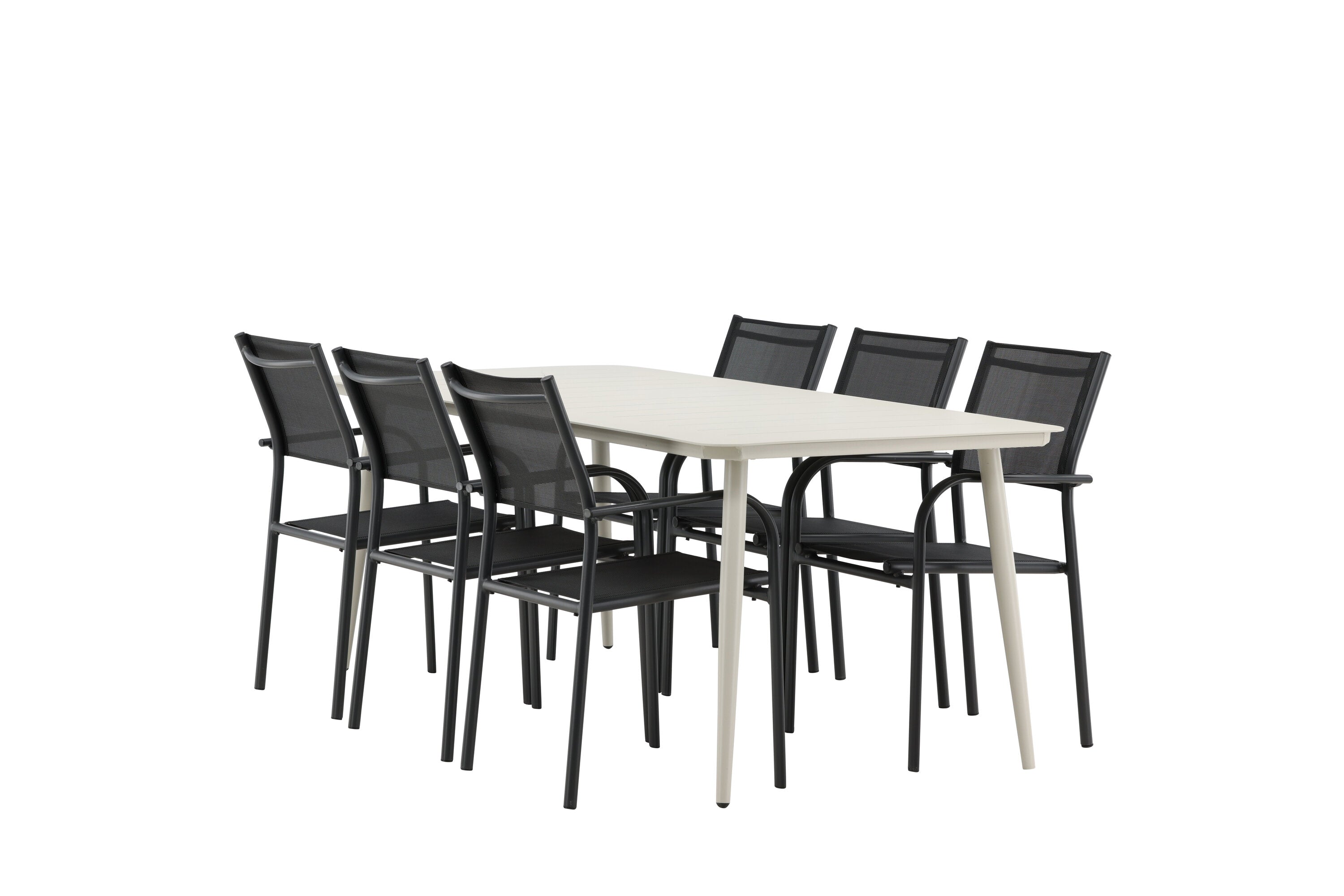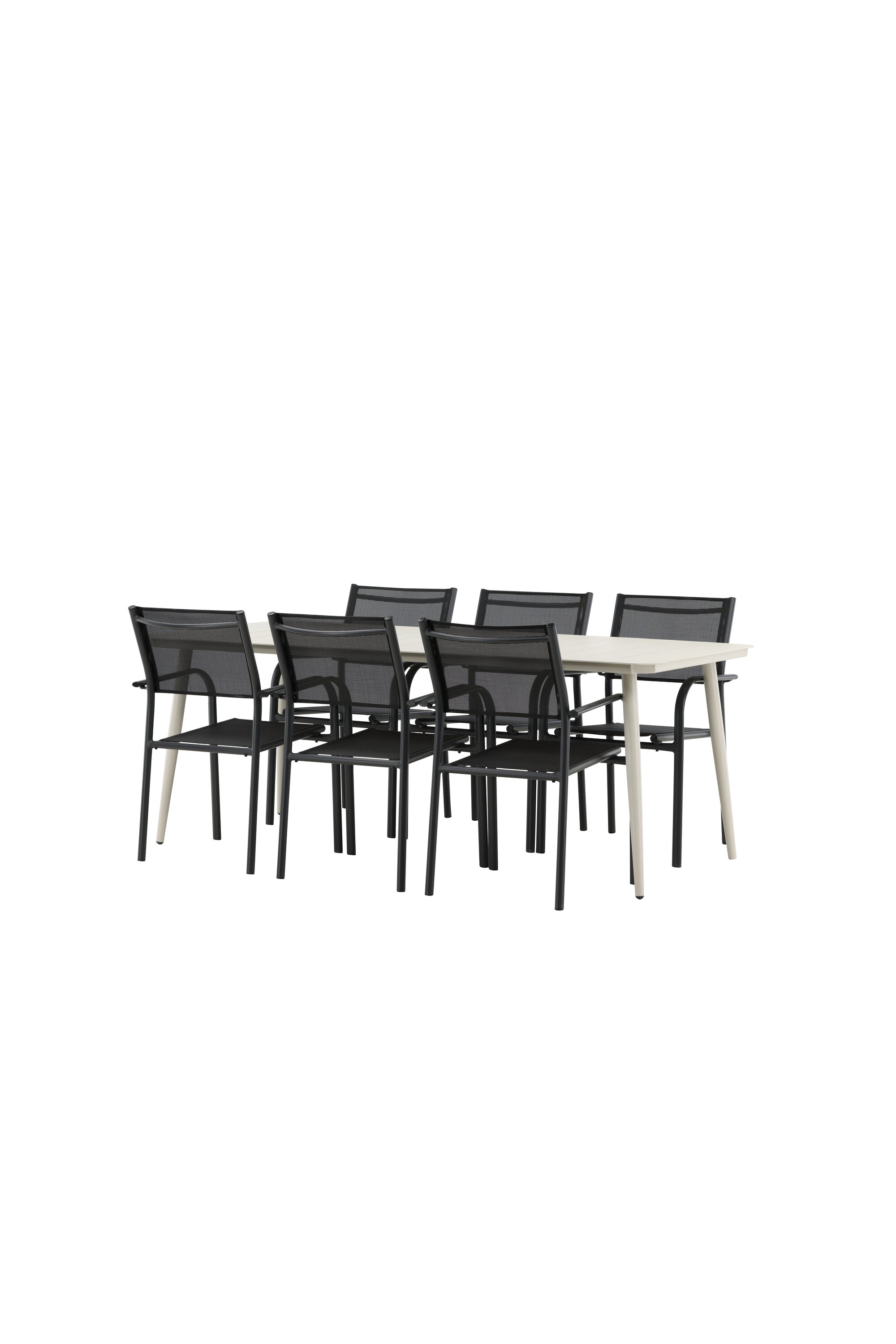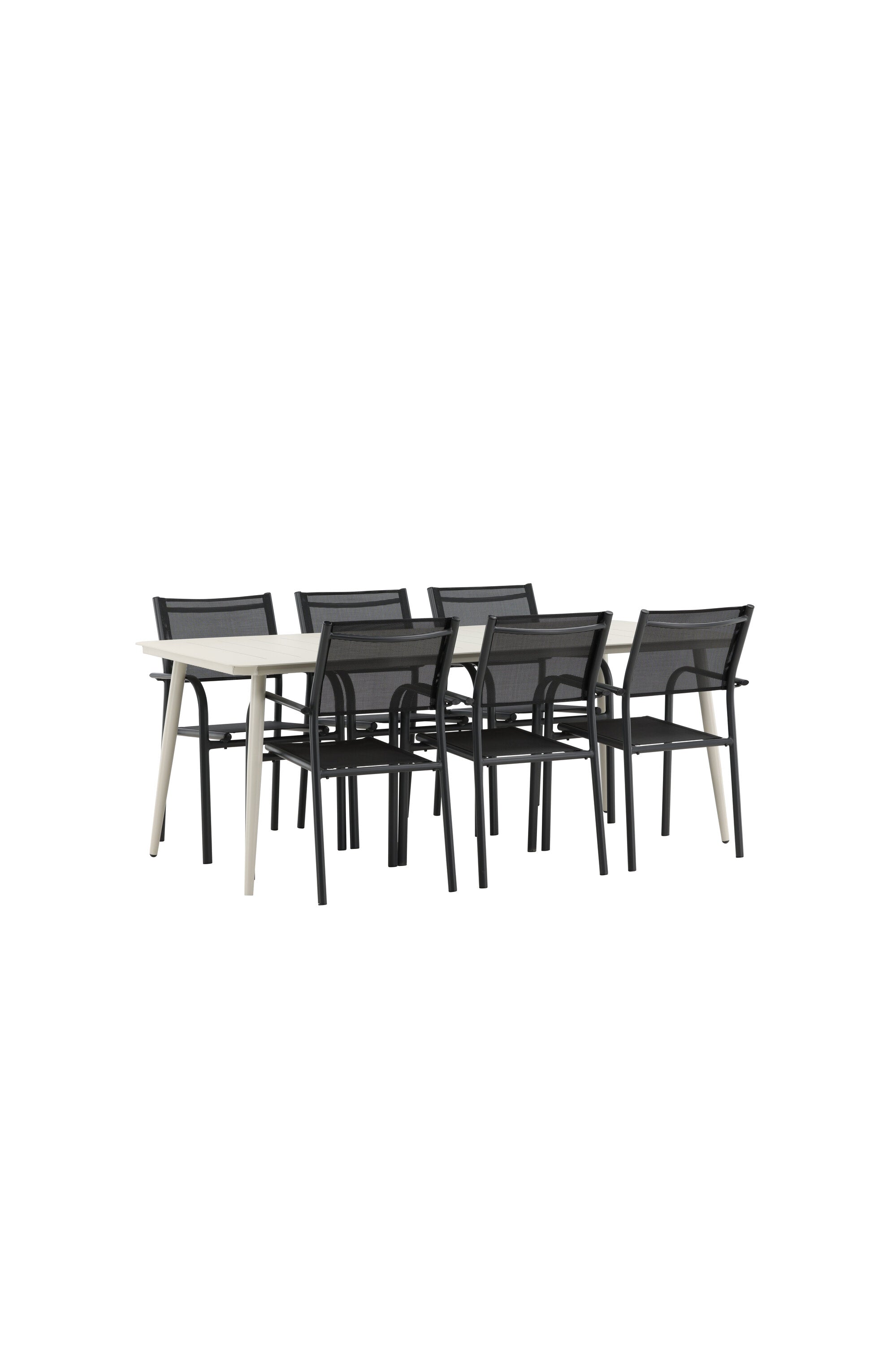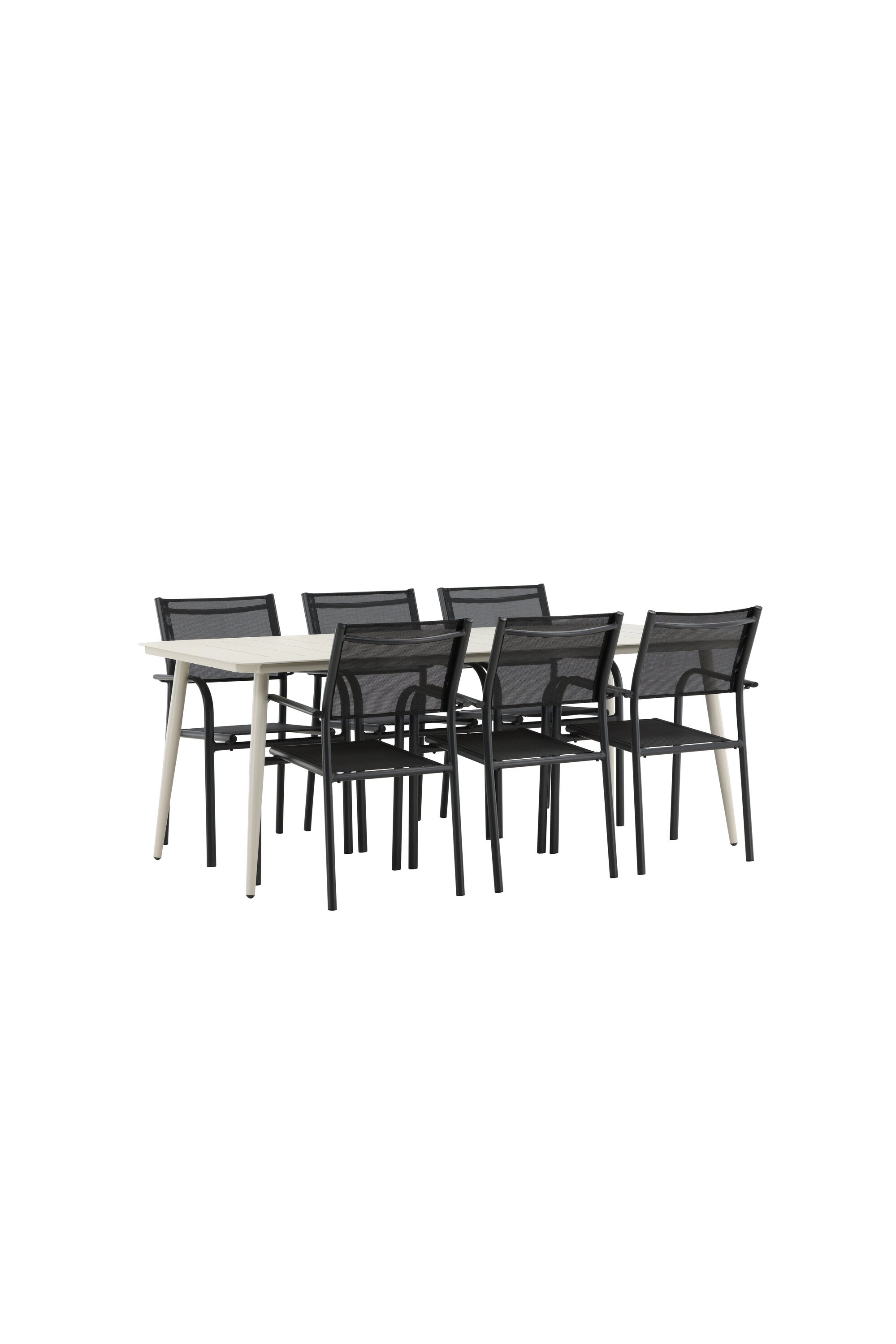 Je to zápas - moderní barevná shoda, která ve venkovním prostoru vytváří módní dojem. Stůl Lina má minimalistický design v bílé/béžové oceli, s obdélníkovou deskou stolu a měkkými zaoblenými hranami. Nohy stolu se snadno rozšiřují a působí stabilním dojmem. Rozměry: 200x90 cm. Zde spolu s pohodlnými jídelními židlemi ze série Santorini. Židle mají rovné severské tvary s integrovanými područkami v hliníku a sedákem z černého textilu. Nechť je čas zde vrcholem dne!