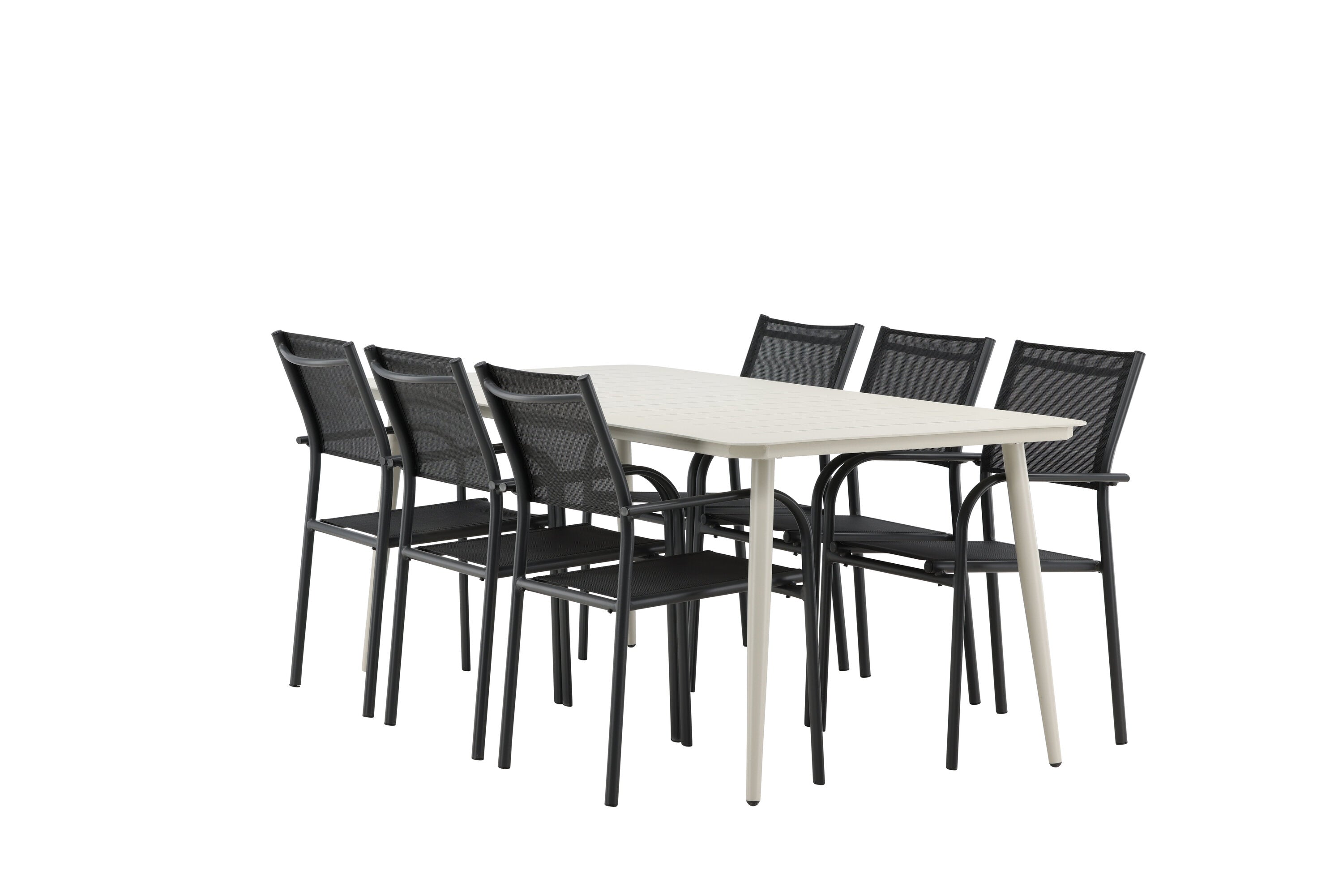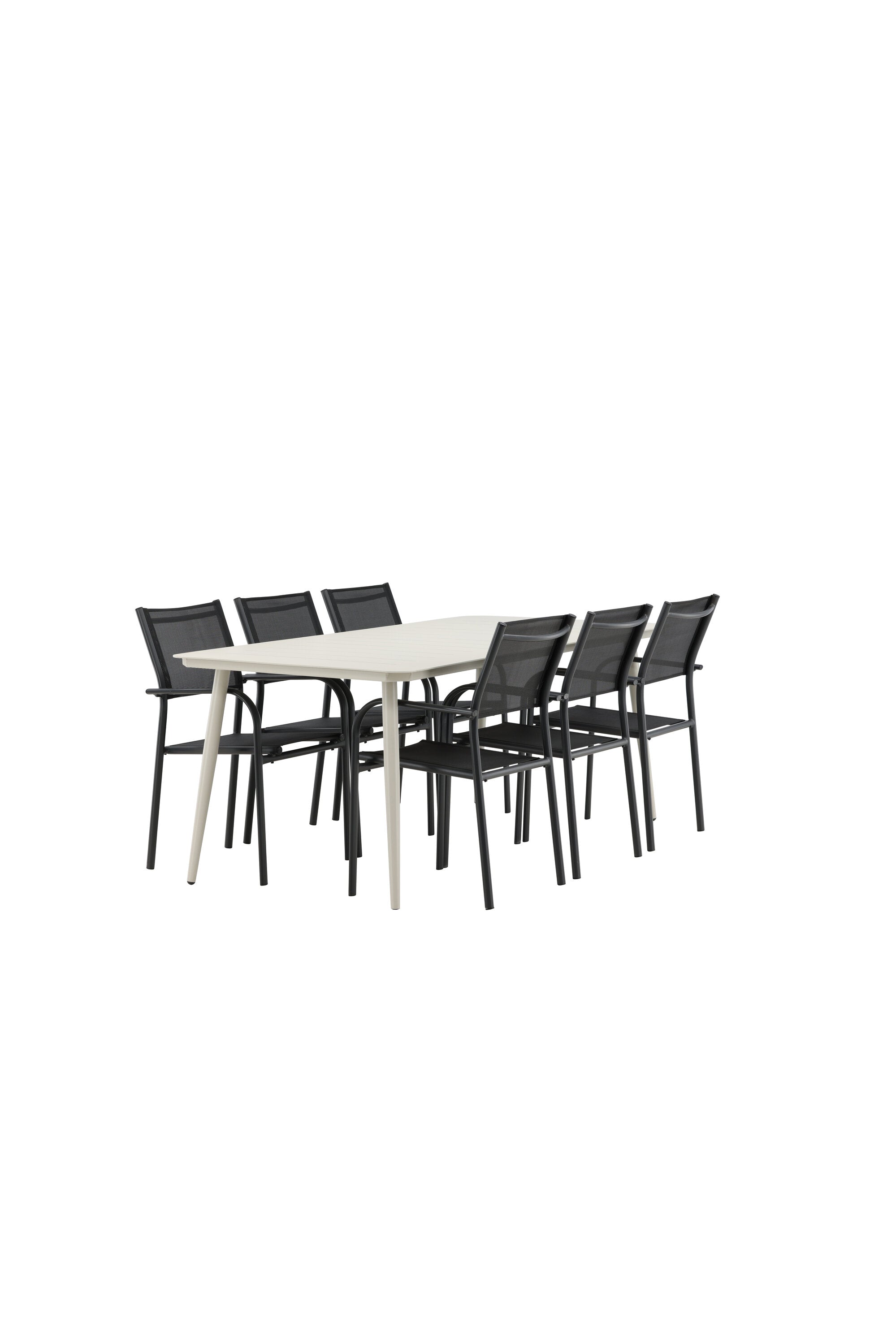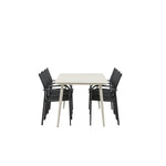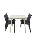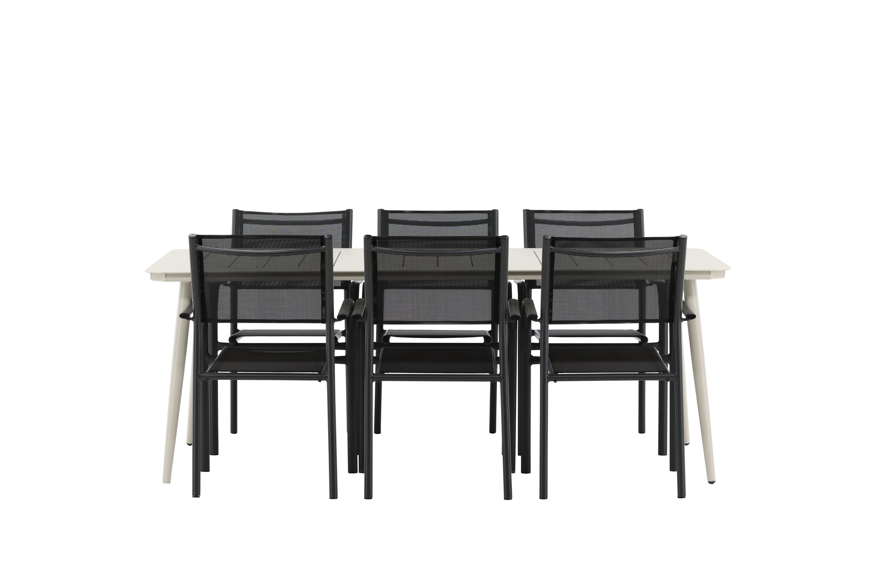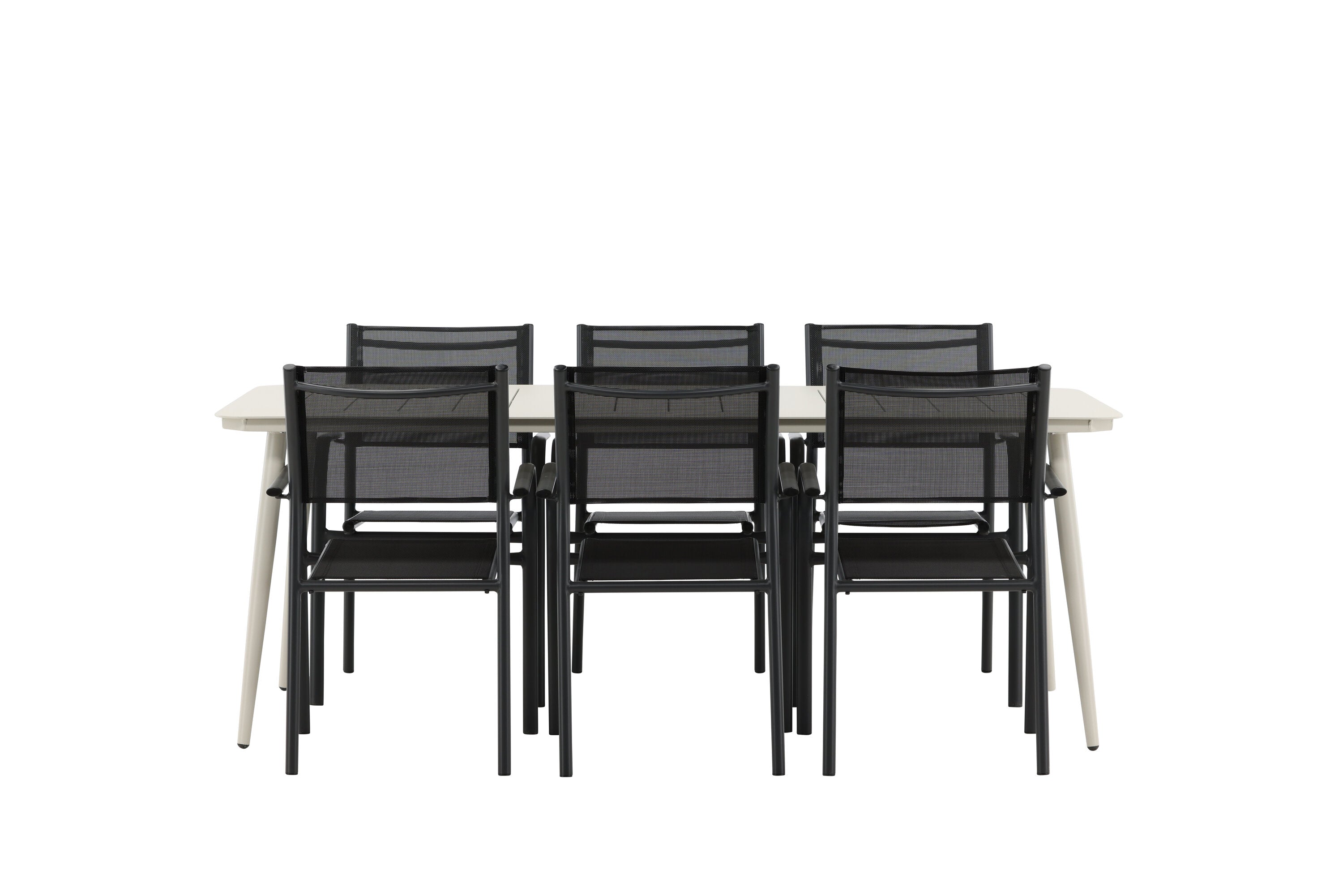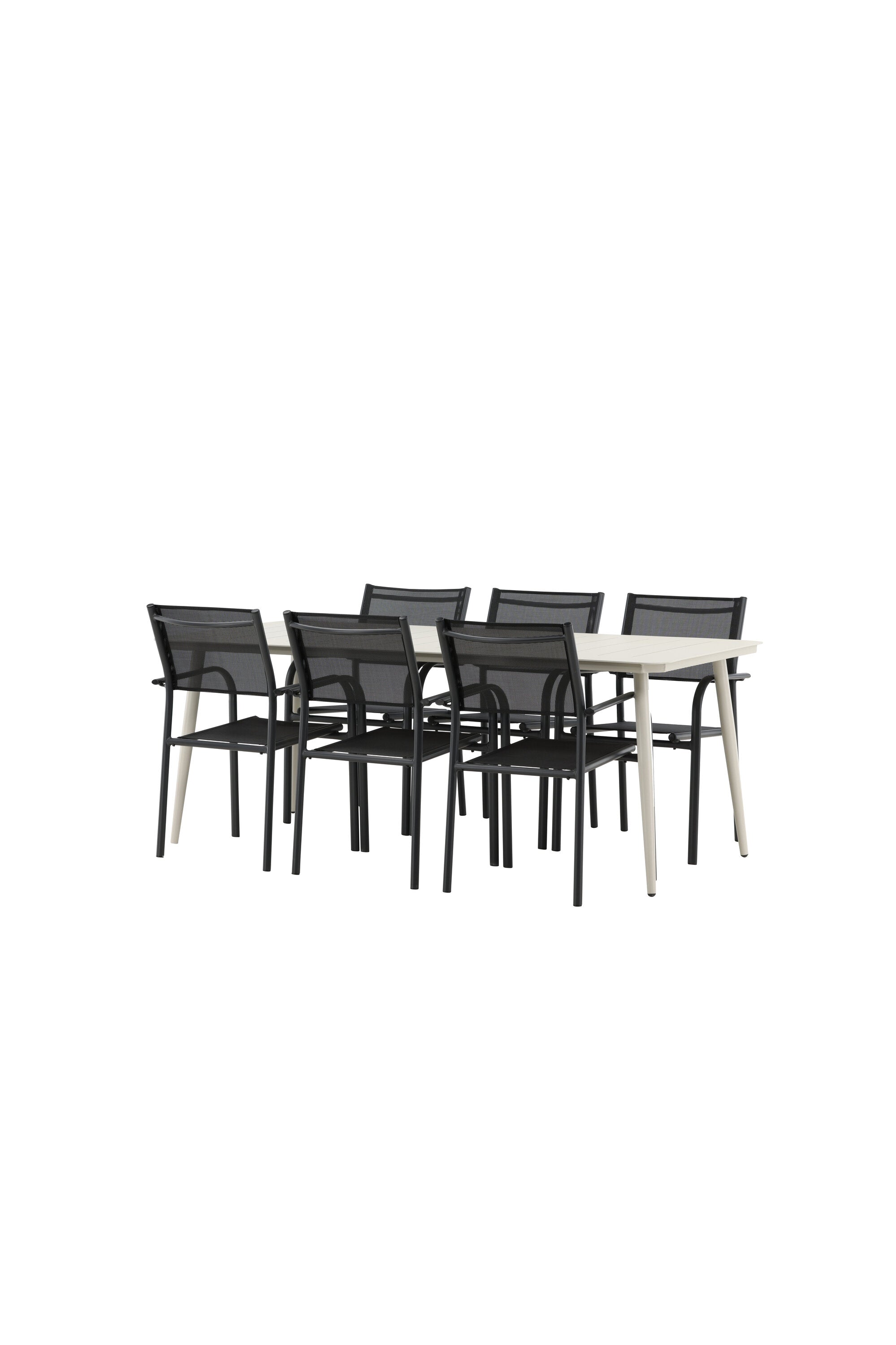 Je to zápas - moderní barevná shoda, která ve venkovním prostoru vytváří módní dojem. Stůl Lina má minimalistický design v bílé/béžové oceli, s obdélníkovou deskou stolu a měkkými zaoblenými hranami. Nohy stolu se snadno rozšiřují a působí stabilním dojmem. Rozměry: 200x90 cm. Zde spolu s pohodlnými jídelními židlemi ze série Santorini. Židle mají rovné severské tvary s integrovanými područkami v hliníku a sedákem z černého textilu. Nechť je čas zde vrcholem dne!