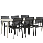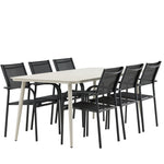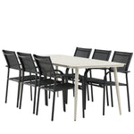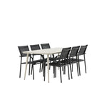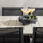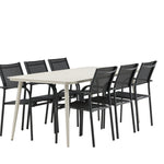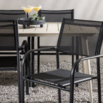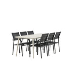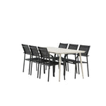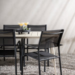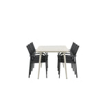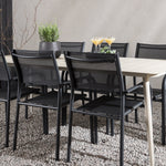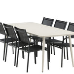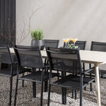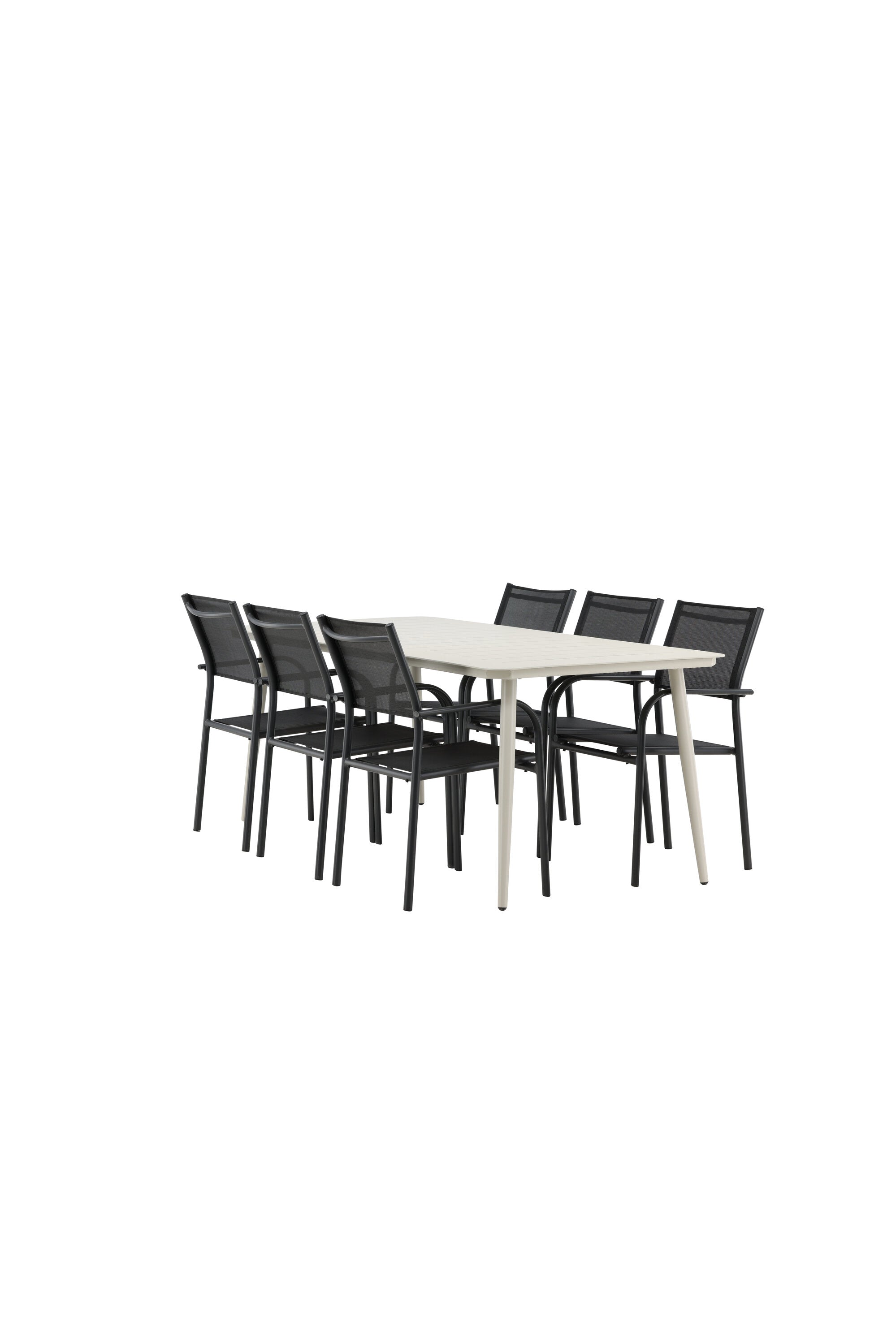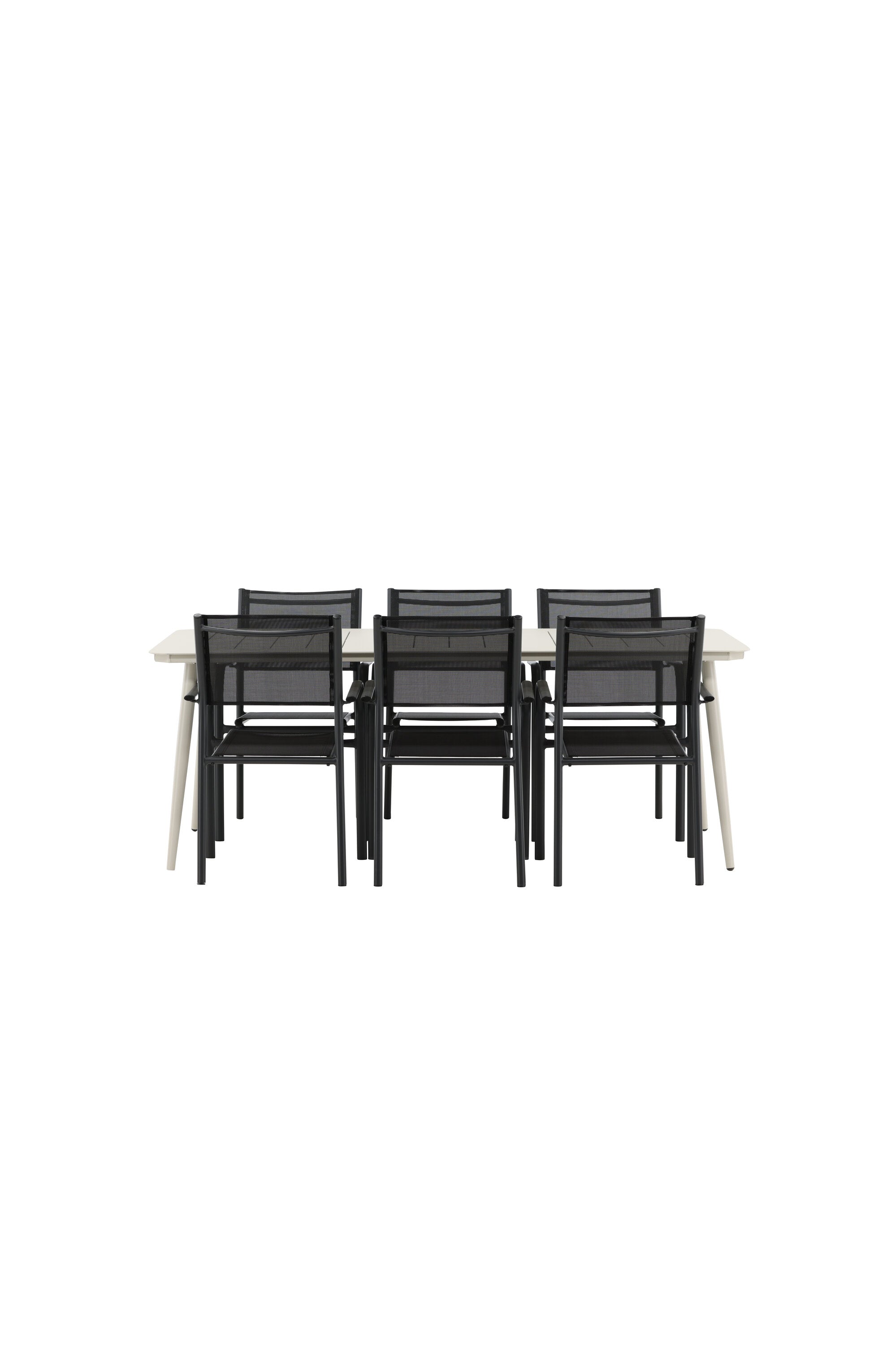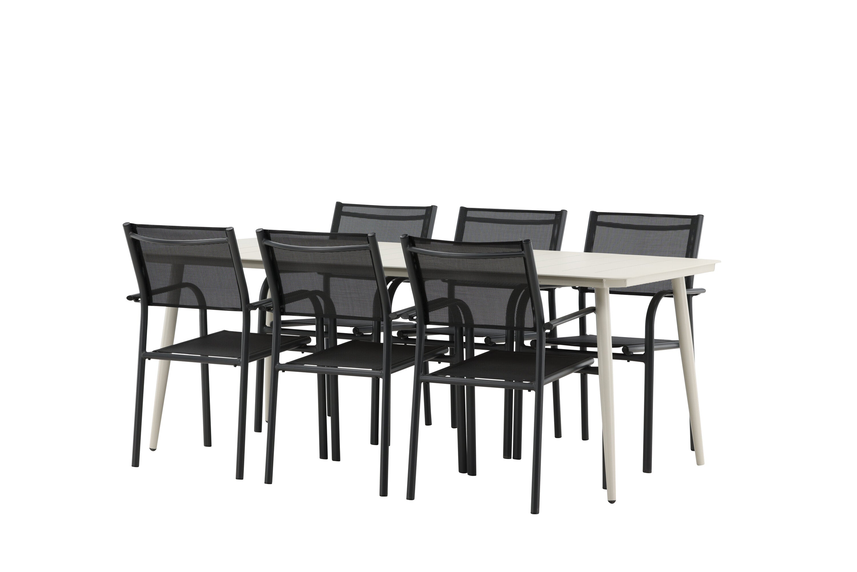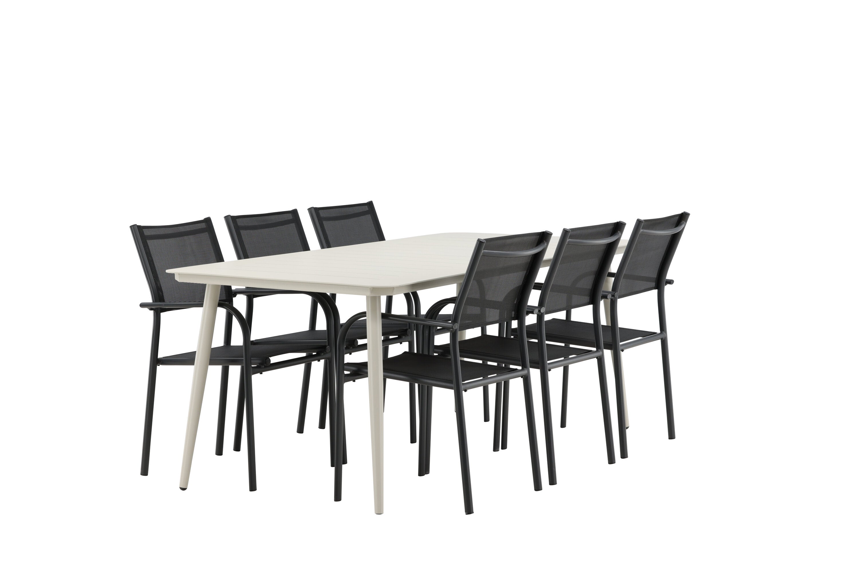 Je to zápas - moderní barevná shoda, která ve venkovním prostoru vytváří módní dojem. Stůl Lina má minimalistický design v bílé/béžové oceli, s obdélníkovou deskou stolu a měkkými zaoblenými hranami. Nohy stolu se snadno rozšiřují a působí stabilním dojmem. Rozměry: 200x90 cm. Zde spolu s pohodlnými jídelními židlemi ze série Santorini. Židle mají rovné severské tvary s integrovanými područkami v hliníku a sedákem z černého textilu. Nechť je čas zde vrcholem dne!