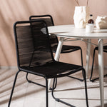 Je to zápas - moderní barevná shoda, která ve venkovním prostoru vytváří módní dojem. Stůl Lina má minimalistický design v bílé/béžové oceli, s obdélníkovou deskou stolu a měkkými zaoblenými hranami. Nohy stolu se snadno rozšiřují a působí stabilním dojmem. Rozměry: 200x90 cm. Zde společně s trendy jídelními židlemi ze série Lindos. Židle mají úzké nohy z černého hliníku a sedák z odolného černého lana. Zařiďte nádvoří příjemně a vytvořte poutač, který zaujme!