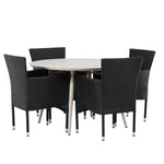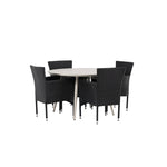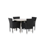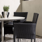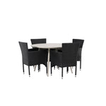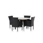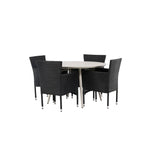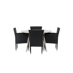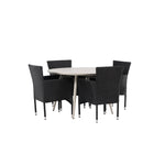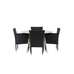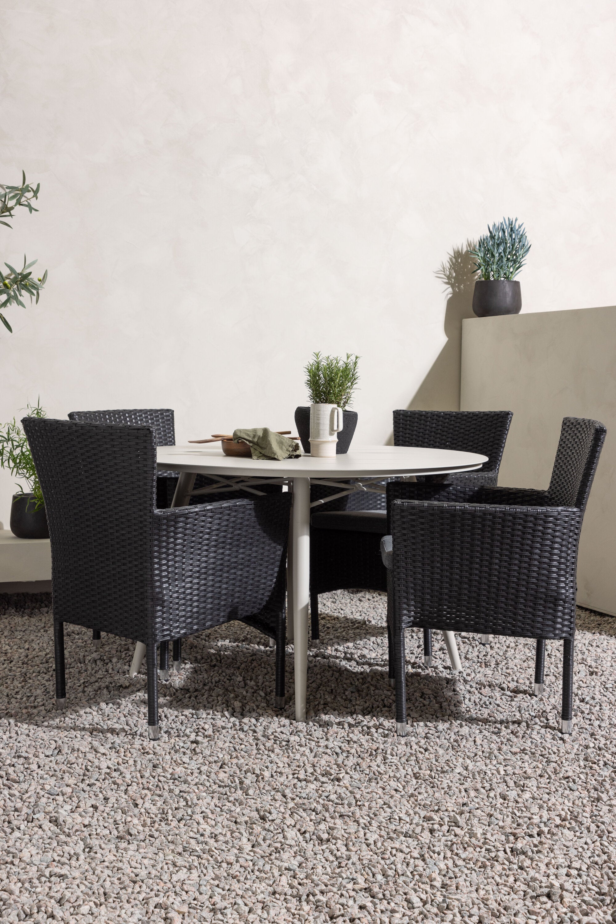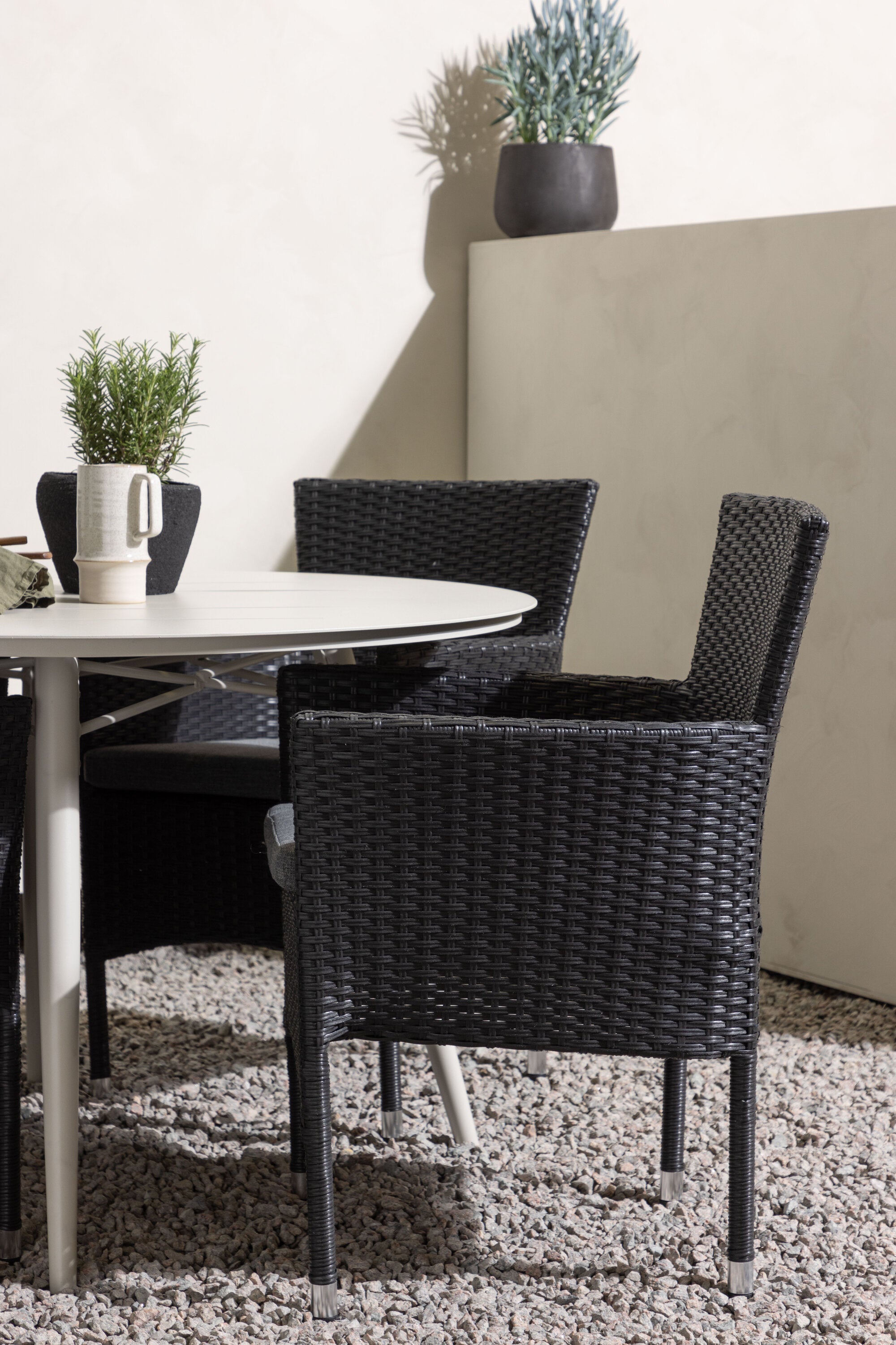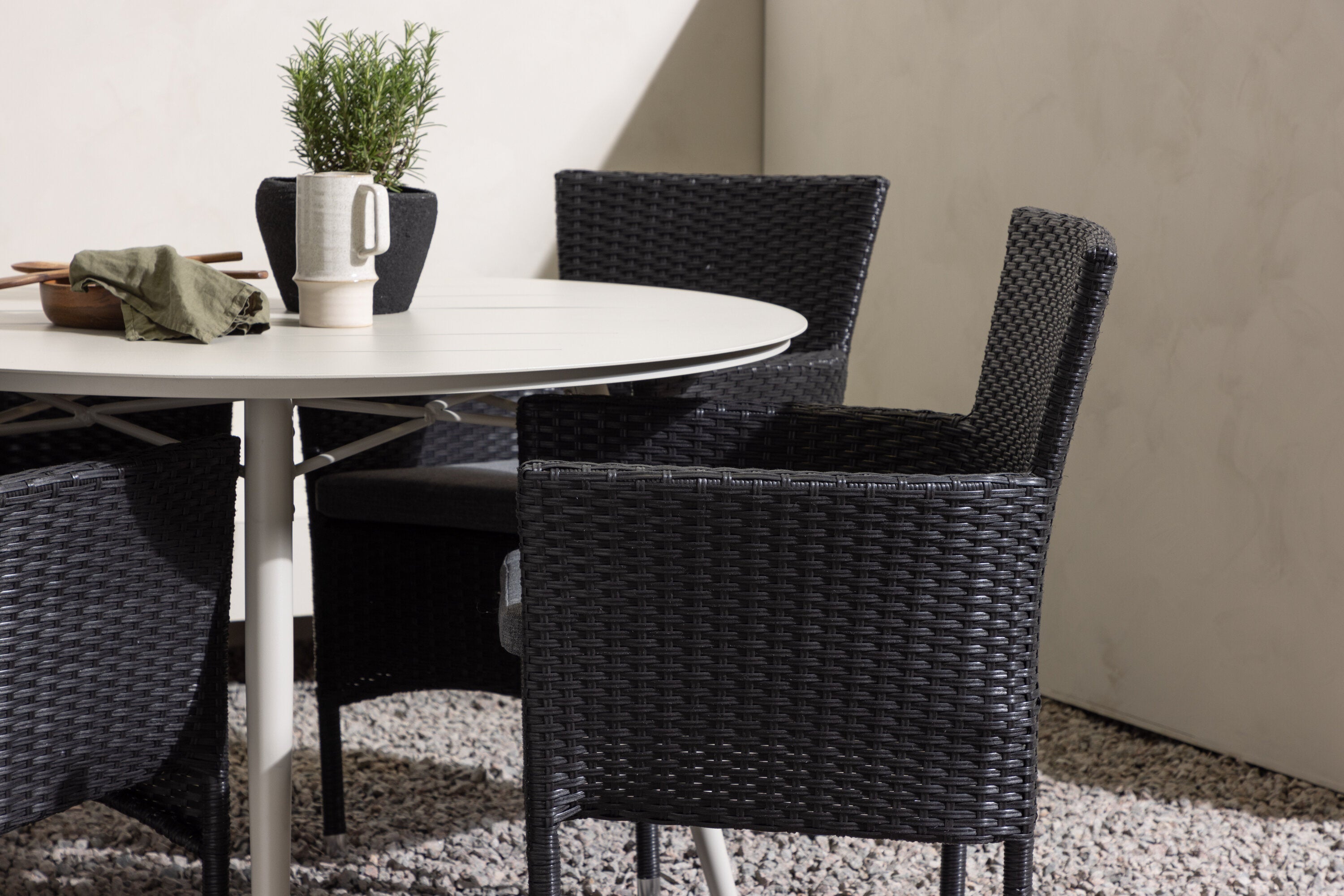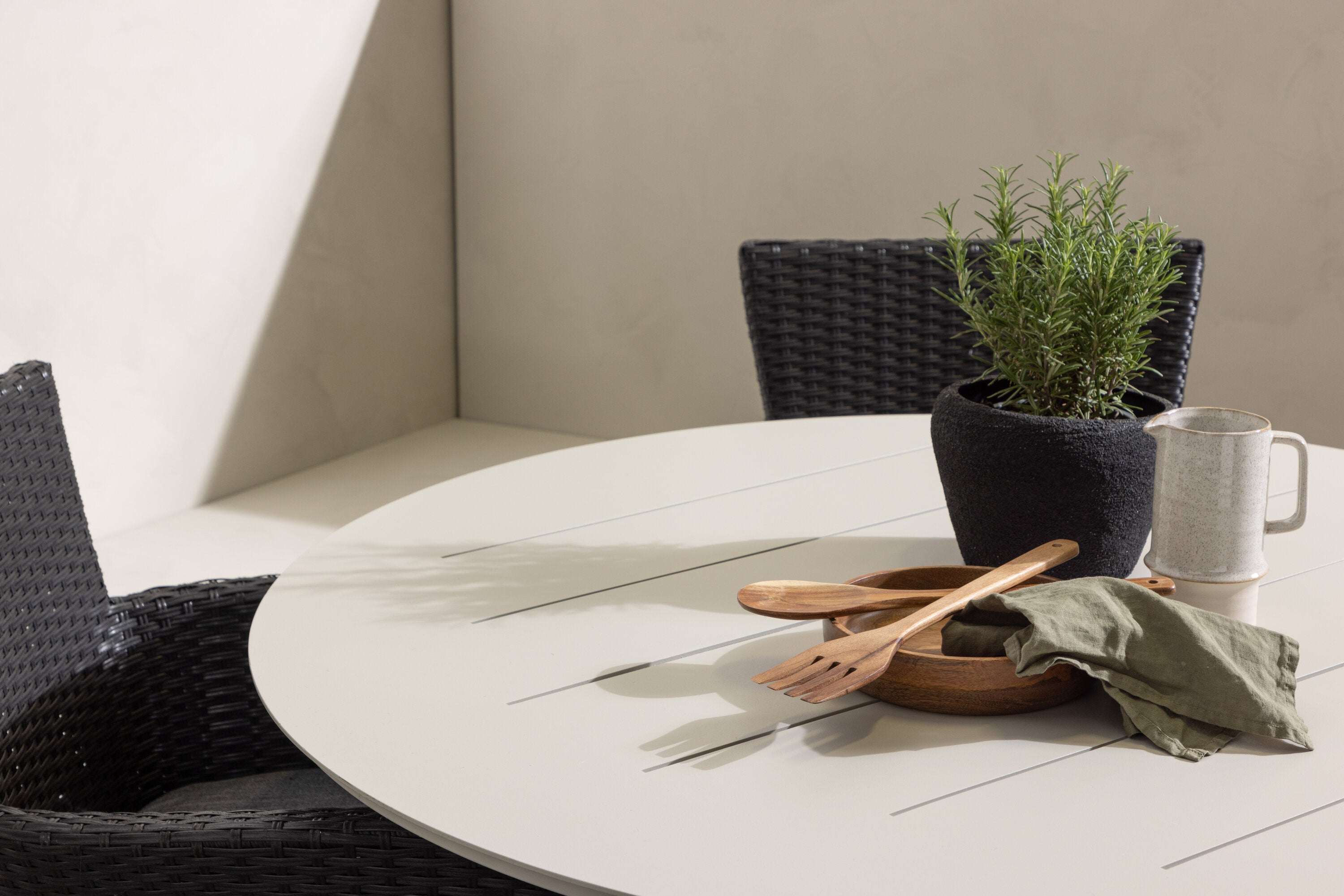 Kruhová jídelní skupina je ideální pro vytvoření příjemné a příjemné atmosféry! Jednoduchý, ale elegantní, kulatý jídelní stůl ze série Lina má svěží design a hřejivou béžovou barvu. Horní deska je tenká s ozdobnými štěrbinami a nohy stolu mírně rozšířené; důsledně vyrobeno z oceli. Jídelní židle patří do série Malina a zaručeně obstojí ve zkoušce času. Židle má hliníkový rám a je čalouněná pleteným, černým umělým ratanem. Nechte konverzaci a smích volně plynout – tady nikdo nekončí na hraně! Průměr stolu: 120 cm.