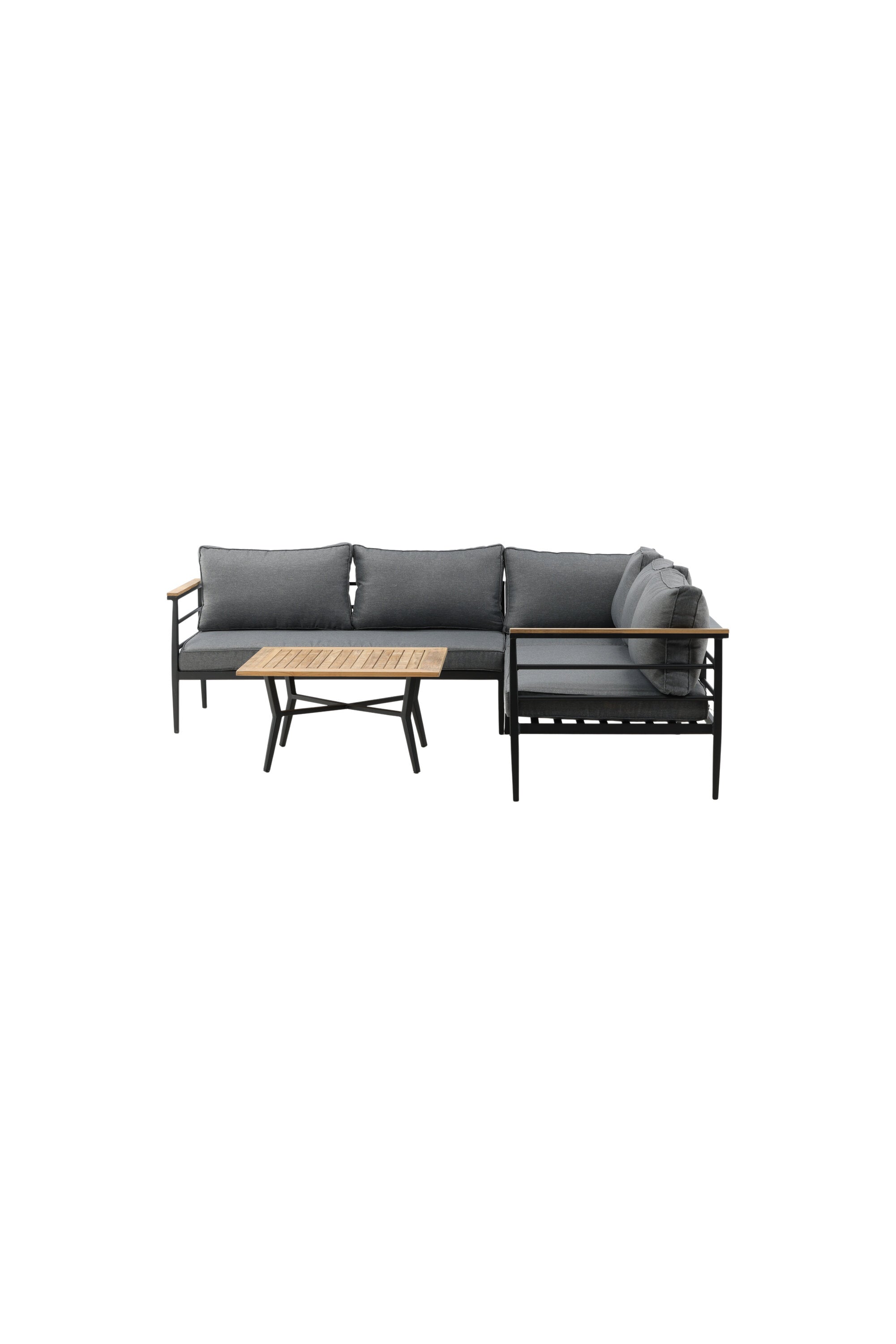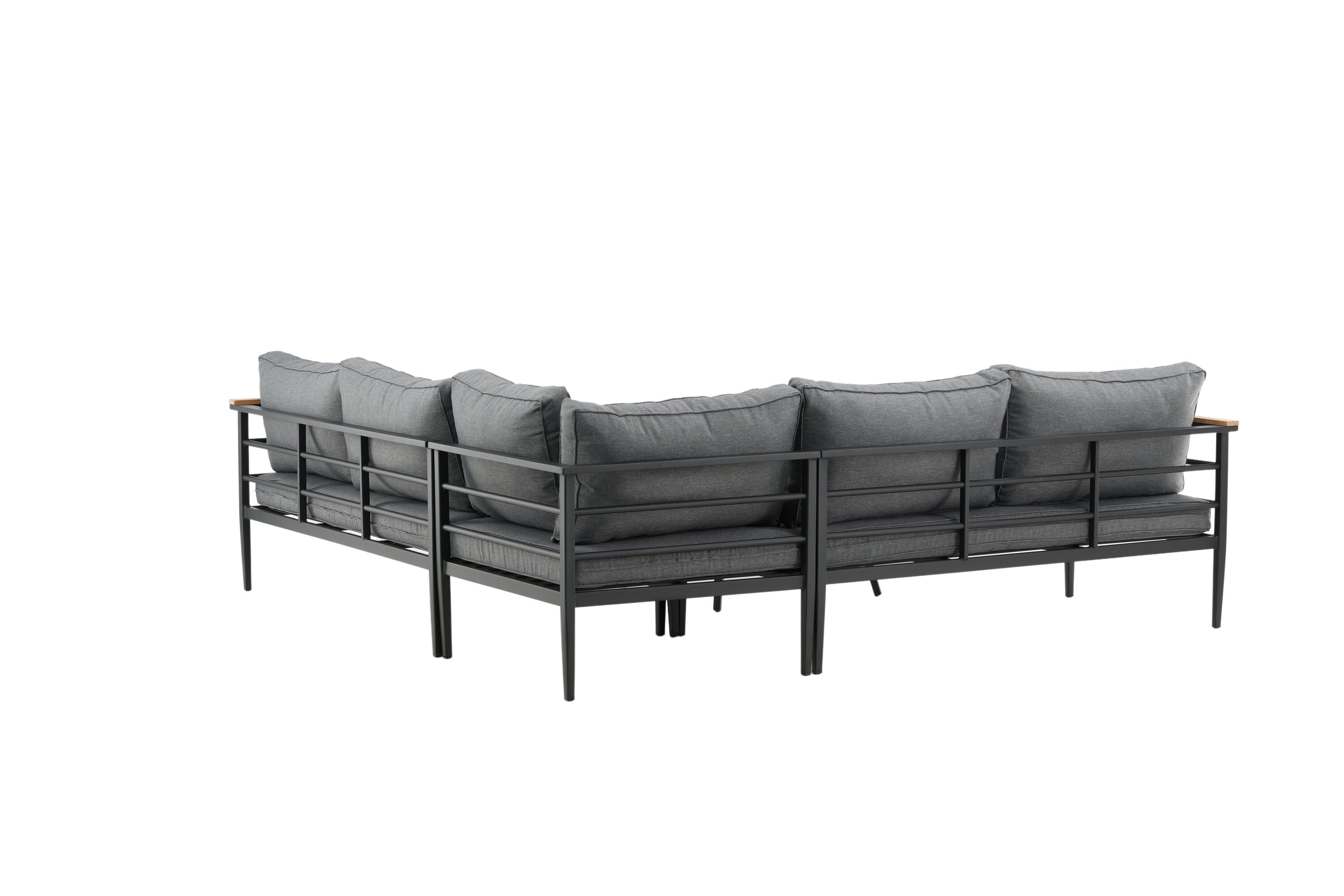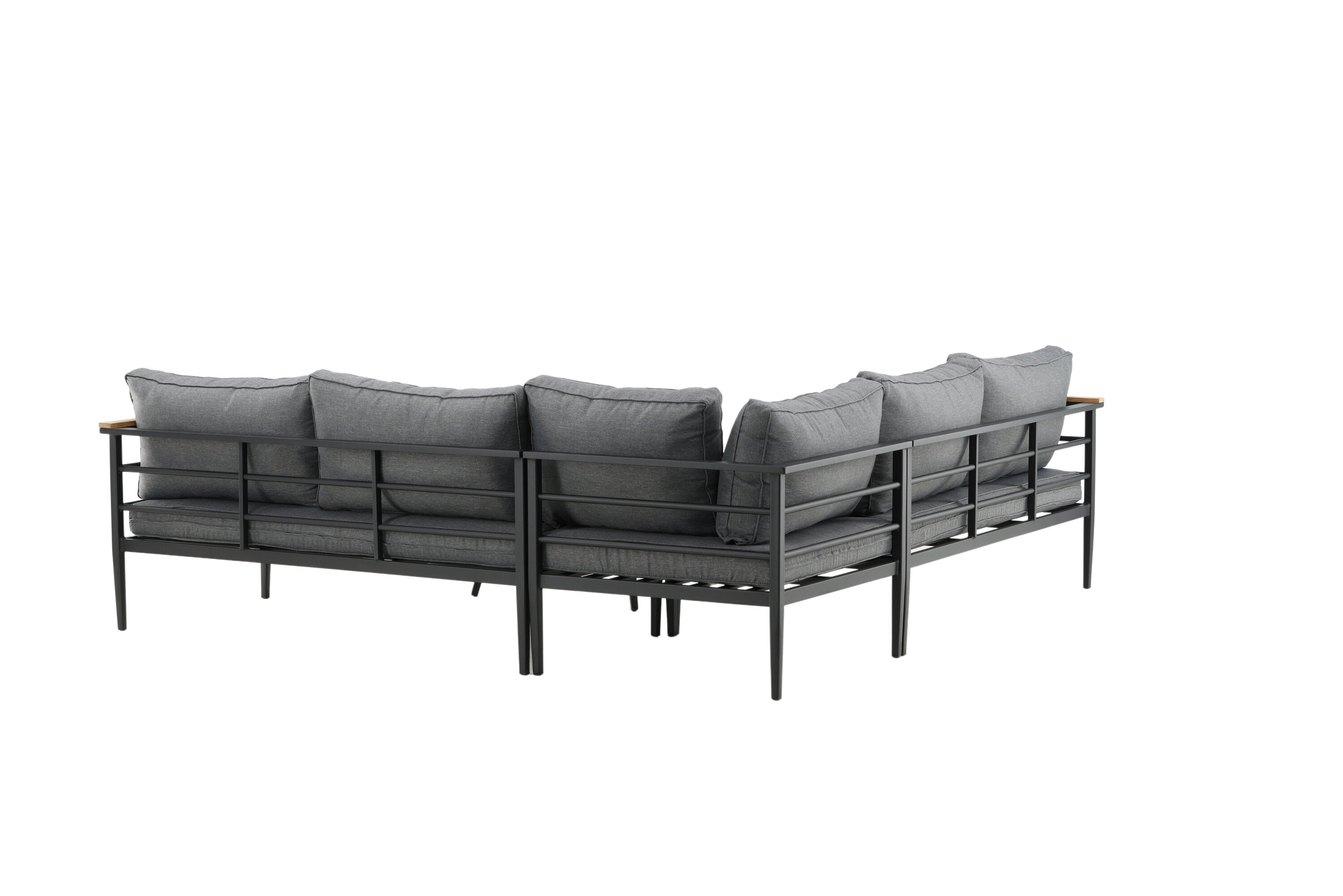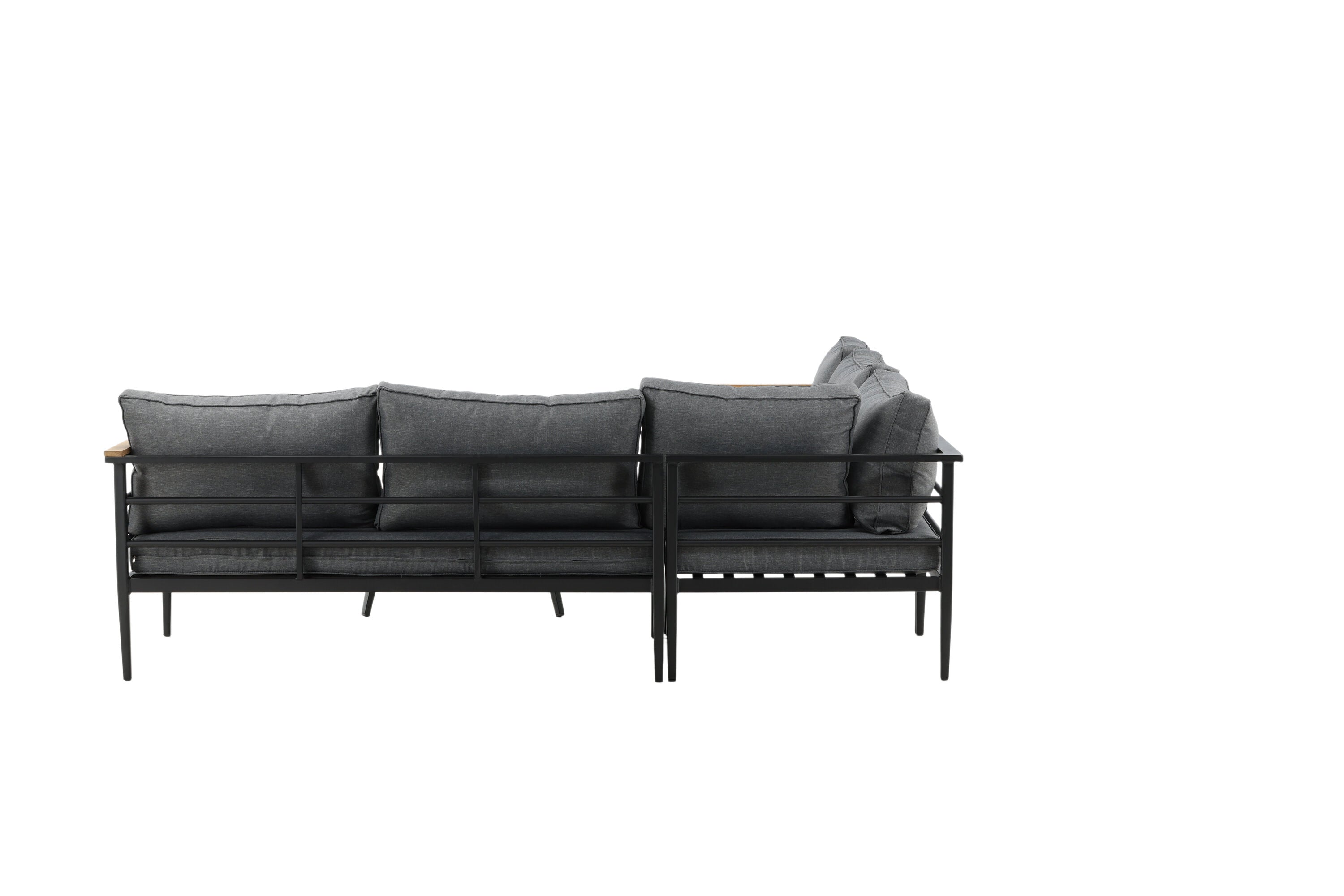 Moderní stylová sedací souprava na terasu nebo balkon. S rohovou pohovkou z černého práškově lakovaného kovového rámu s integrovanými područkami s teakovými detaily. Včetně měkkých šedých polštářů a také nízkého konferenčního stolku s podvozkem z kovu s černým práškovým nástřikem a teakovou deskou stolu.