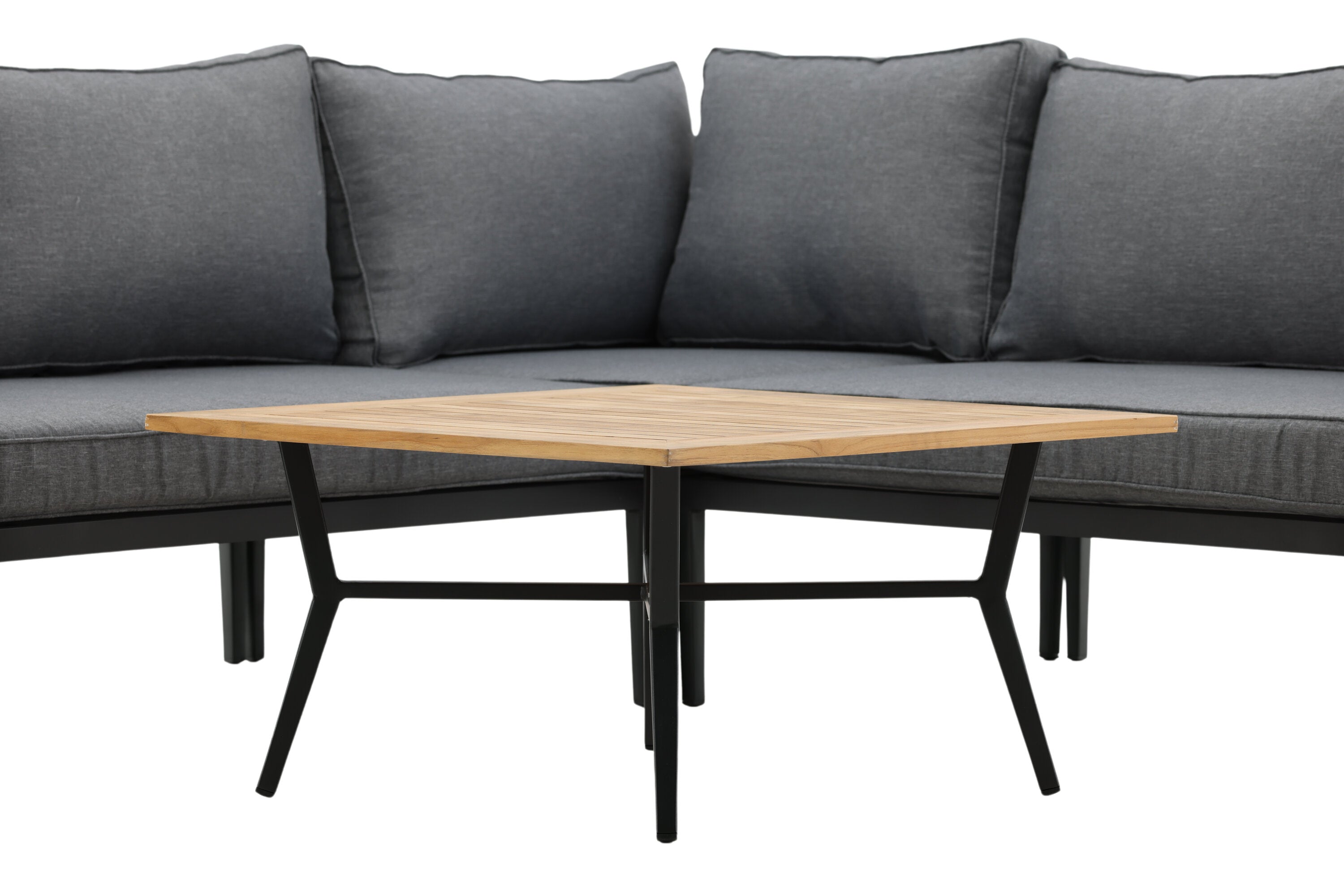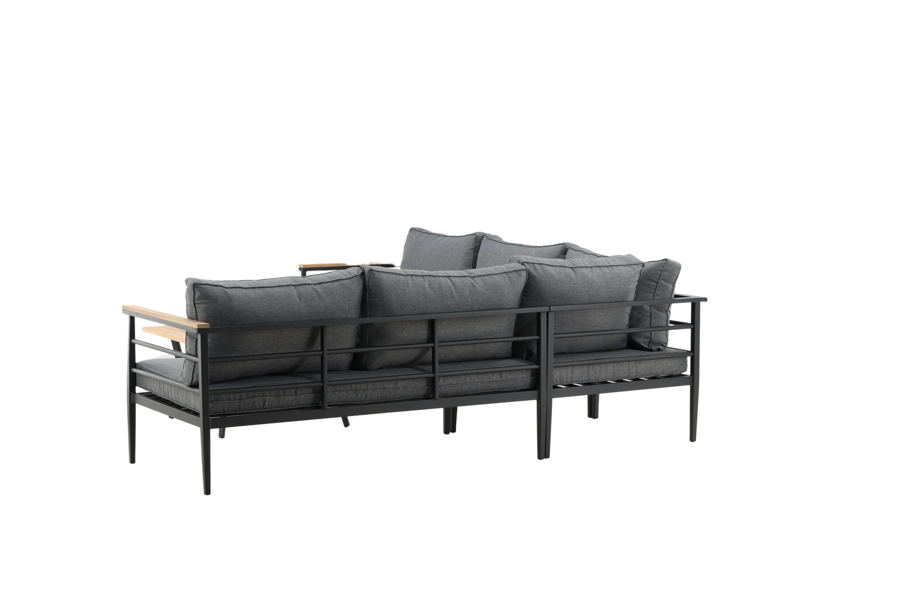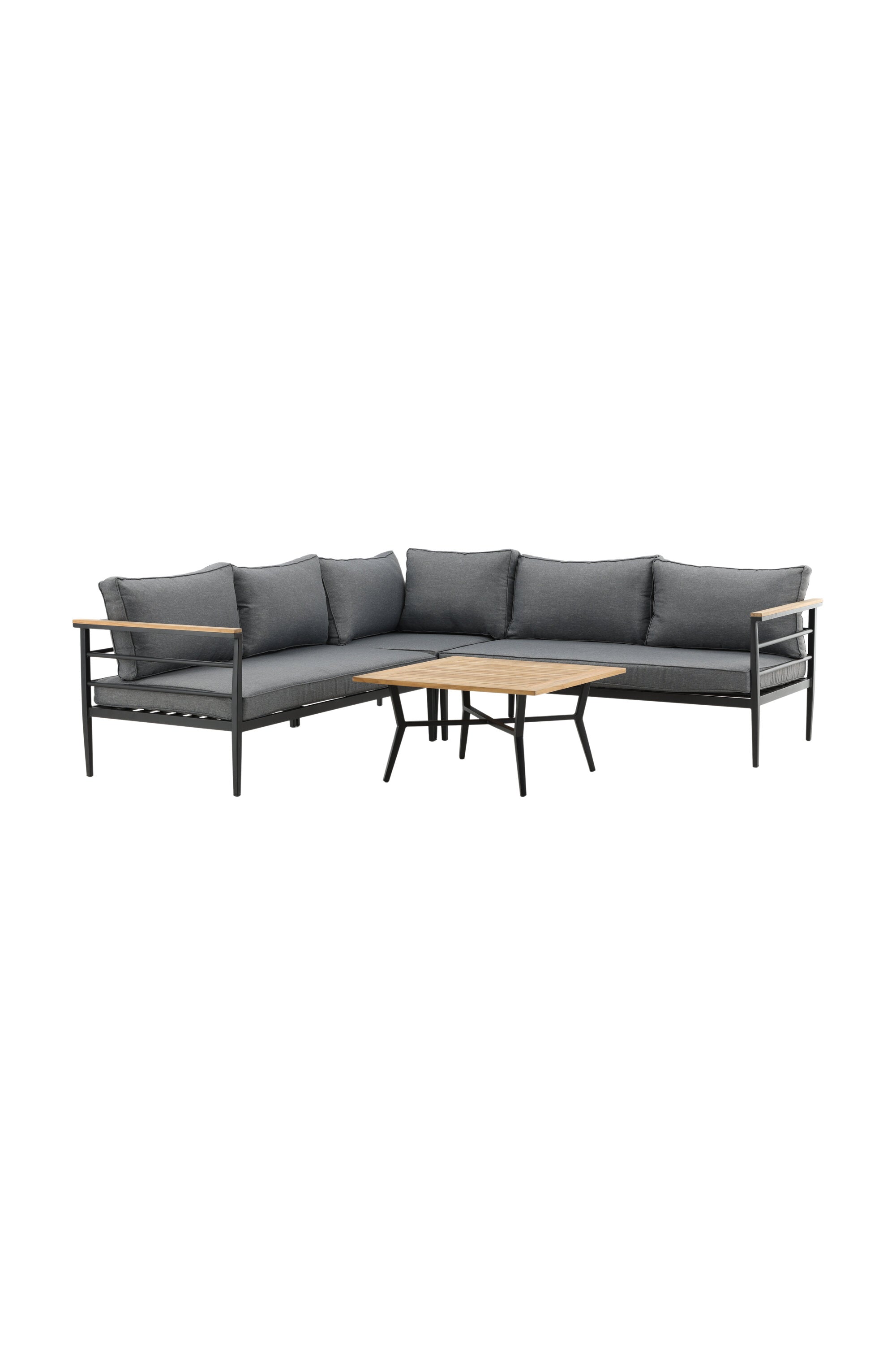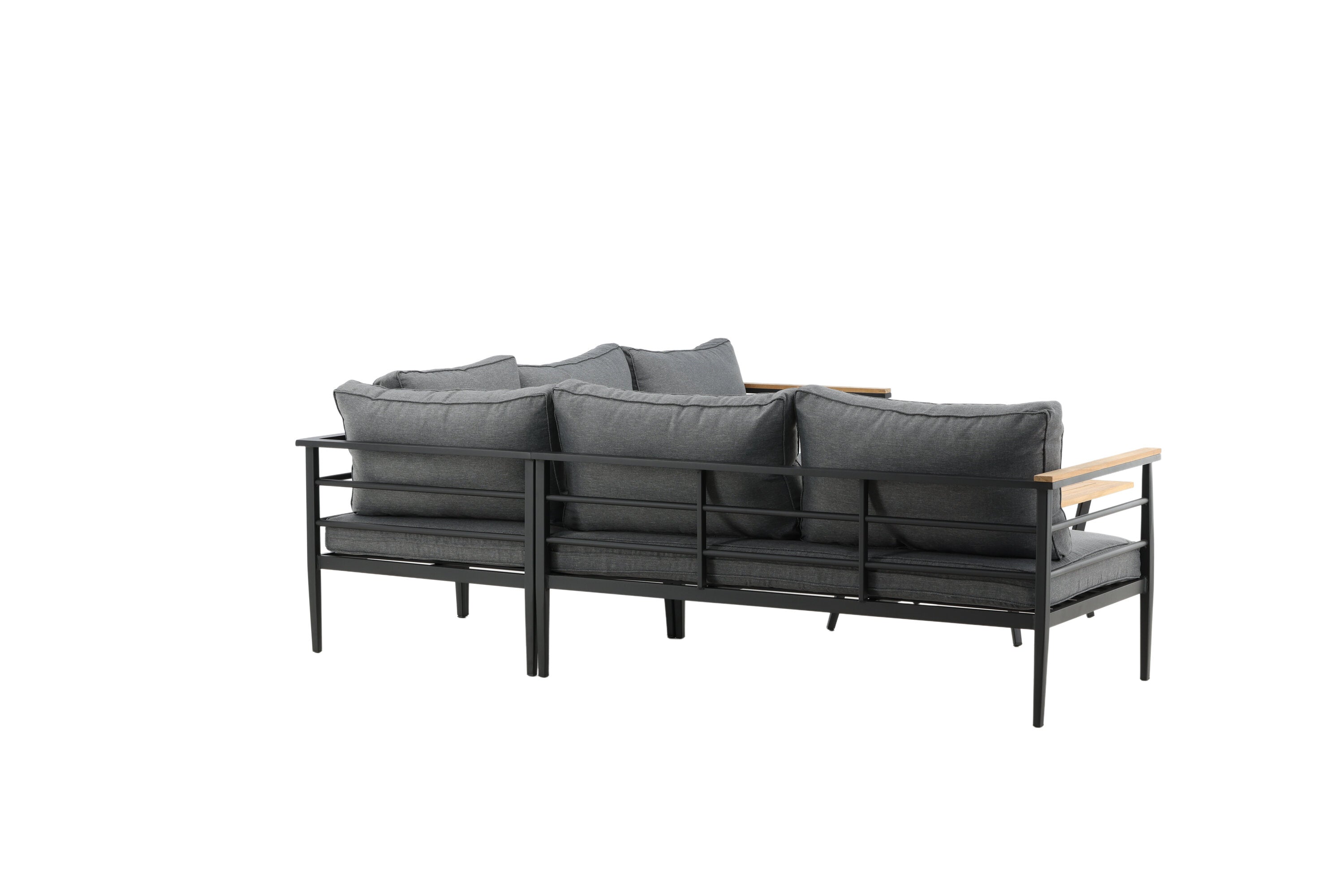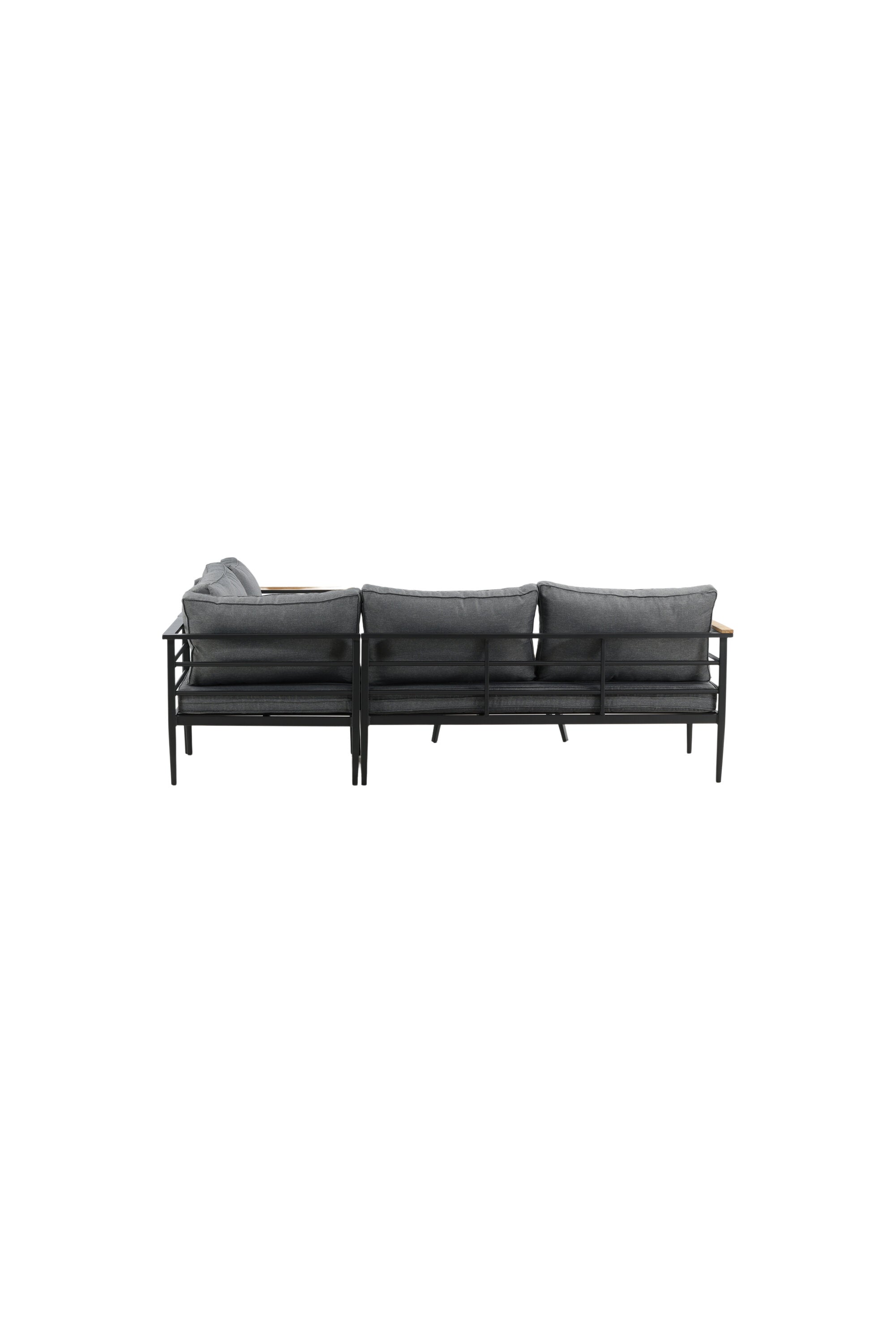 Moderní stylová sedací souprava na terasu nebo balkon. S rohovou pohovkou z černého práškově lakovaného kovového rámu s integrovanými područkami s teakovými detaily. Včetně měkkých šedých polštářů a také nízkého konferenčního stolku s podvozkem z kovu s černým práškovým nástřikem a teakovou deskou stolu.