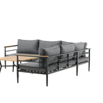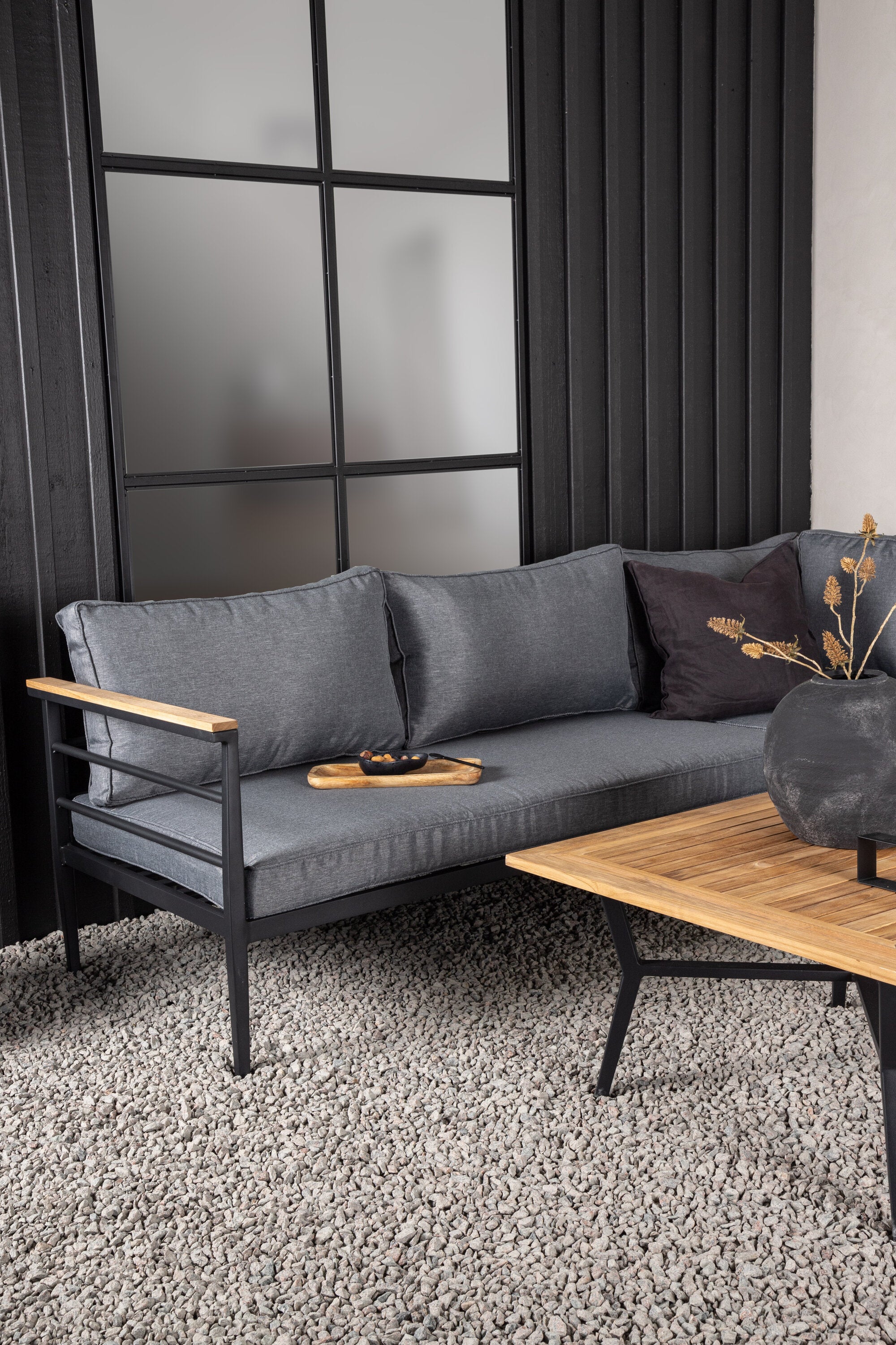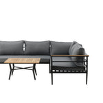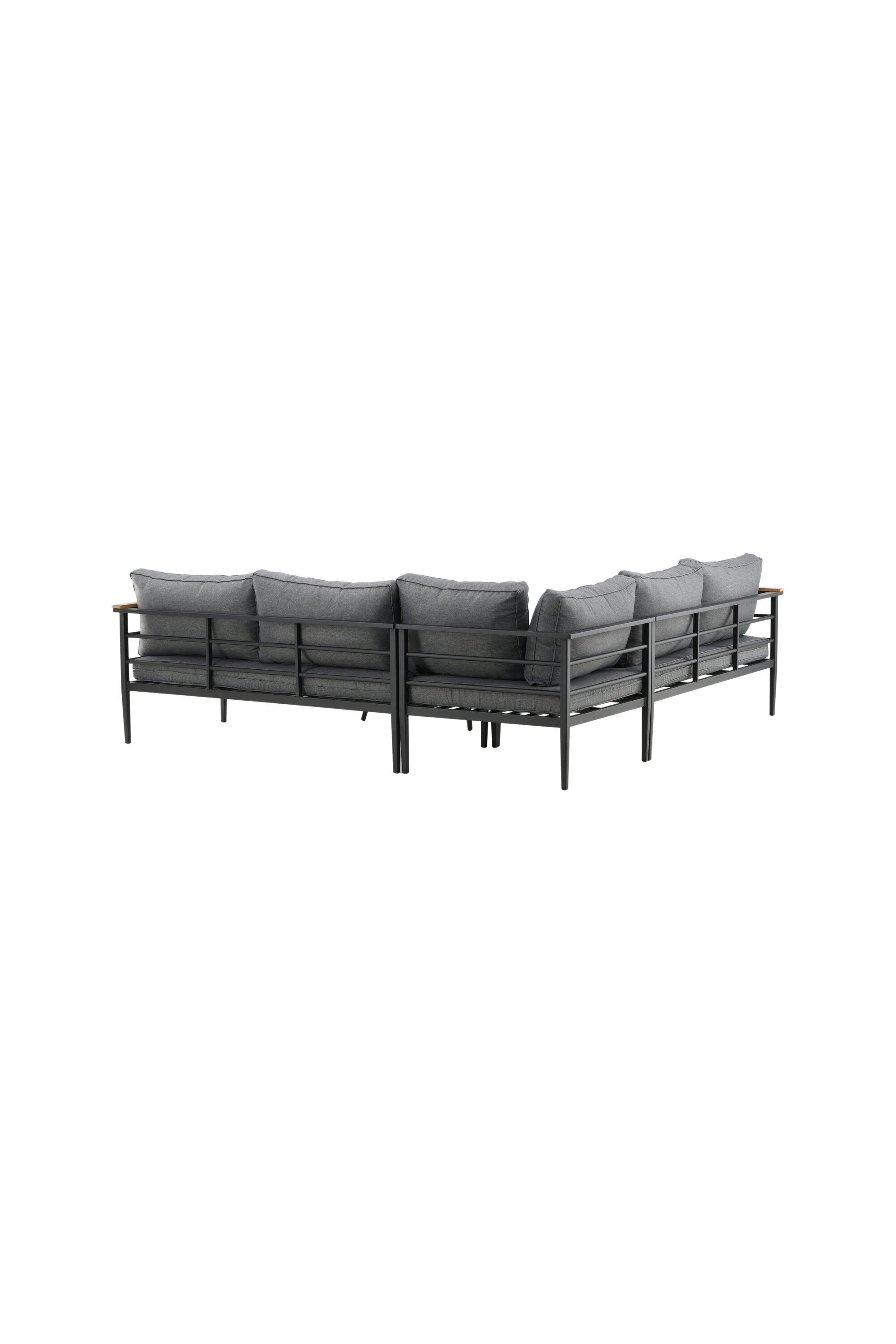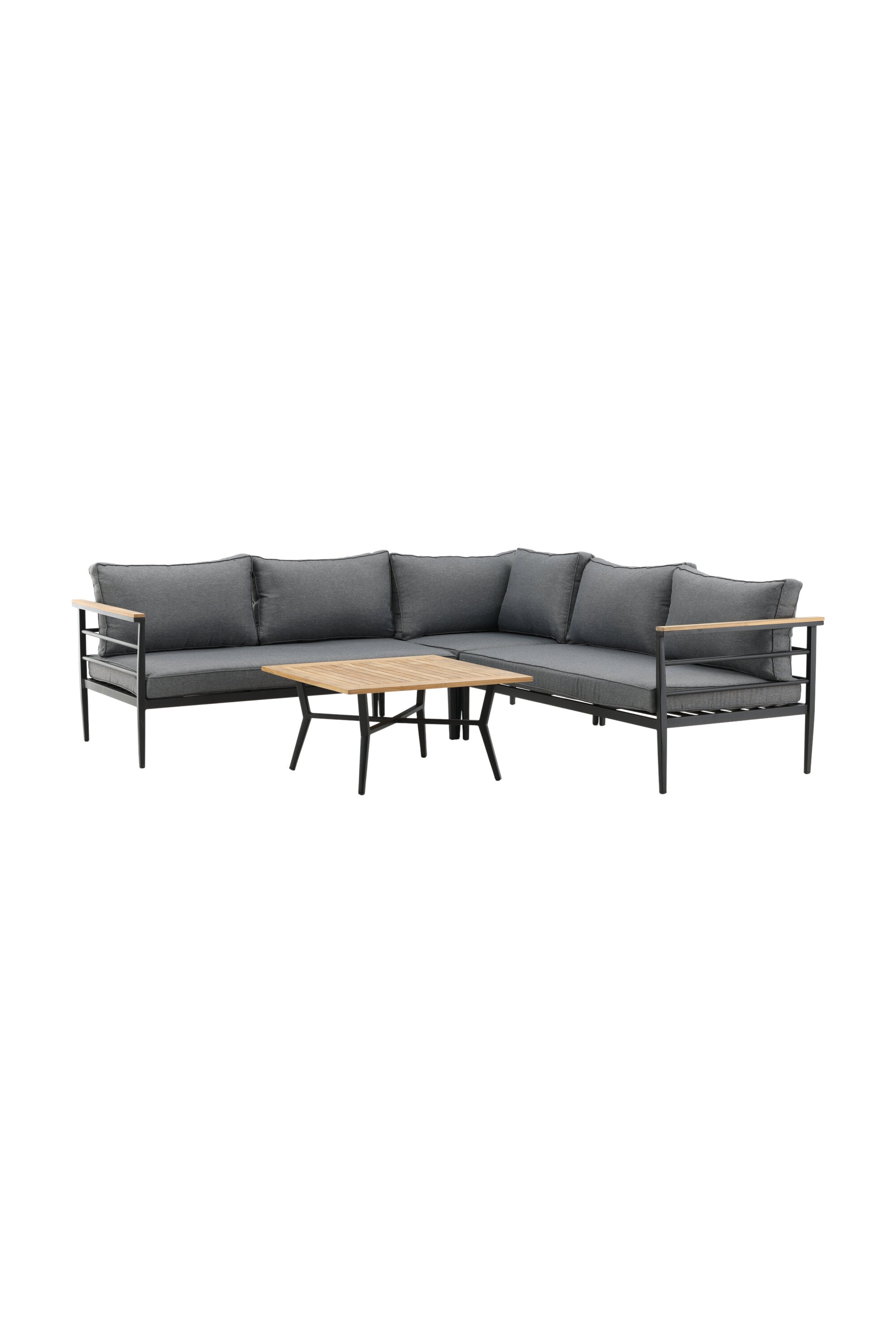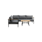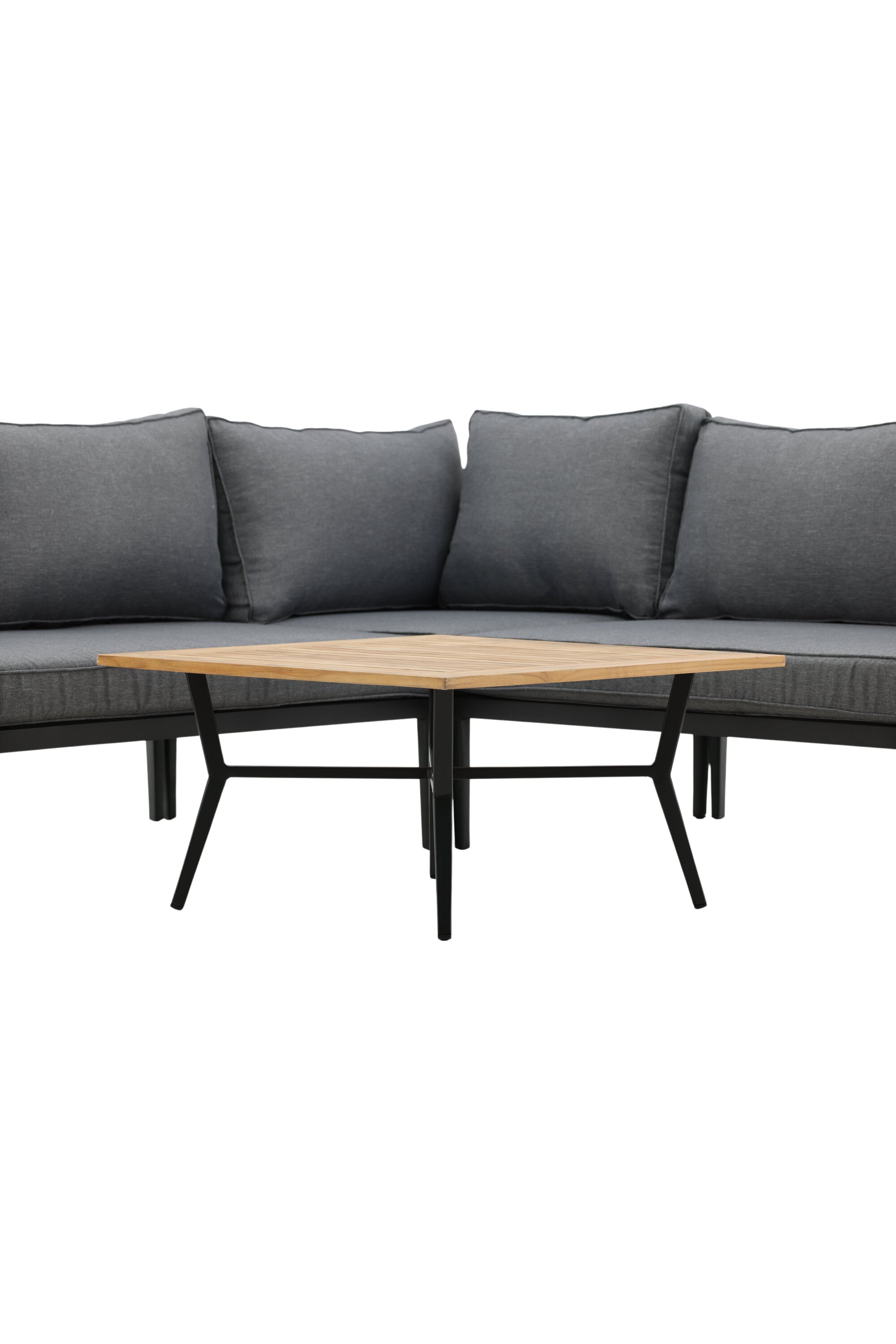Moderní stylová sedací souprava na terasu nebo balkon. S rohovou pohovkou z černého práškově lakovaného kovového rámu s integrovanými područkami s teakovými detaily. Včetně měkkých šedých polštářů a také nízkého konferenčního stolku s podvozkem z kovu s černým práškovým nástřikem a teakovou deskou stolu.