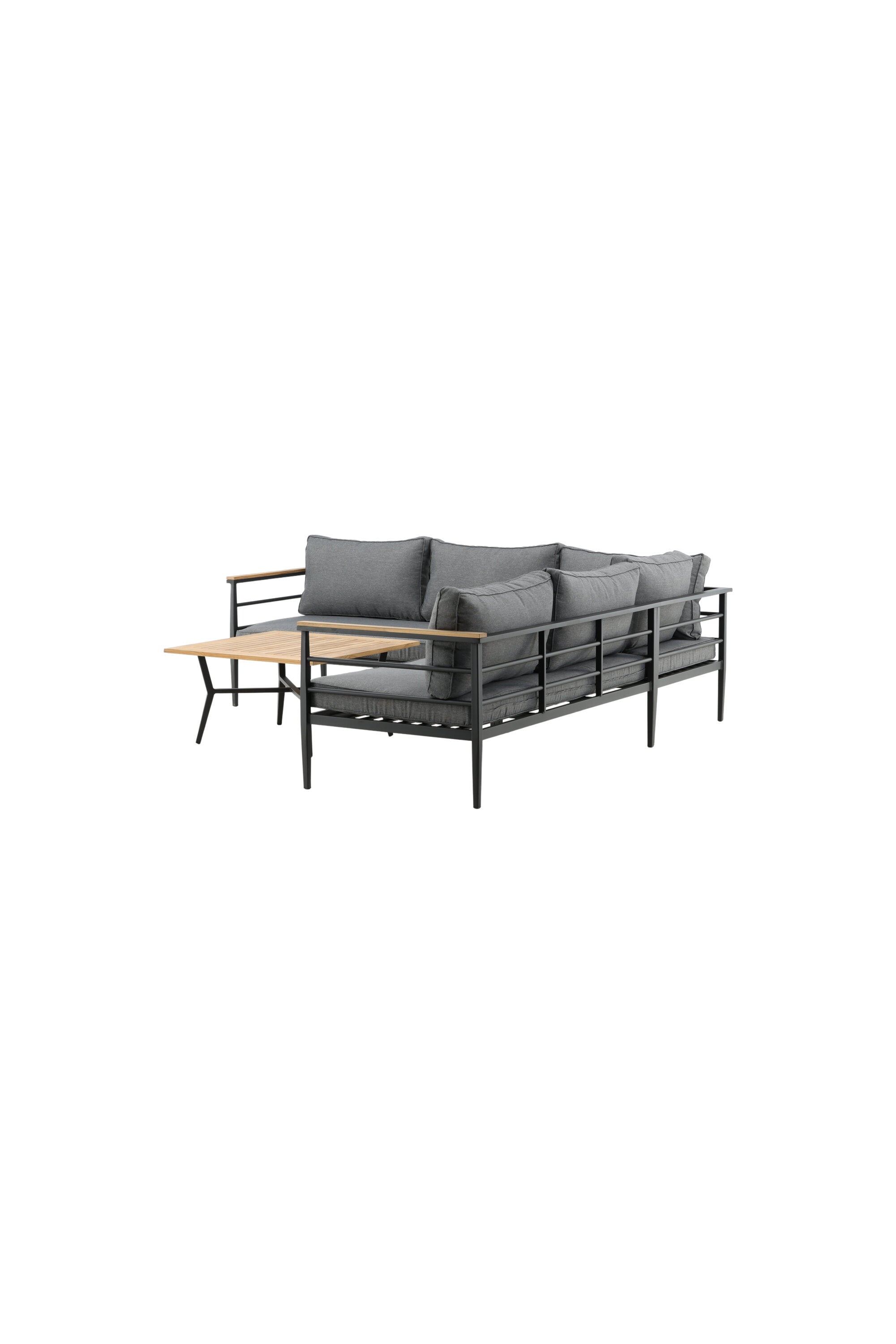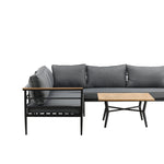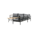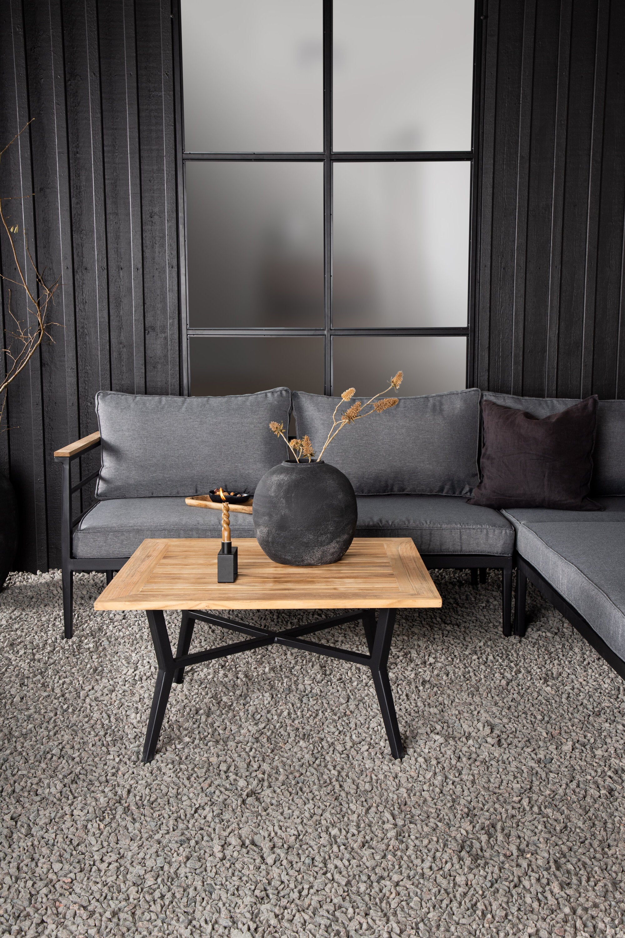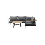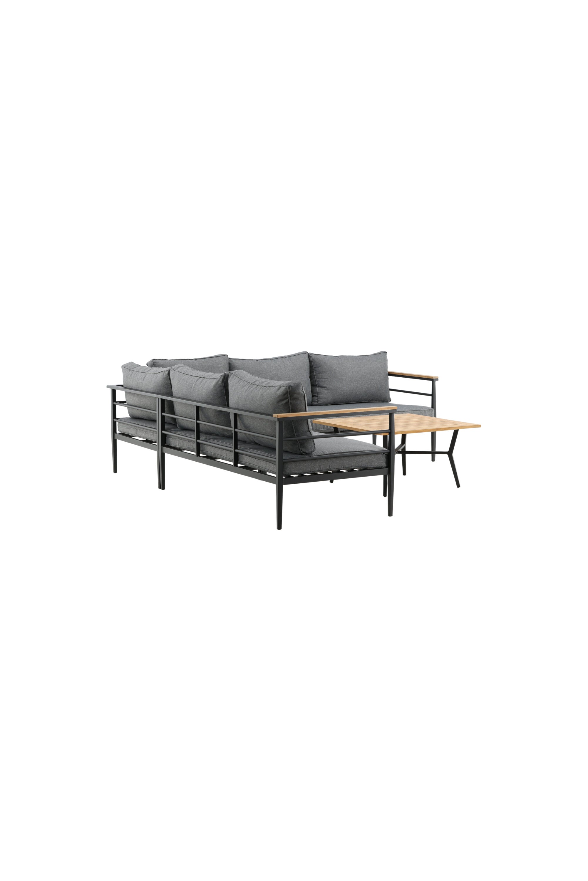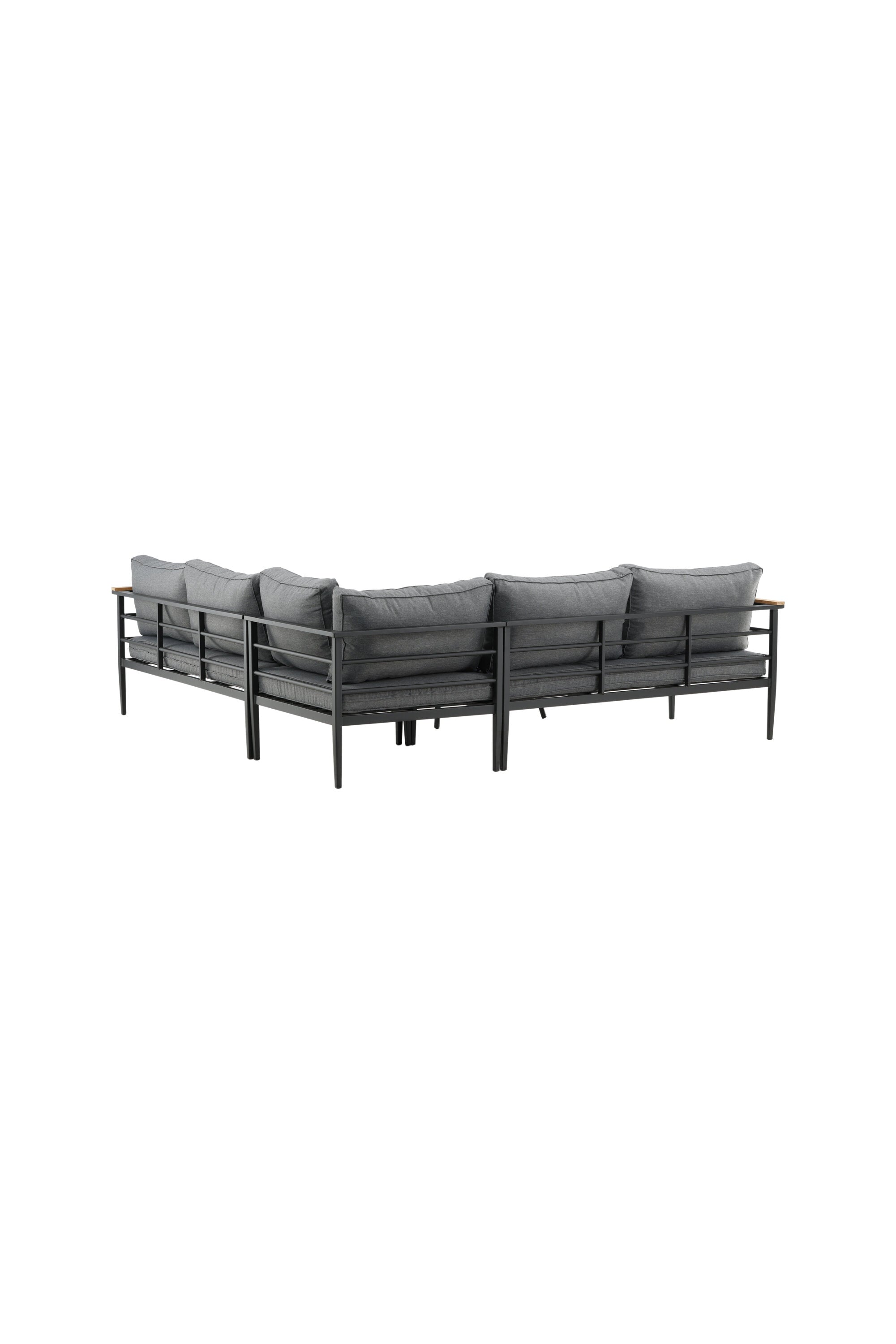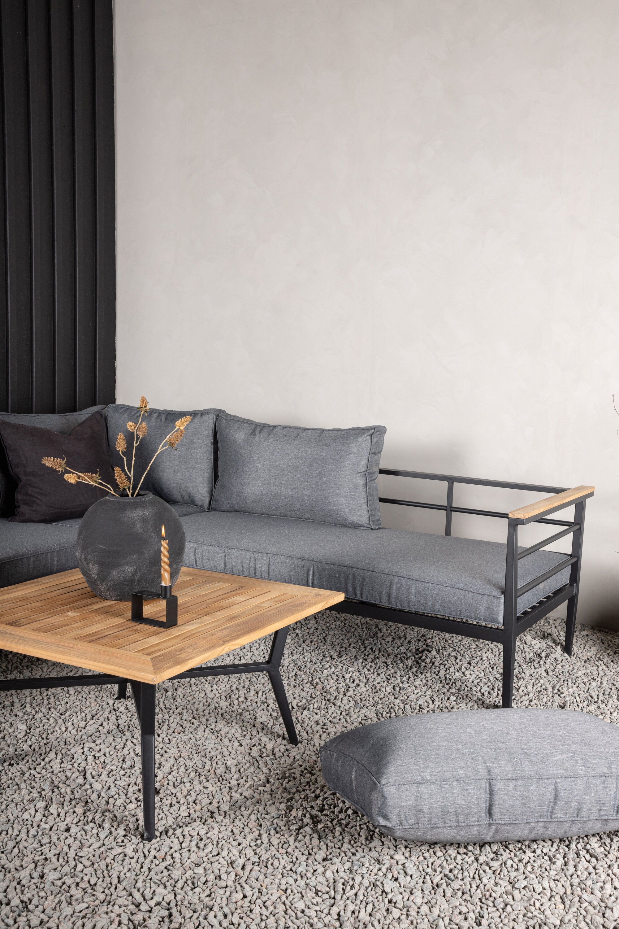 Moderní stylová sedací souprava na terasu nebo balkon. S rohovou pohovkou z černého práškově lakovaného kovového rámu s integrovanými područkami s teakovými detaily. Včetně měkkých šedých polštářů a také nízkého konferenčního stolku s podvozkem z kovu s černým práškovým nástřikem a teakovou deskou stolu.