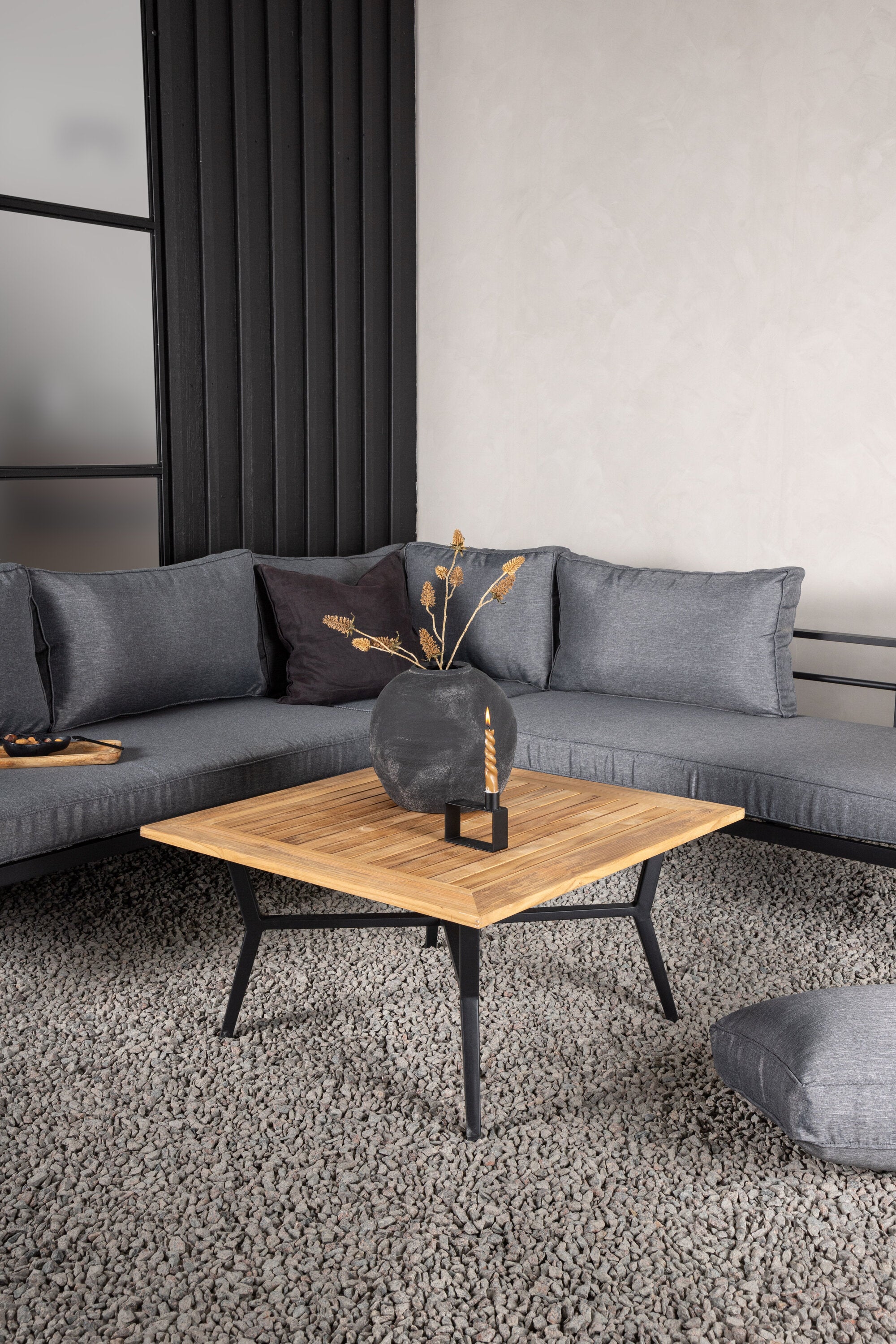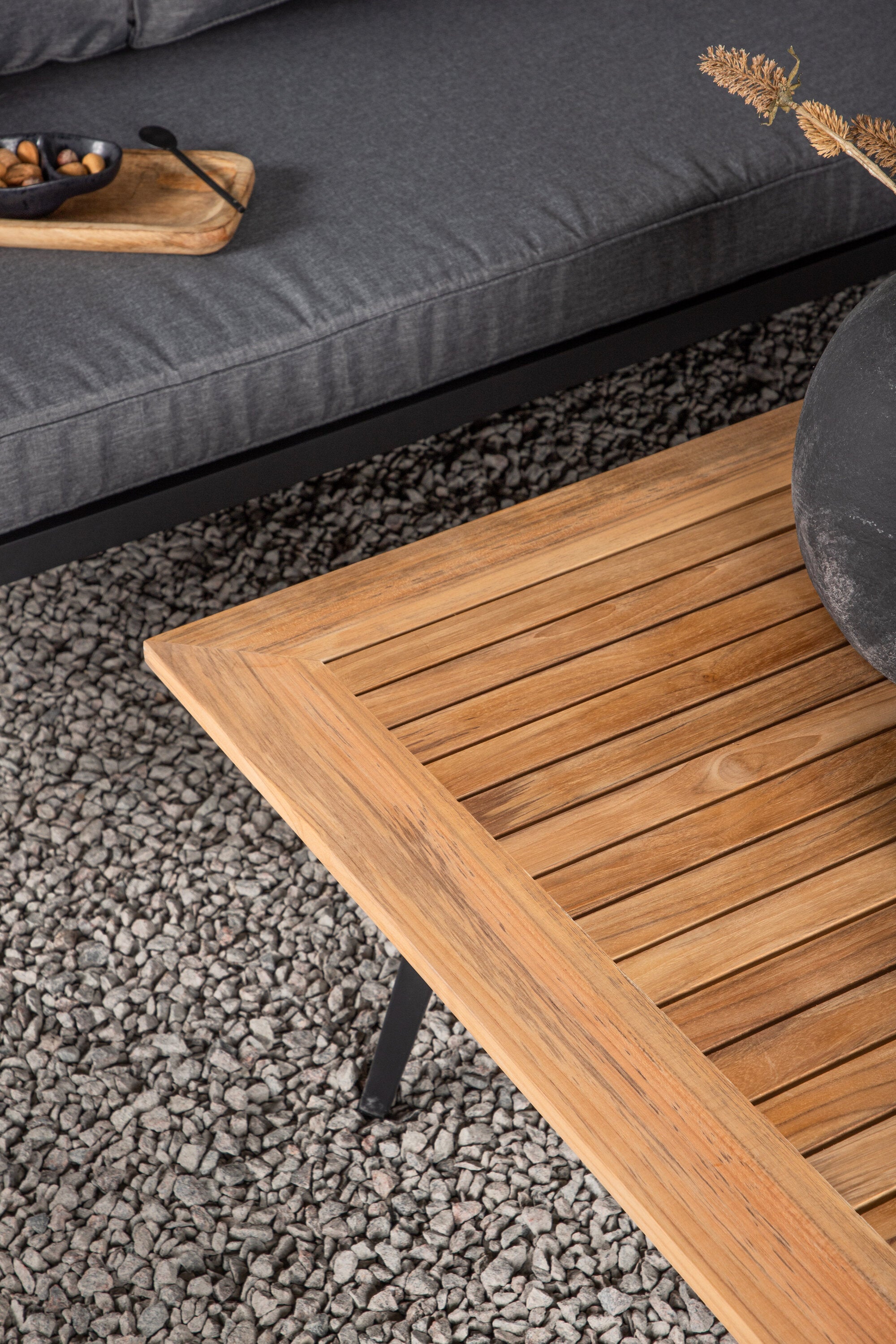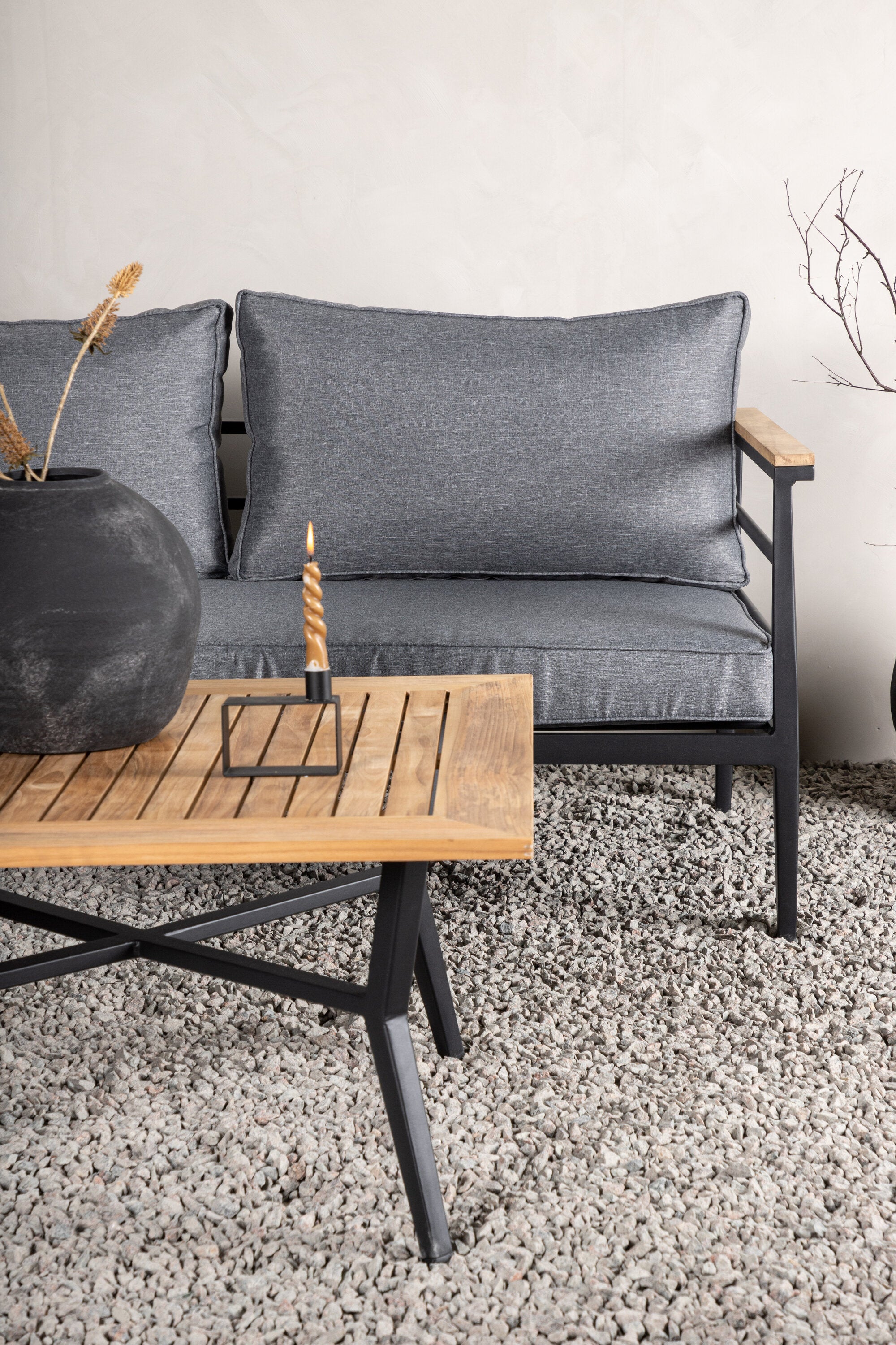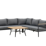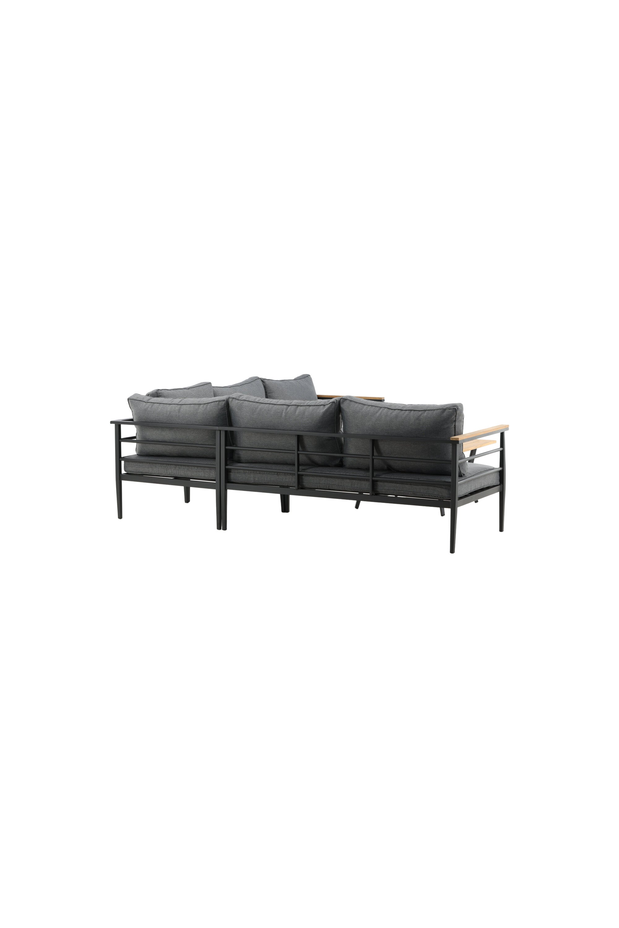 Moderní stylová sedací souprava na terasu nebo balkon. S rohovou pohovkou z černého práškově lakovaného kovového rámu s integrovanými područkami s teakovými detaily. Včetně měkkých šedých polštářů a také nízkého konferenčního stolku s podvozkem z kovu s černým práškovým nástřikem a teakovou deskou stolu.