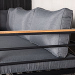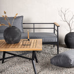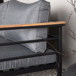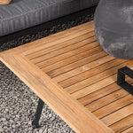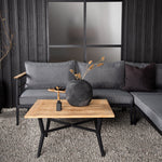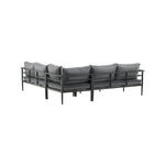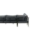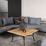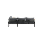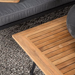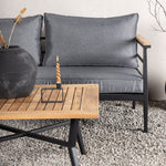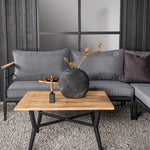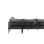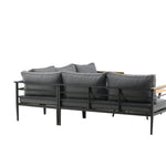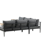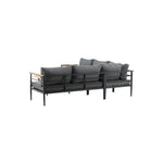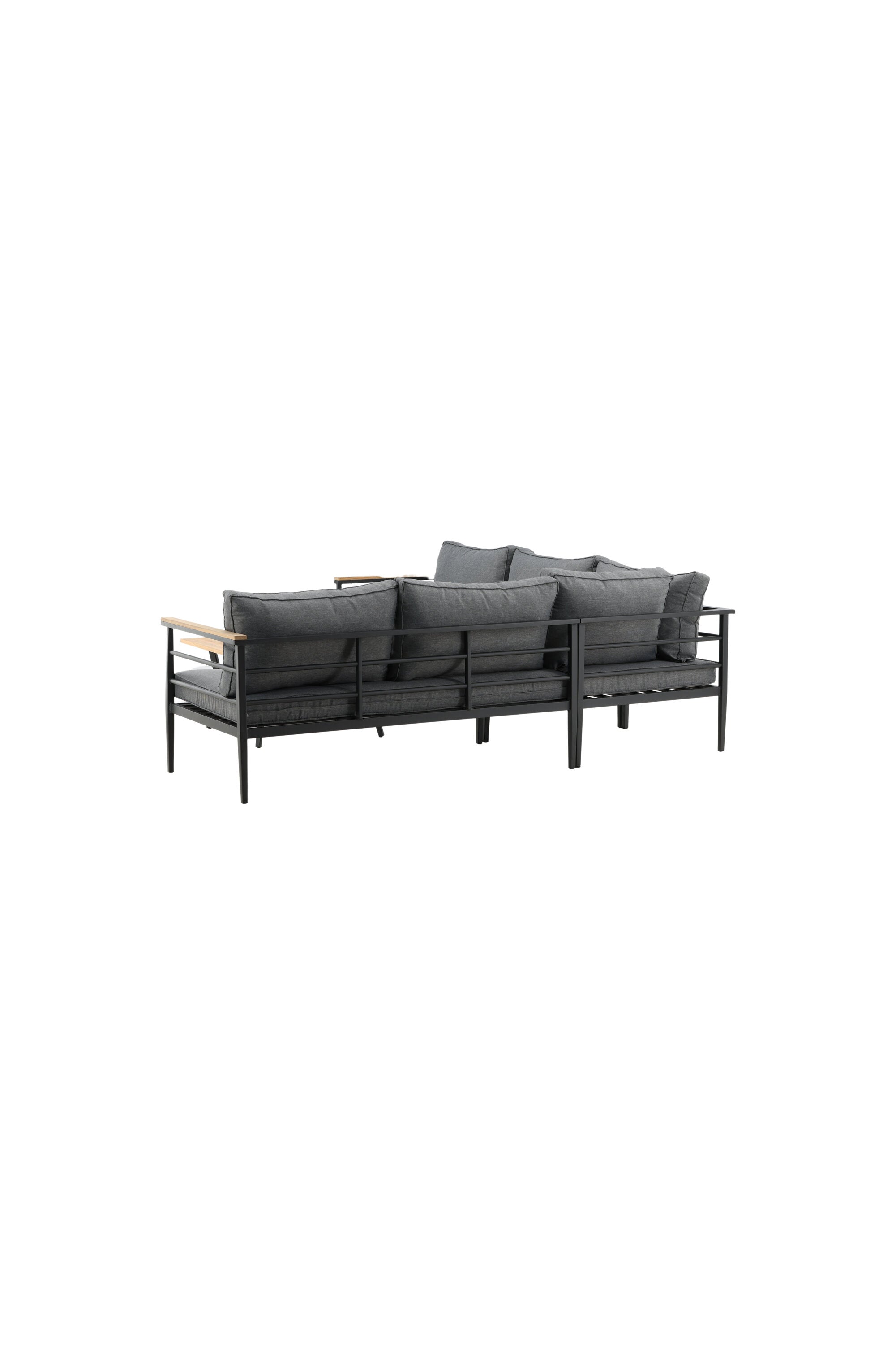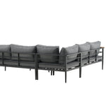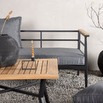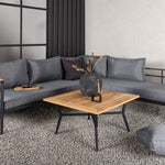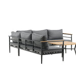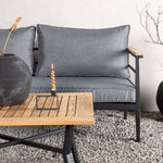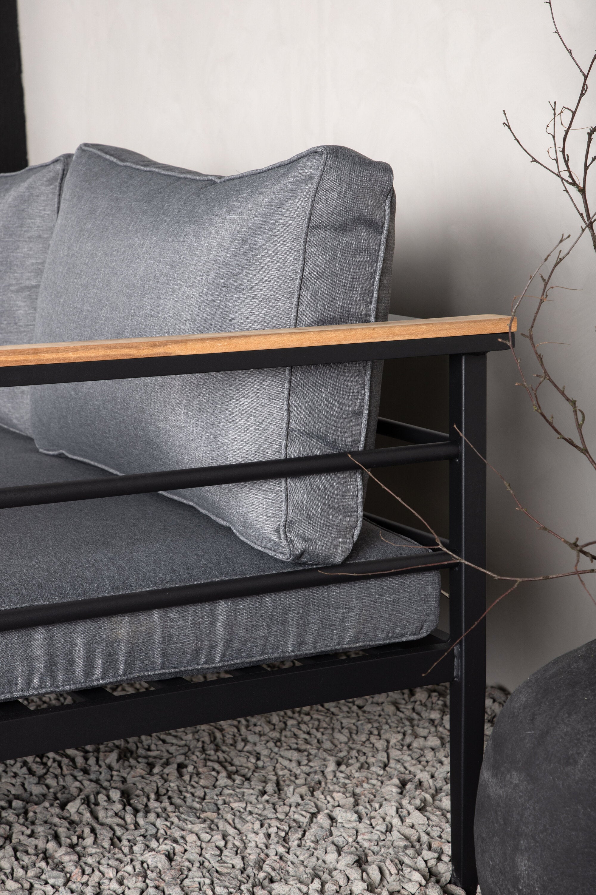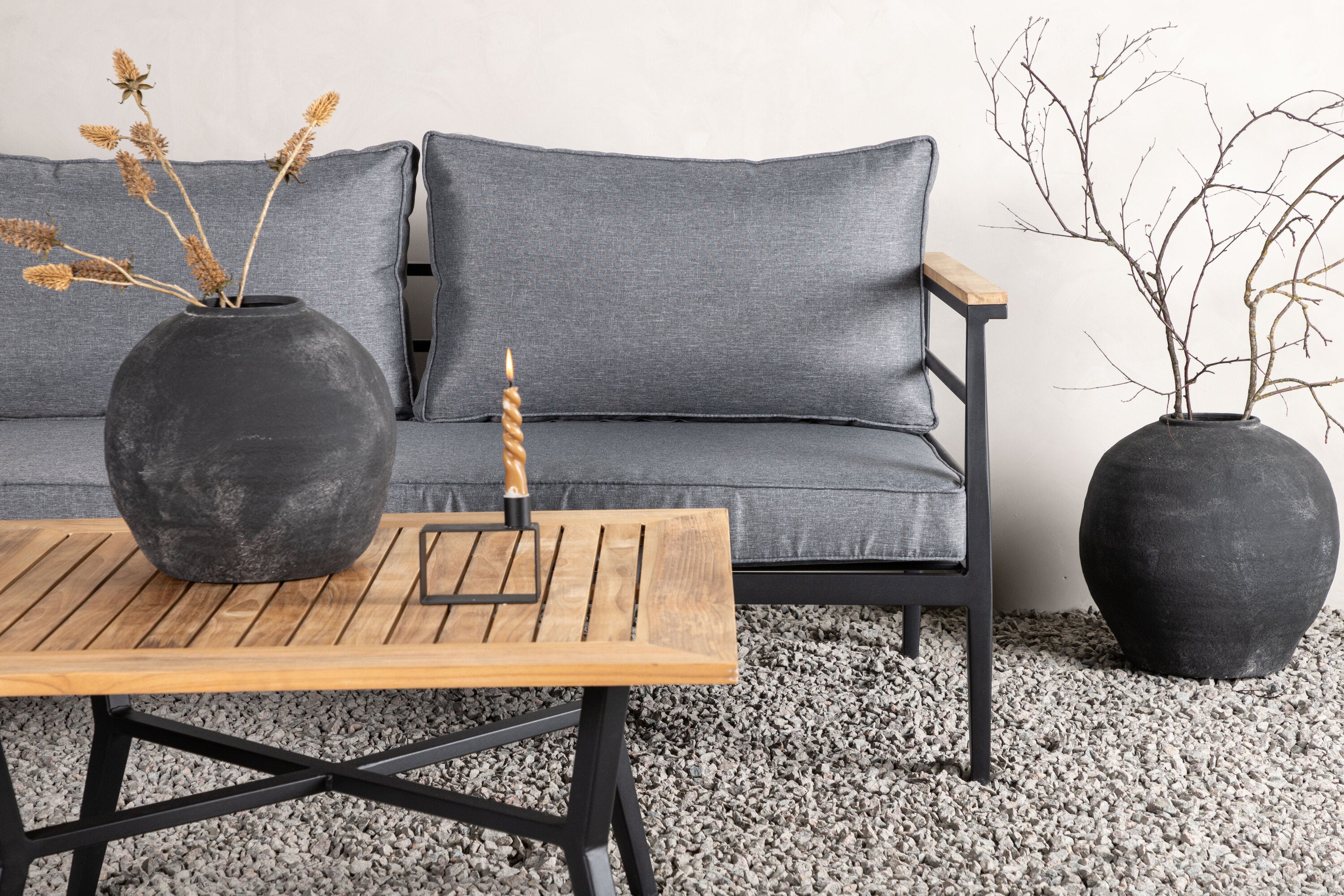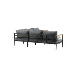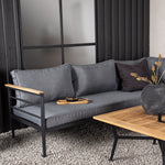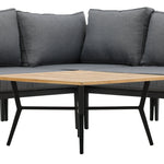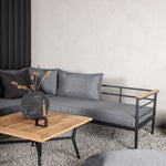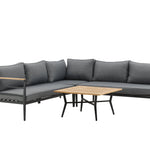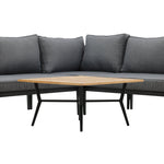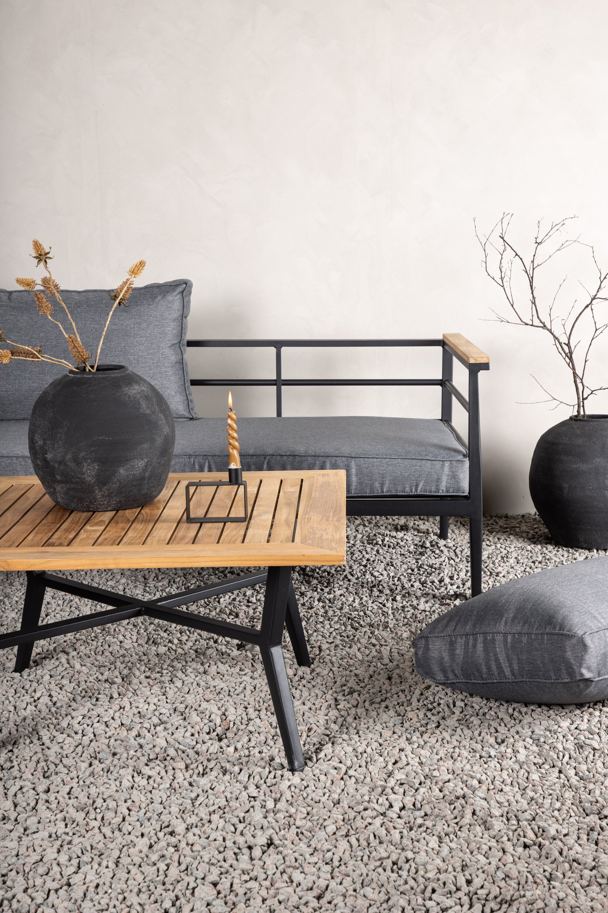 Moderní stylová sedací souprava na terasu nebo balkon. S rohovou pohovkou z černého práškově lakovaného kovového rámu s integrovanými područkami s teakovými detaily. Včetně měkkých šedých polštářů a také nízkého konferenčního stolku s podvozkem z kovu s černým práškovým nástřikem a teakovou deskou stolu.