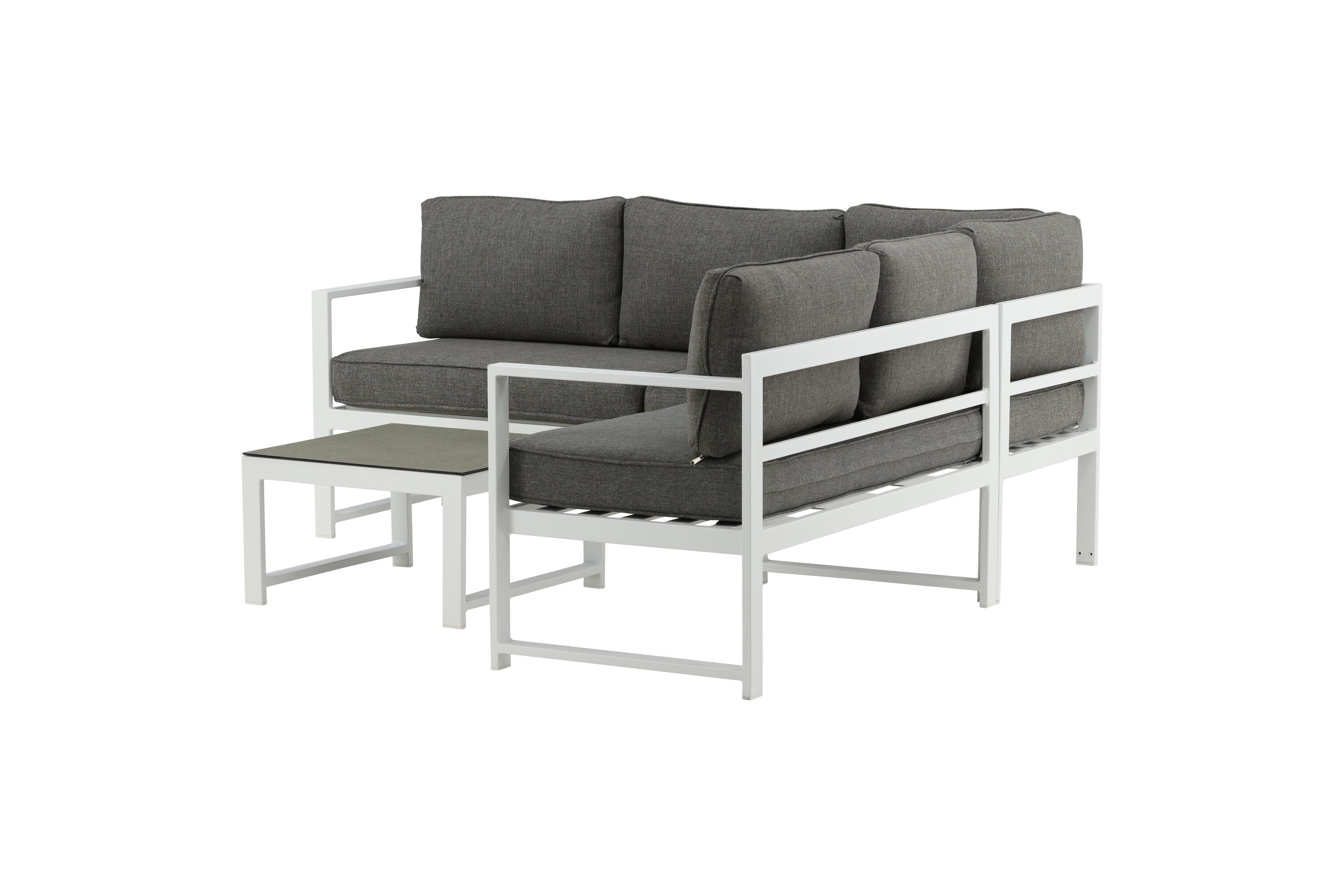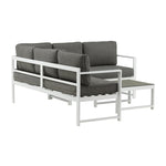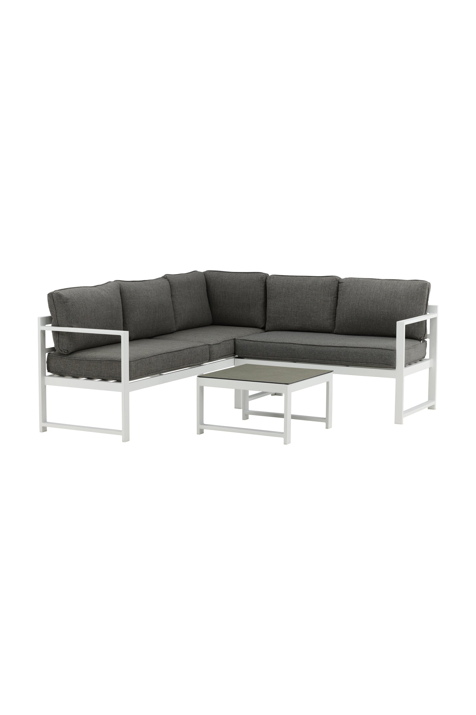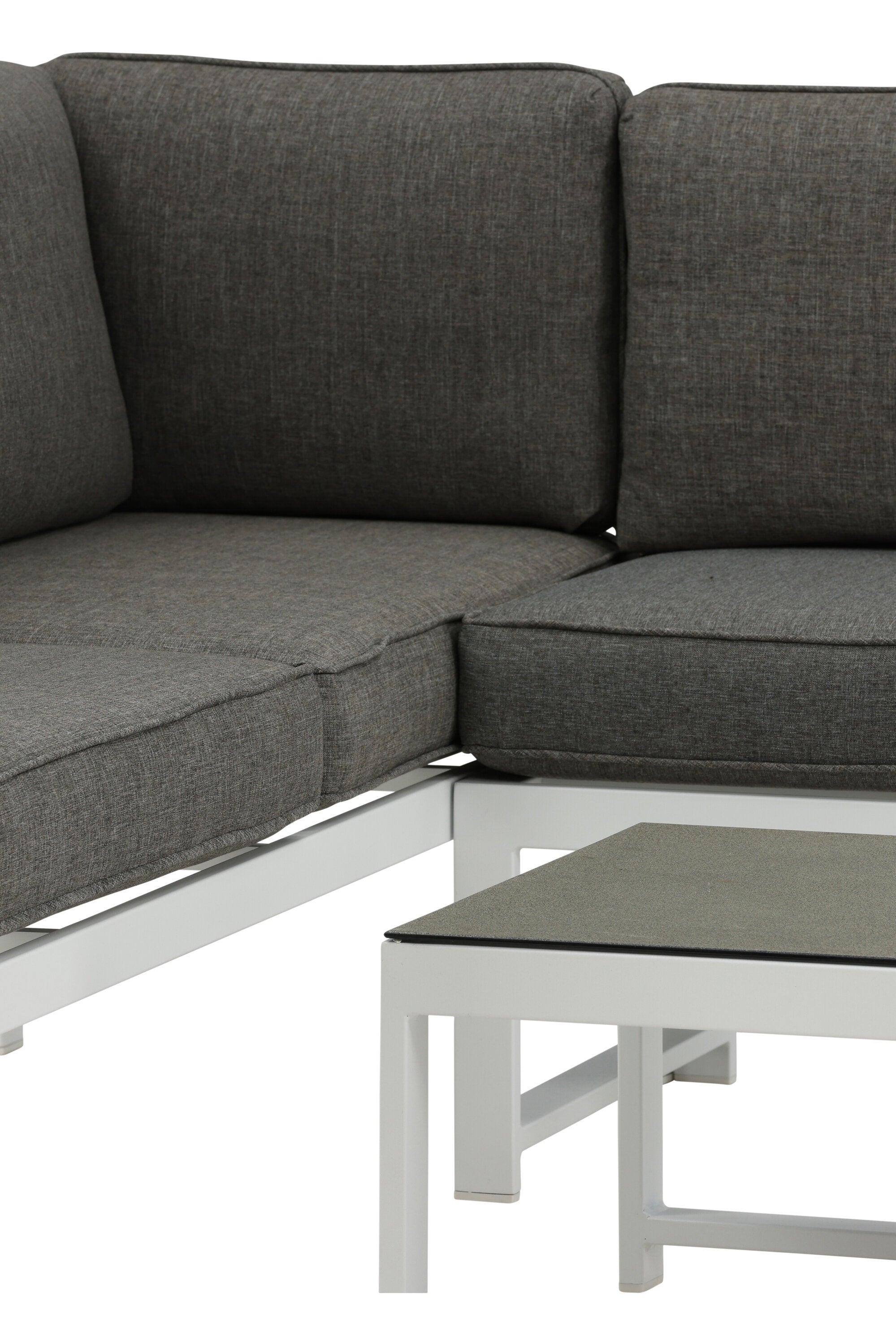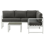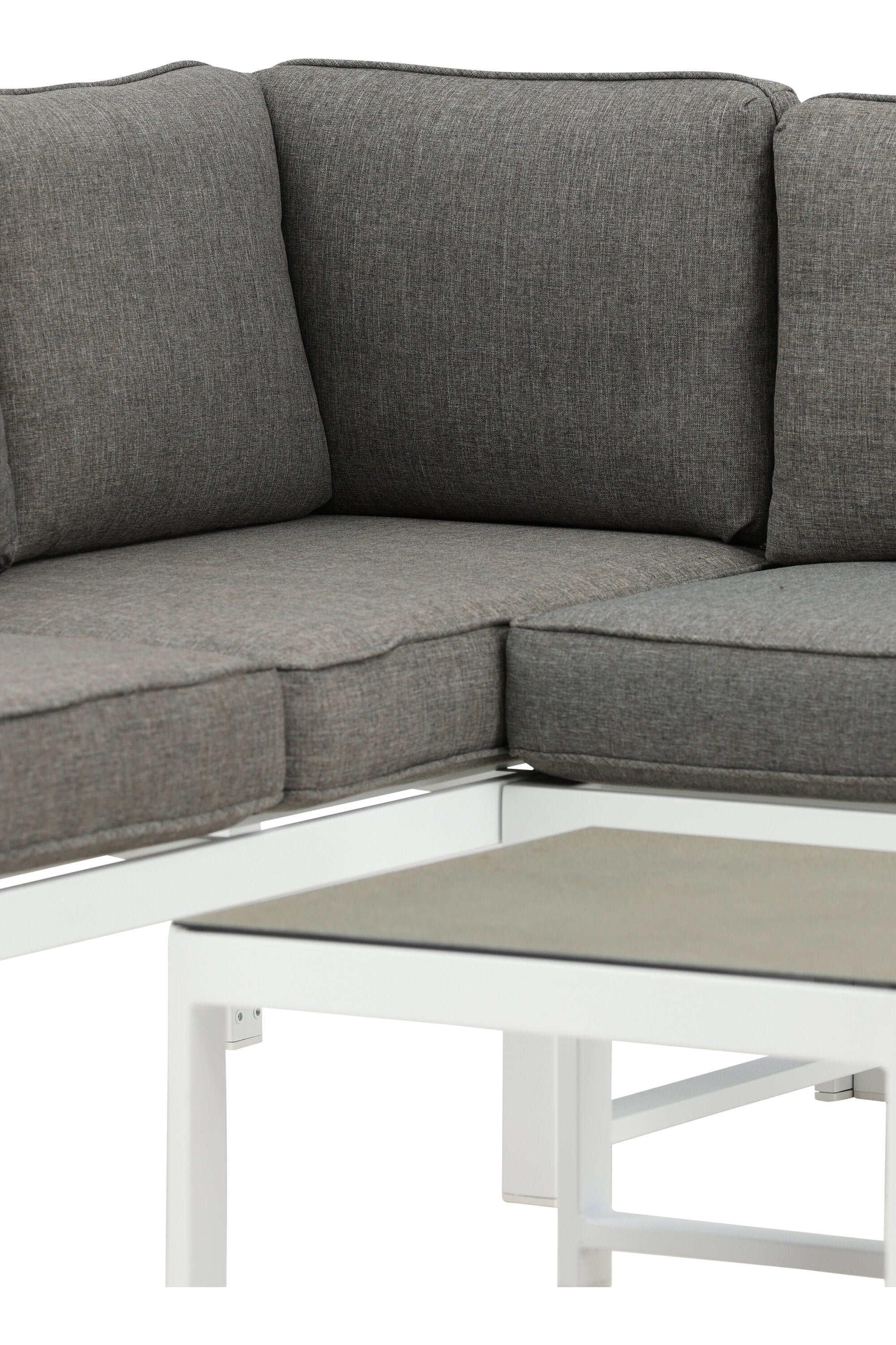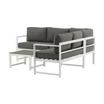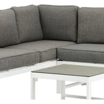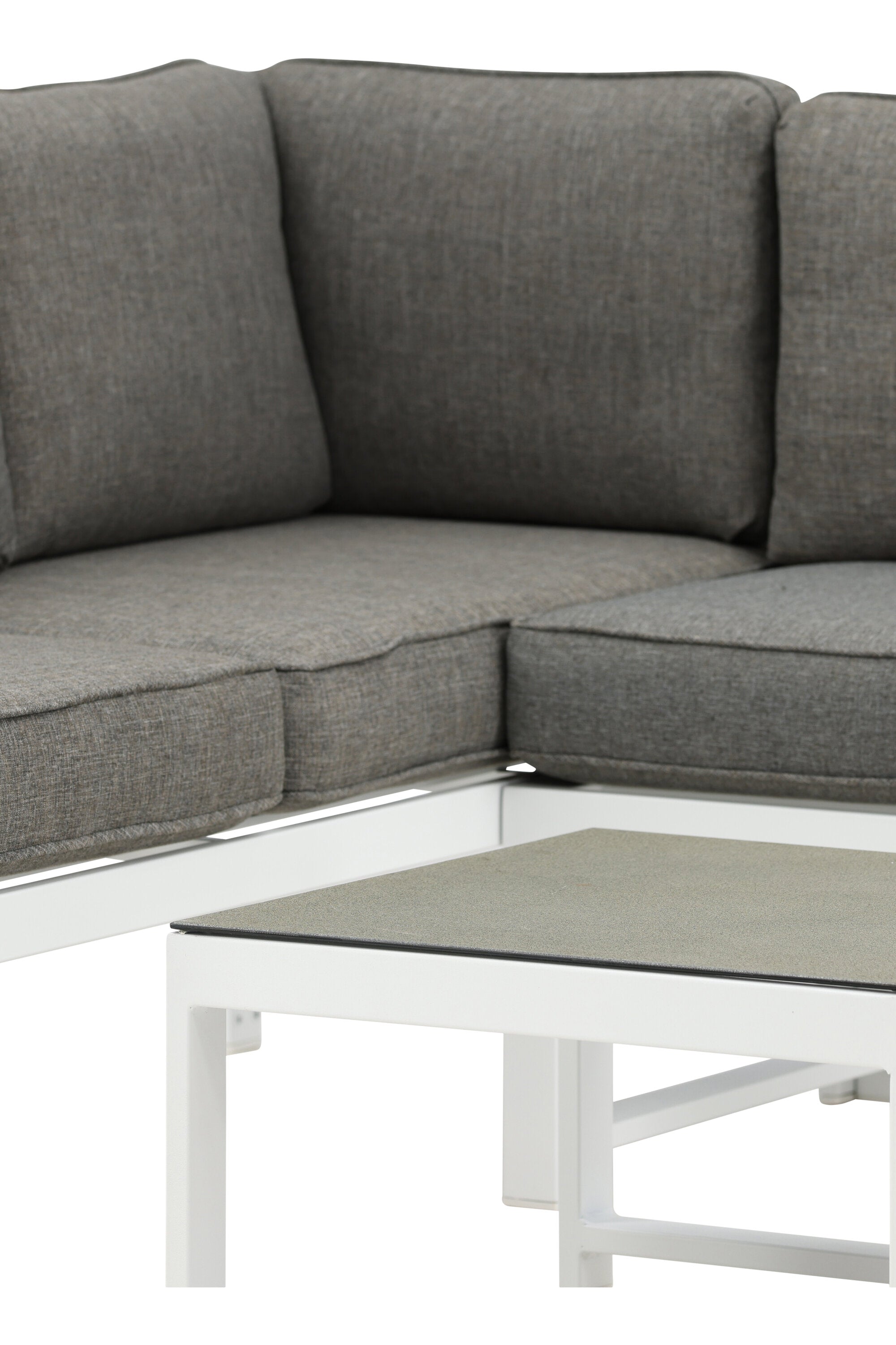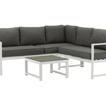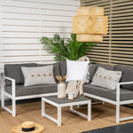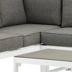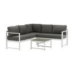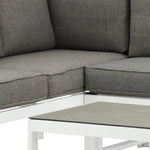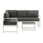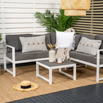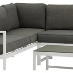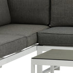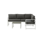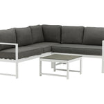 Moderní stylová sedací souprava s rohovou pohovkou na terasu nebo balkon. Vyrobeno z bílého práškově lakovaného kovového rámu s integrovanými područkami. Včetně měkkých šedých polštářků a nízkého konferenčního stolku ve skle se smrkovým projevem. Je vyžadována lehčí montáž.