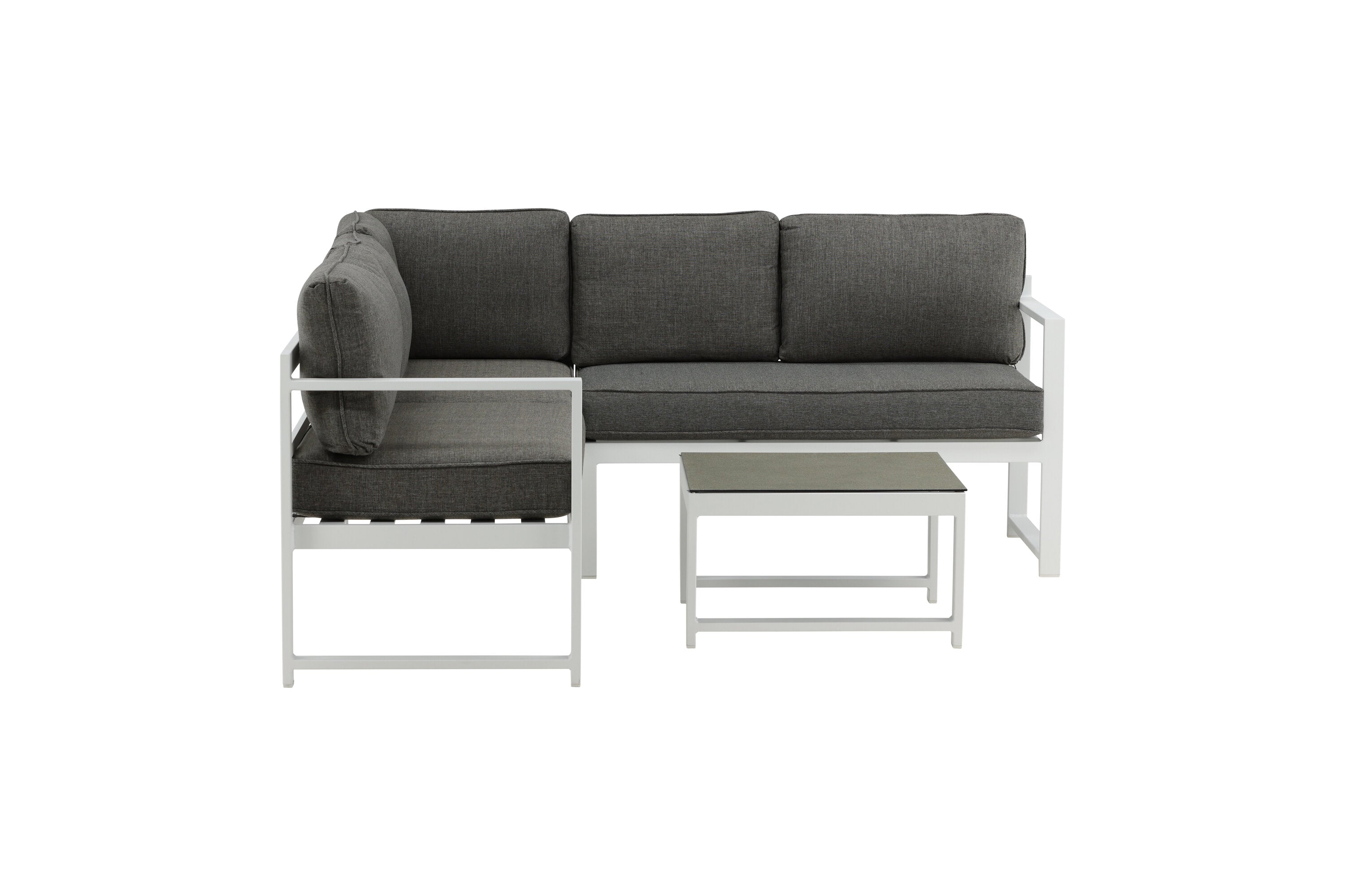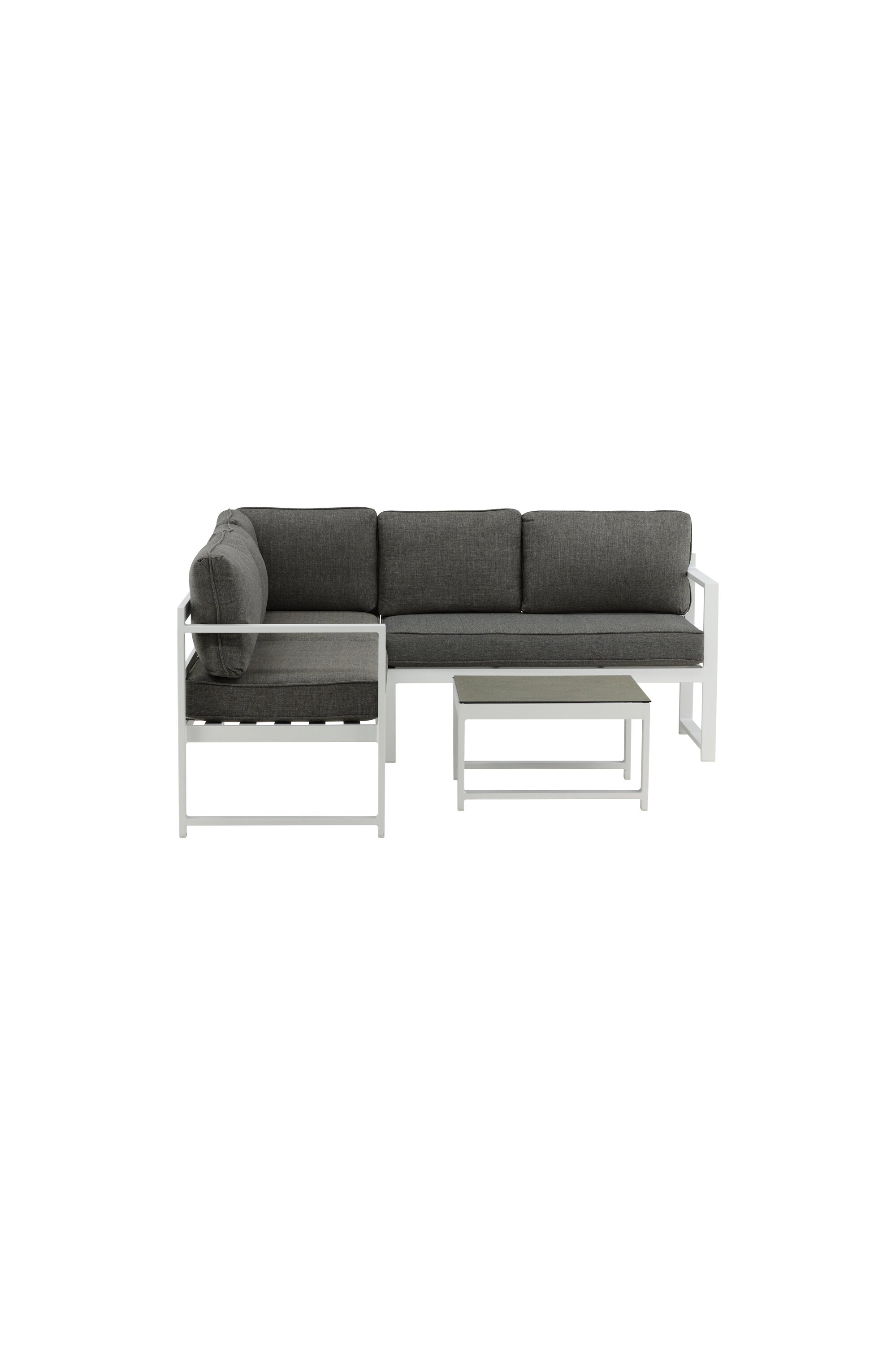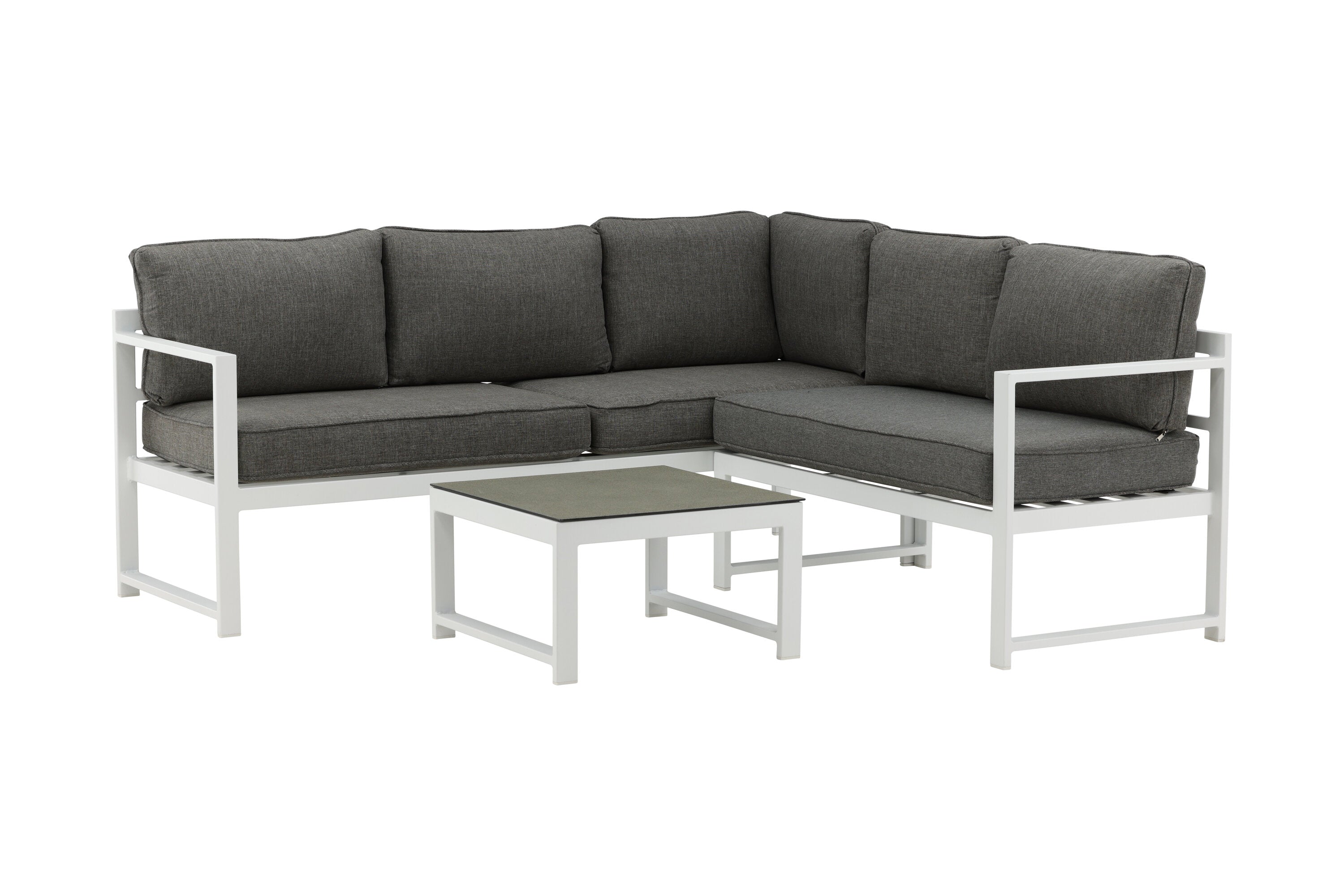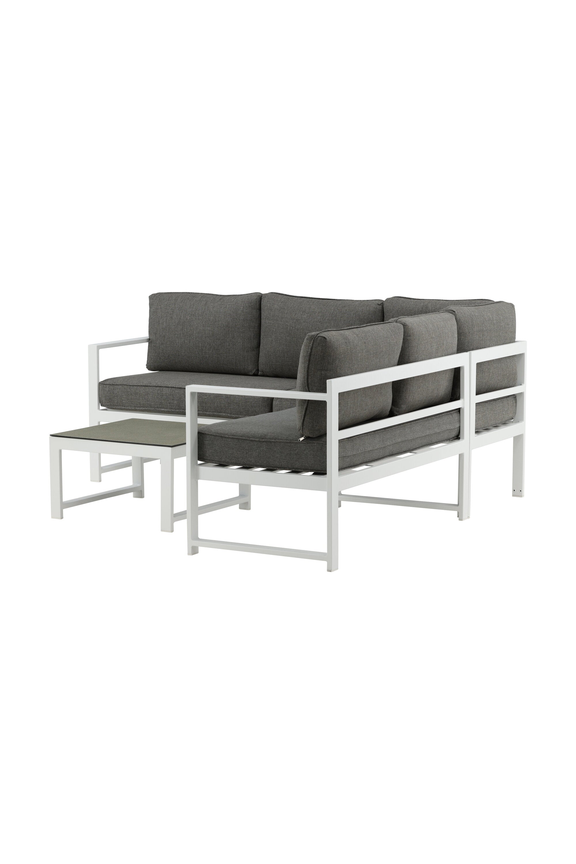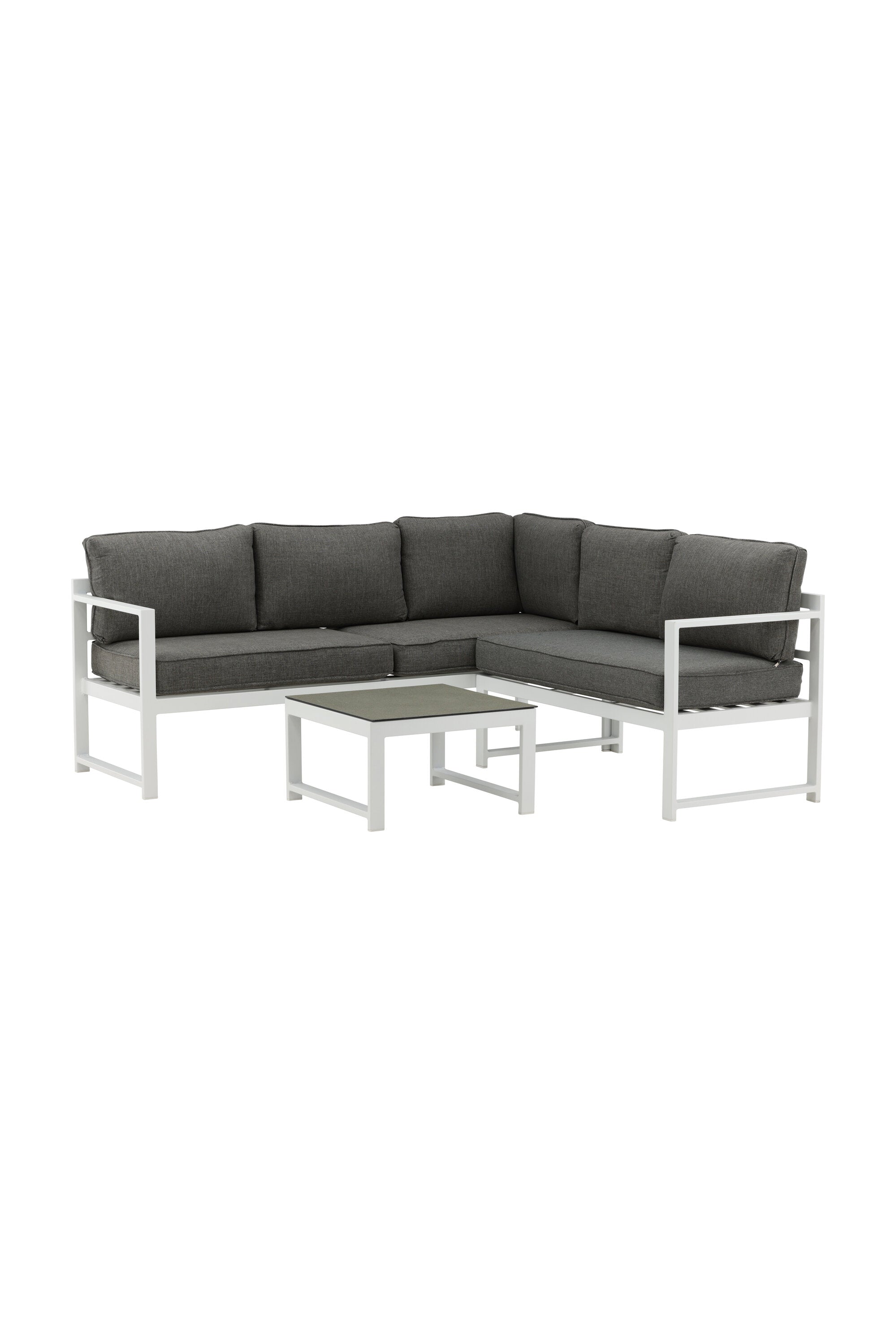 Moderní stylová sedací souprava s rohovou pohovkou na terasu nebo balkon. Vyrobeno z bílého práškově lakovaného kovového rámu s integrovanými područkami. Včetně měkkých šedých polštářků a nízkého konferenčního stolku ve skle se smrkovým projevem. Je vyžadována lehčí montáž.