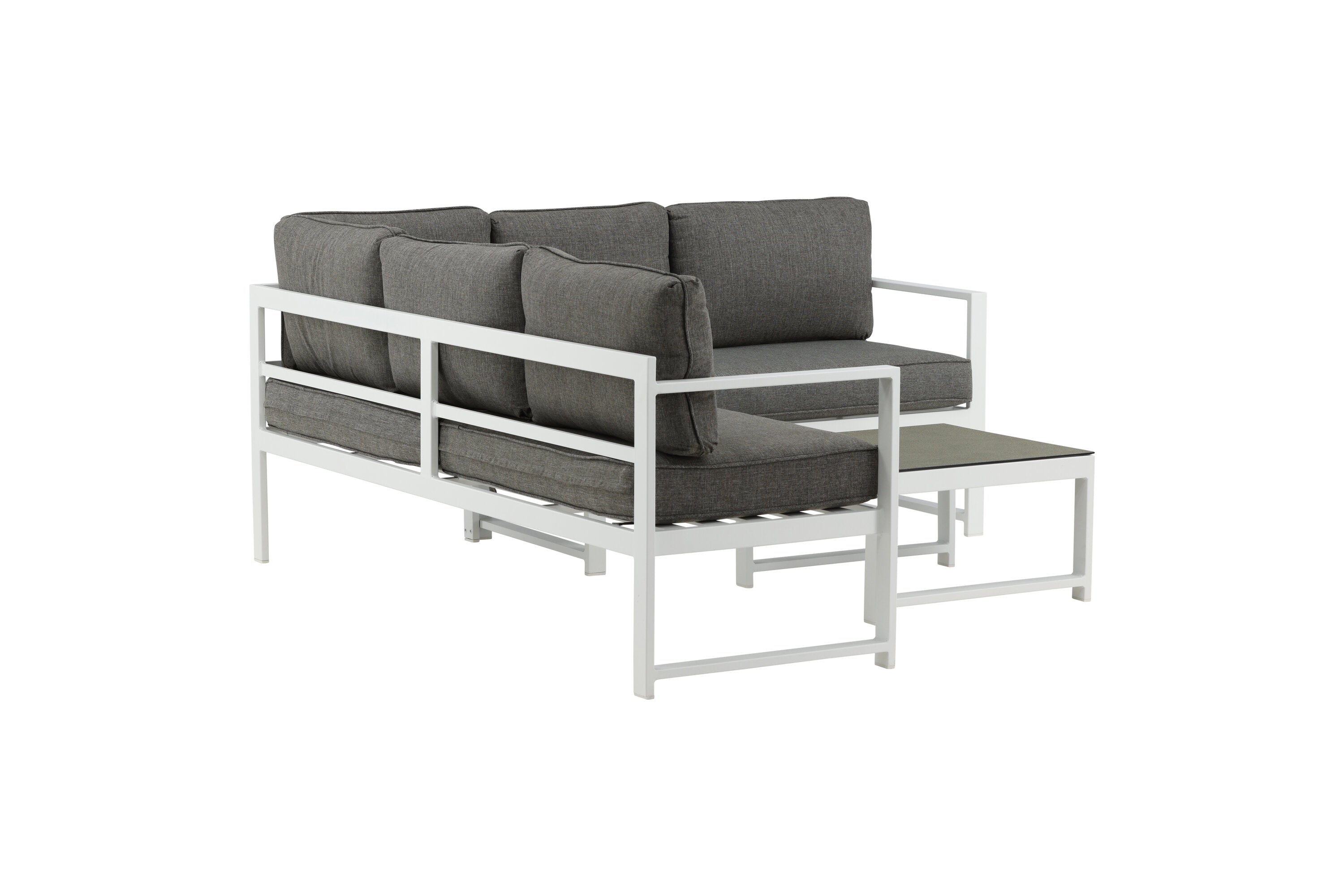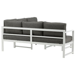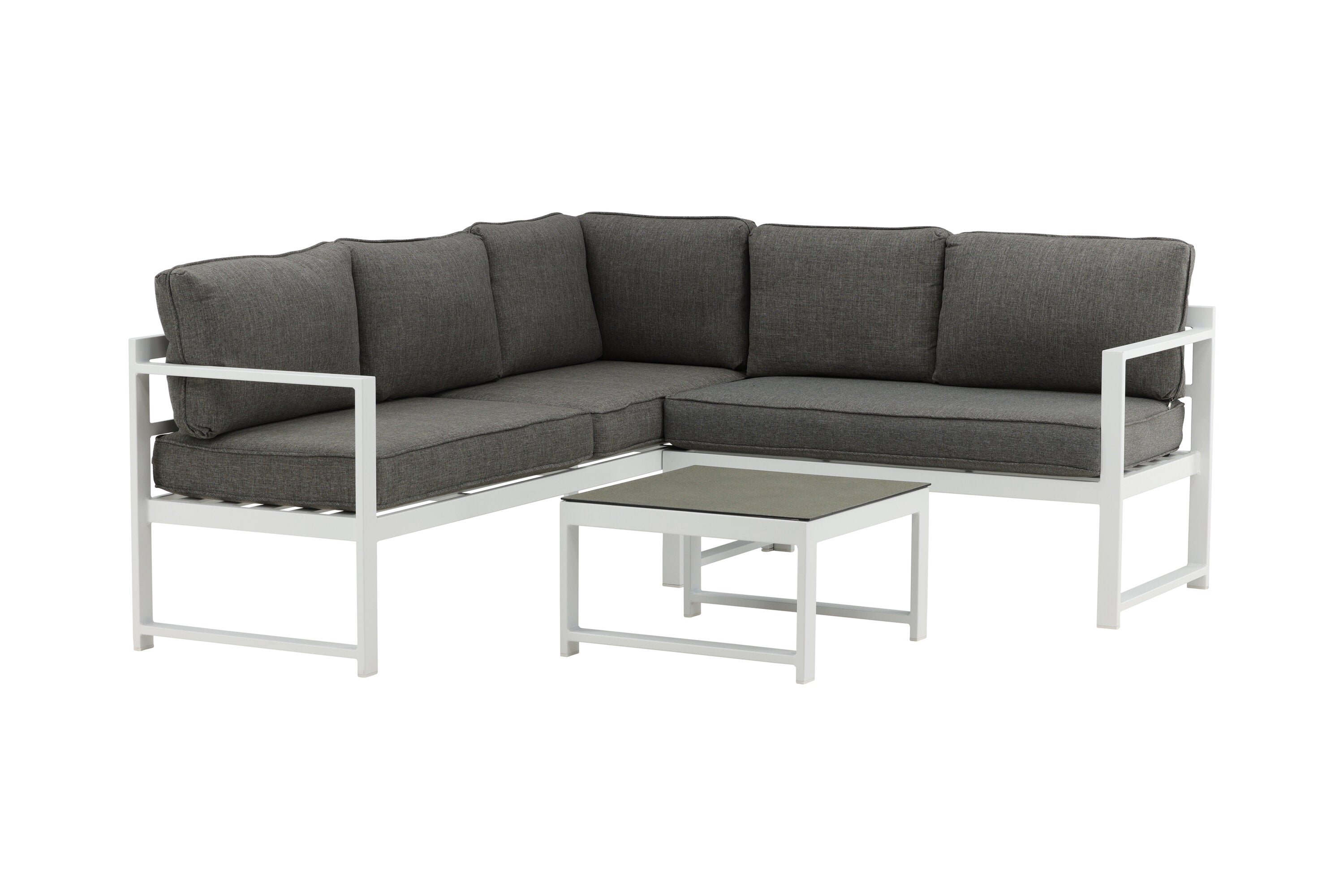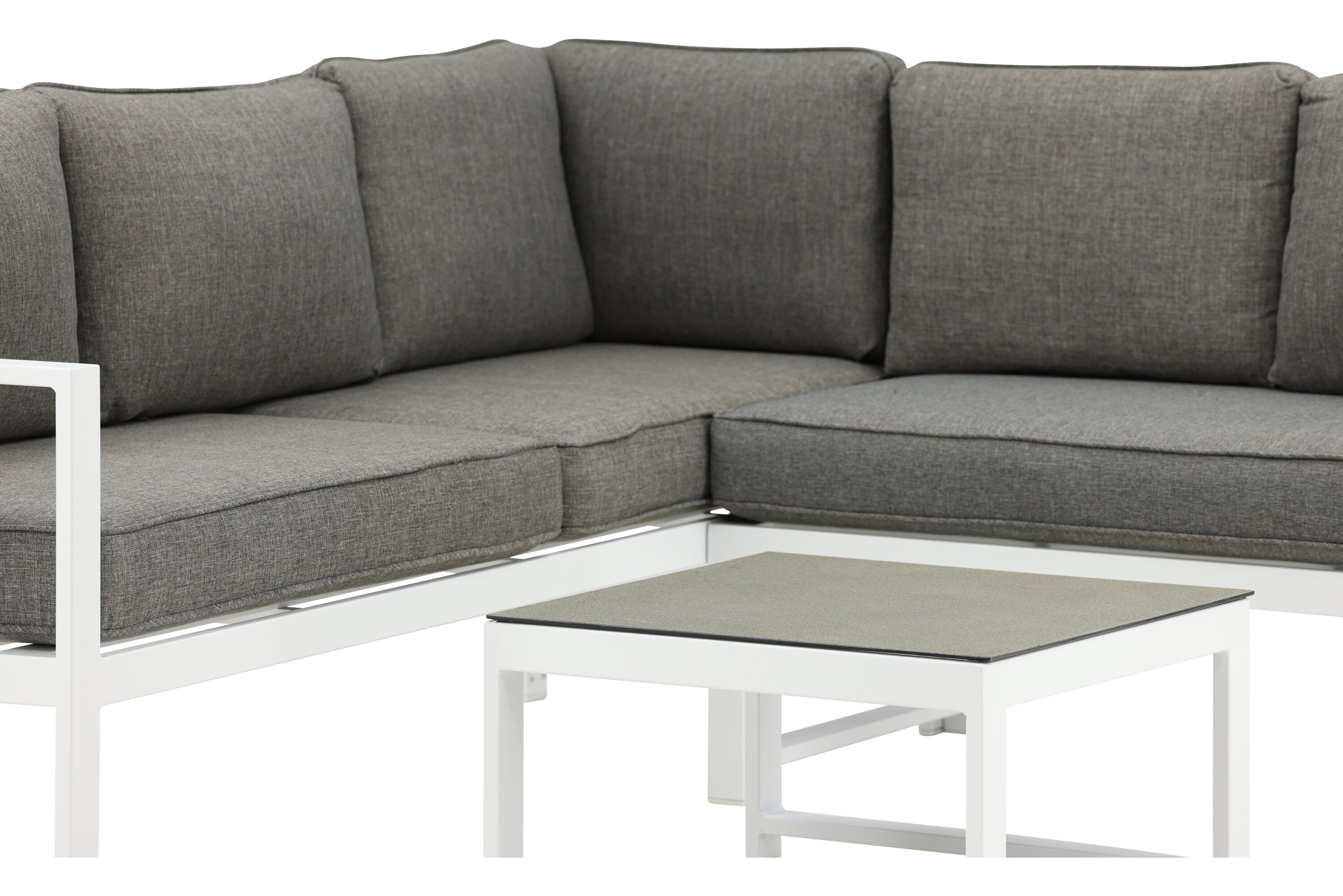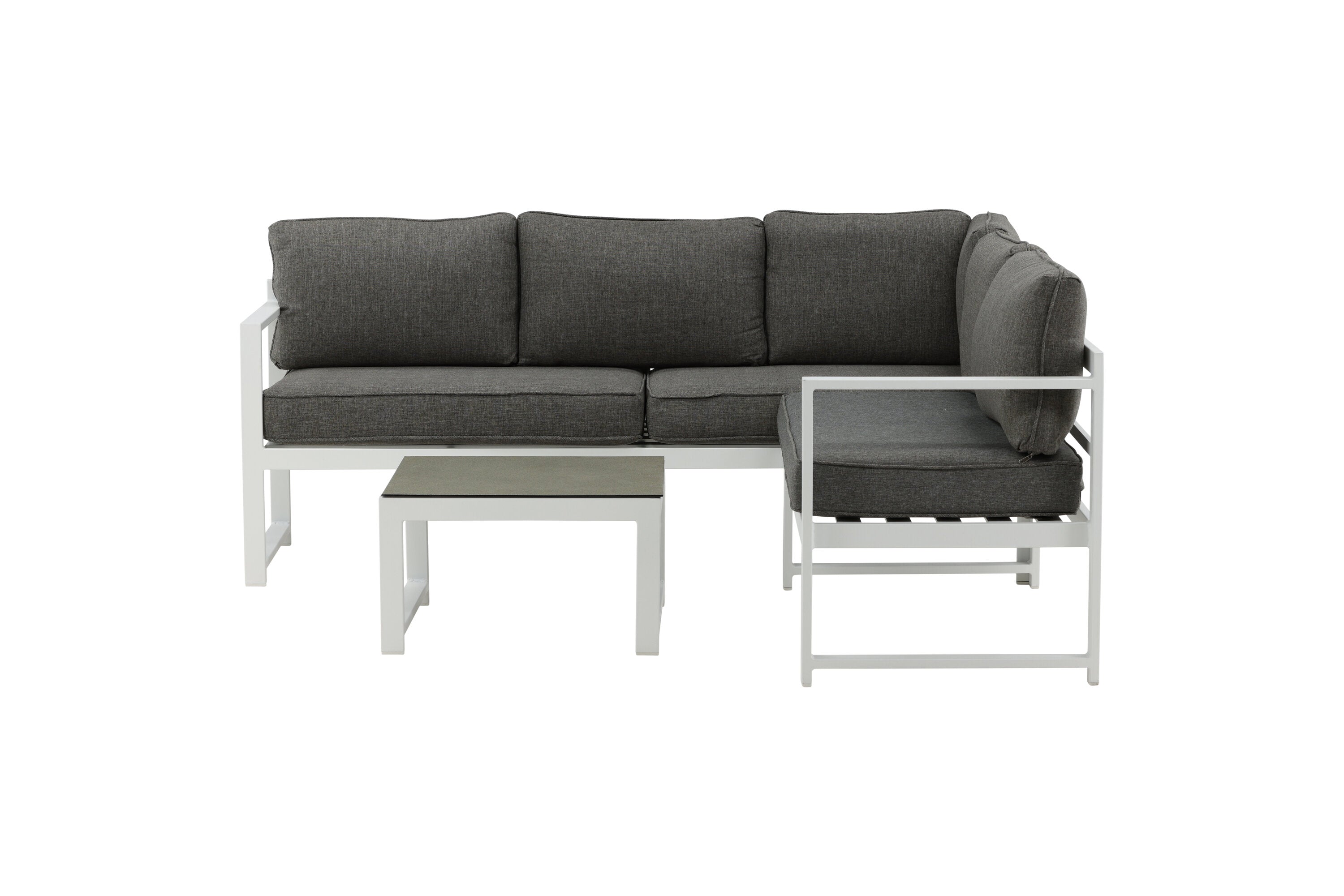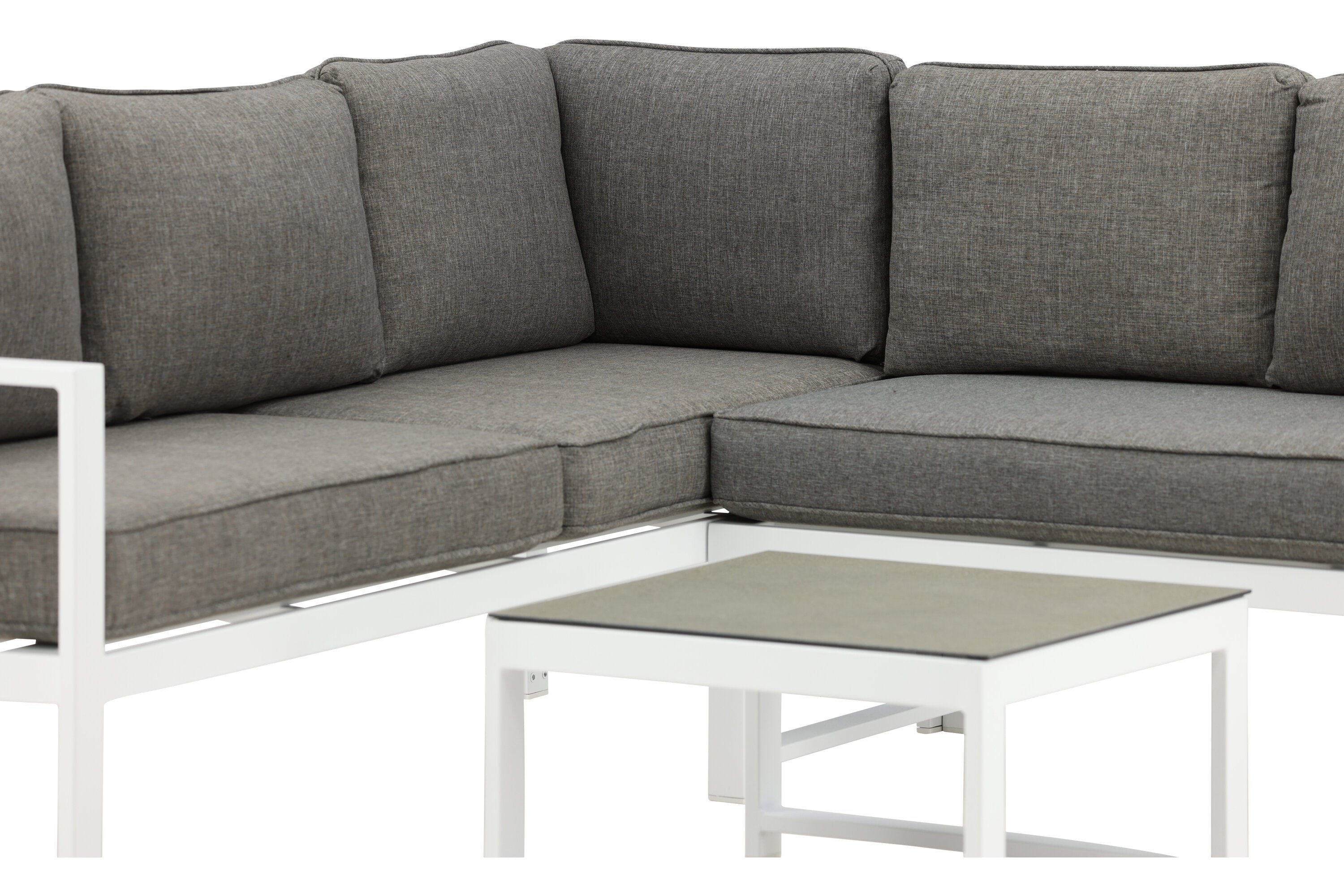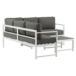Moderní stylová sedací souprava s rohovou pohovkou na terasu nebo balkon. Vyrobeno z bílého práškově lakovaného kovového rámu s integrovanými područkami. Včetně měkkých šedých polštářků a nízkého konferenčního stolku ve skle se smrkovým projevem. Je vyžadována lehčí montáž.