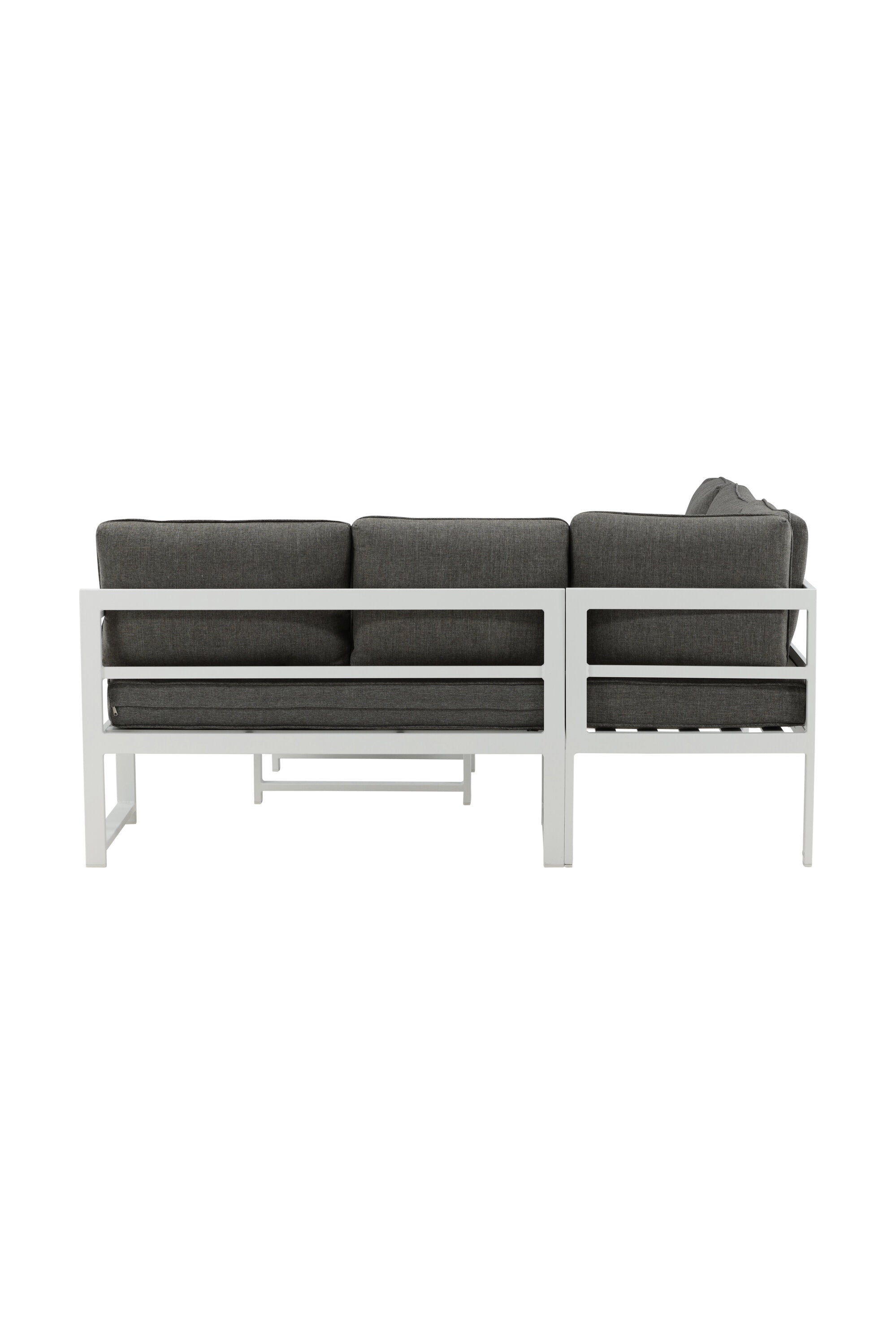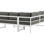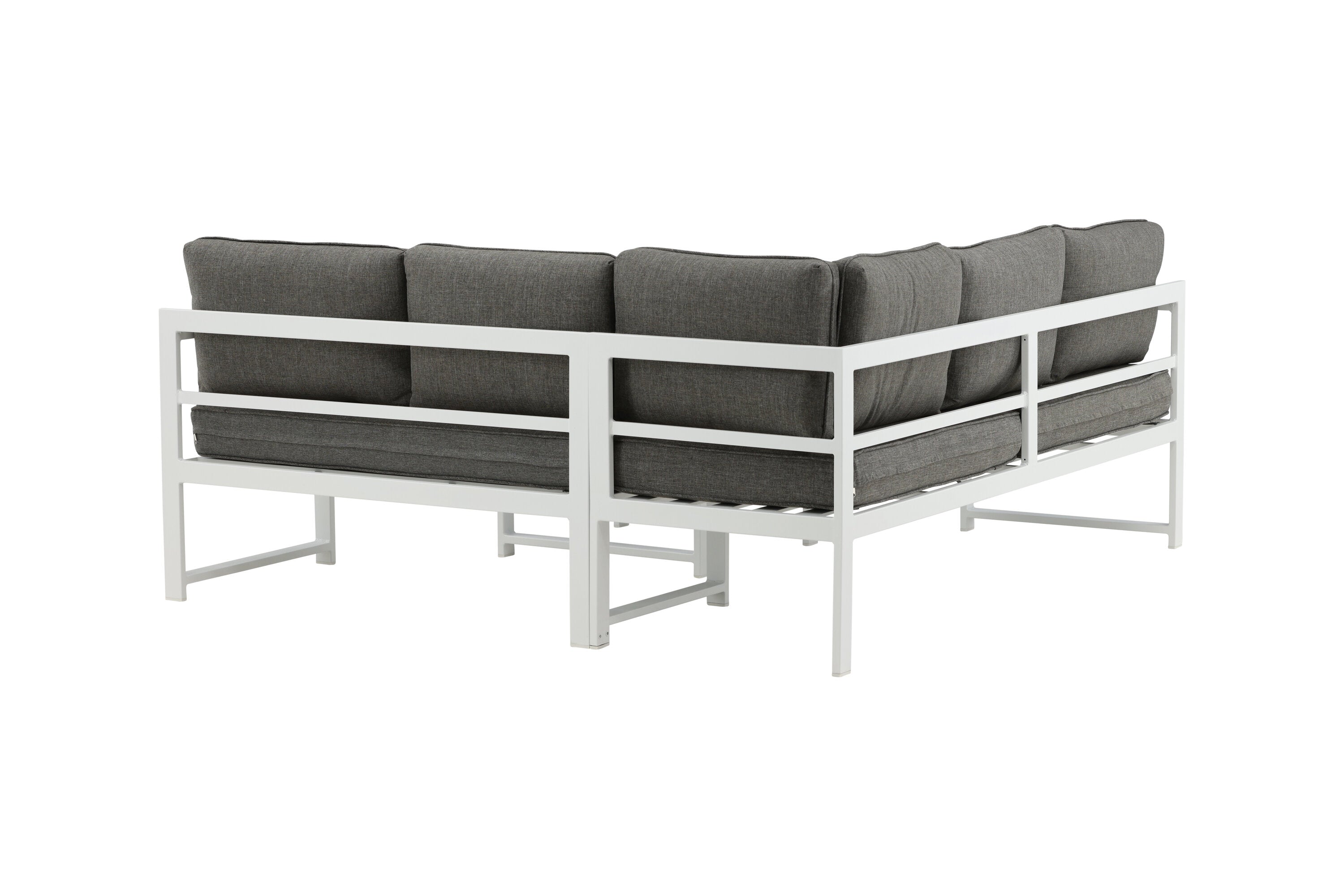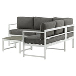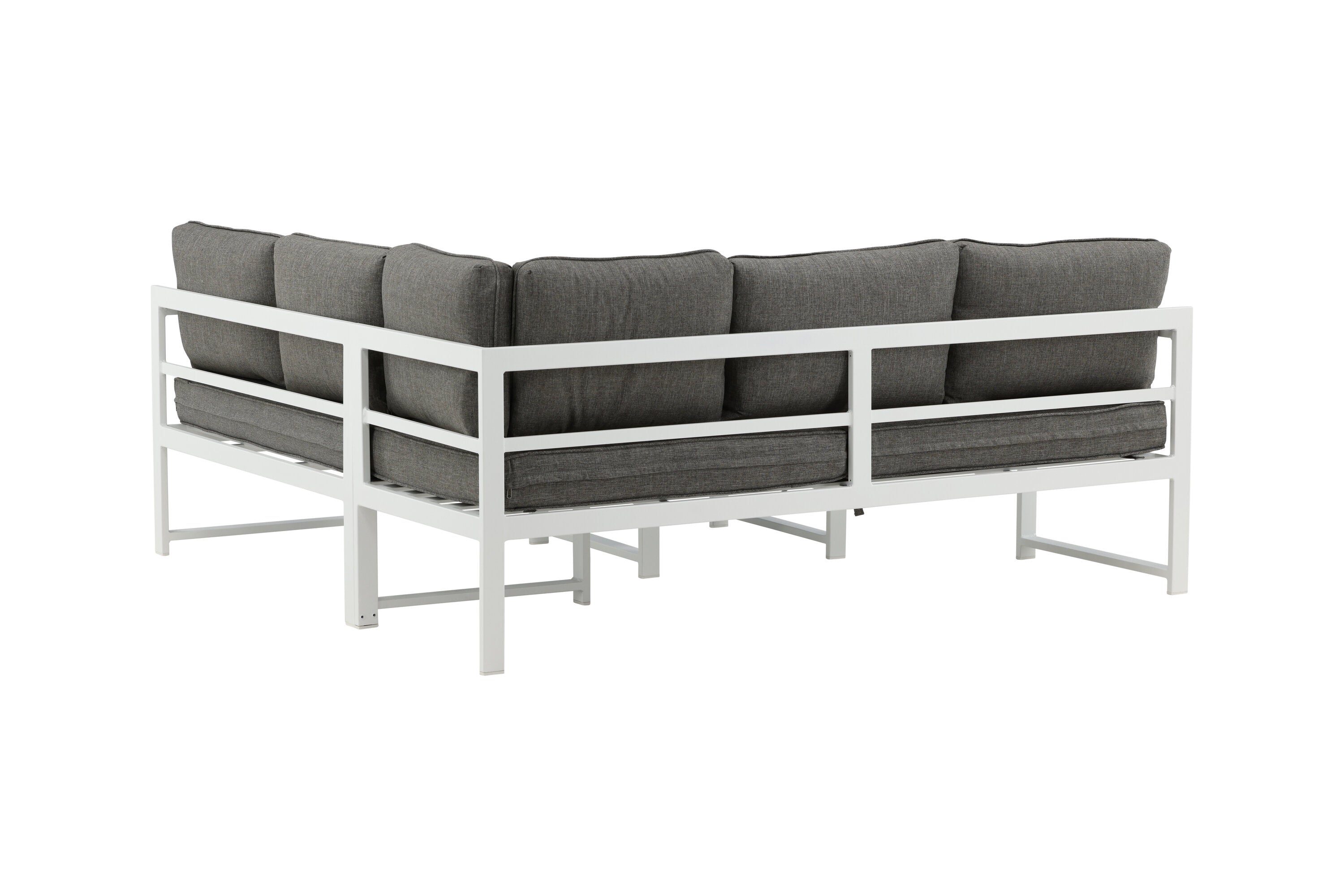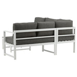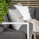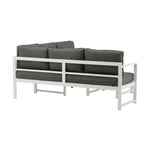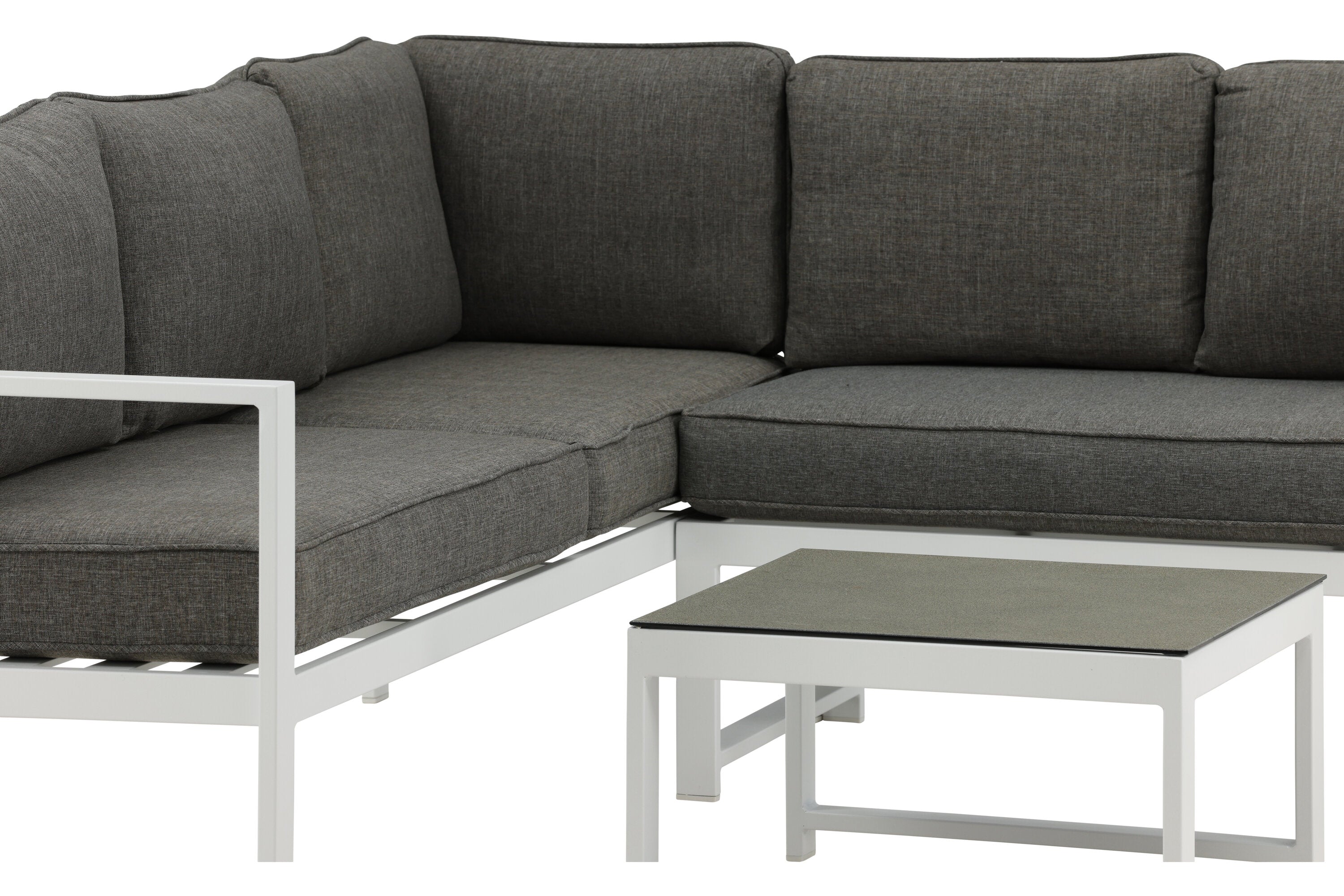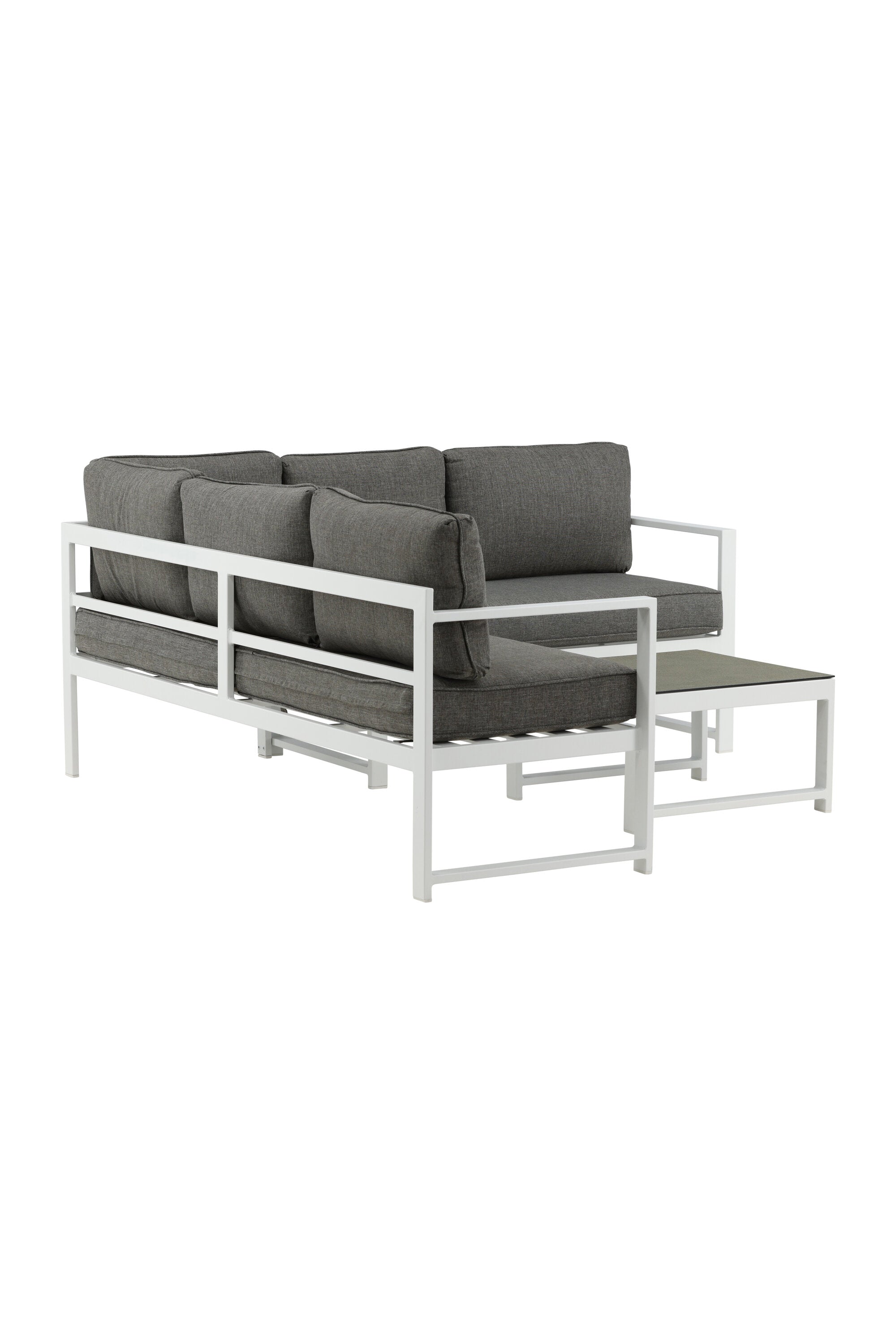 Moderní stylová sedací souprava s rohovou pohovkou na terasu nebo balkon. Vyrobeno z bílého práškově lakovaného kovového rámu s integrovanými područkami. Včetně měkkých šedých polštářků a nízkého konferenčního stolku ve skle se smrkovým projevem. Je vyžadována lehčí montáž.