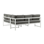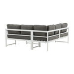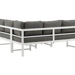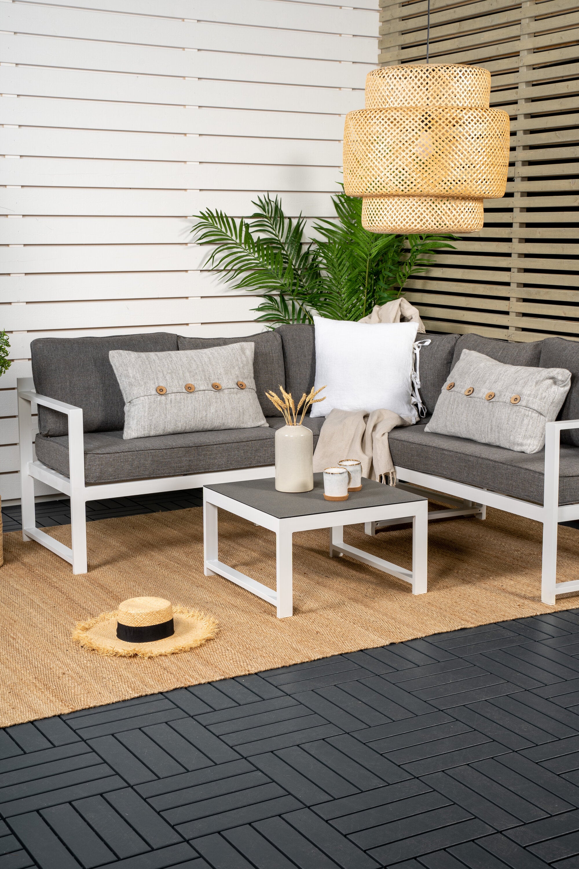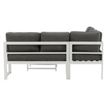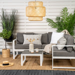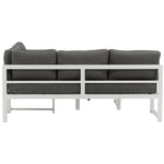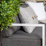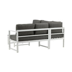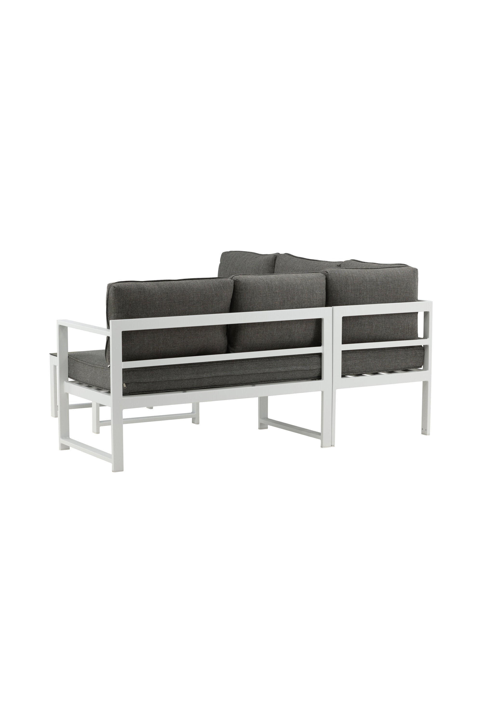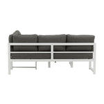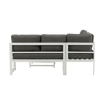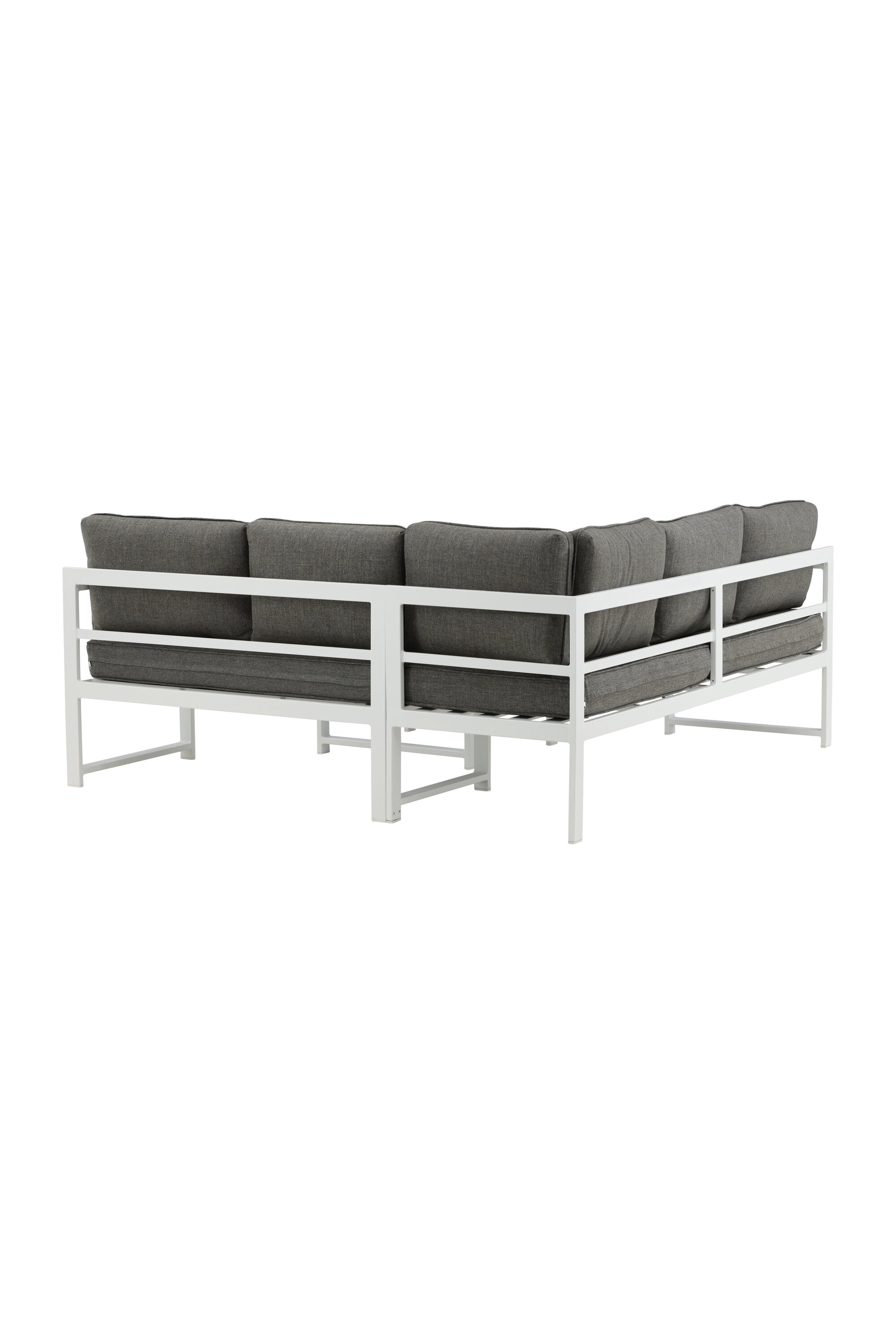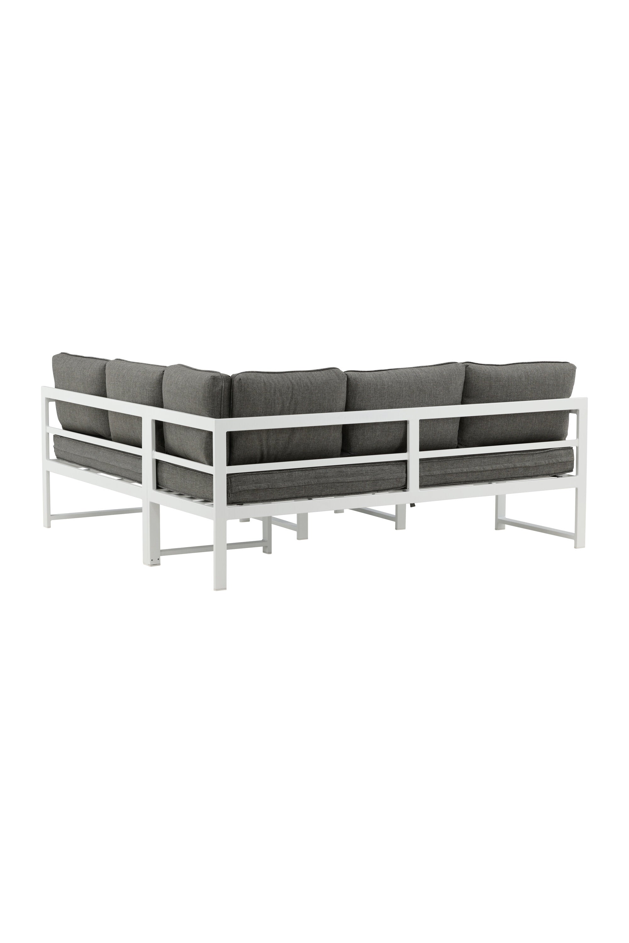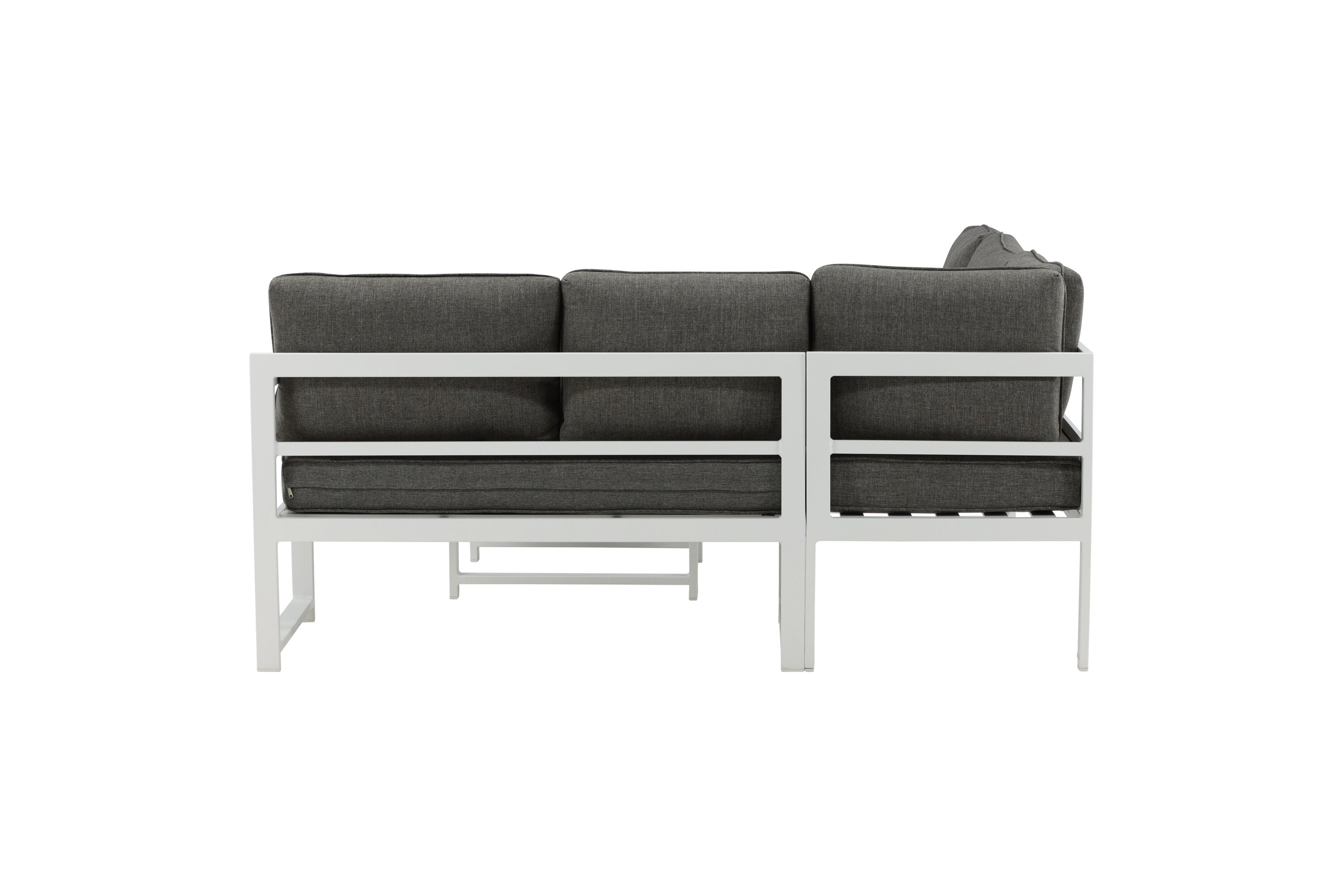 Moderní stylová sedací souprava s rohovou pohovkou na terasu nebo balkon. Vyrobeno z bílého práškově lakovaného kovového rámu s integrovanými područkami. Včetně měkkých šedých polštářků a nízkého konferenčního stolku ve skle se smrkovým projevem. Je vyžadována lehčí montáž.