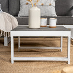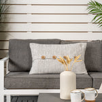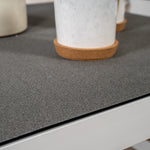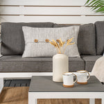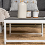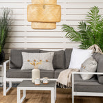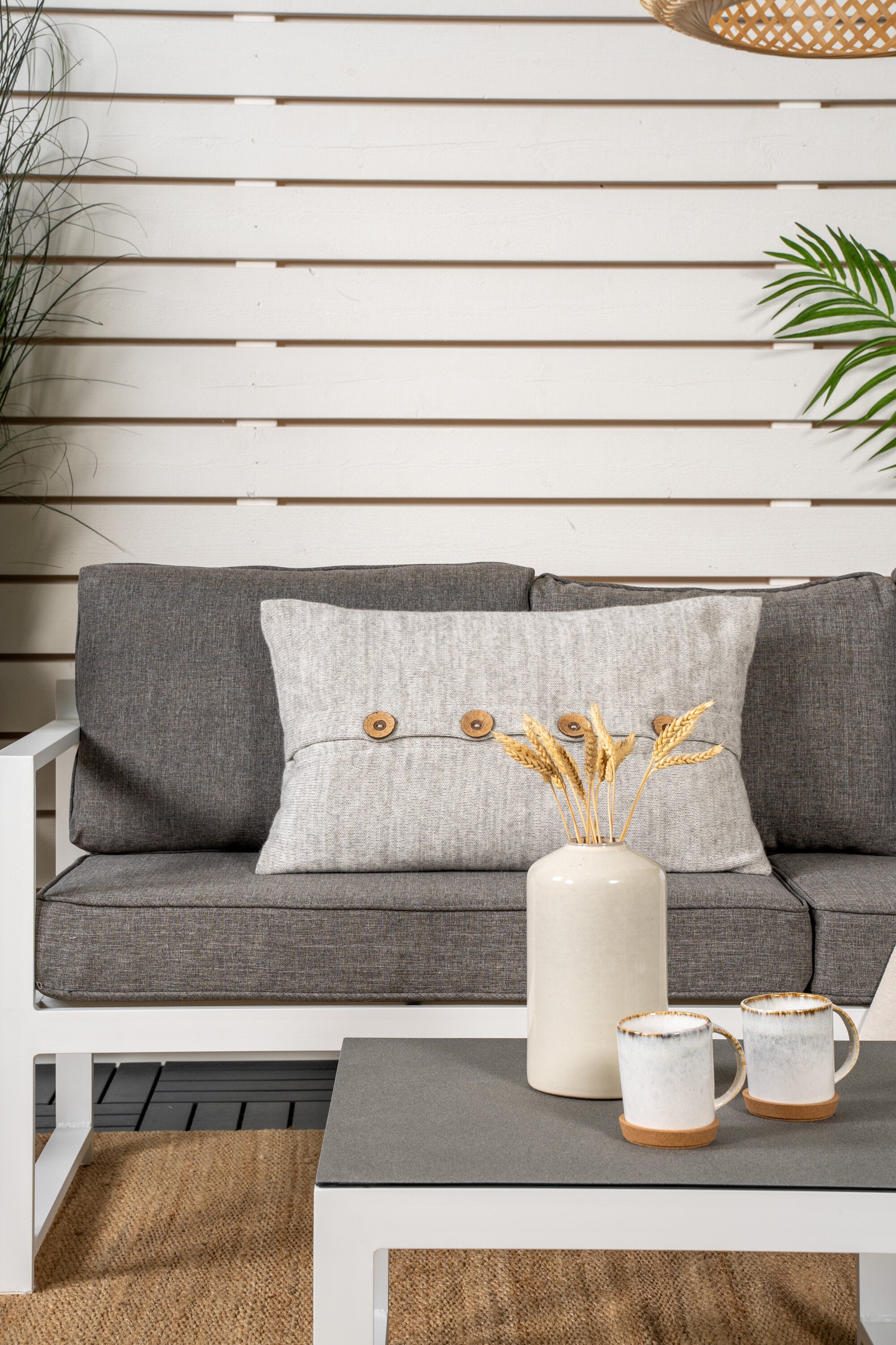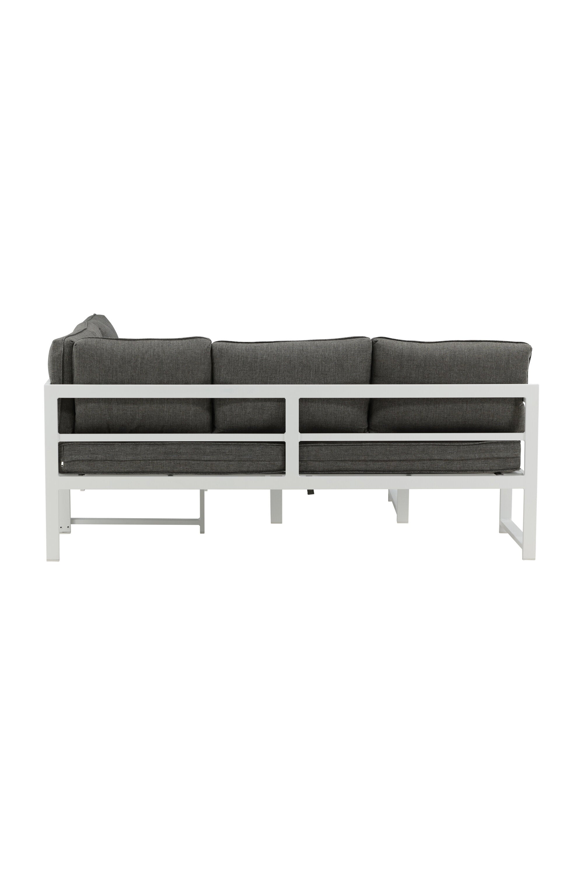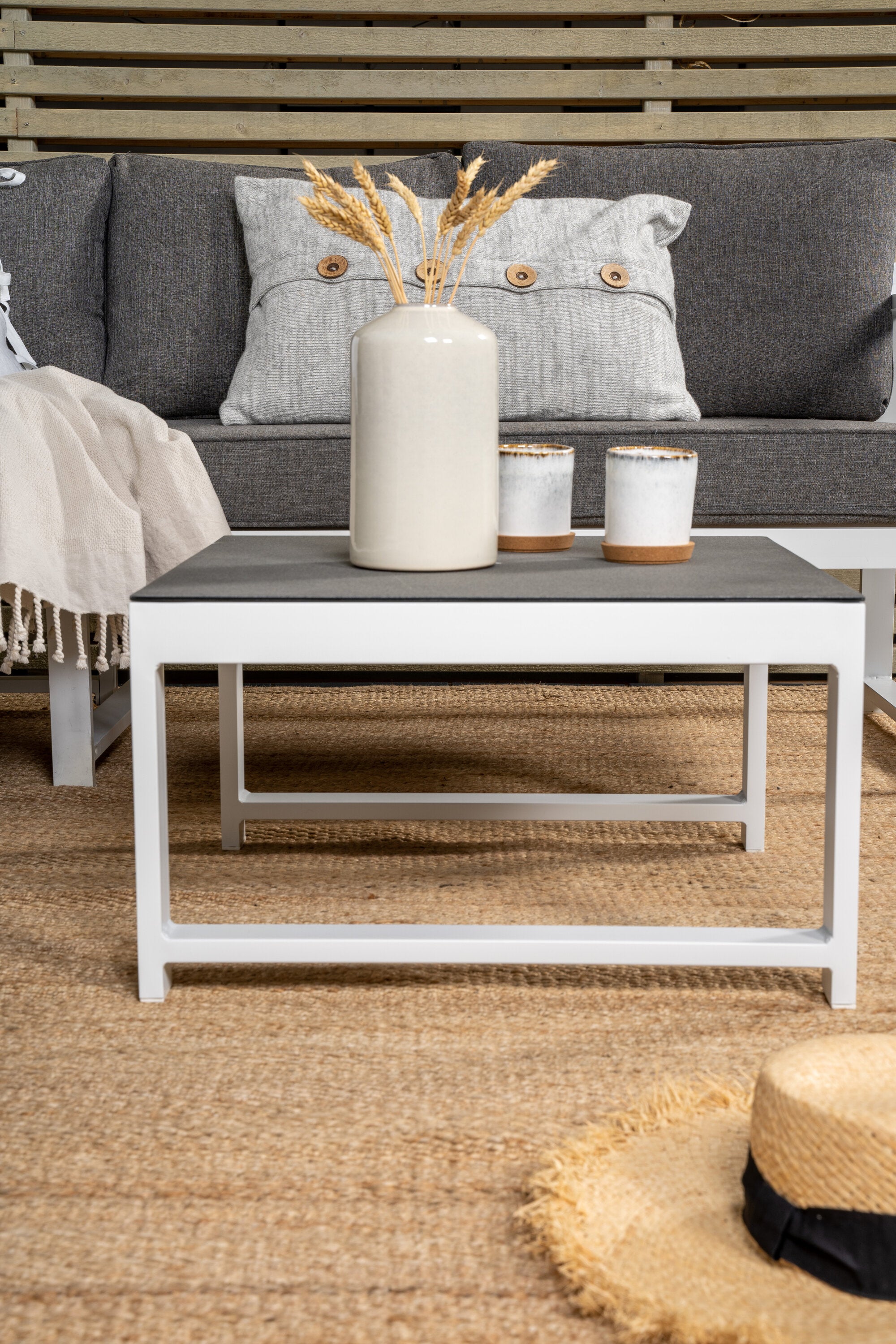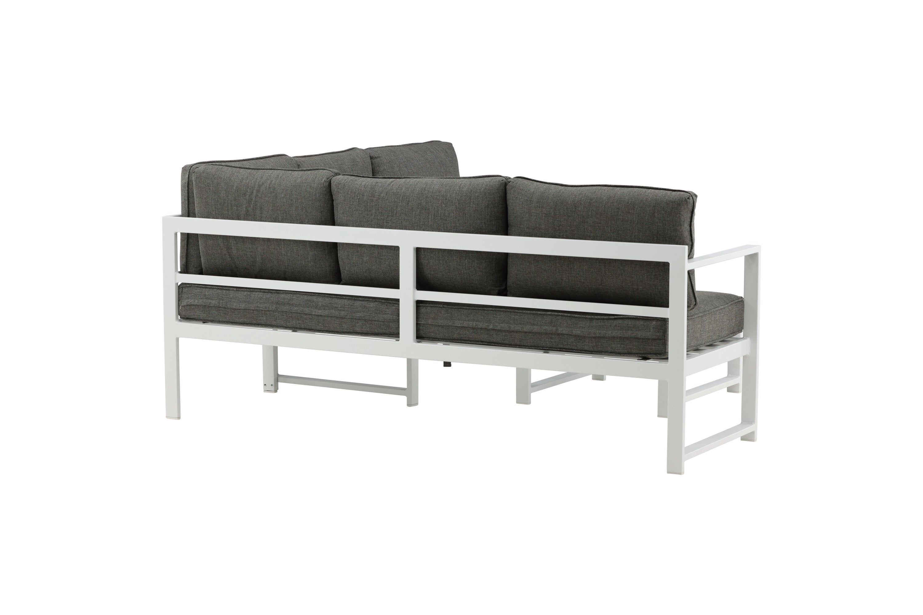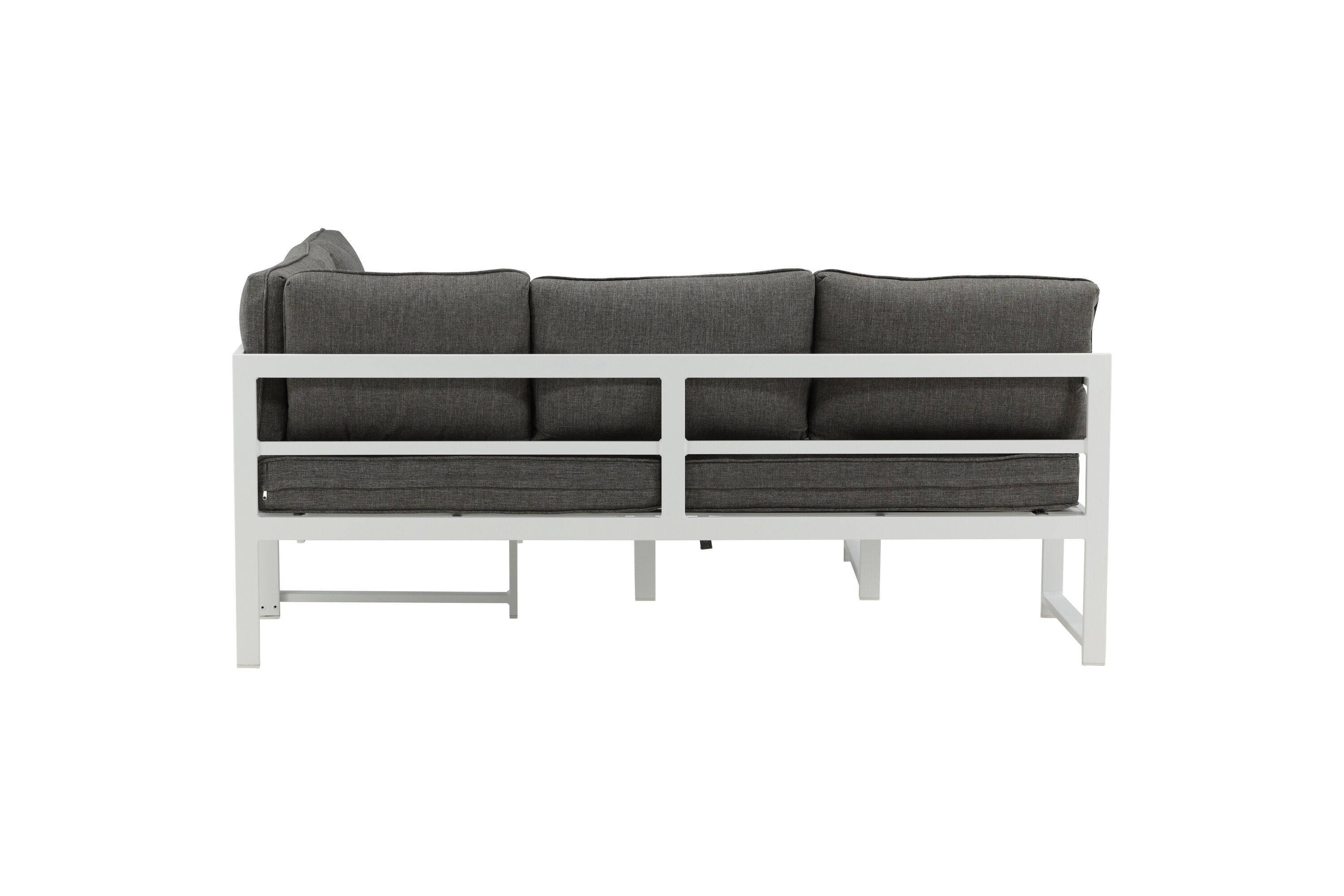 Moderní stylová sedací souprava s rohovou pohovkou na terasu nebo balkon. Vyrobeno z bílého práškově lakovaného kovového rámu s integrovanými područkami. Včetně měkkých šedých polštářků a nízkého konferenčního stolku ve skle se smrkovým projevem. Je vyžadována lehčí montáž.