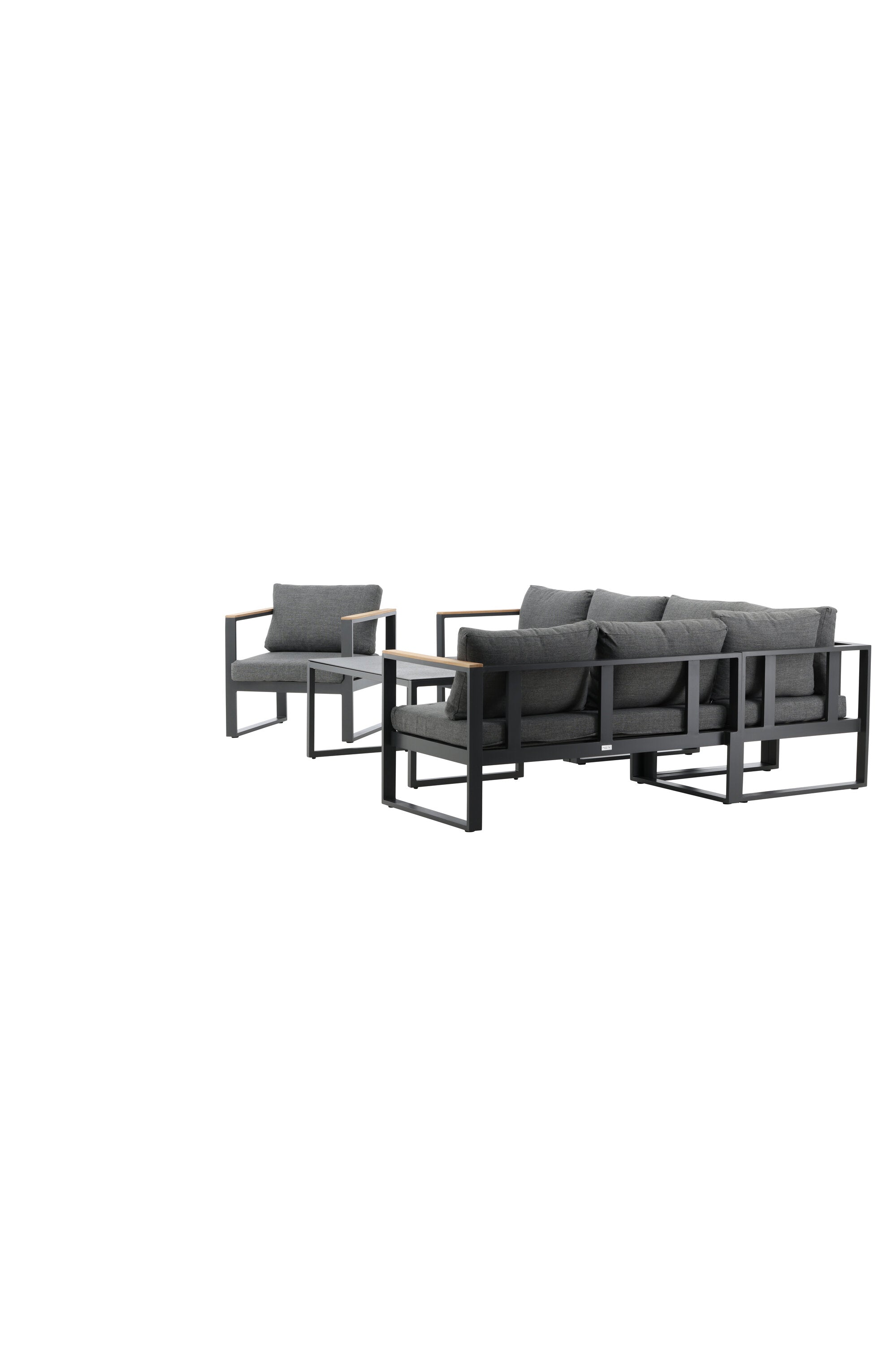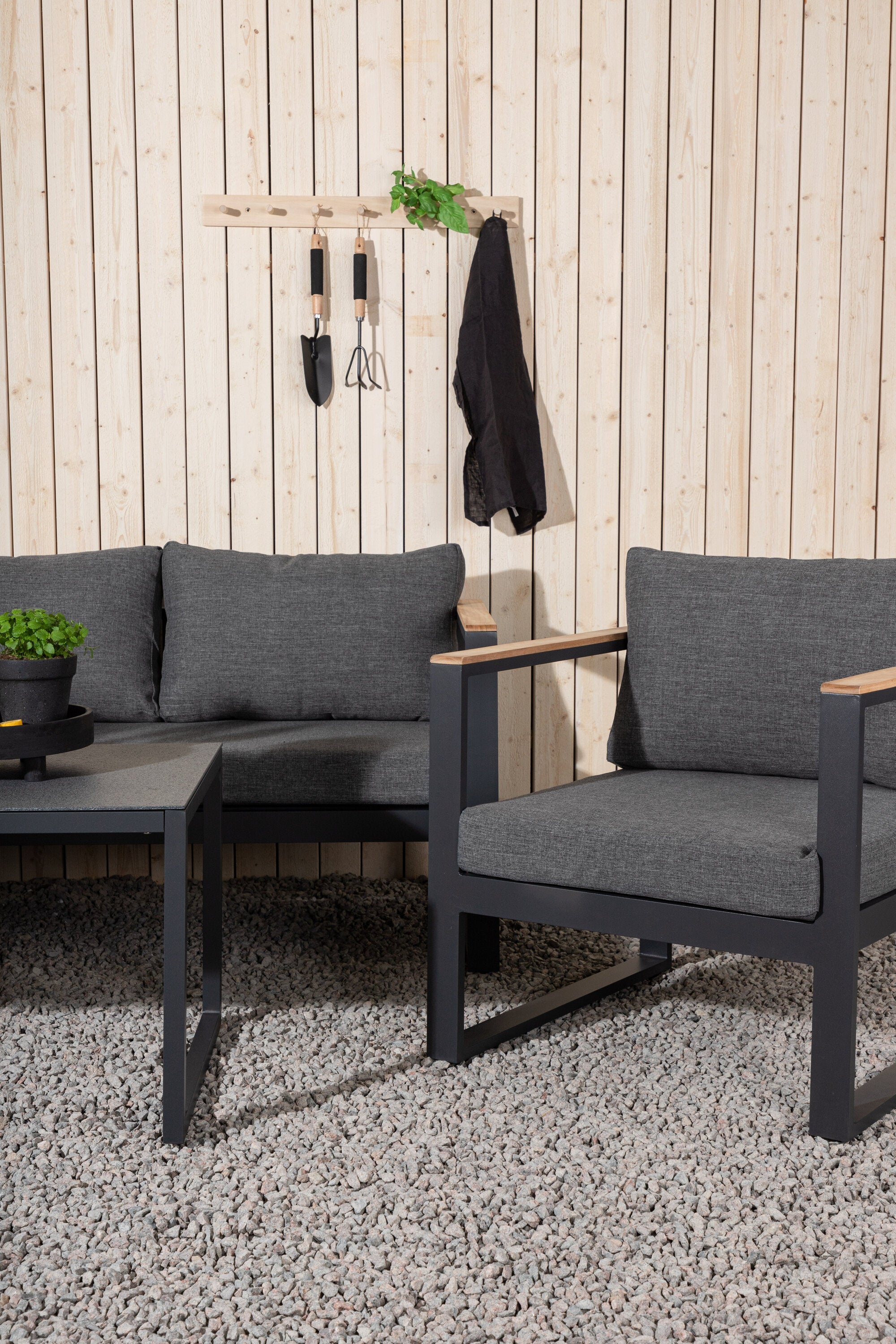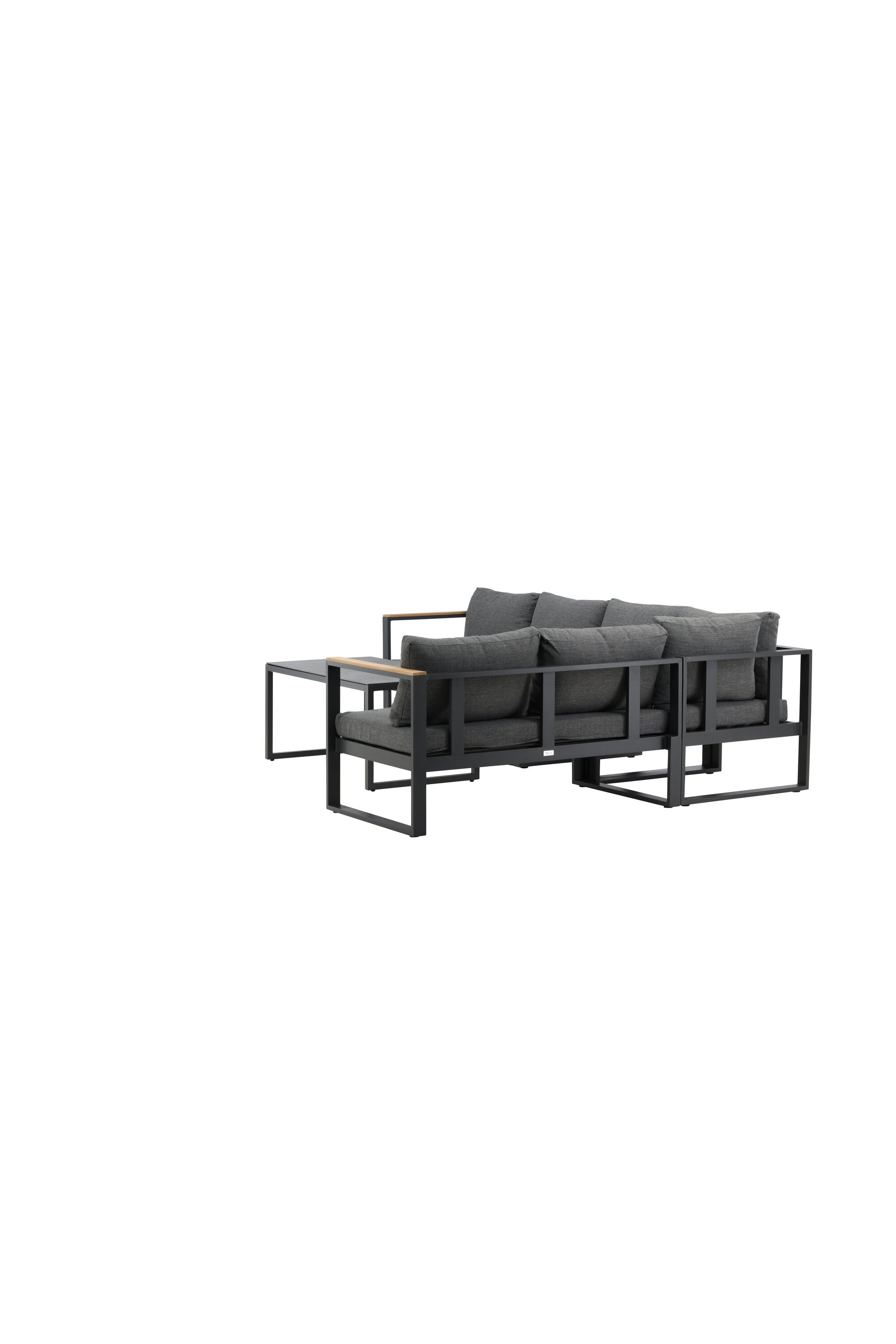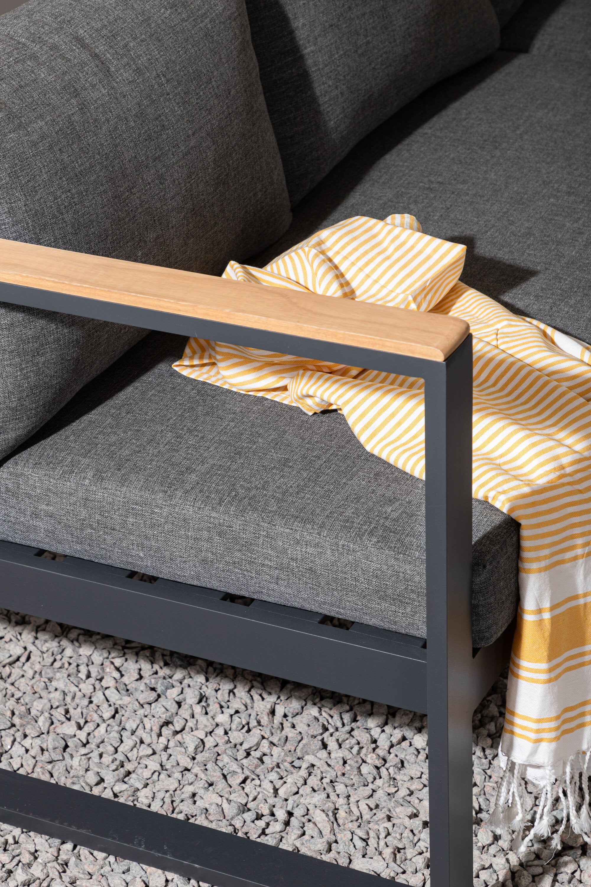 Moderní stylová pohovka, která se perfektně hodí na vaši terasu. Sedací soupravu tvoří třímístná pohovka včetně vražedného polštáře a také nízký konferenční stolek s tabletovým sklem ve spreji. Kupte si rámová křesla ze stejné série. Vyrobeno z kovu s černým práškovým nástřikem se stylovými detaily z teaku.