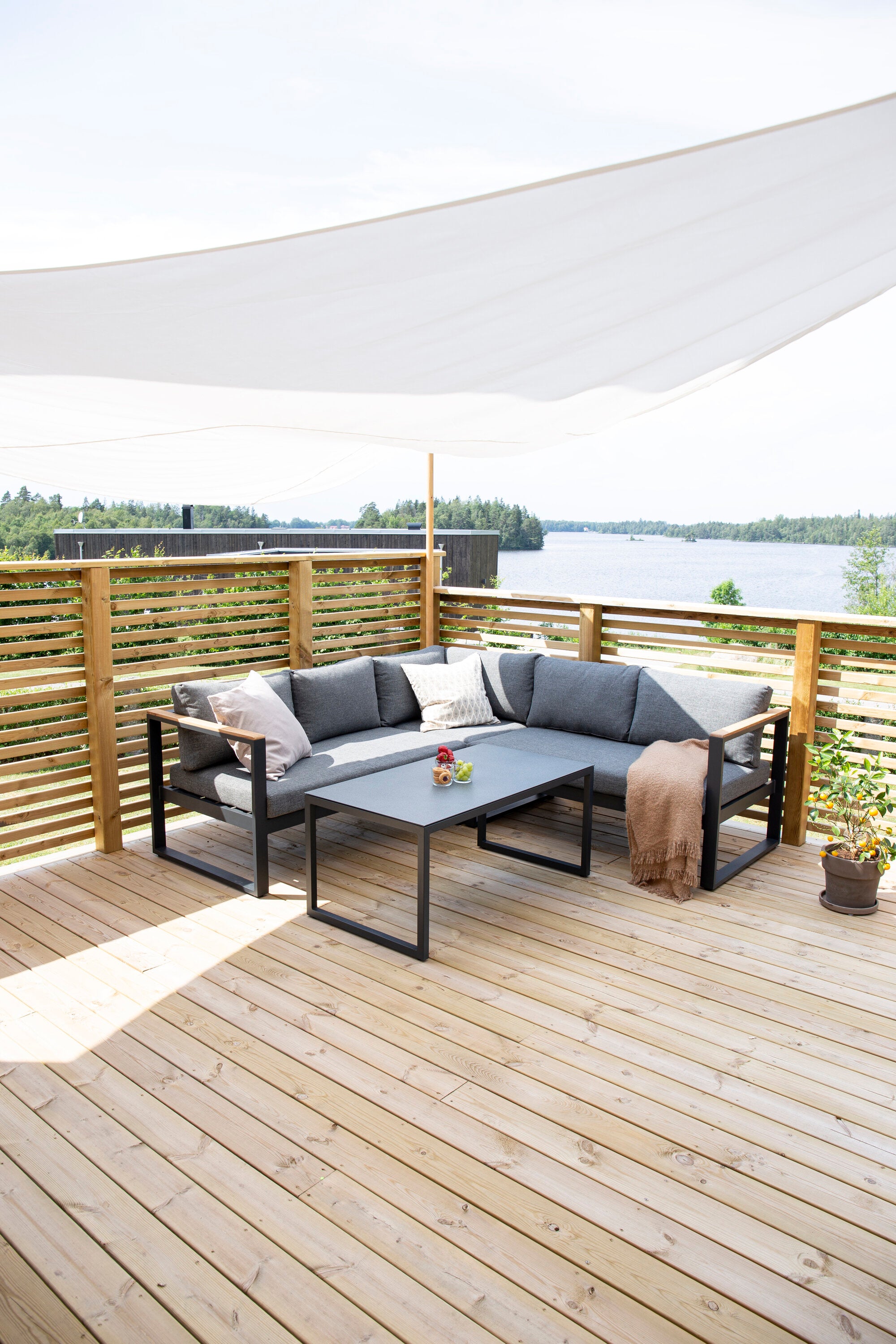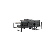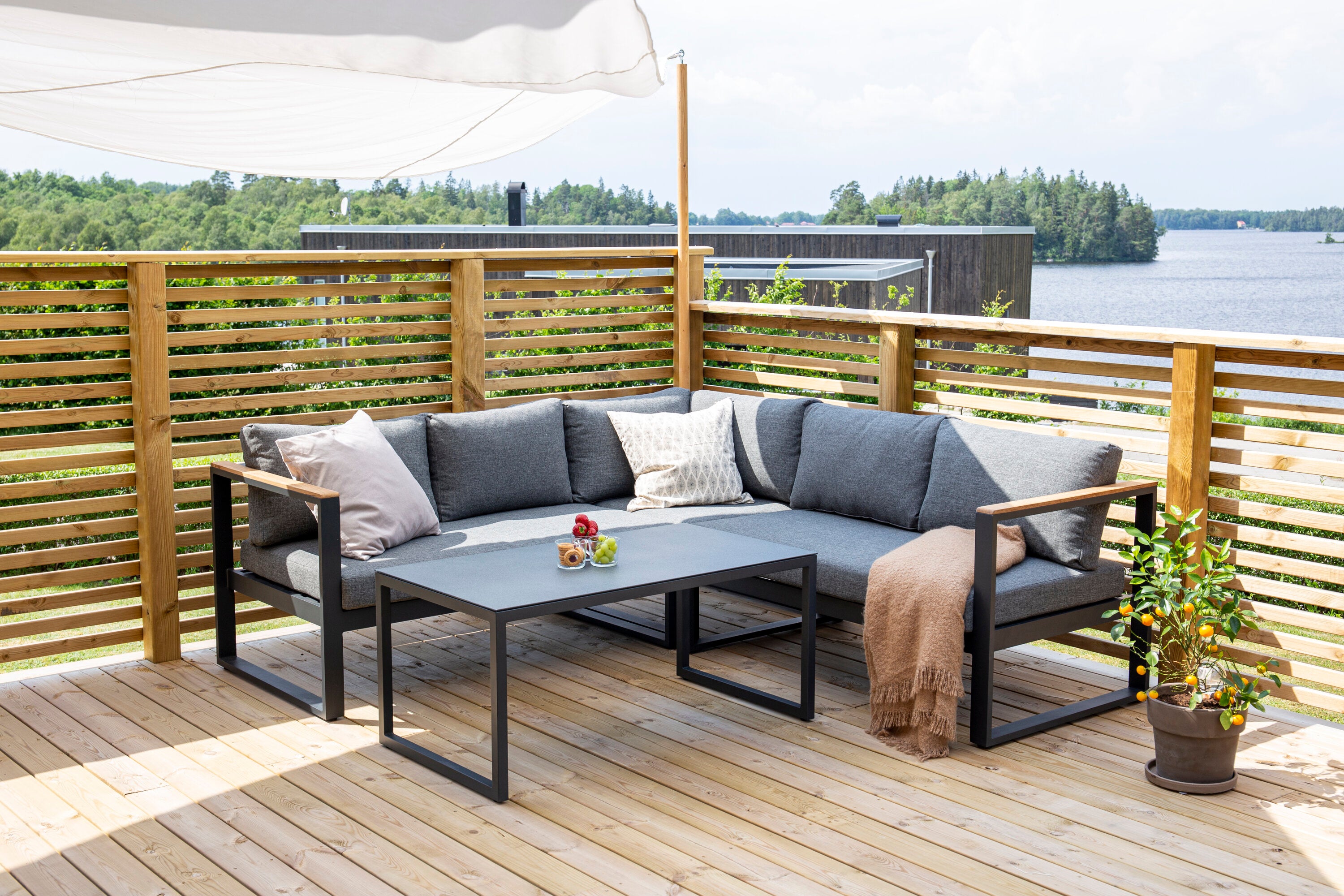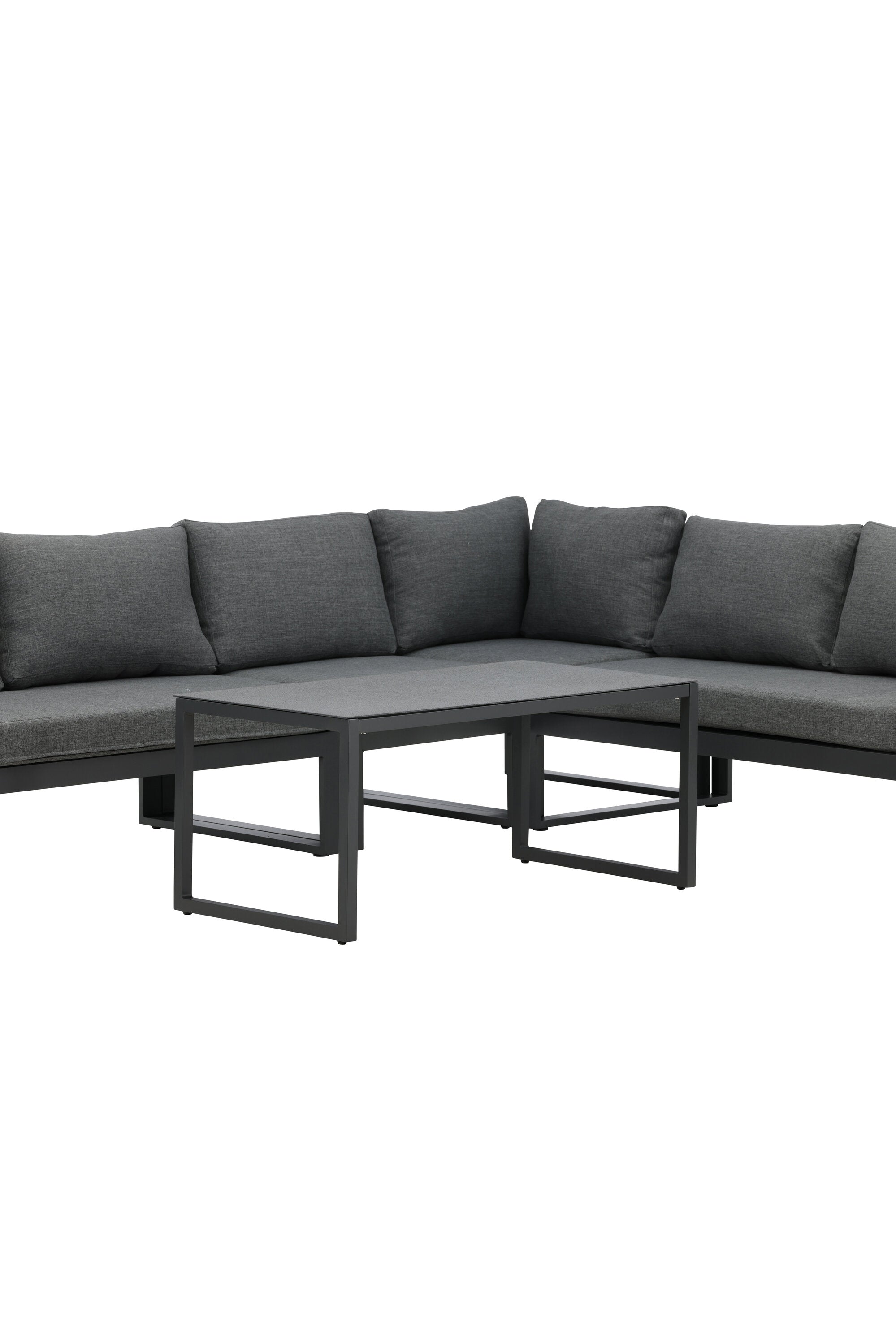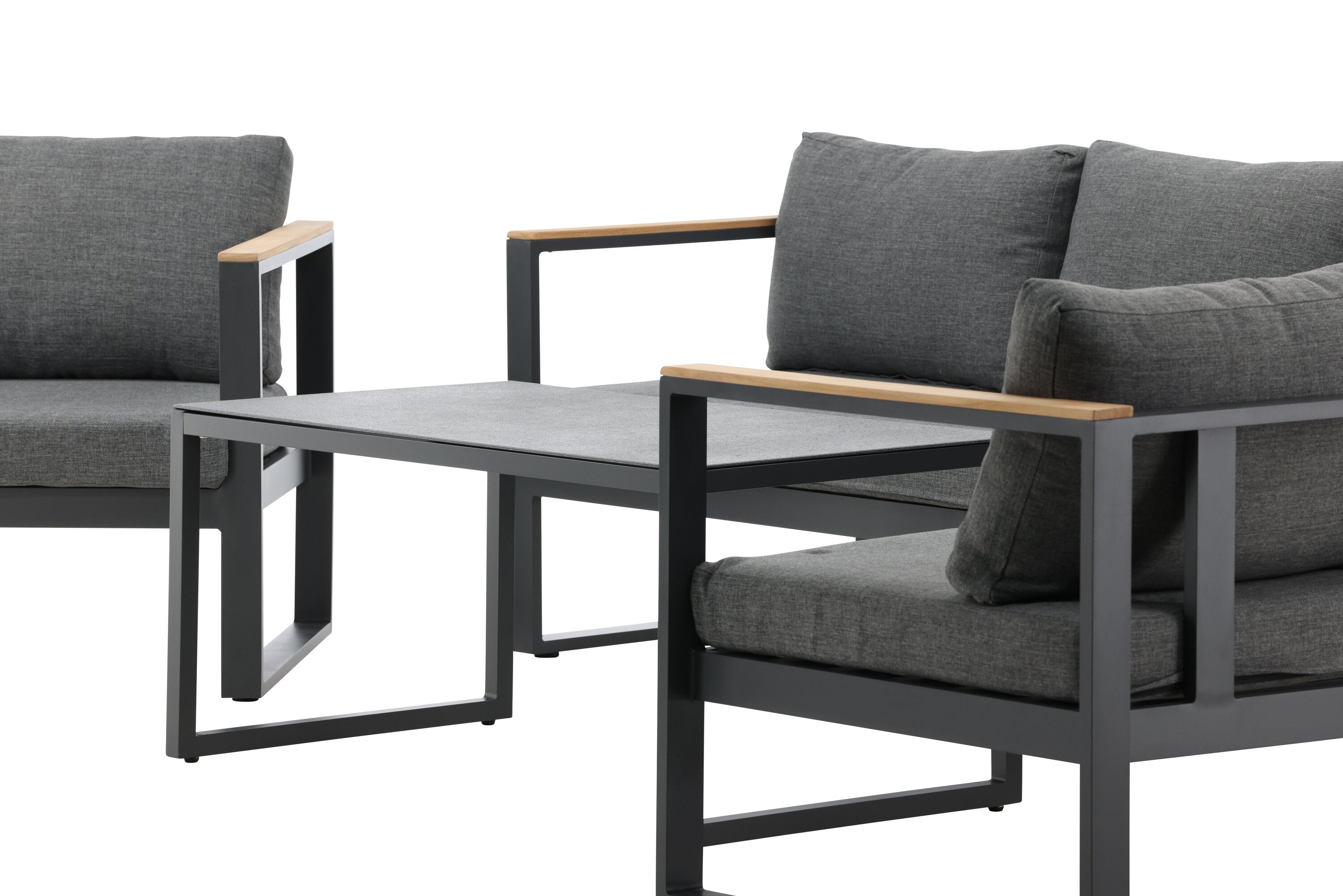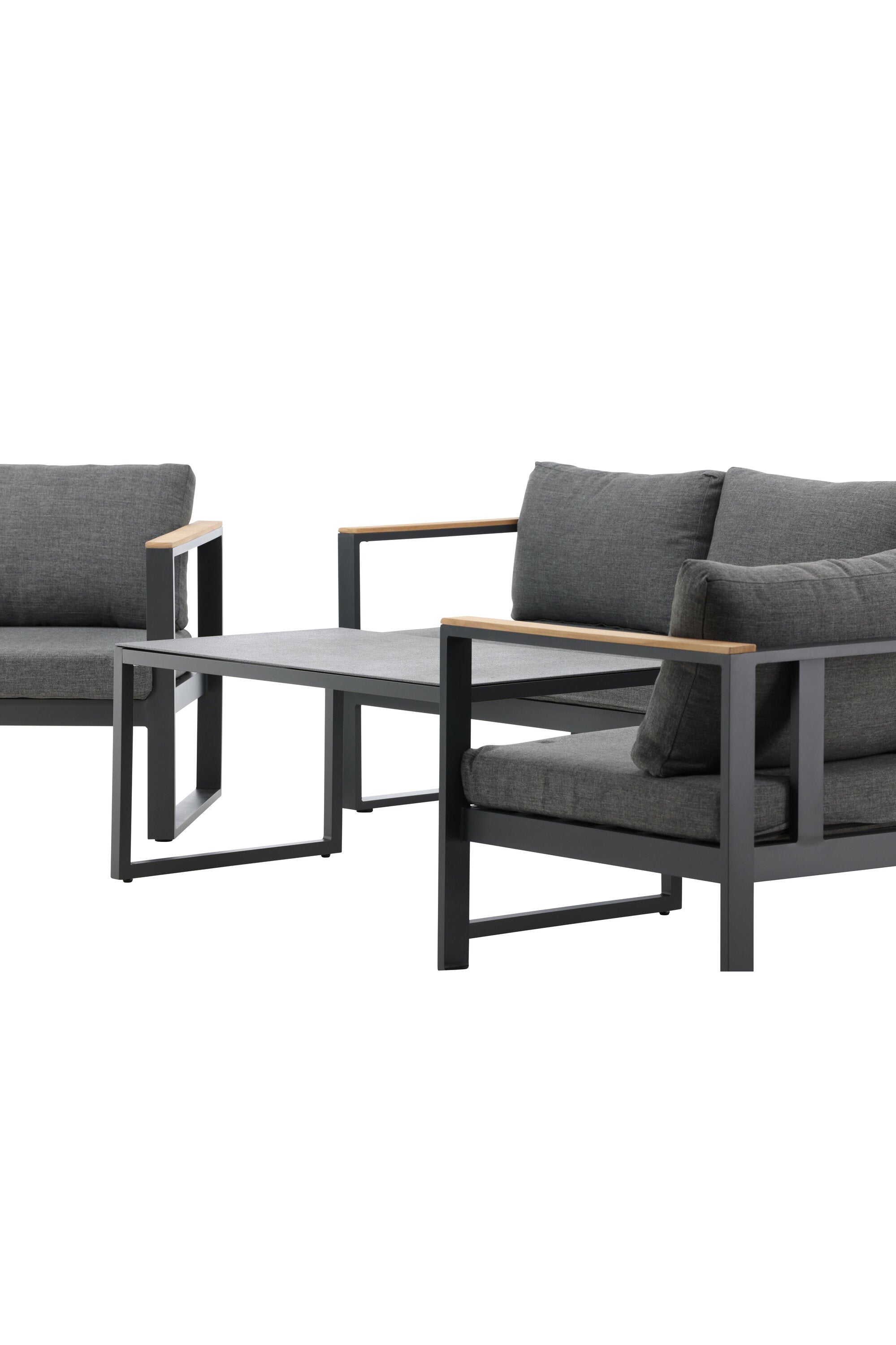 Moderní stylová pohovka, která se perfektně hodí na vaši terasu. Sedací soupravu tvoří třímístná pohovka včetně vražedného polštáře a také nízký konferenční stolek s tabletovým sklem ve spreji. Kupte si rámová křesla ze stejné série. Vyrobeno z kovu s černým práškovým nástřikem se stylovými detaily z teaku.