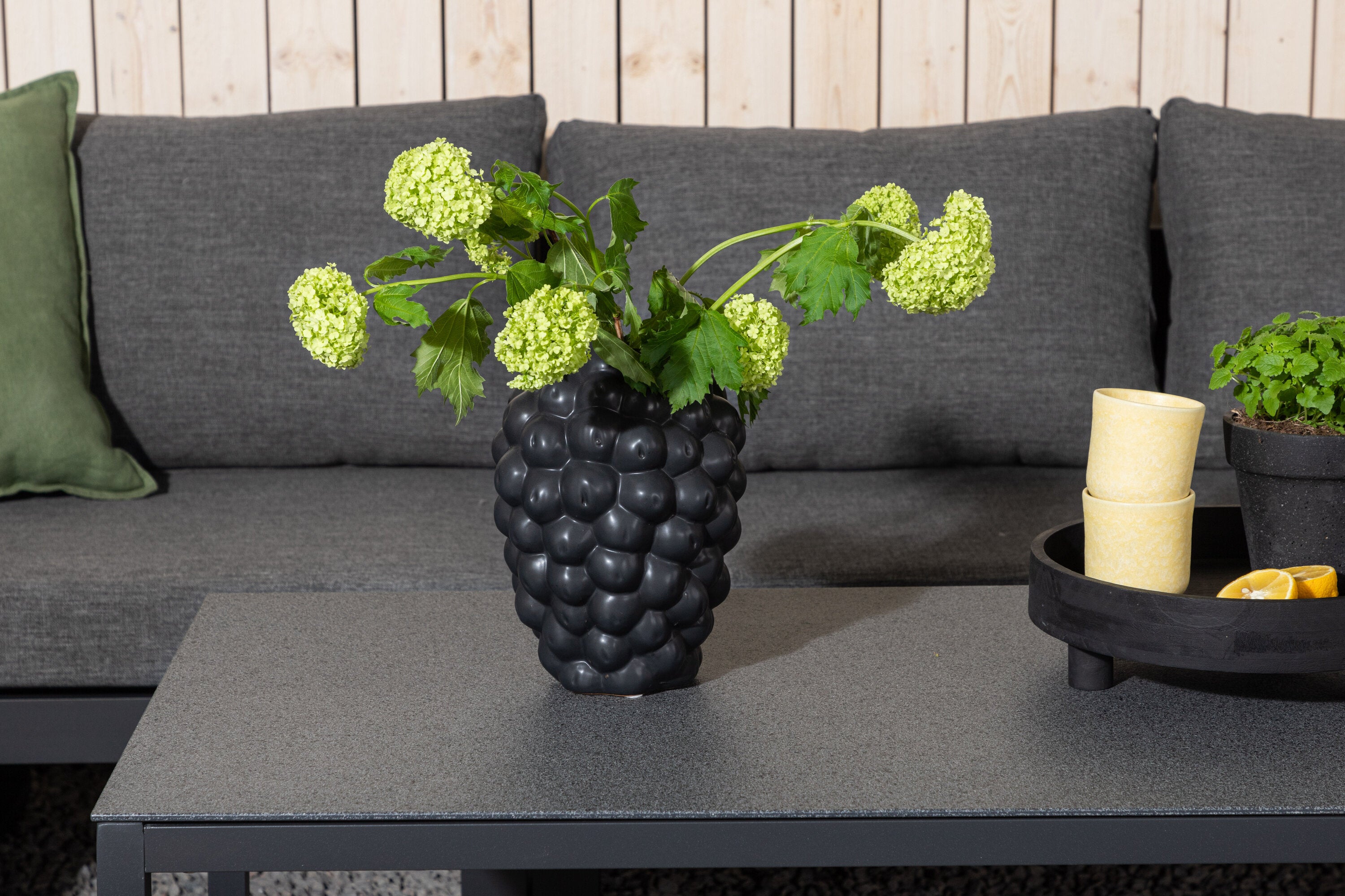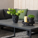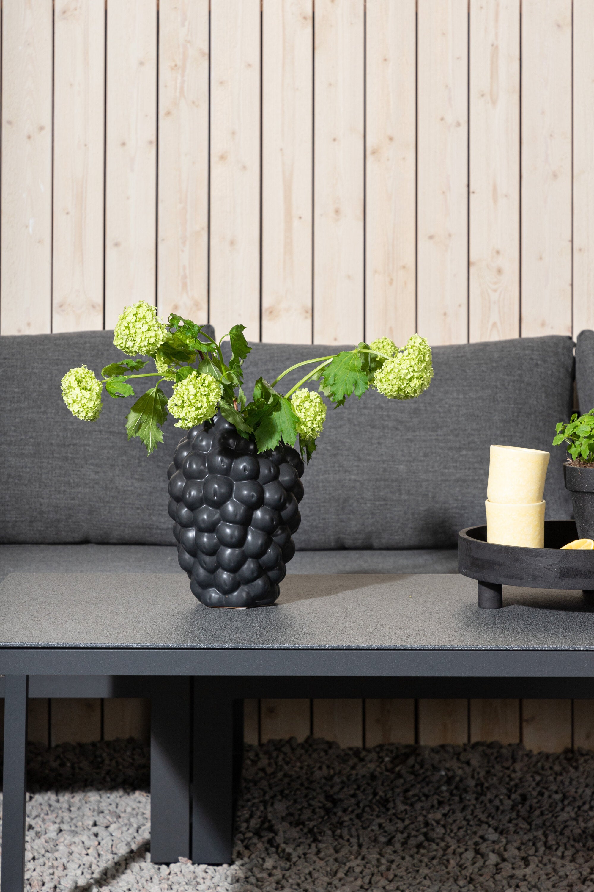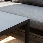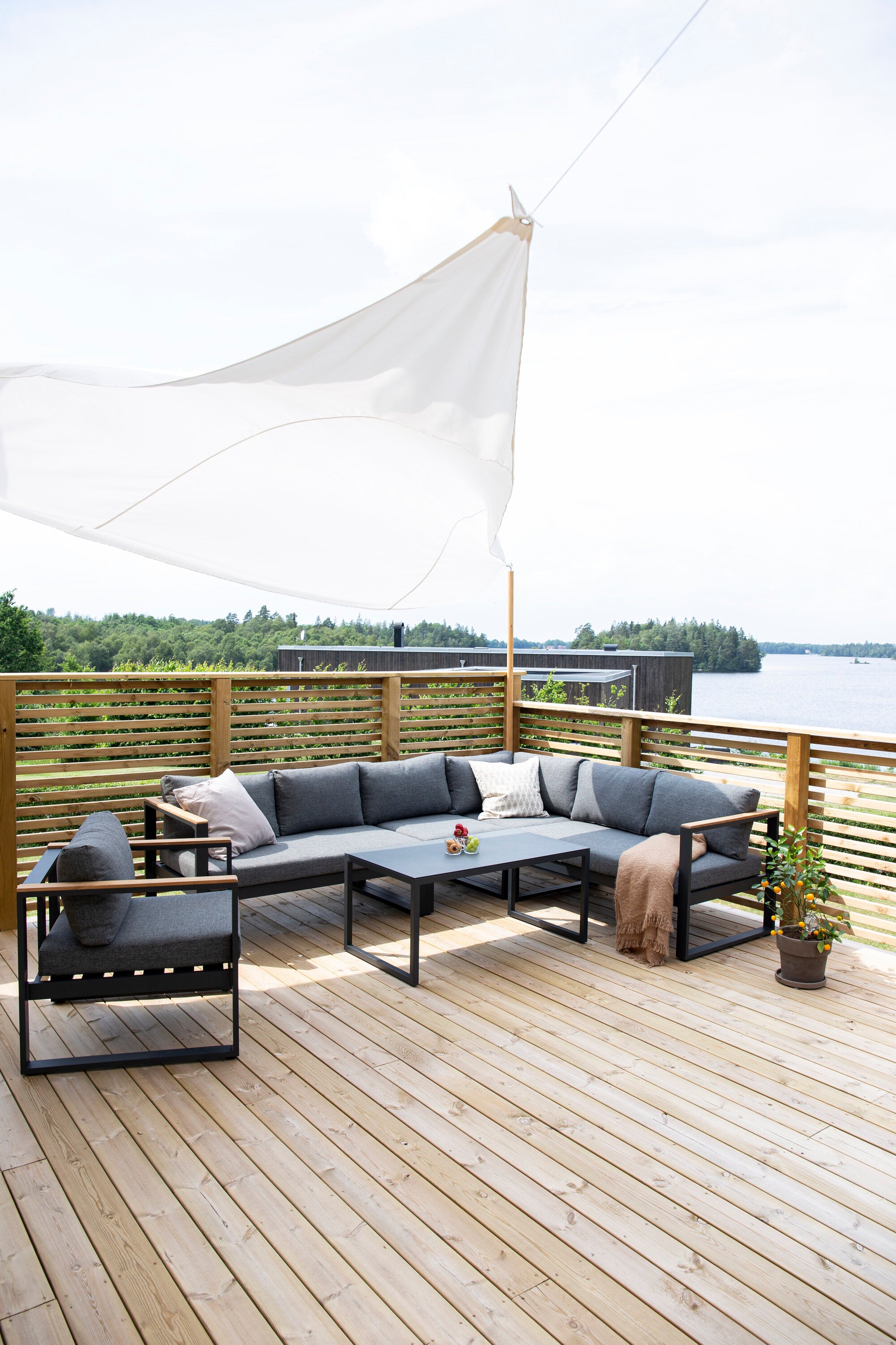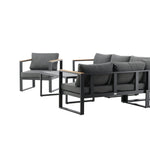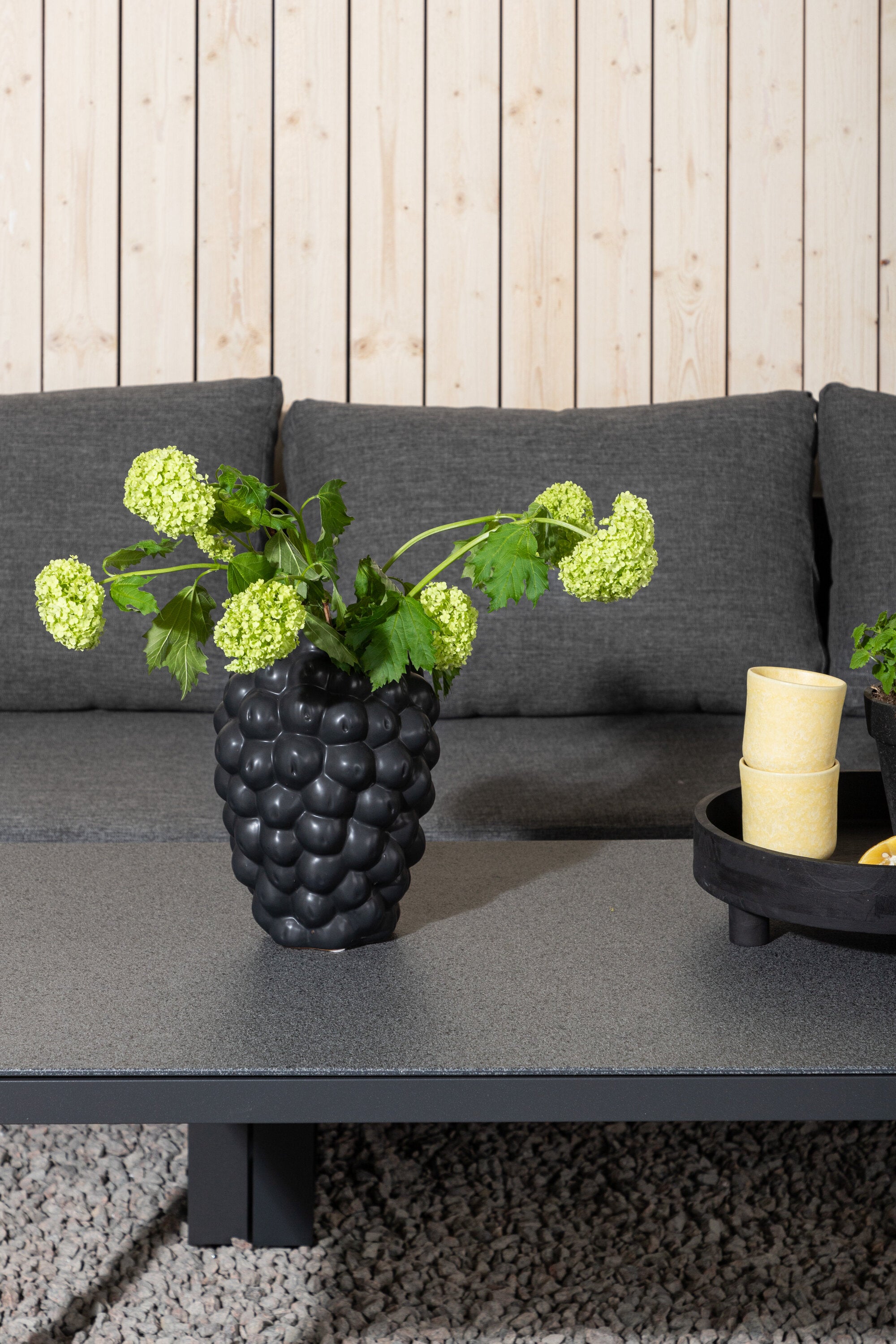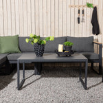 Moderní stylová pohovka, která se perfektně hodí na vaši terasu. Sedací soupravu tvoří třímístná pohovka včetně vražedného polštáře a také nízký konferenční stolek s tabletovým sklem ve spreji. Kupte si rámová křesla ze stejné série. Vyrobeno z kovu s černým práškovým nástřikem se stylovými detaily z teaku.