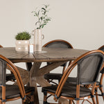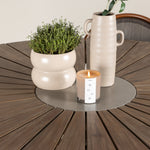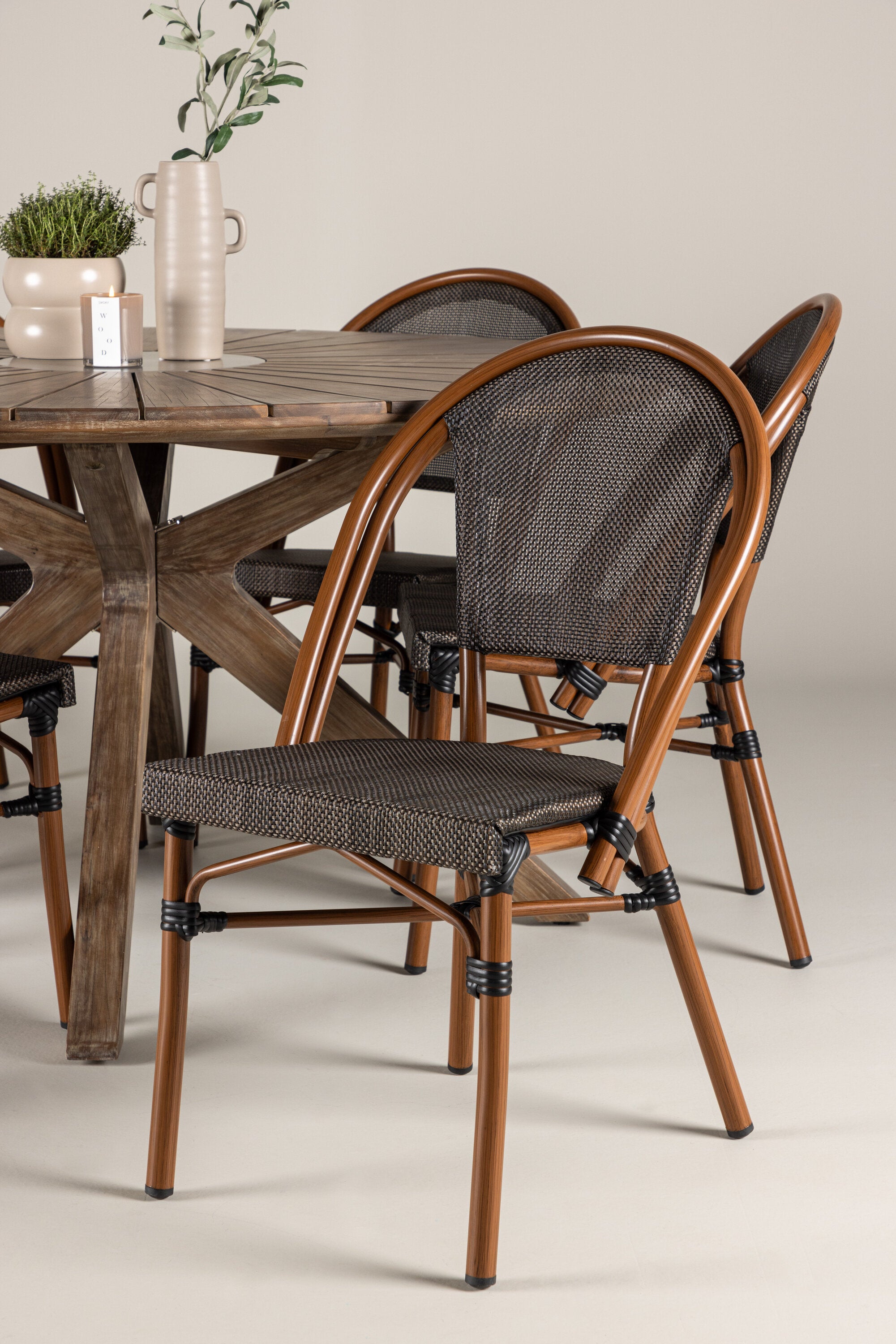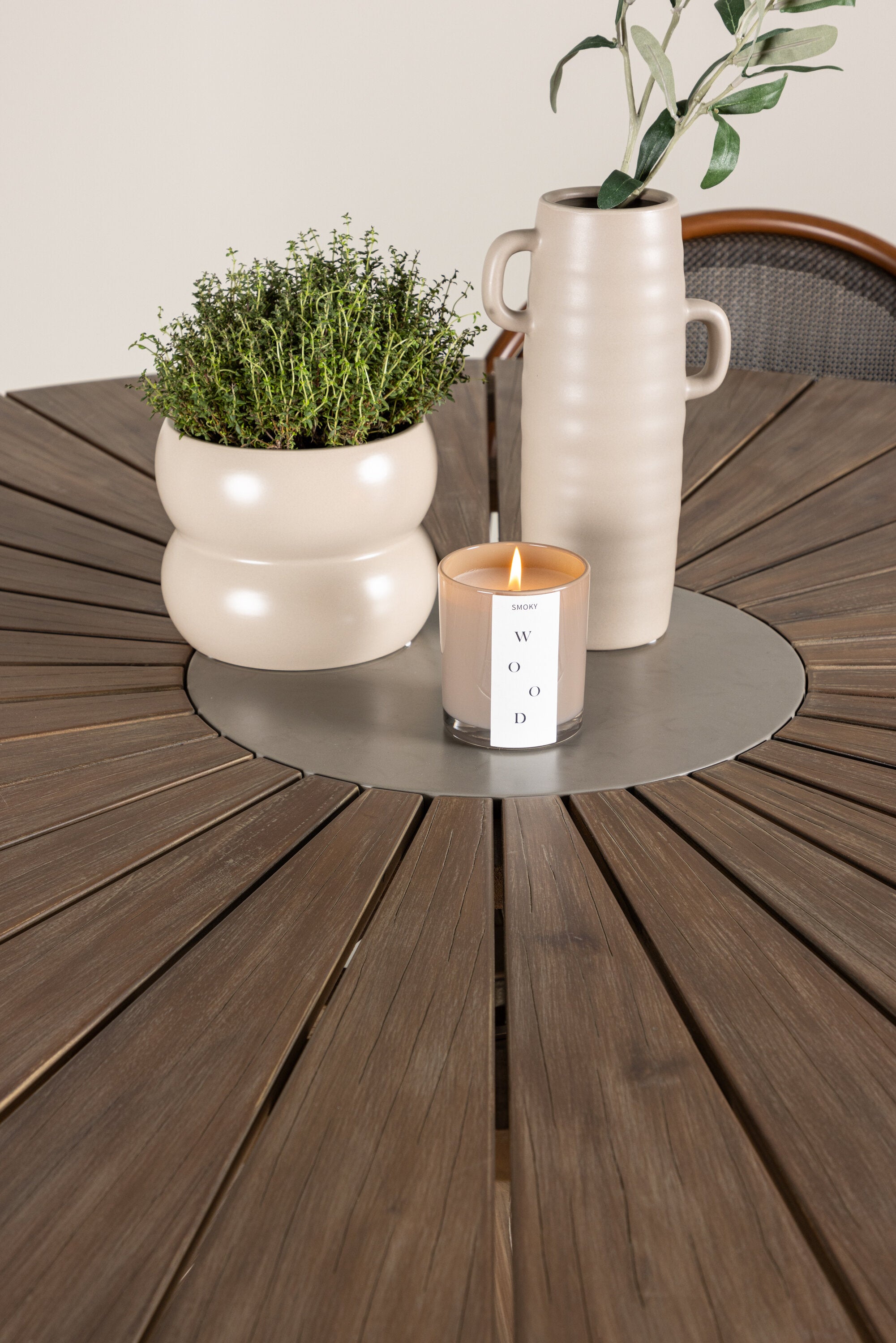 Stůl Rosario je středobodem tohoto souboru s konstrukcí z hnědého akáciového dřeva a velkorysým průměrem 140 cm. Jeho velká velikost pohodlně pojme šest osob pro příjemné venkovní setkání.