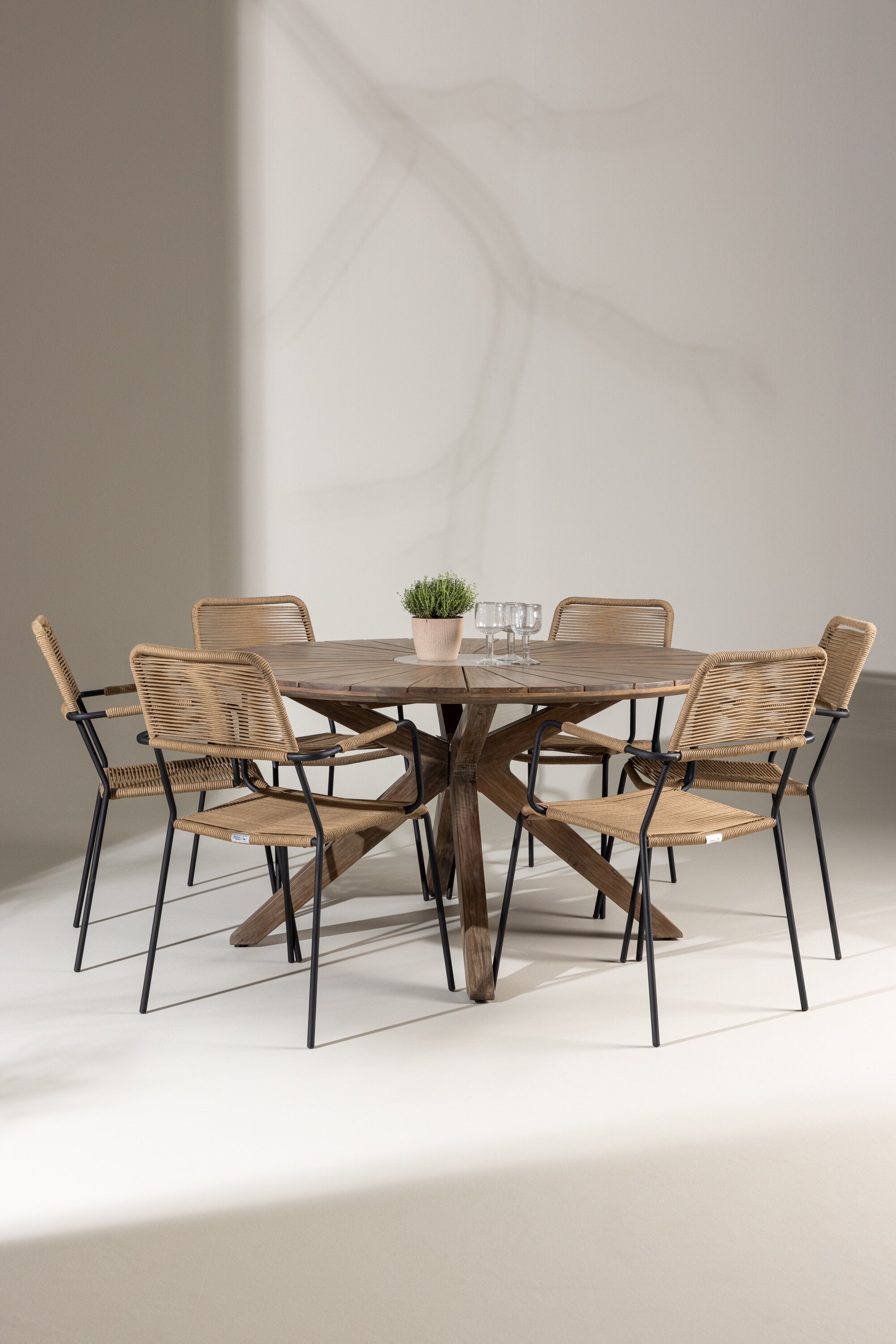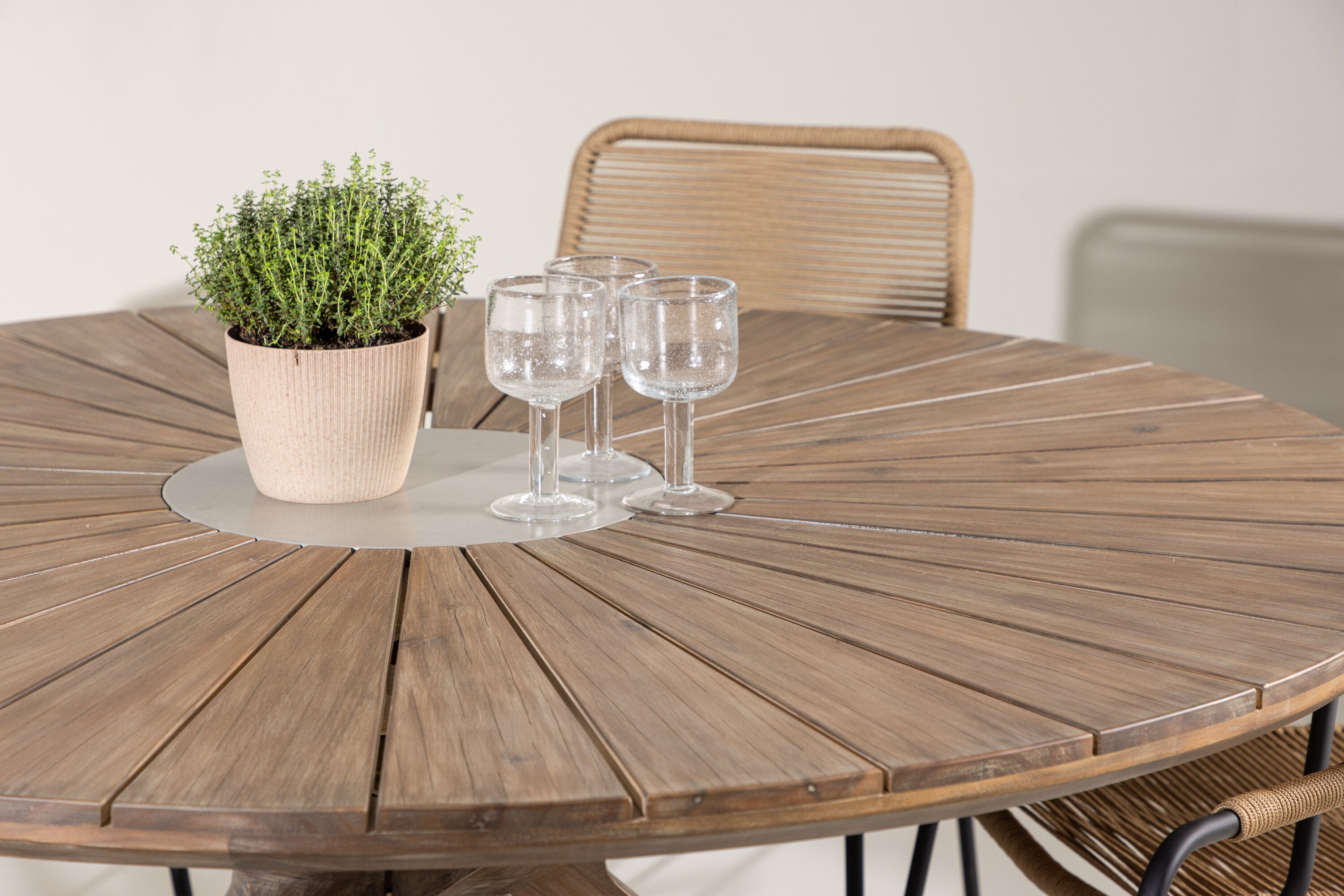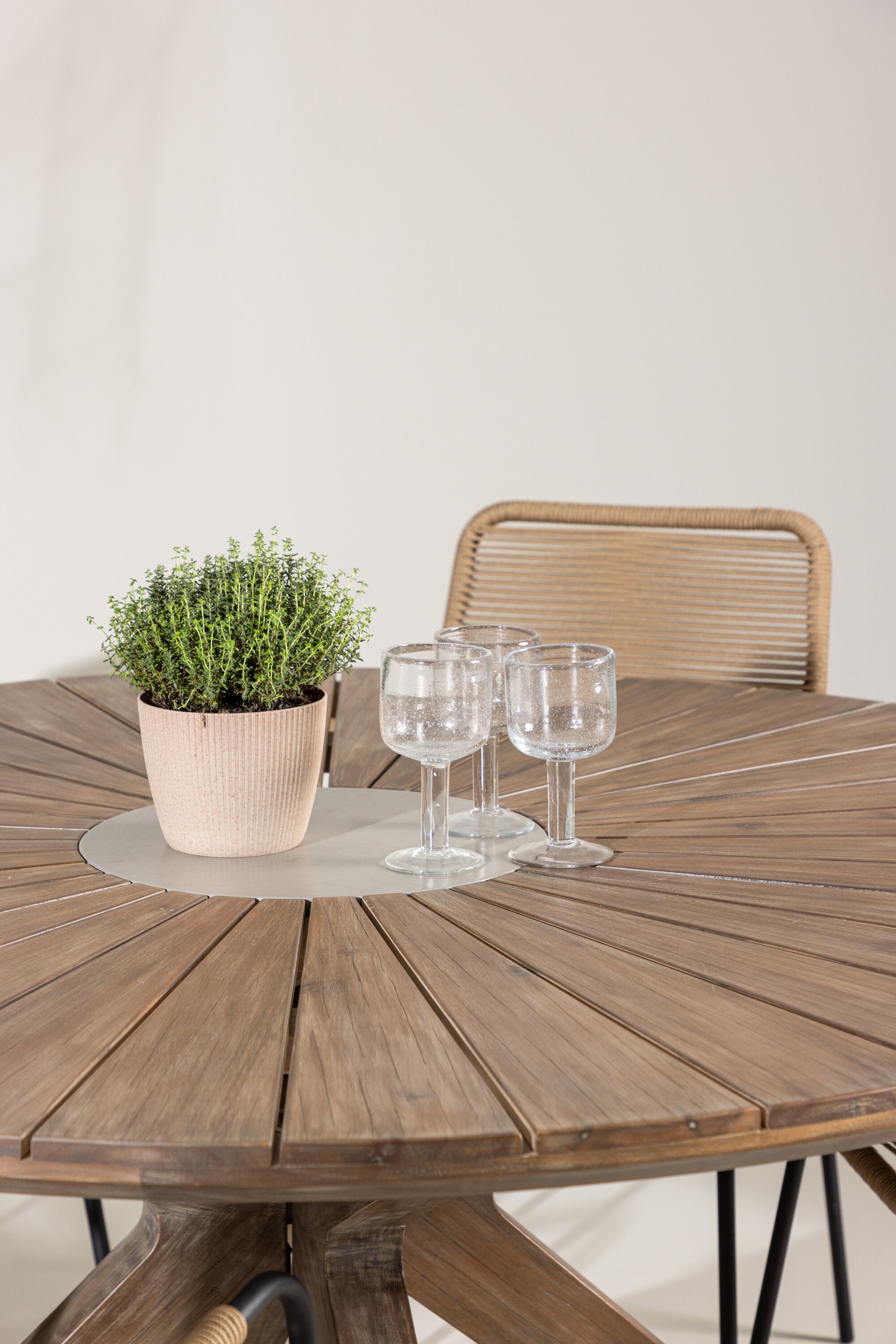 Stůl Rosario je středobodem tohoto souboru s konstrukcí z hnědého akáciového dřeva a průměrem 140 cm. Jeho velkorysá velikost pohodlně pojme šest osob pro příjemné venkovní posezení.