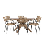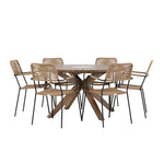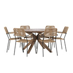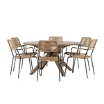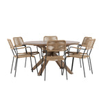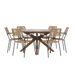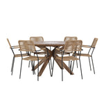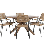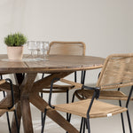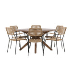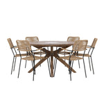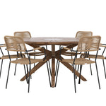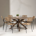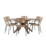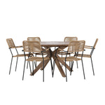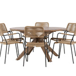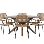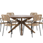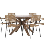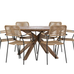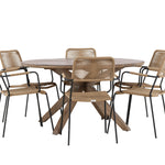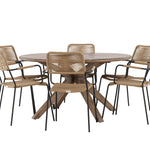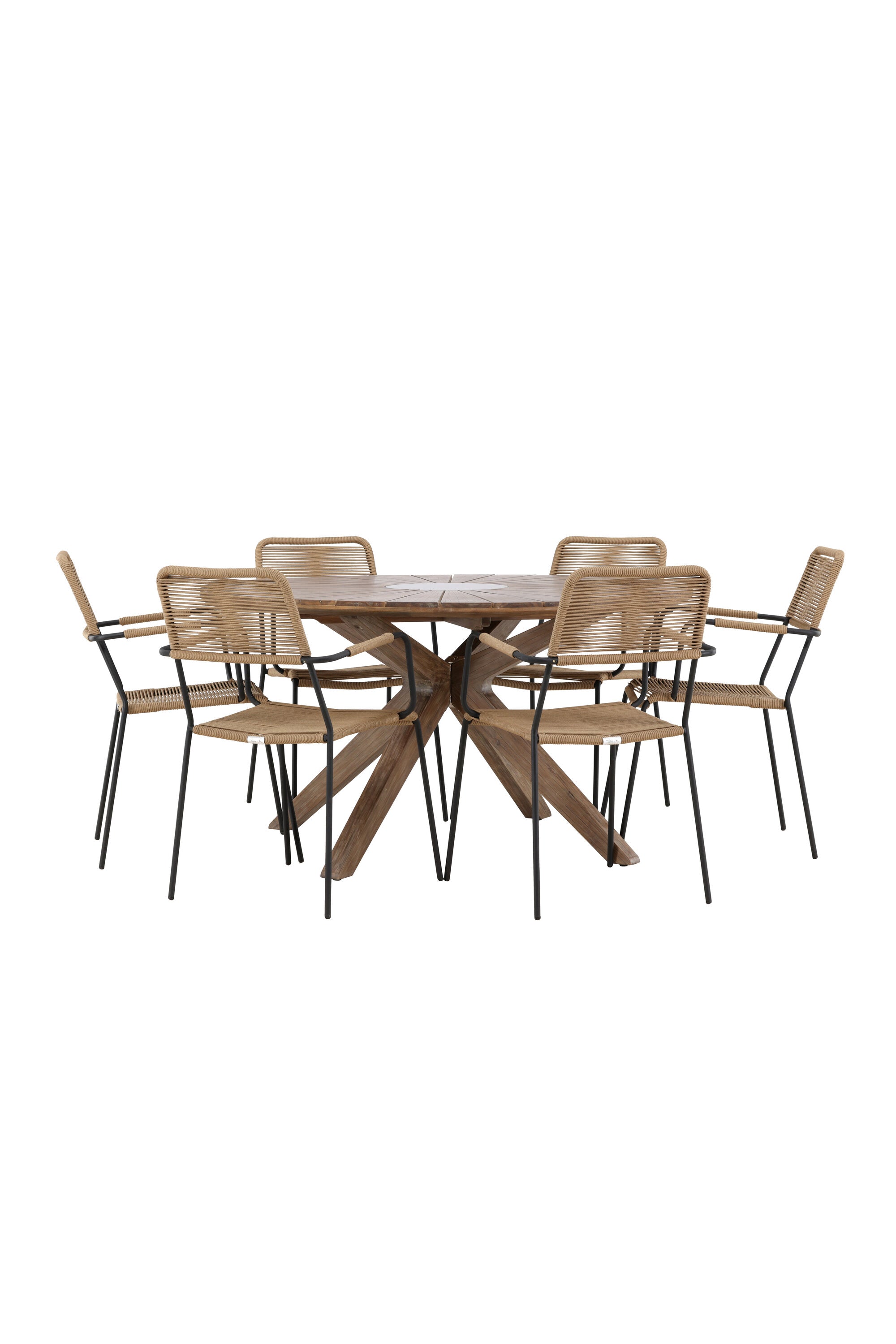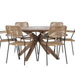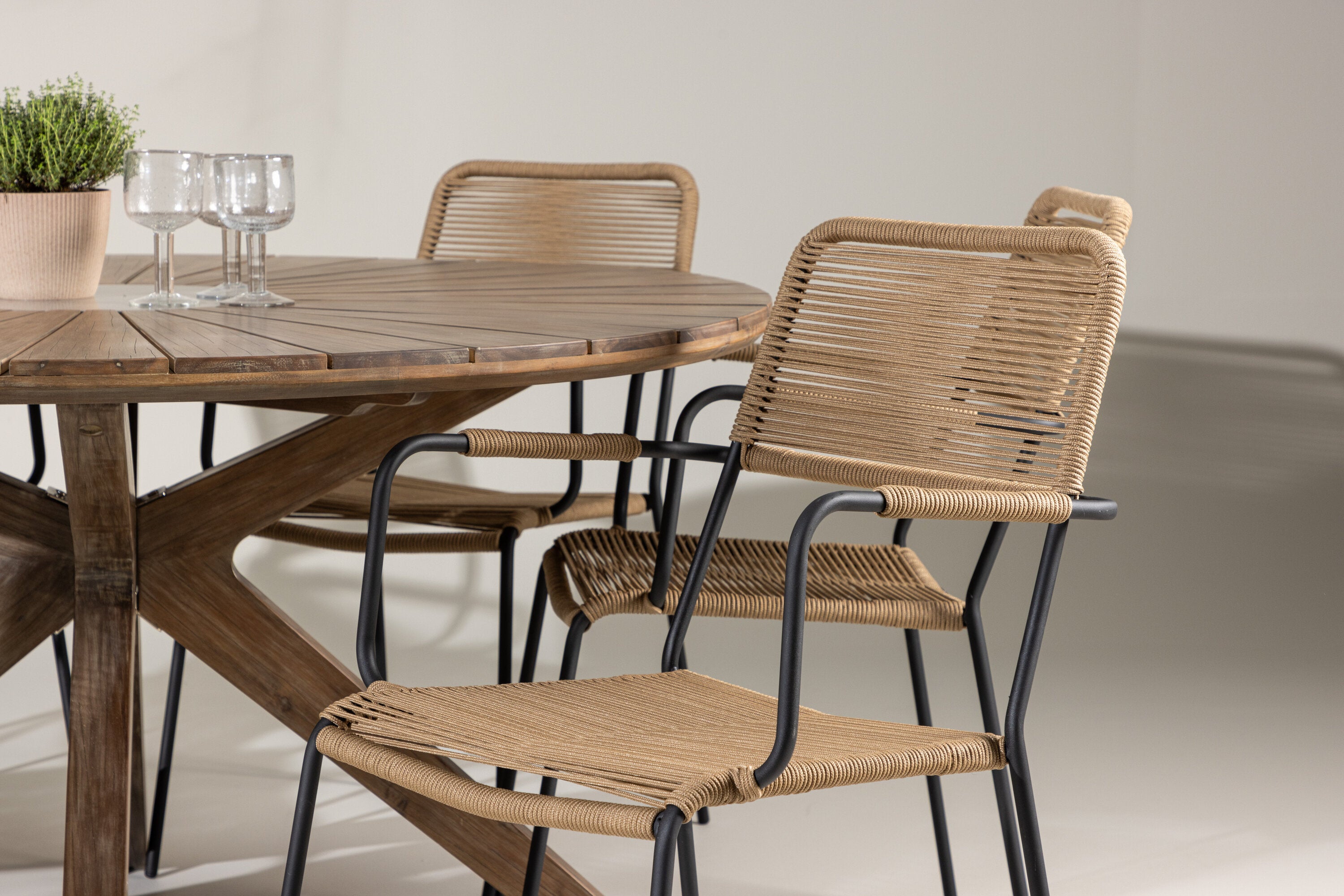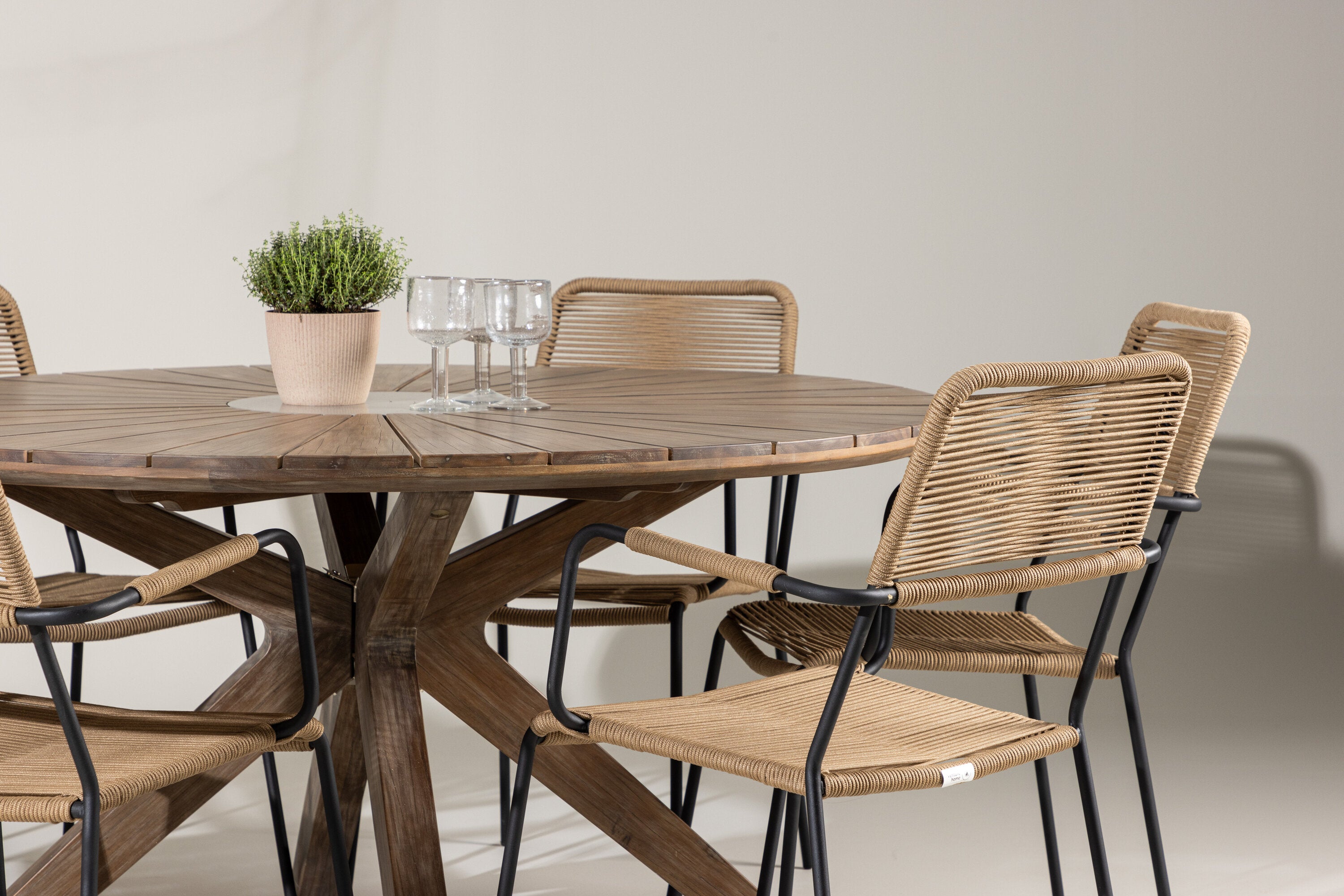 Stůl Rosario je středobodem tohoto souboru s konstrukcí z hnědého akáciového dřeva a průměrem 140 cm. Jeho velkorysá velikost pohodlně pojme šest osob pro příjemné venkovní posezení.