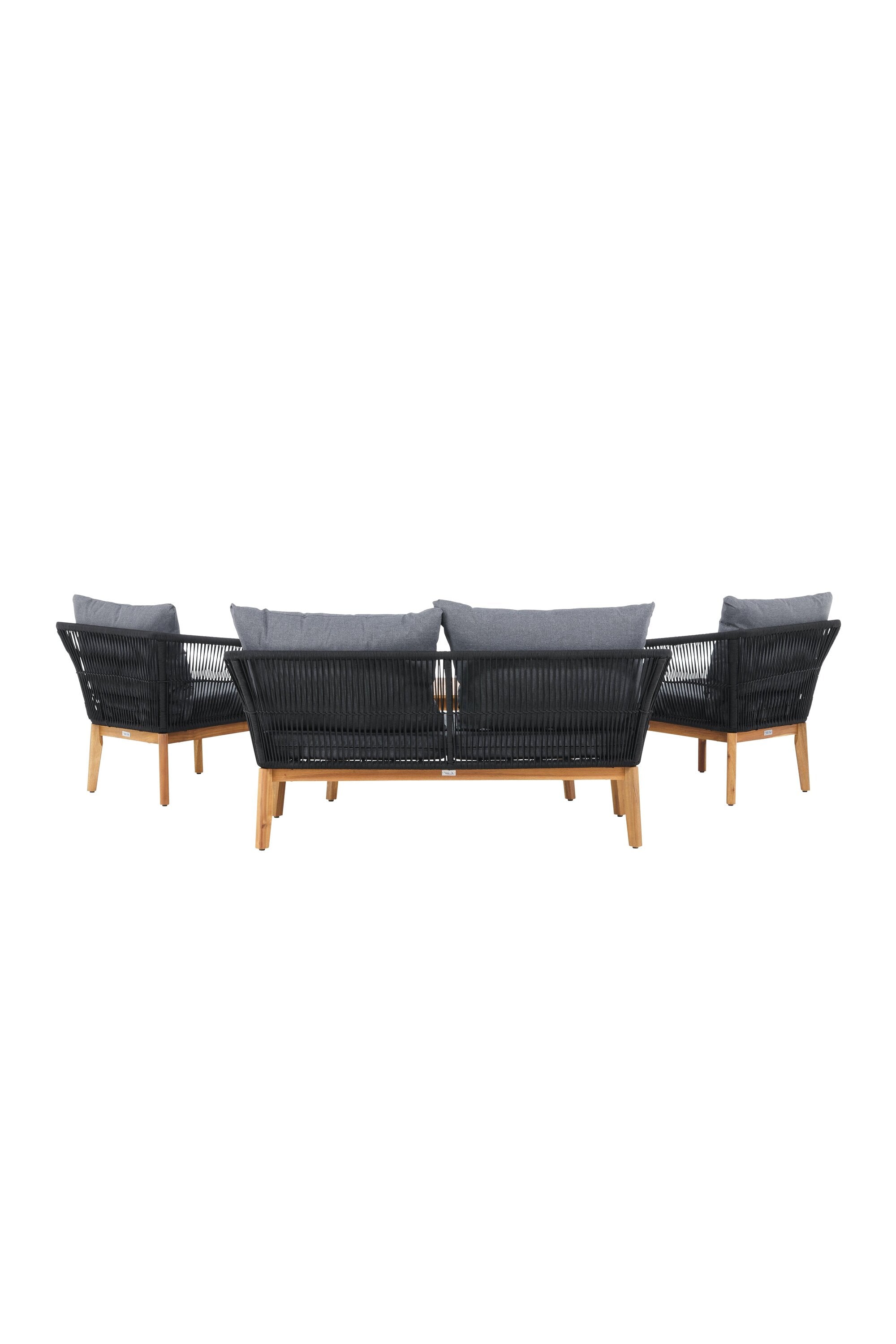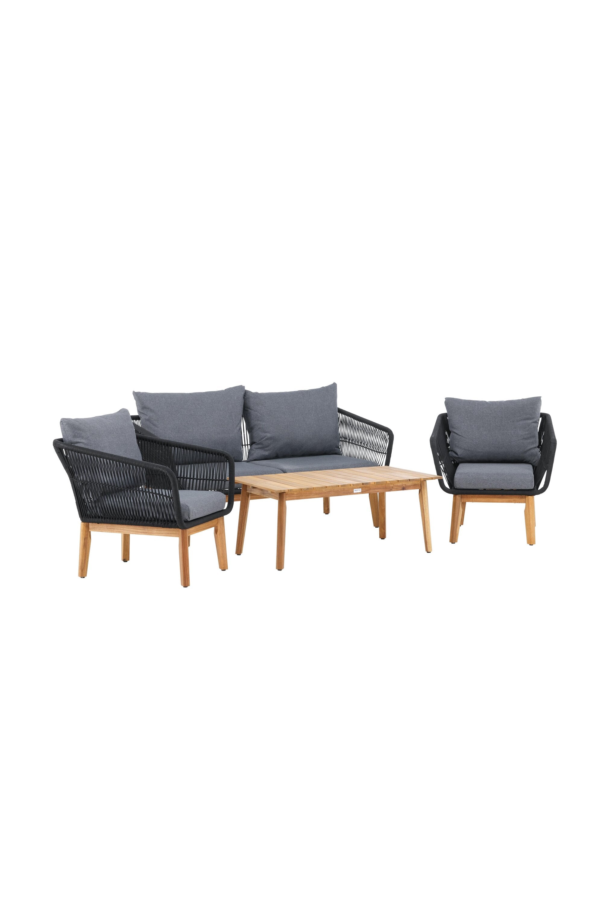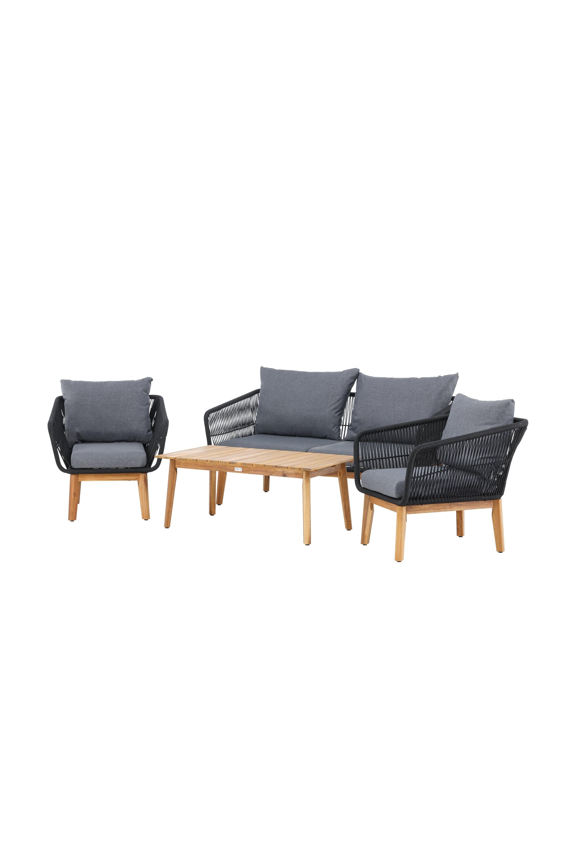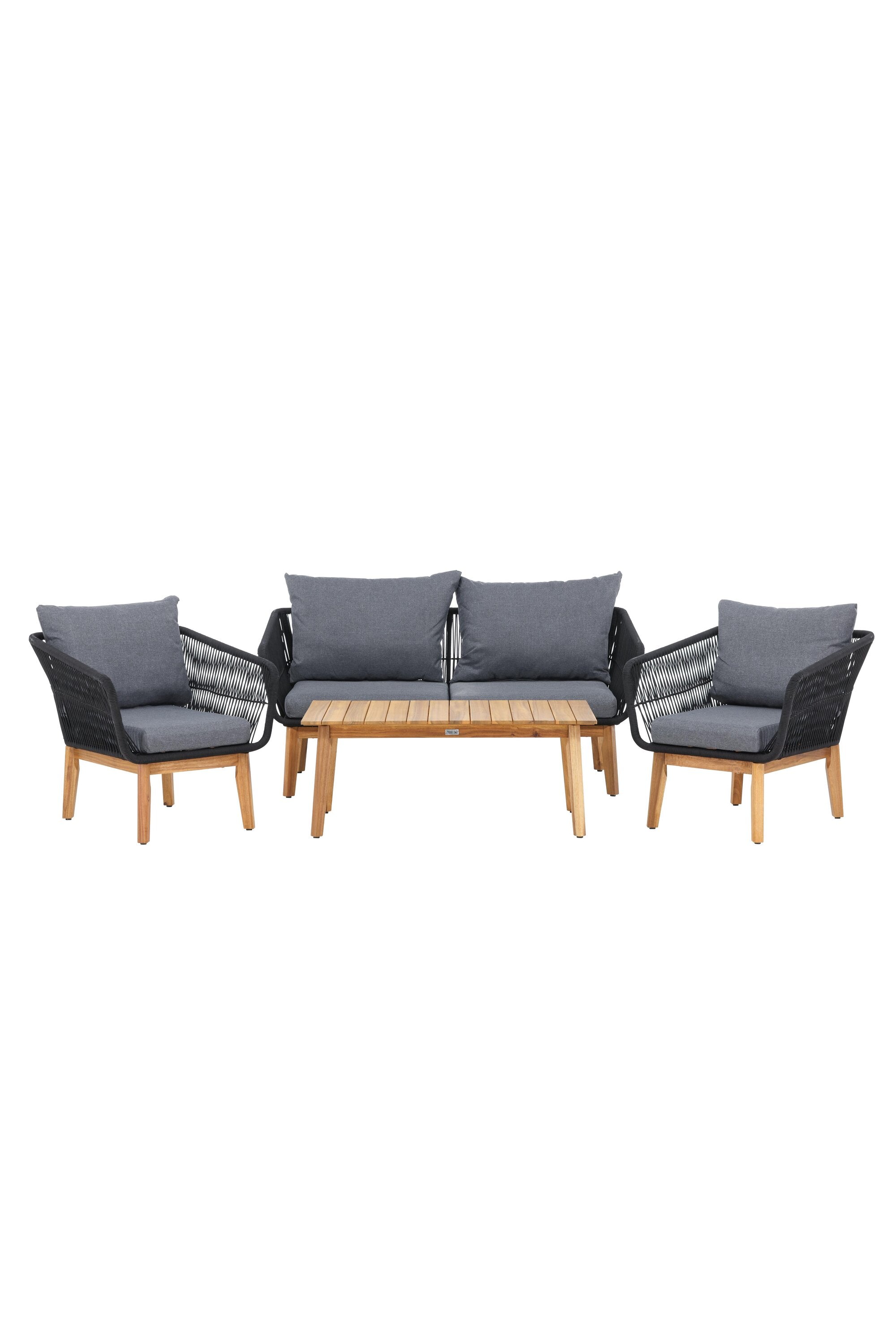 Chania – skupina trendy pohovek se zaměřením na pohodlí a poutavý design. Sedací souprava se skládá z dvoumístné pohovky, dvou rámových křesel včetně silných odolných tmavě šedých polštářů. Součástí pohovky je i nízký konferenční stolek, důsledně vyrobený z krásné akácie. Sedací souprava je vyrobena s rámem z hliníku a nohami z akácie a její zadní část a boky jsou opleteny černým provazem, který dodává luxusní design. Detaily sedací soupravy v Akacii spolu s konferenčním stolkem vytvářejí exkluzivní pocit.