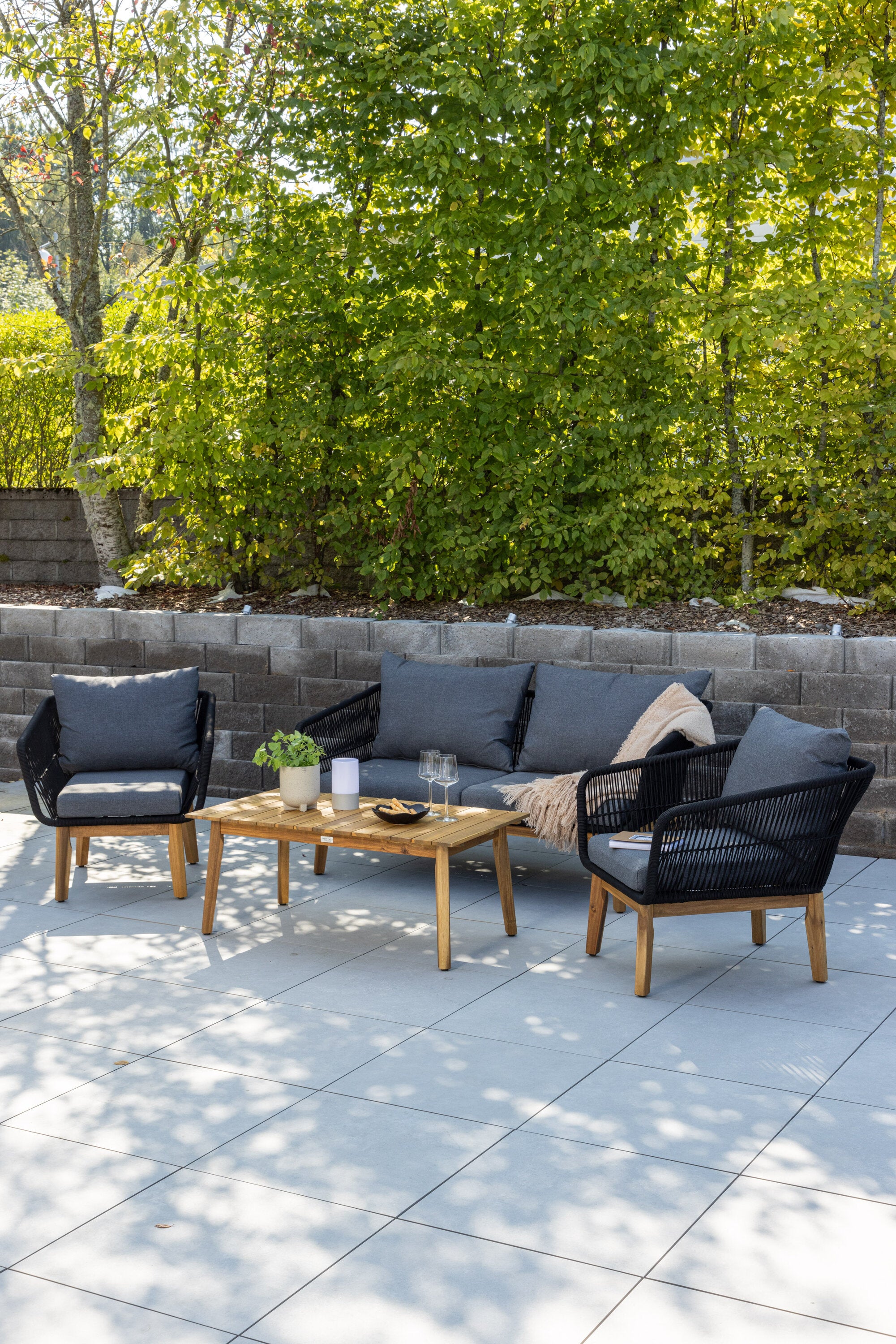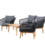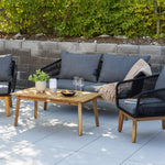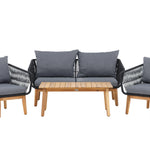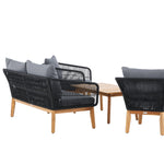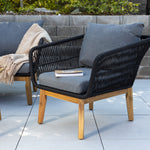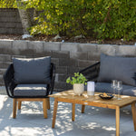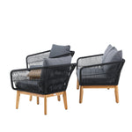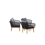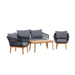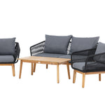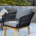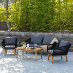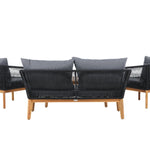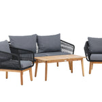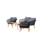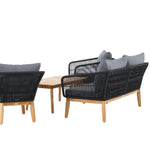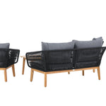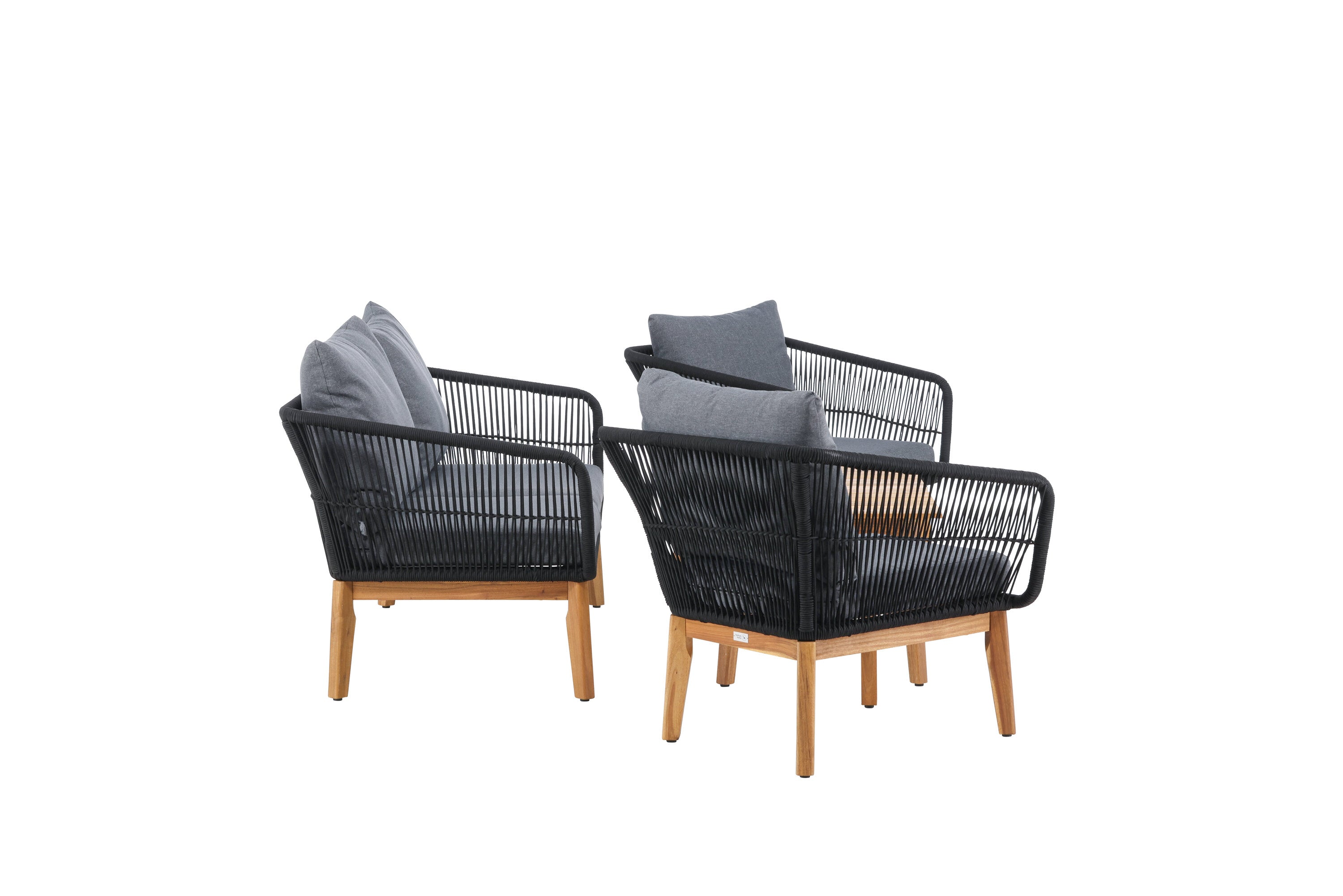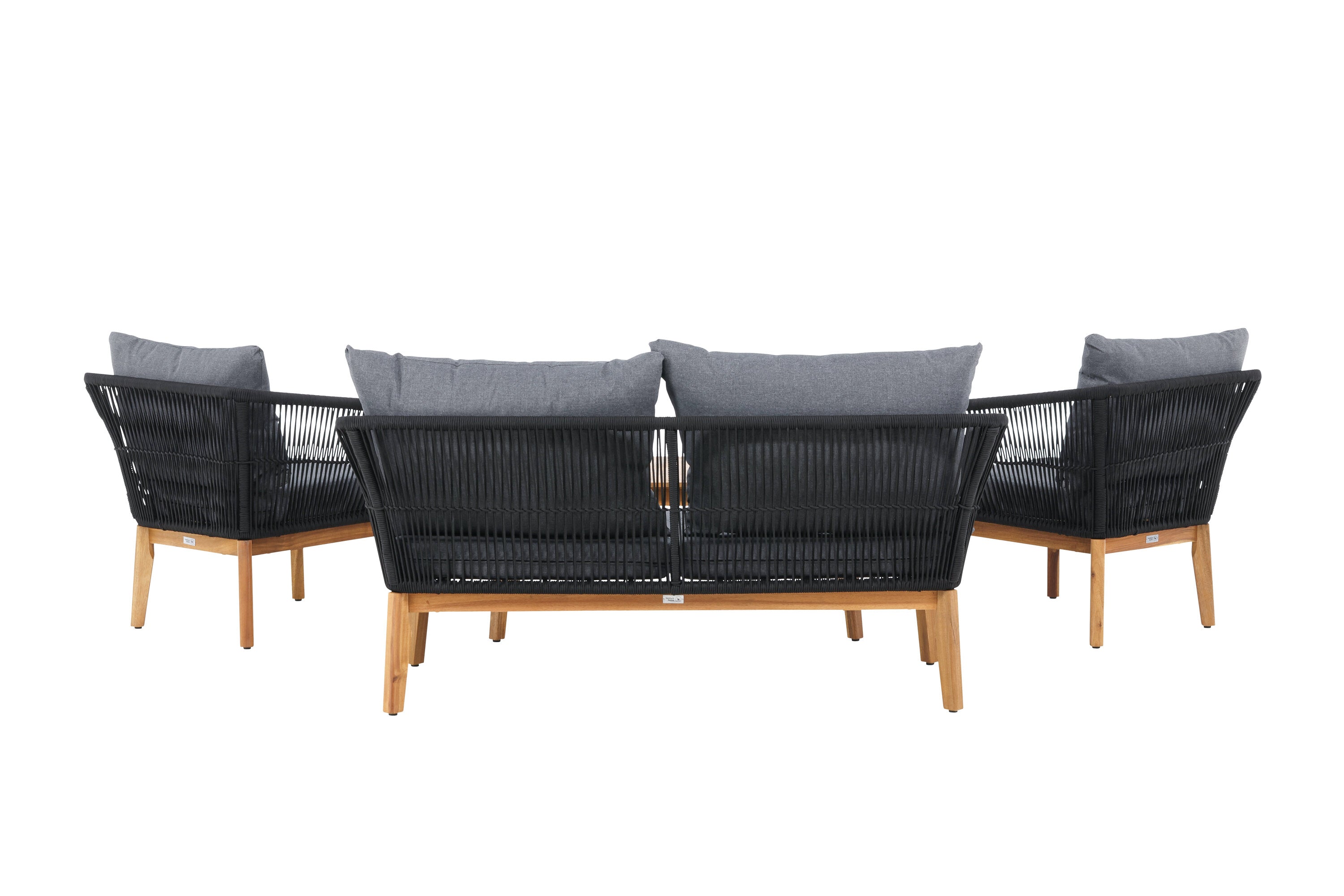 Chania – skupina trendy pohovek se zaměřením na pohodlí a poutavý design. Sedací souprava se skládá z dvoumístné pohovky, dvou rámových křesel včetně silných odolných tmavě šedých polštářů. Součástí pohovky je i nízký konferenční stolek, důsledně vyrobený z krásné akácie. Sedací souprava je vyrobena s rámem z hliníku a nohami z akácie a její zadní část a boky jsou opleteny černým provazem, který dodává luxusní design. Detaily sedací soupravy v Akacii spolu s konferenčním stolkem vytvářejí exkluzivní pocit.