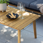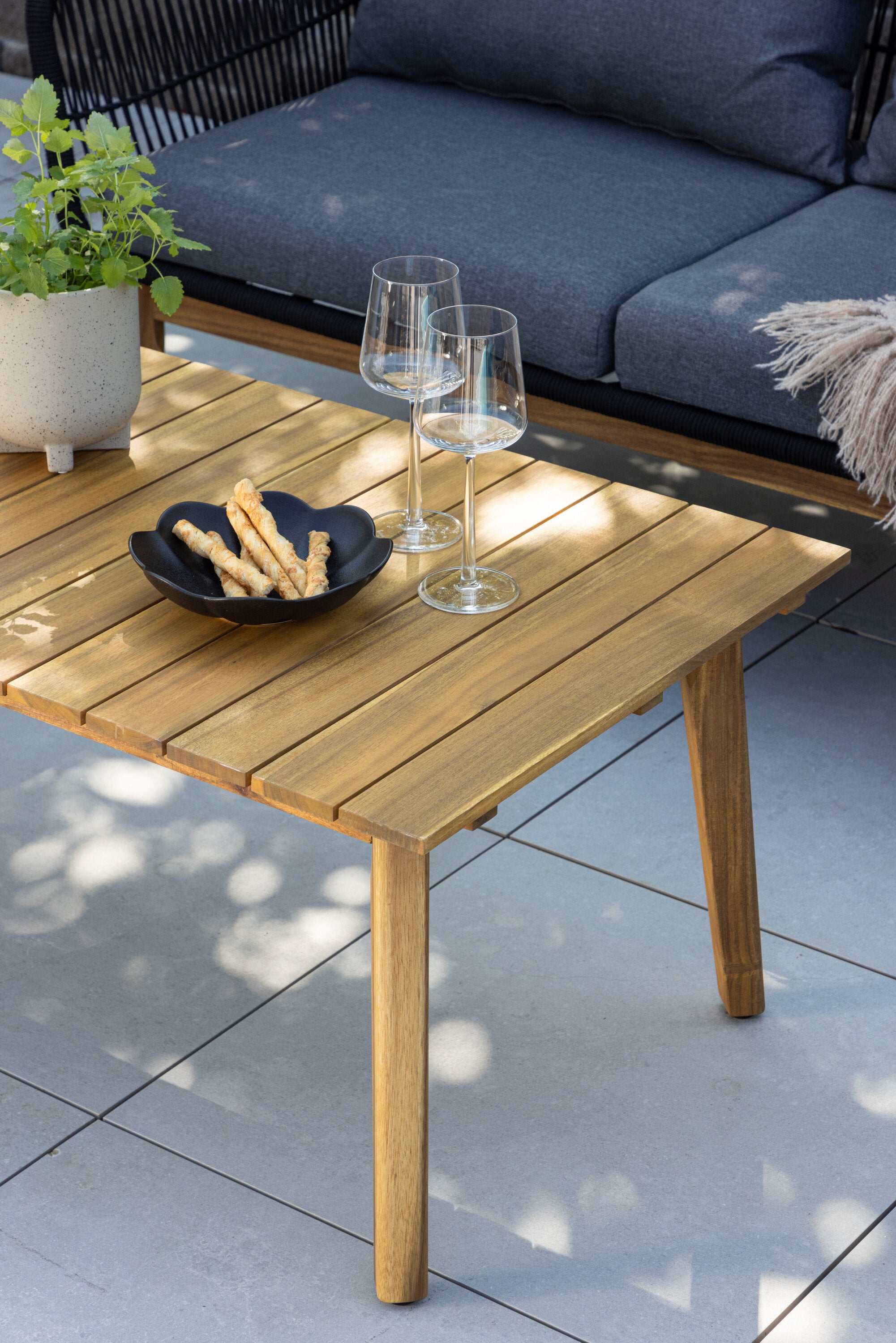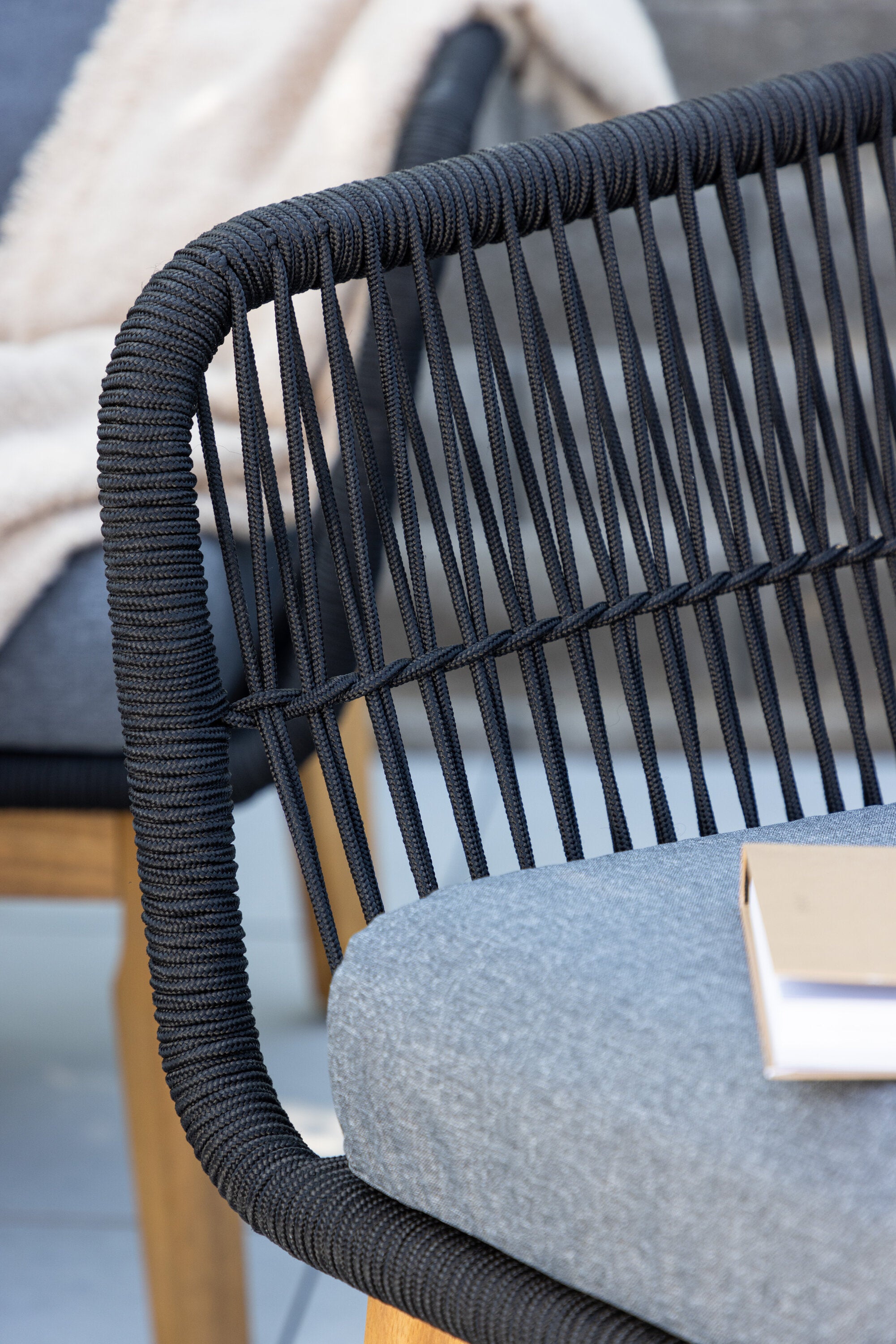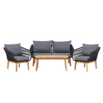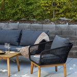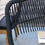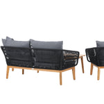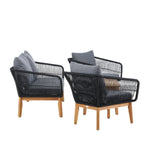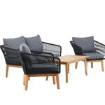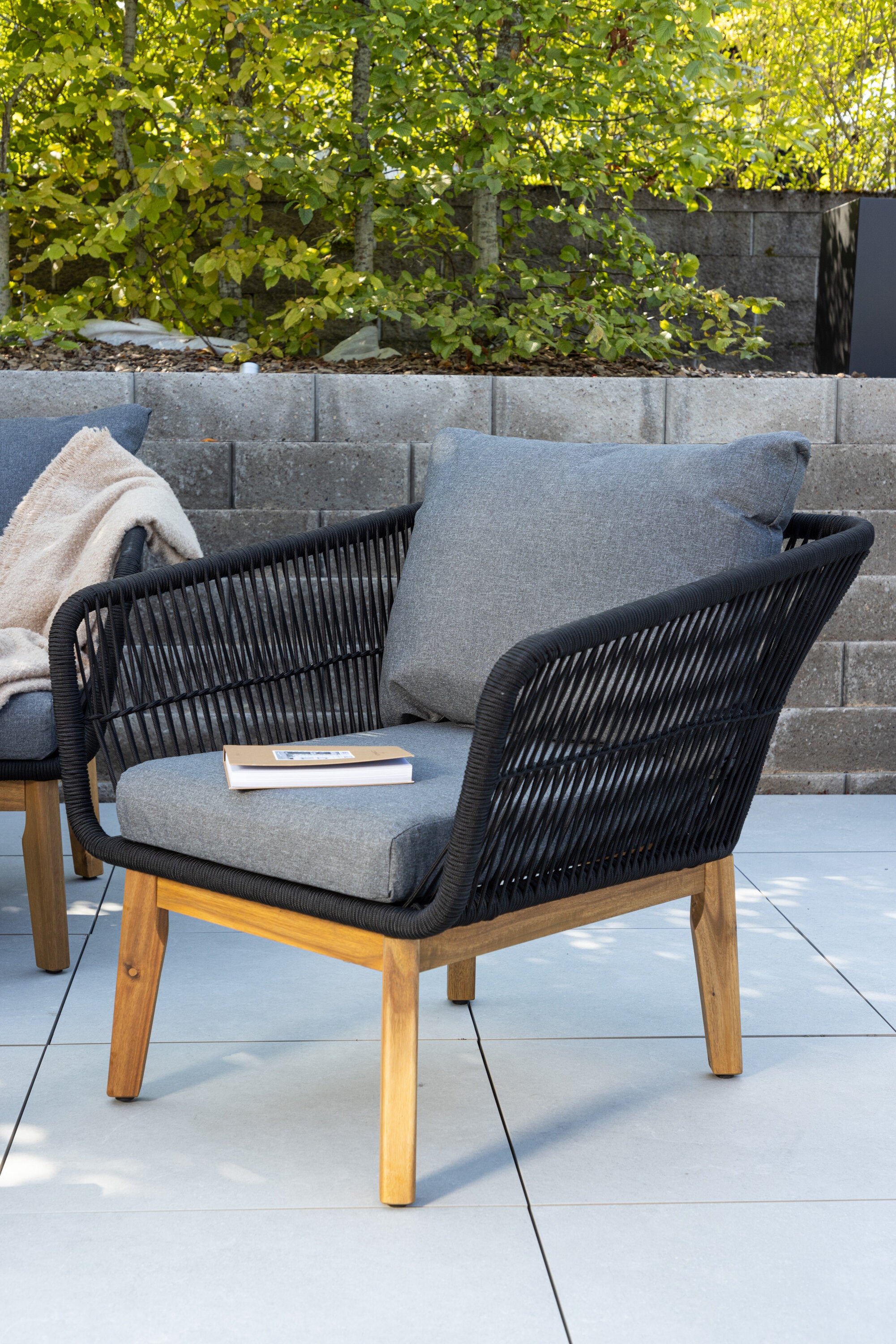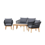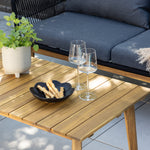 Chania – skupina trendy pohovek se zaměřením na pohodlí a poutavý design. Sedací souprava se skládá z dvoumístné pohovky, dvou rámových křesel včetně silných odolných tmavě šedých polštářů. Součástí pohovky je i nízký konferenční stolek, důsledně vyrobený z krásné akácie. Sedací souprava je vyrobena s rámem z hliníku a nohami z akácie a její zadní část a boky jsou opleteny černým provazem, který dodává luxusní design. Detaily sedací soupravy v Akacii spolu s konferenčním stolkem vytvářejí exkluzivní pocit.