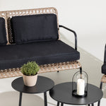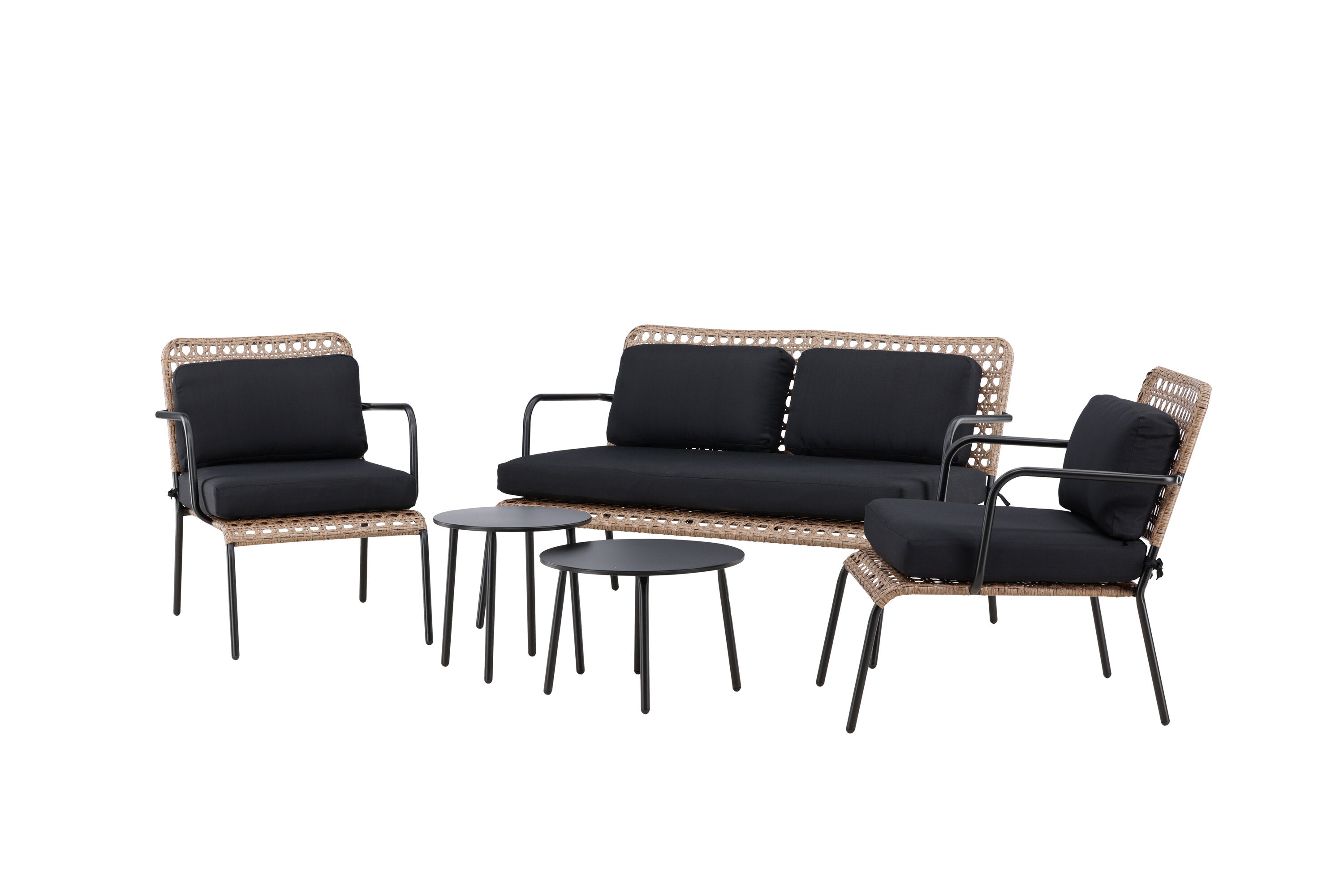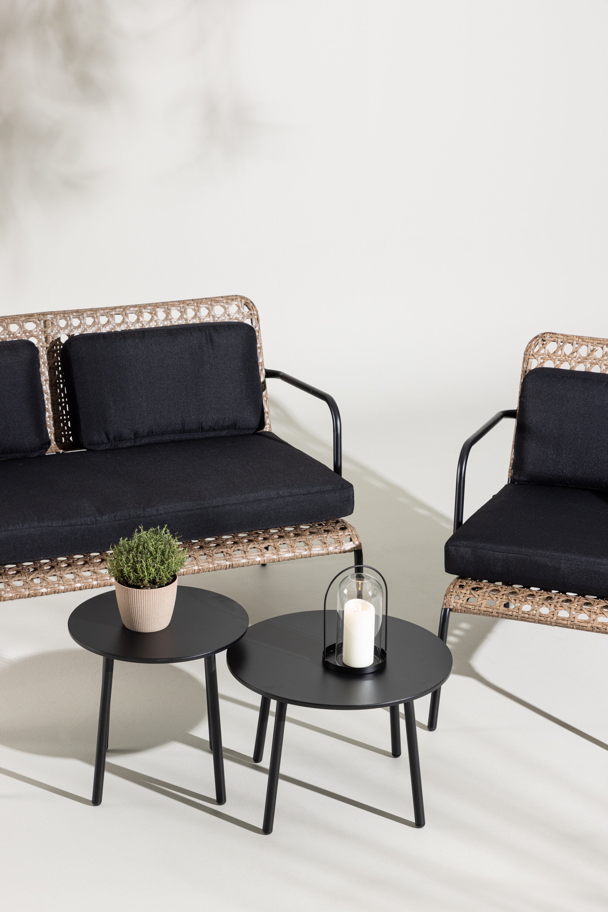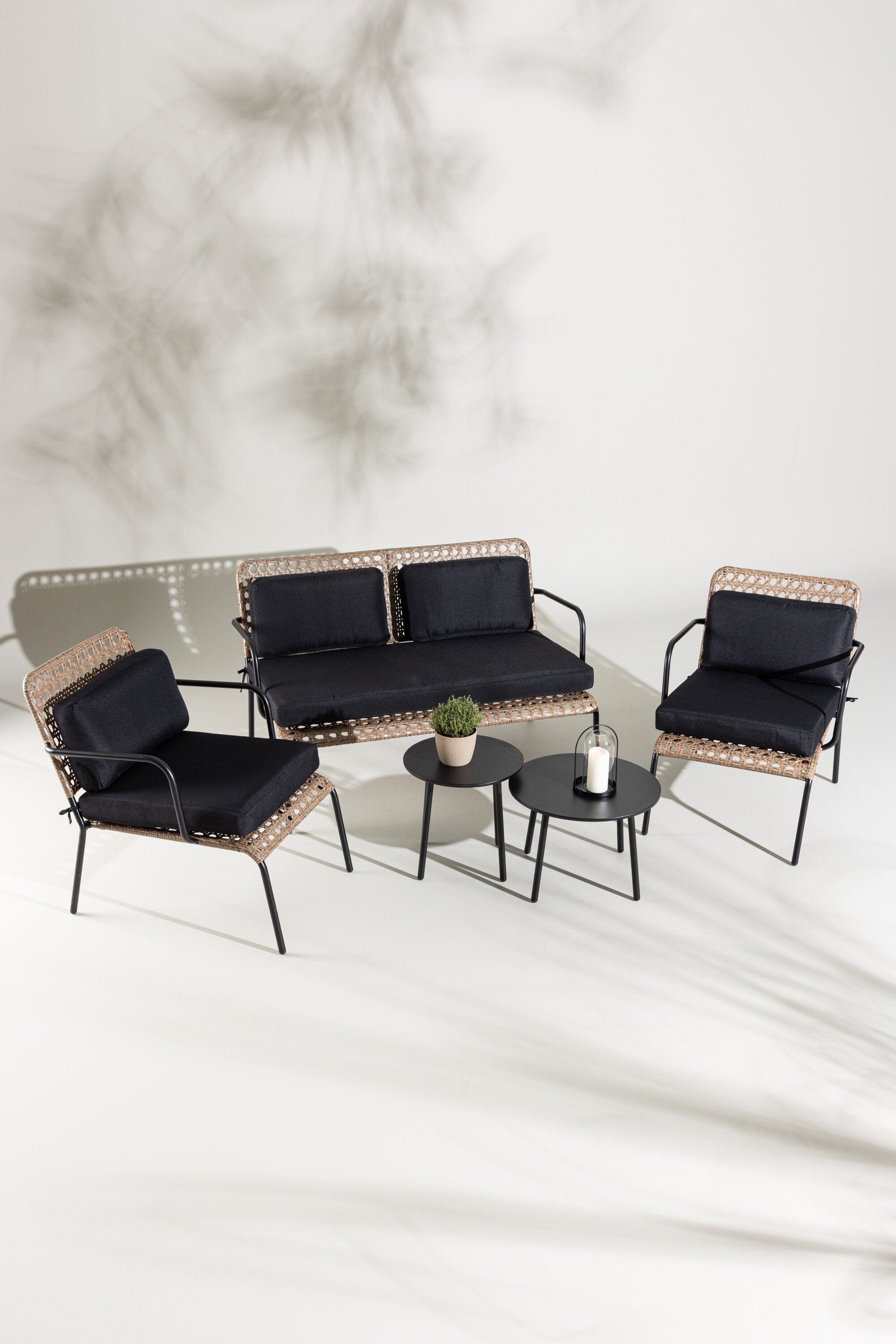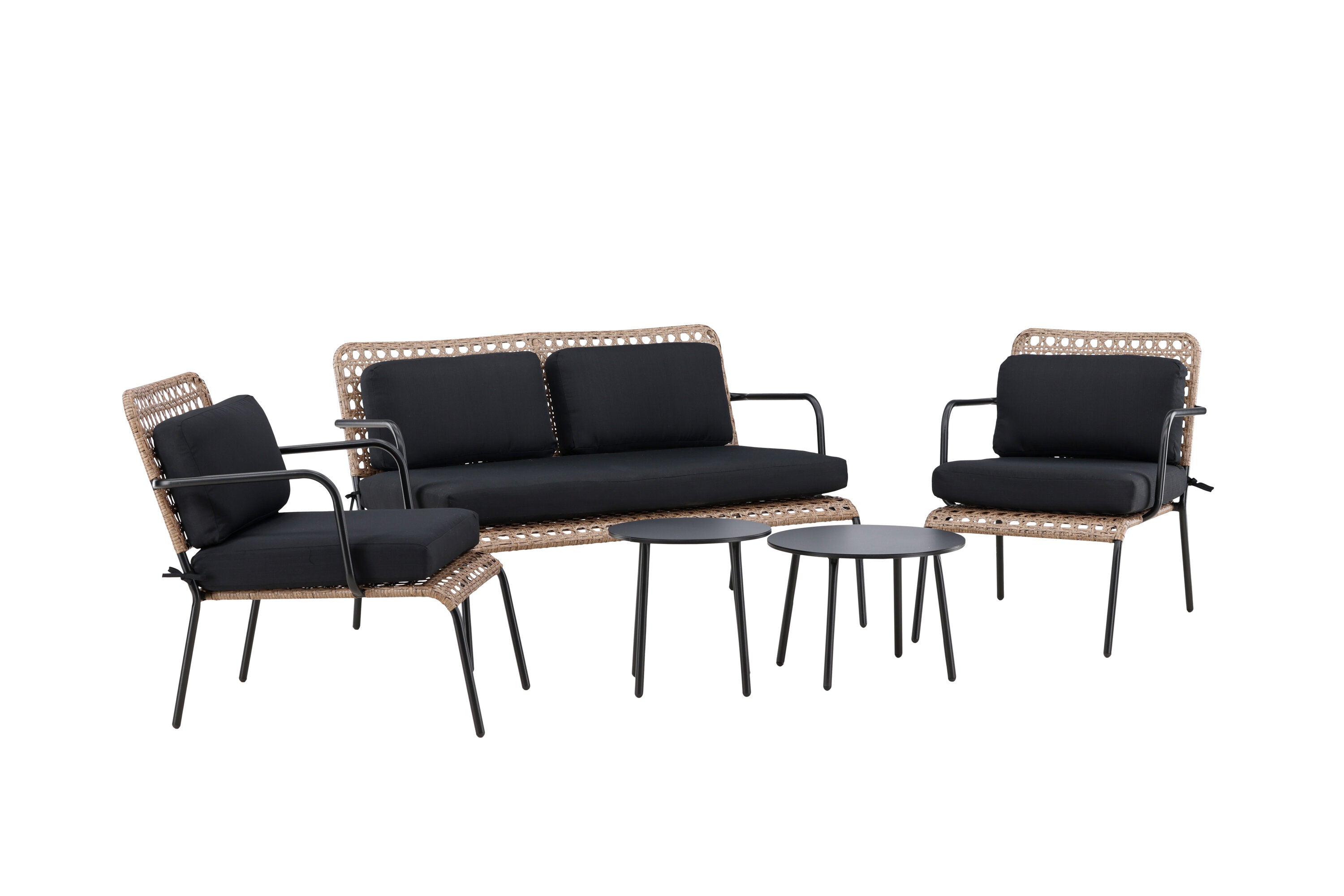 Moderní skupina pohovek se zaměřením na pohodlí, která se perfektně hodí na zasklenou terasu. Sestava nábytku se skládá z dvoumístné pohovky, dvou rámových křesel z černého práškově lakovaného kovu a opěradla a sedáku je navrženo v úhledném vzoru přírodního ratanu. Nábytková skupina je dodávána s černými polštáři a kulatými černými stolky ve dvou částech. Přírodní materiál dodává každému jednotlivému kusu nábytku jedinečný charakter a jeho vzor přitáhne oči. Je vyžadována lehčí montáž.