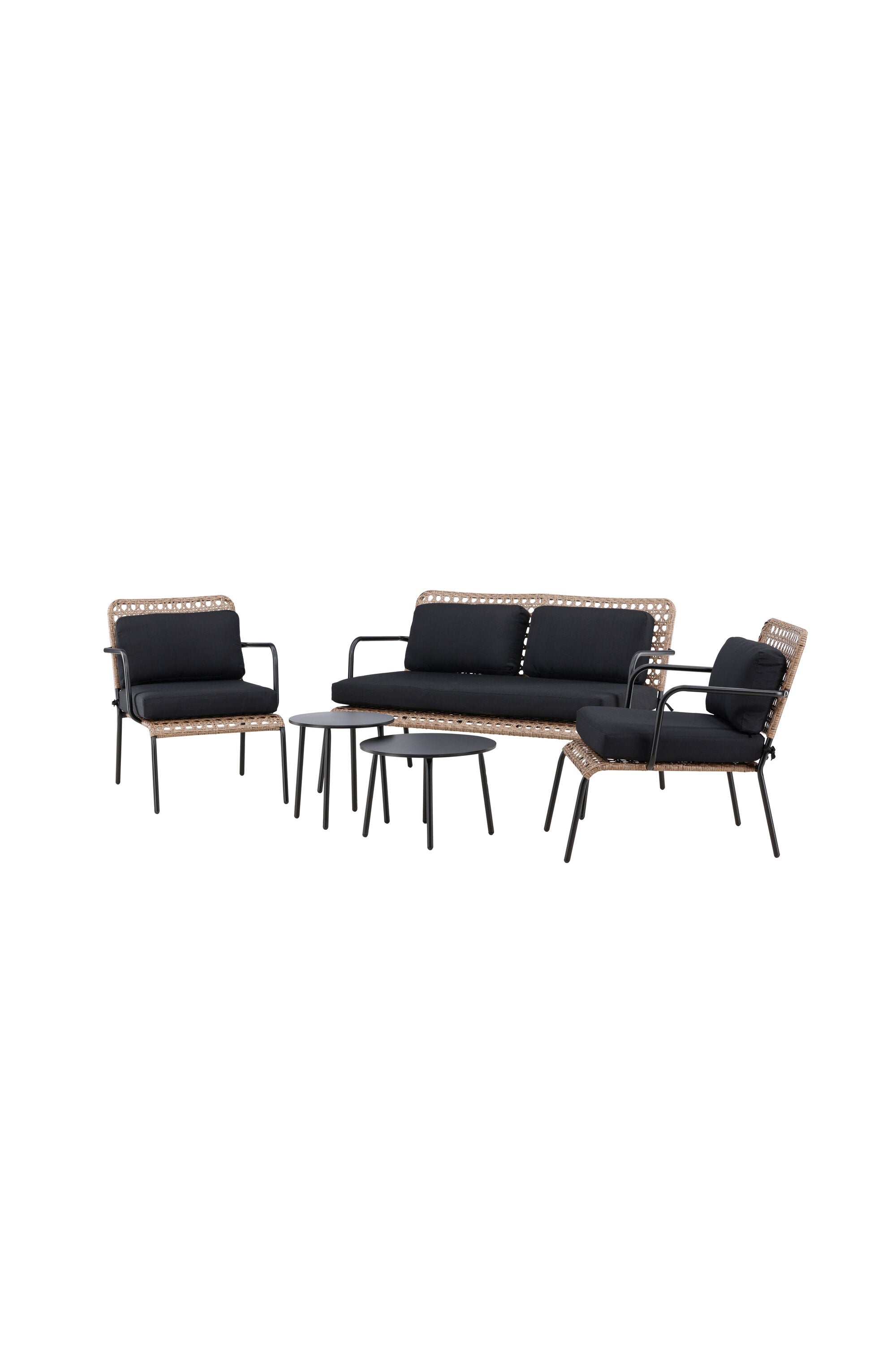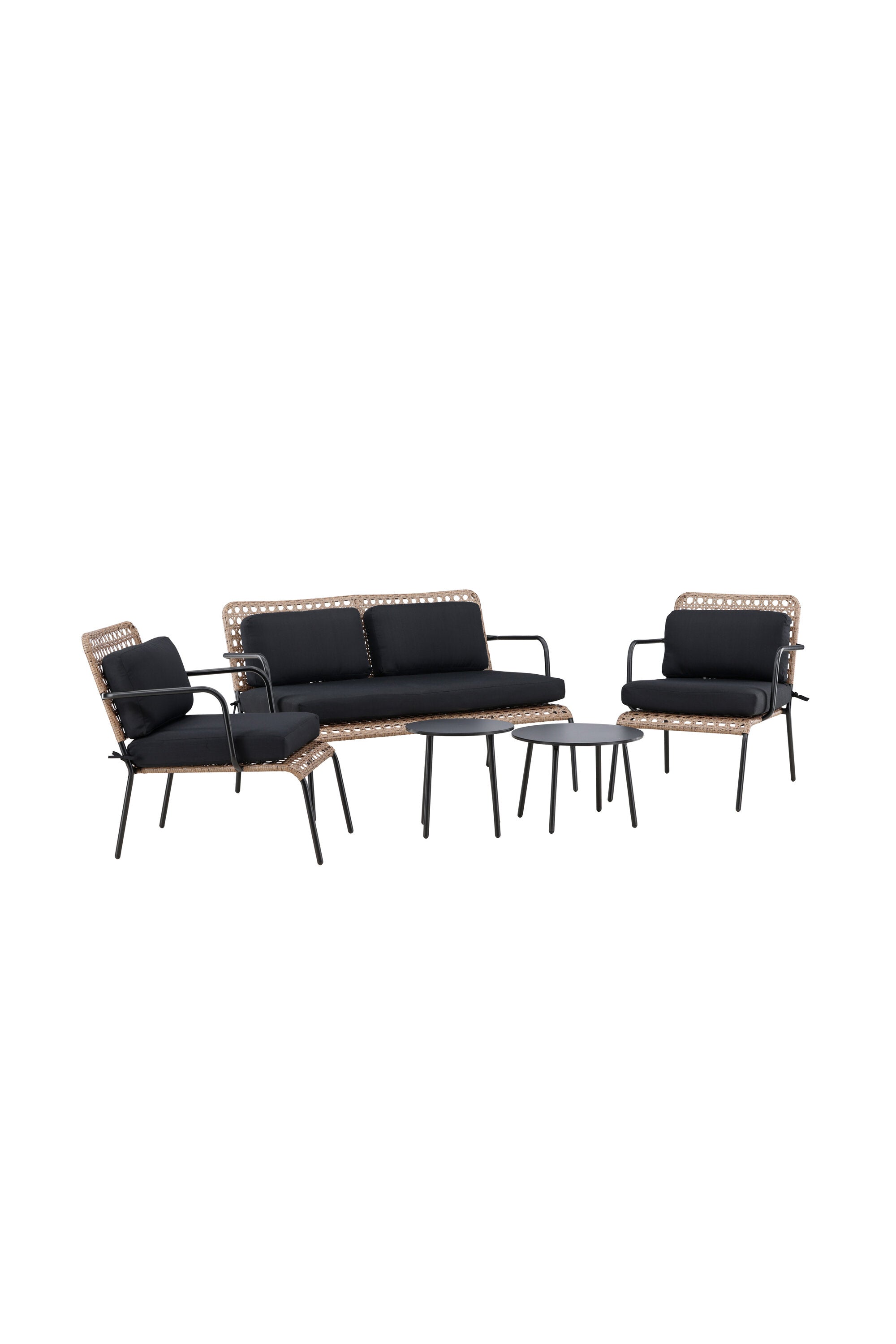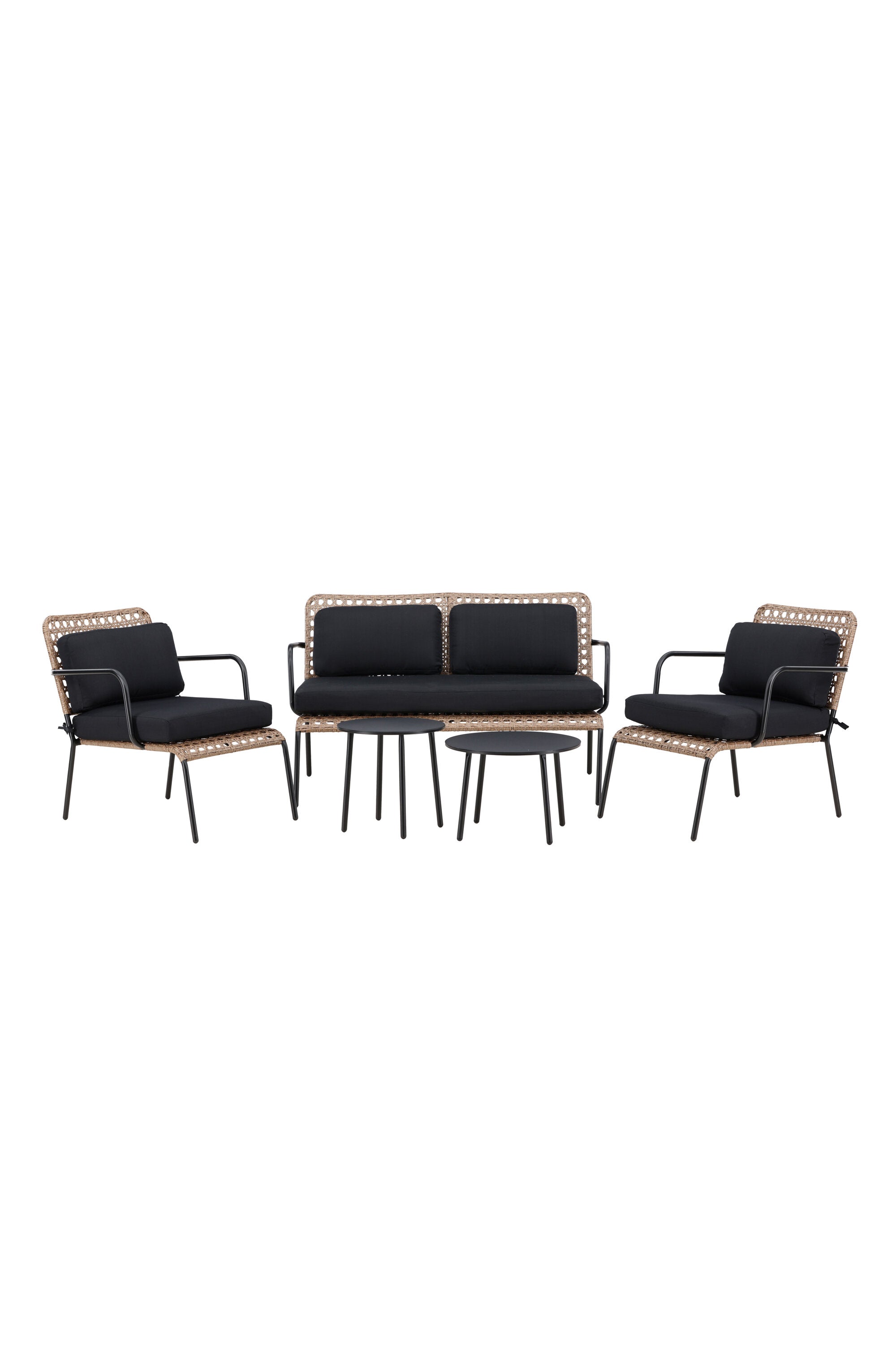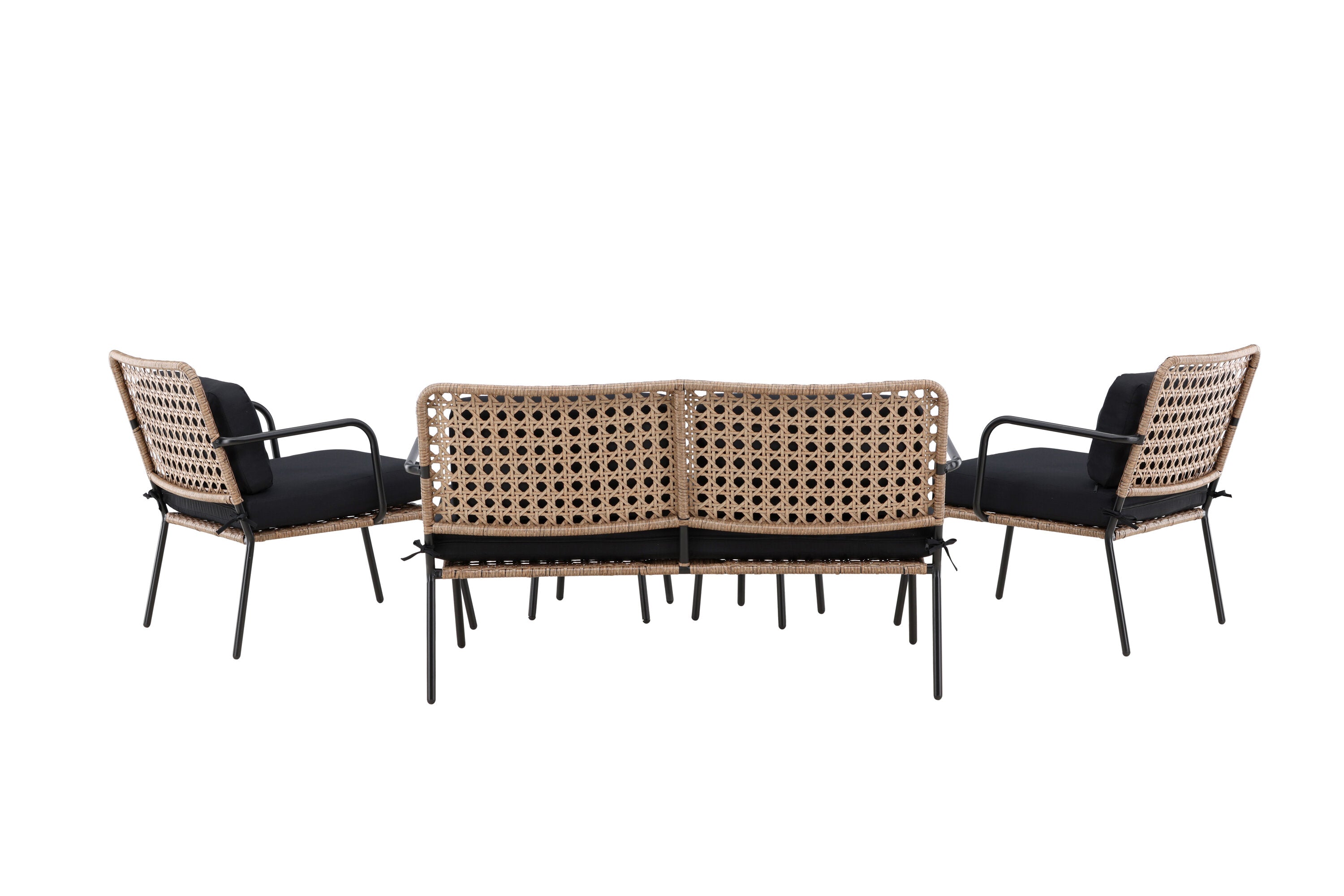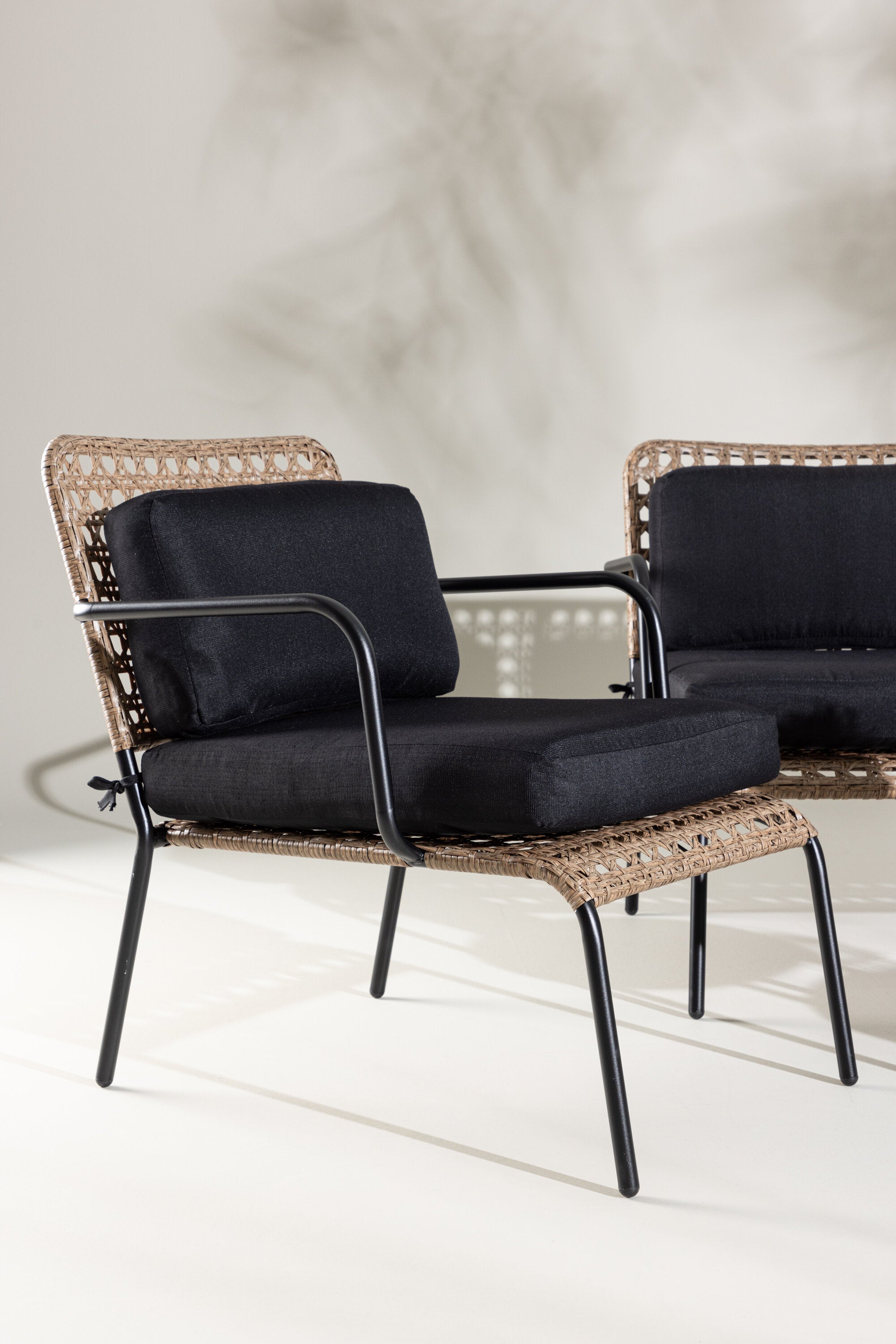 Moderní skupina pohovek se zaměřením na pohodlí, která se perfektně hodí na zasklenou terasu. Sestava nábytku se skládá z dvoumístné pohovky, dvou rámových křesel z černého práškově lakovaného kovu a opěradla a sedáku je navrženo v úhledném vzoru přírodního ratanu. Nábytková skupina je dodávána s černými polštáři a kulatými černými stolky ve dvou částech. Přírodní materiál dodává každému jednotlivému kusu nábytku jedinečný charakter a jeho vzor přitáhne oči. Je vyžadována lehčí montáž.