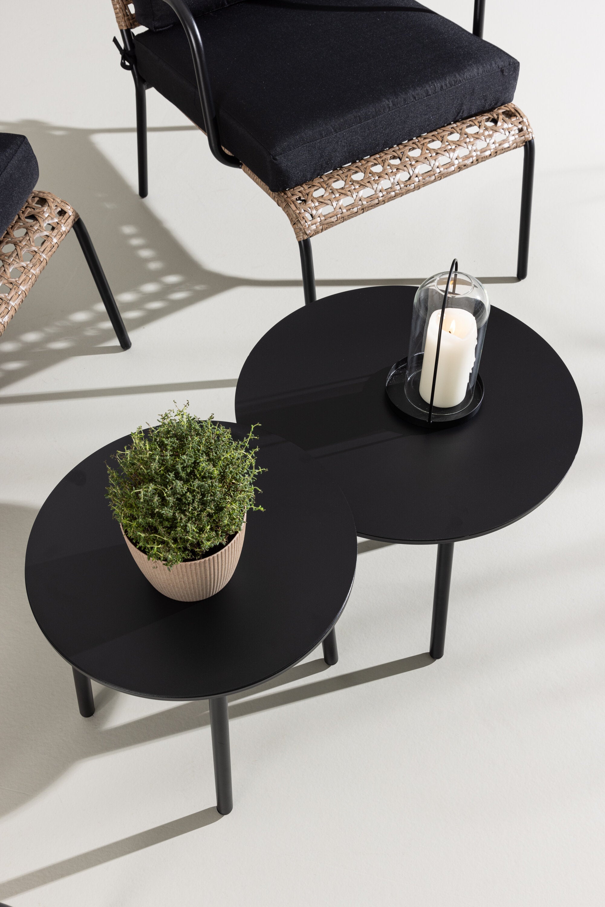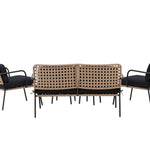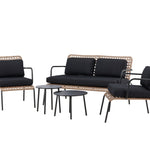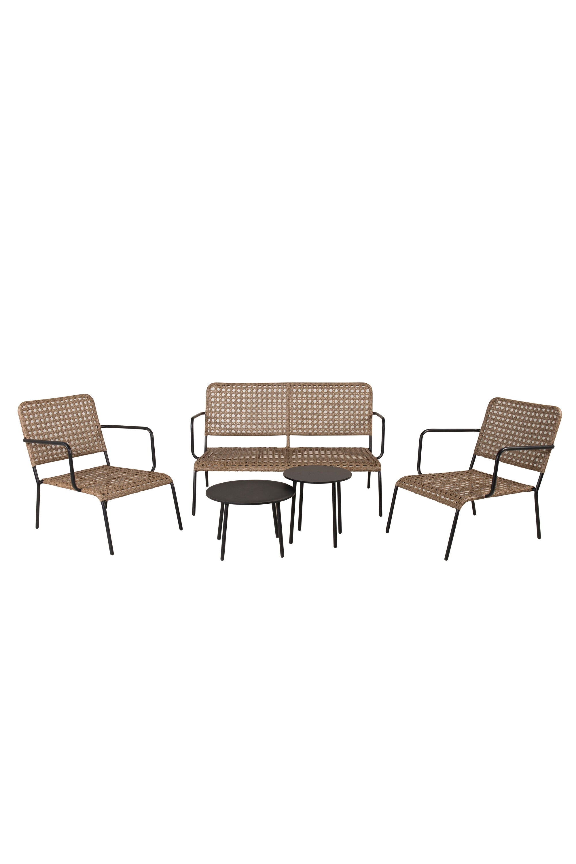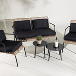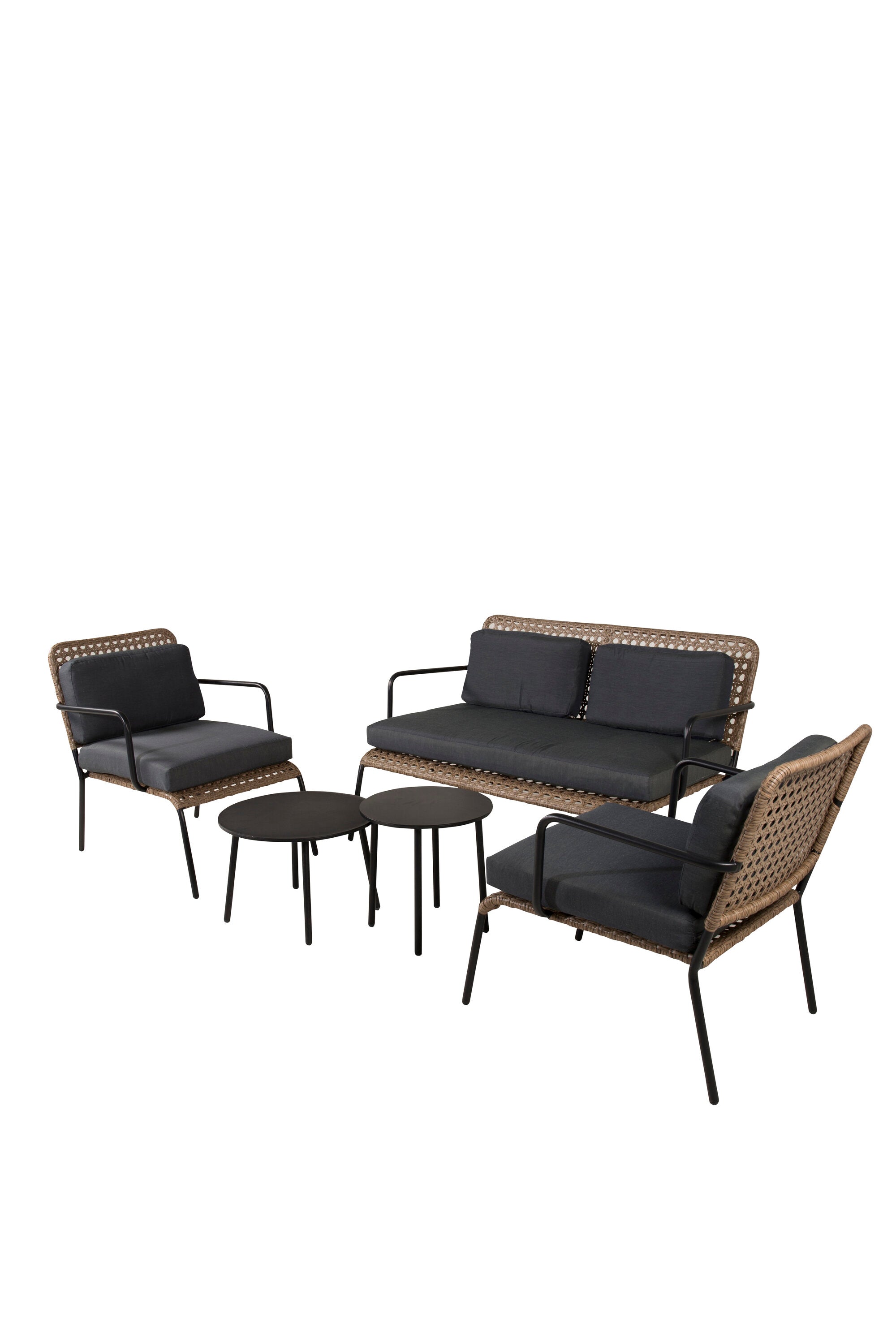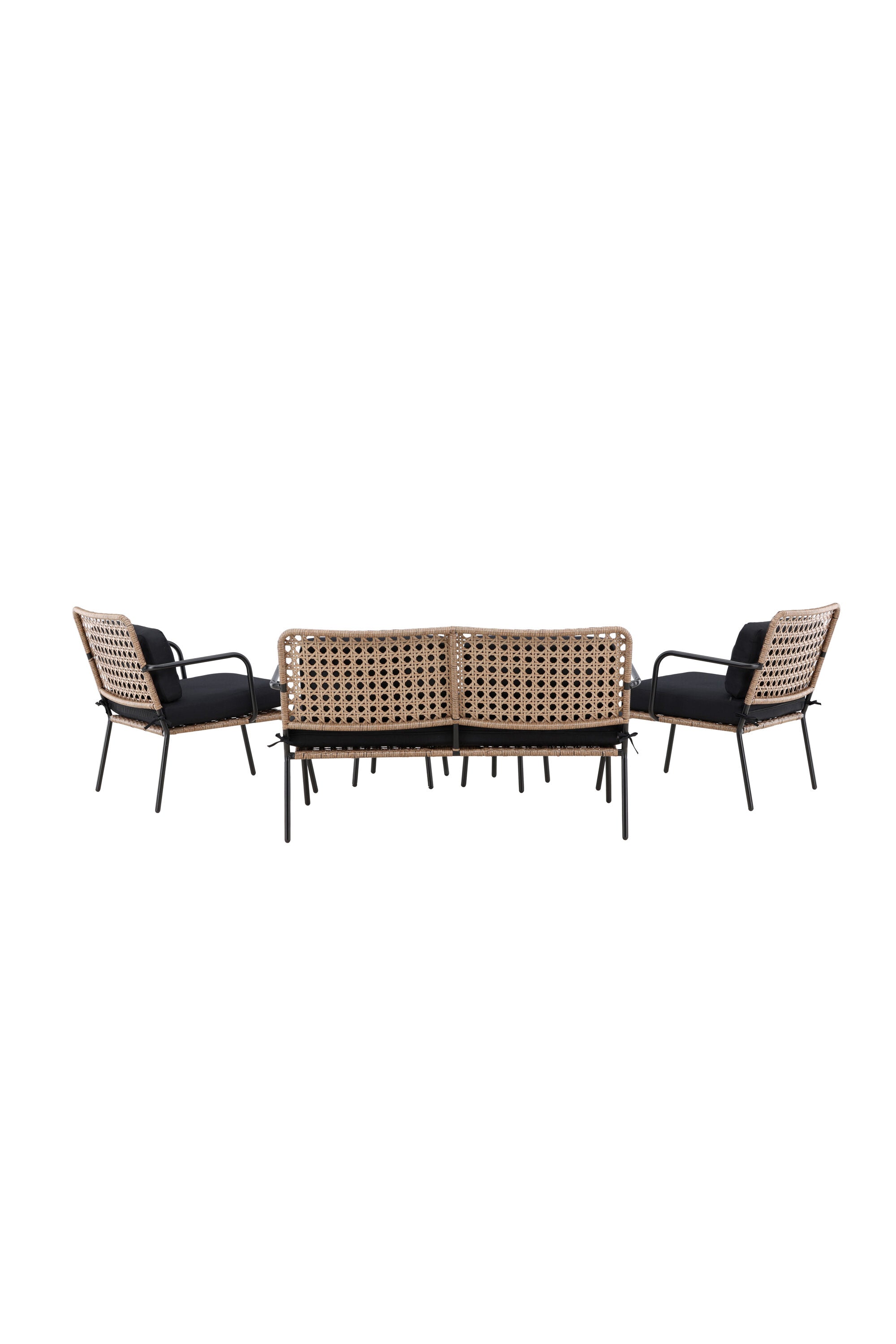 Moderní skupina pohovek se zaměřením na pohodlí, která se perfektně hodí na zasklenou terasu. Sestava nábytku se skládá z dvoumístné pohovky, dvou rámových křesel z černého práškově lakovaného kovu a opěradla a sedáku je navrženo v úhledném vzoru přírodního ratanu. Nábytková skupina je dodávána s černými polštáři a kulatými černými stolky ve dvou částech. Přírodní materiál dodává každému jednotlivému kusu nábytku jedinečný charakter a jeho vzor přitáhne oči. Je vyžadována lehčí montáž.