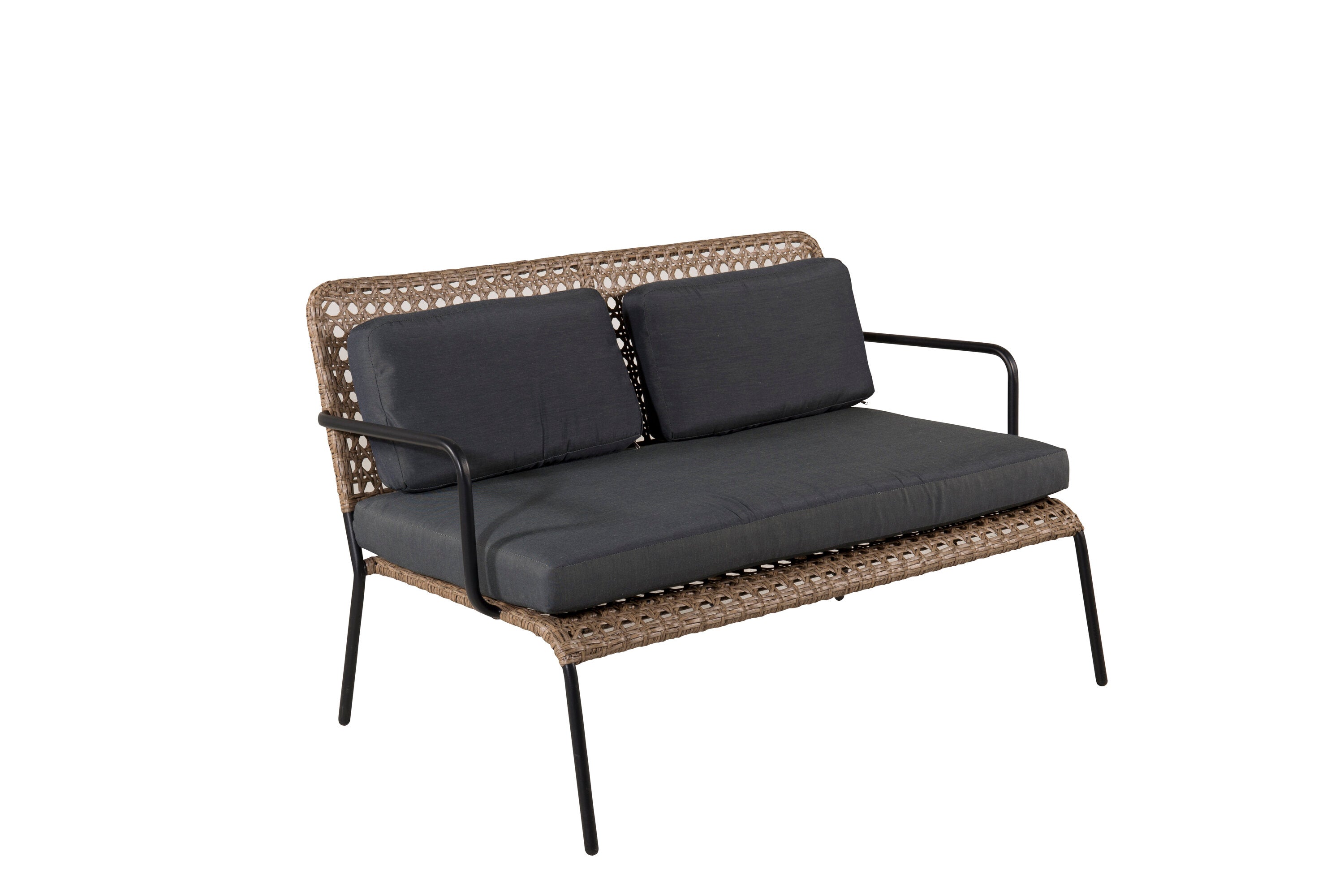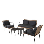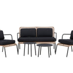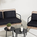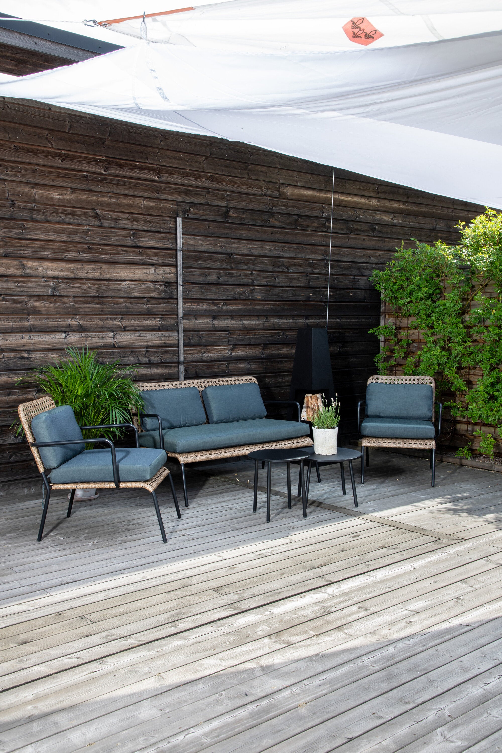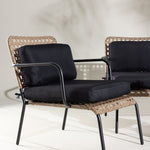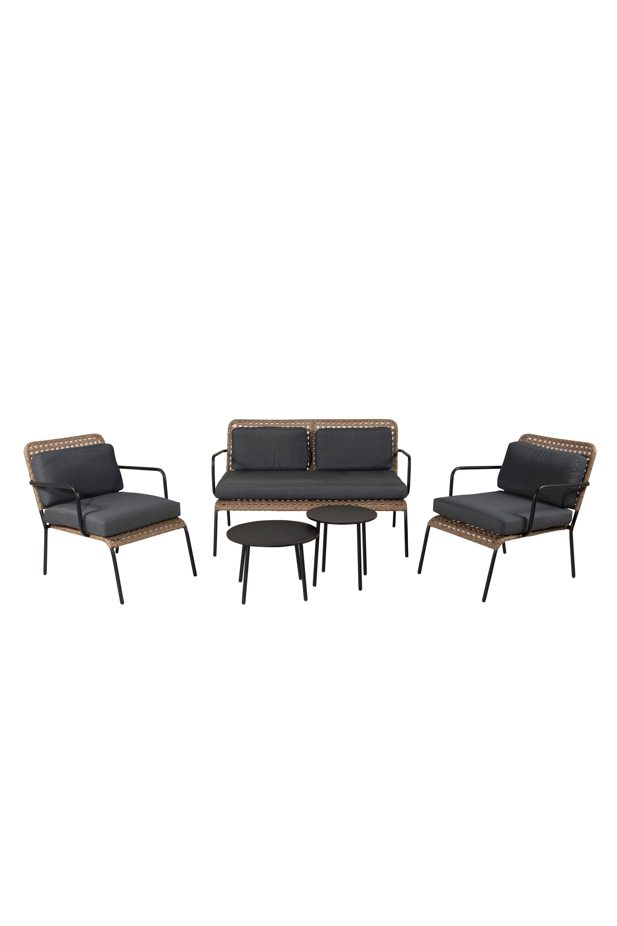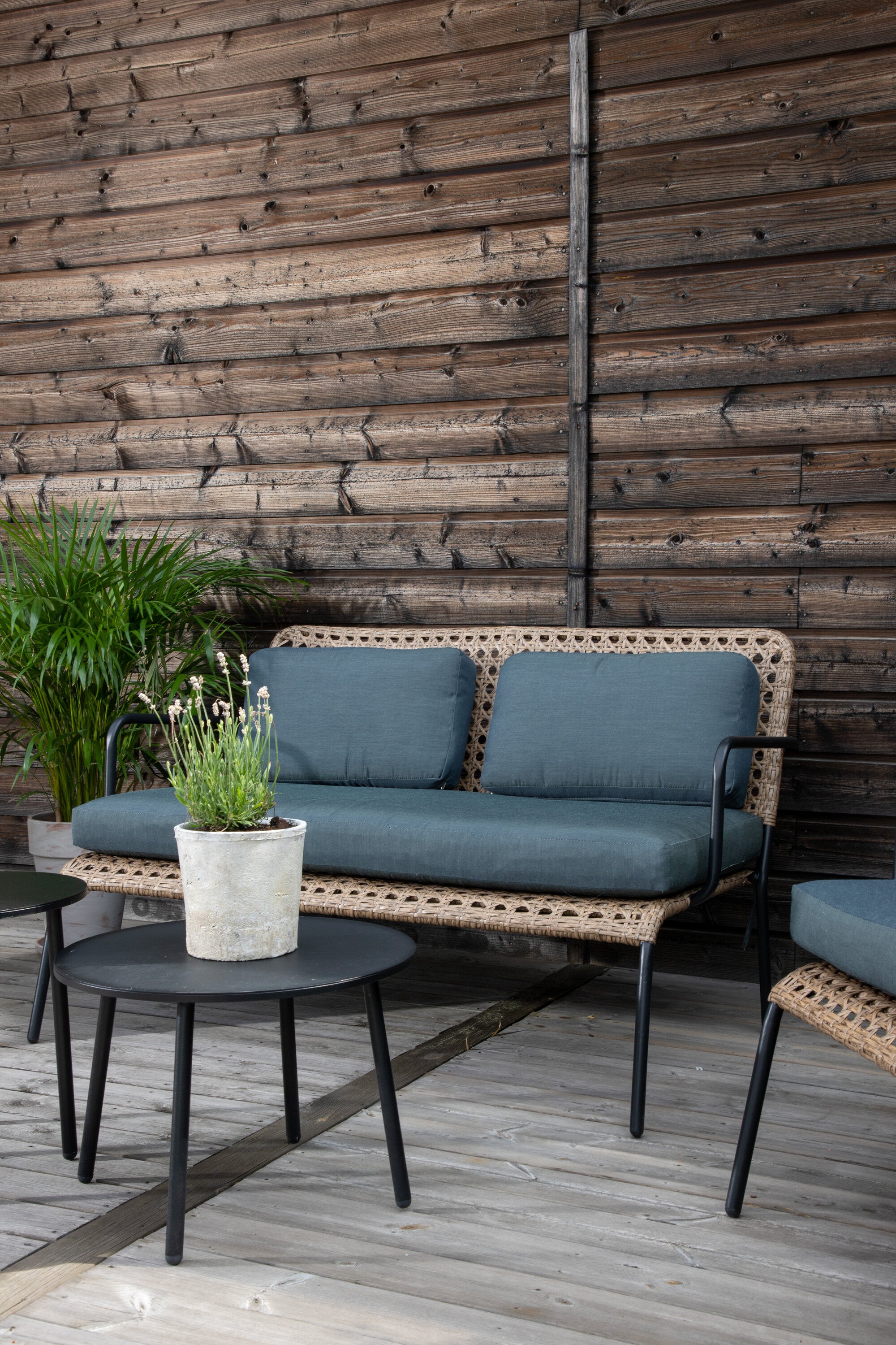 Moderní skupina pohovek se zaměřením na pohodlí, která se perfektně hodí na zasklenou terasu. Sestava nábytku se skládá z dvoumístné pohovky, dvou rámových křesel z černého práškově lakovaného kovu a opěradla a sedáku je navrženo v úhledném vzoru přírodního ratanu. Nábytková skupina je dodávána s černými polštáři a kulatými černými stolky ve dvou částech. Přírodní materiál dodává každému jednotlivému kusu nábytku jedinečný charakter a jeho vzor přitáhne oči. Je vyžadována lehčí montáž.