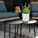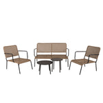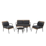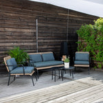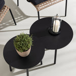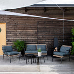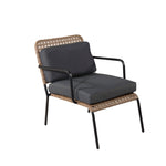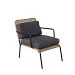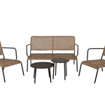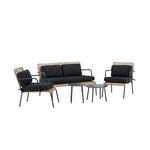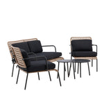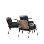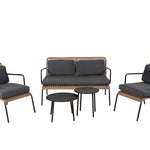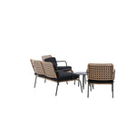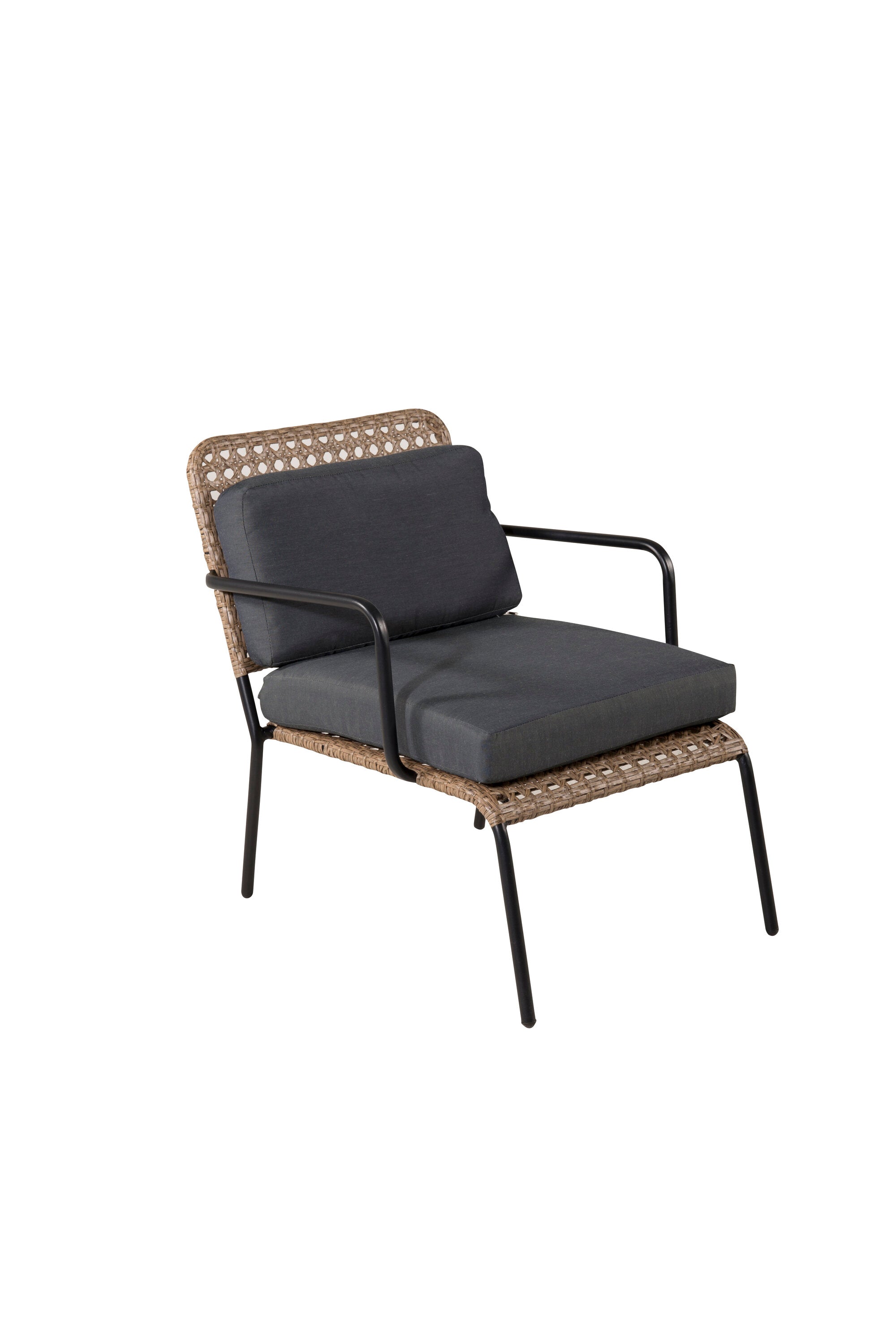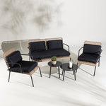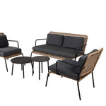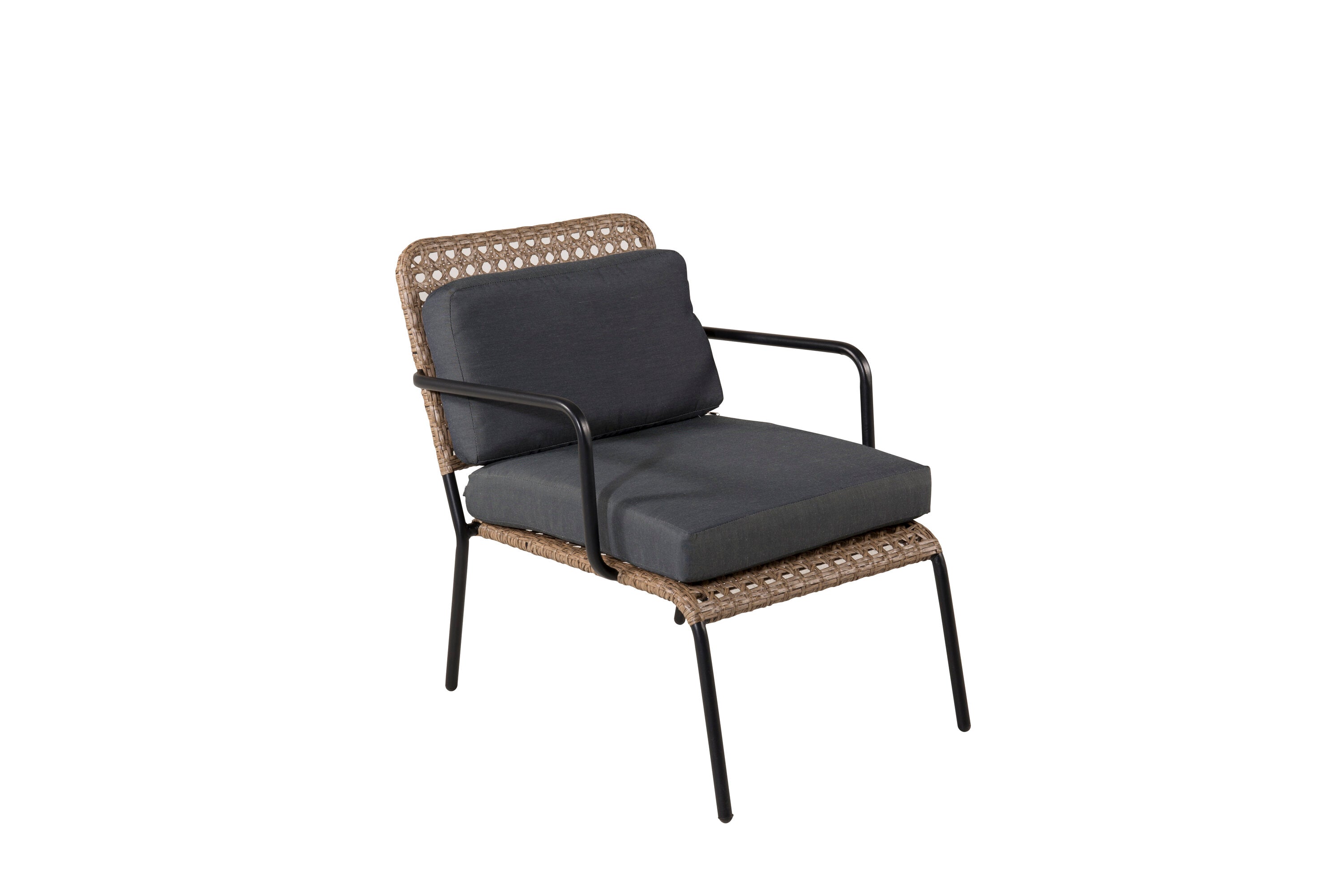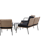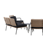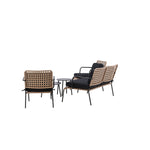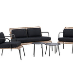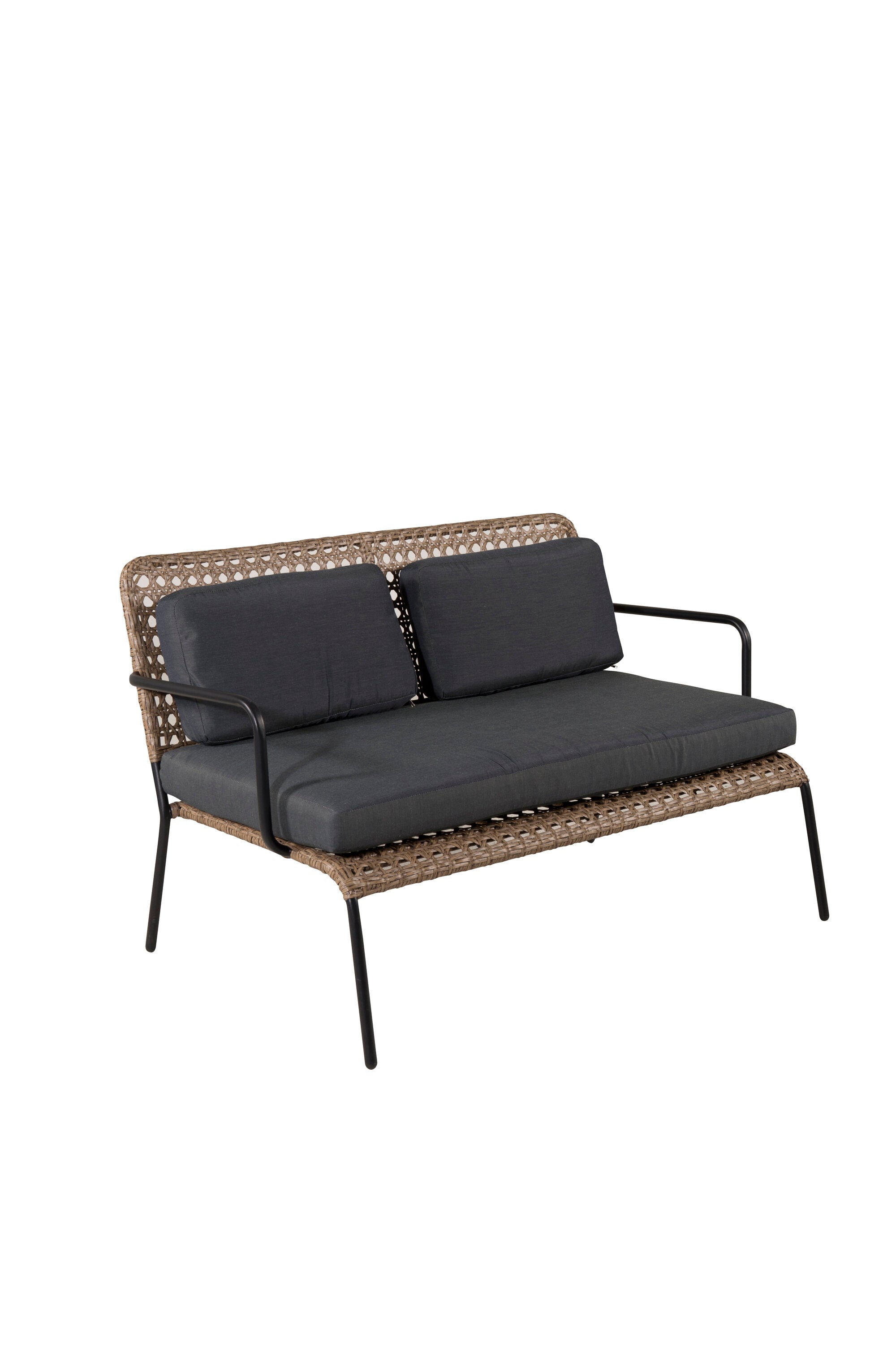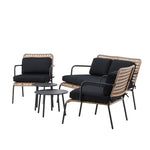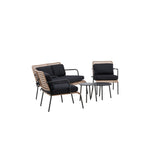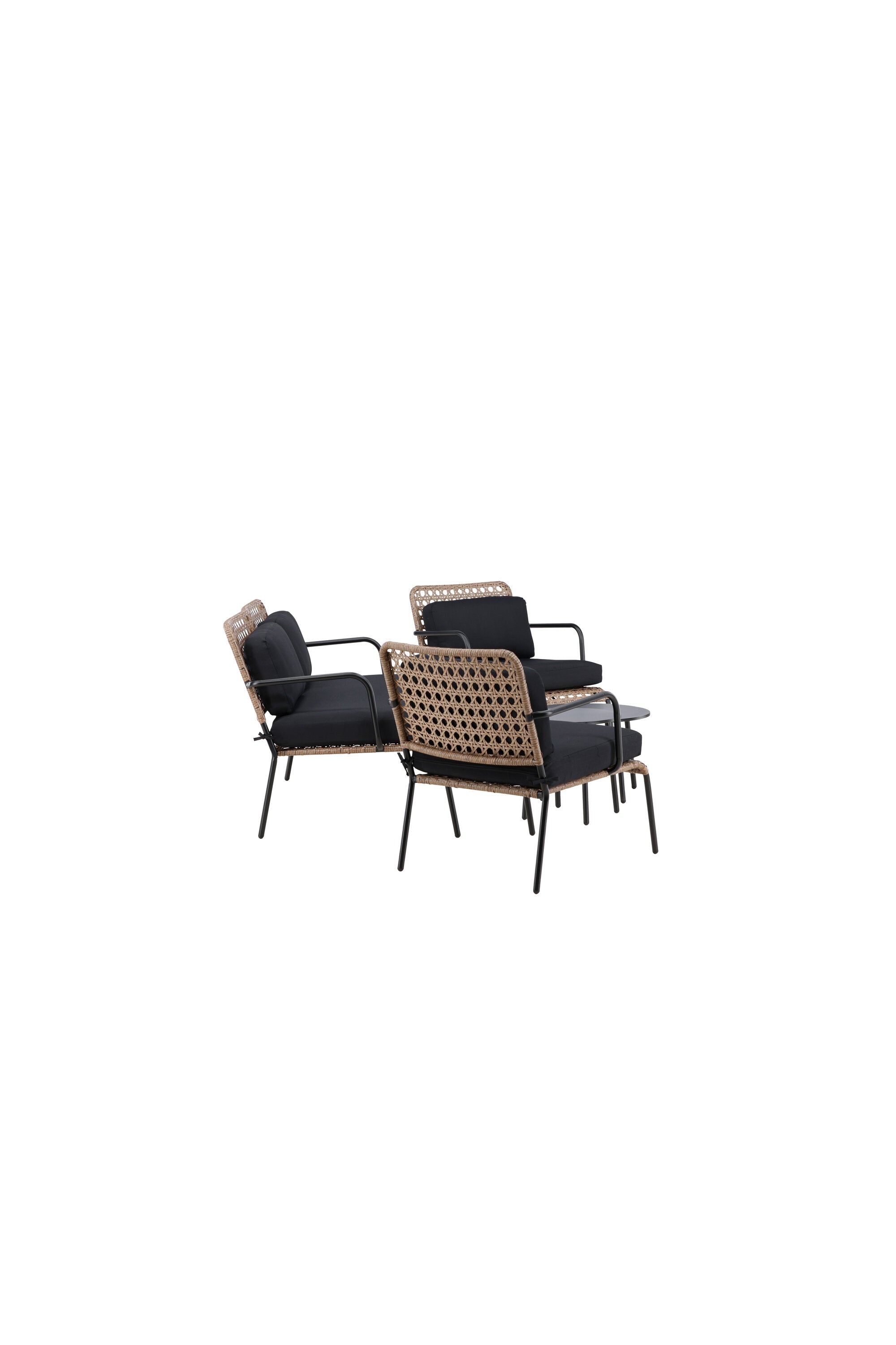 Moderní skupina pohovek se zaměřením na pohodlí, která se perfektně hodí na zasklenou terasu. Sestava nábytku se skládá z dvoumístné pohovky, dvou rámových křesel z černého práškově lakovaného kovu a opěradla a sedáku je navrženo v úhledném vzoru přírodního ratanu. Nábytková skupina je dodávána s černými polštáři a kulatými černými stolky ve dvou částech. Přírodní materiál dodává každému jednotlivému kusu nábytku jedinečný charakter a jeho vzor přitáhne oči. Je vyžadována lehčí montáž.