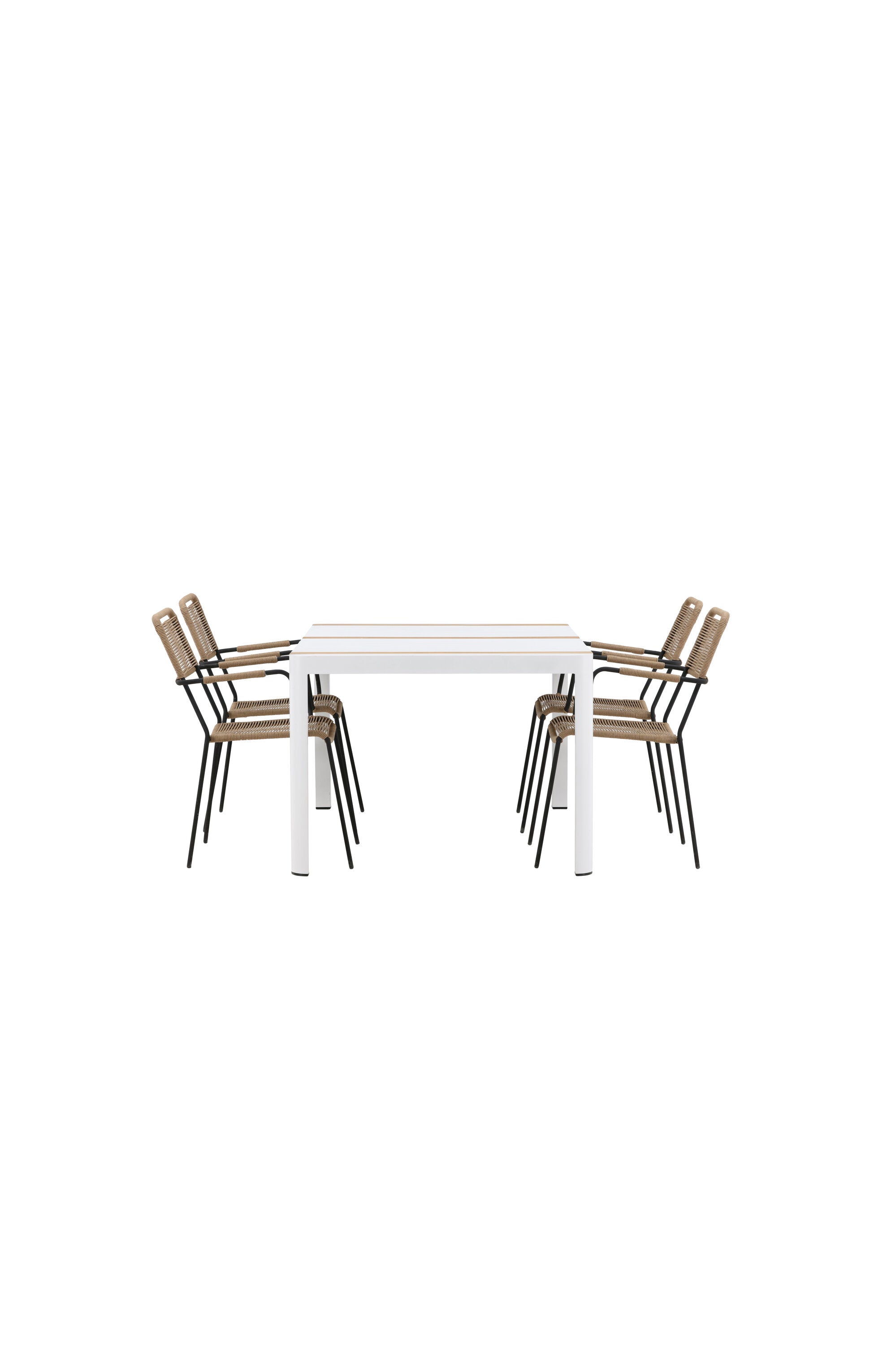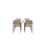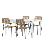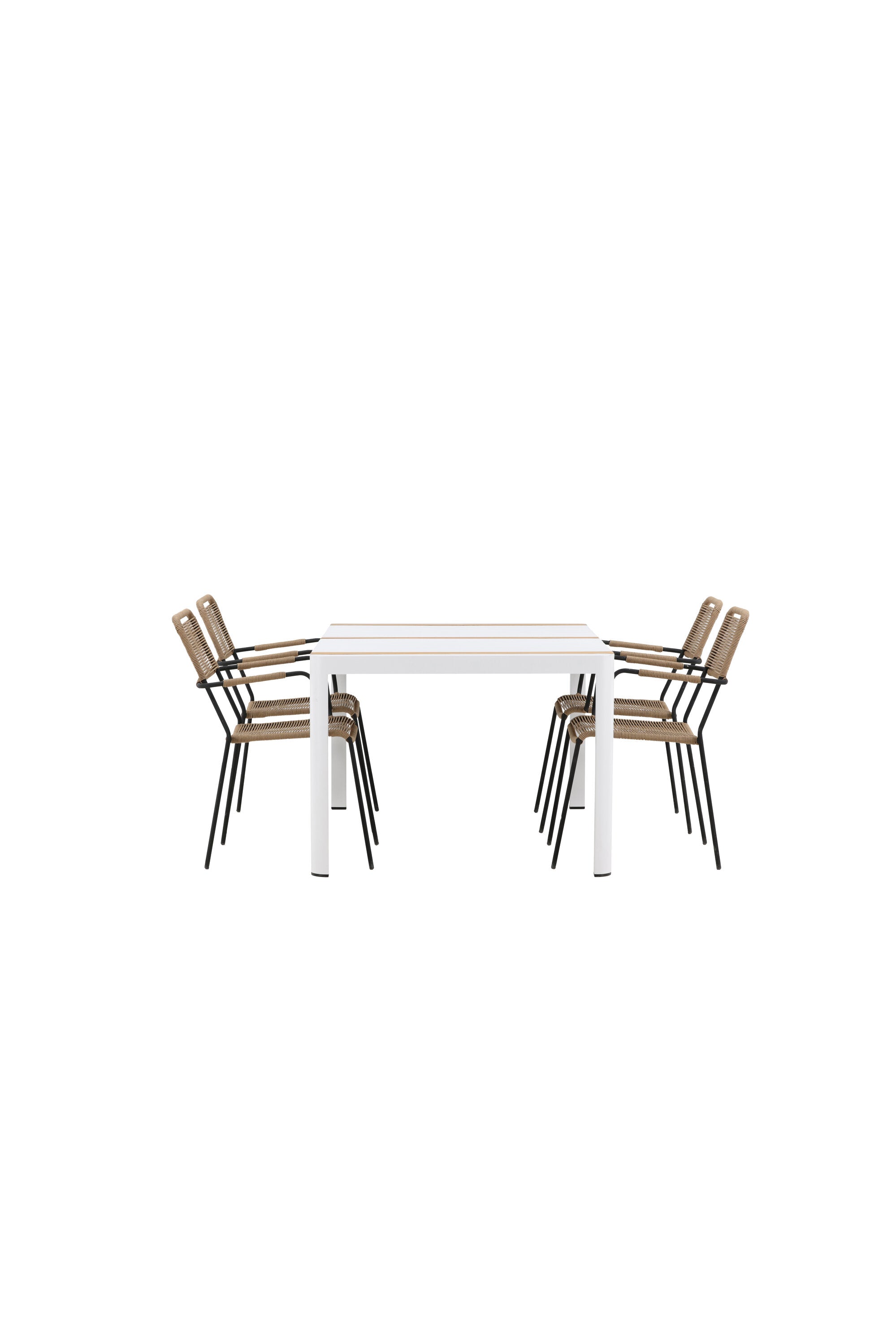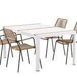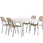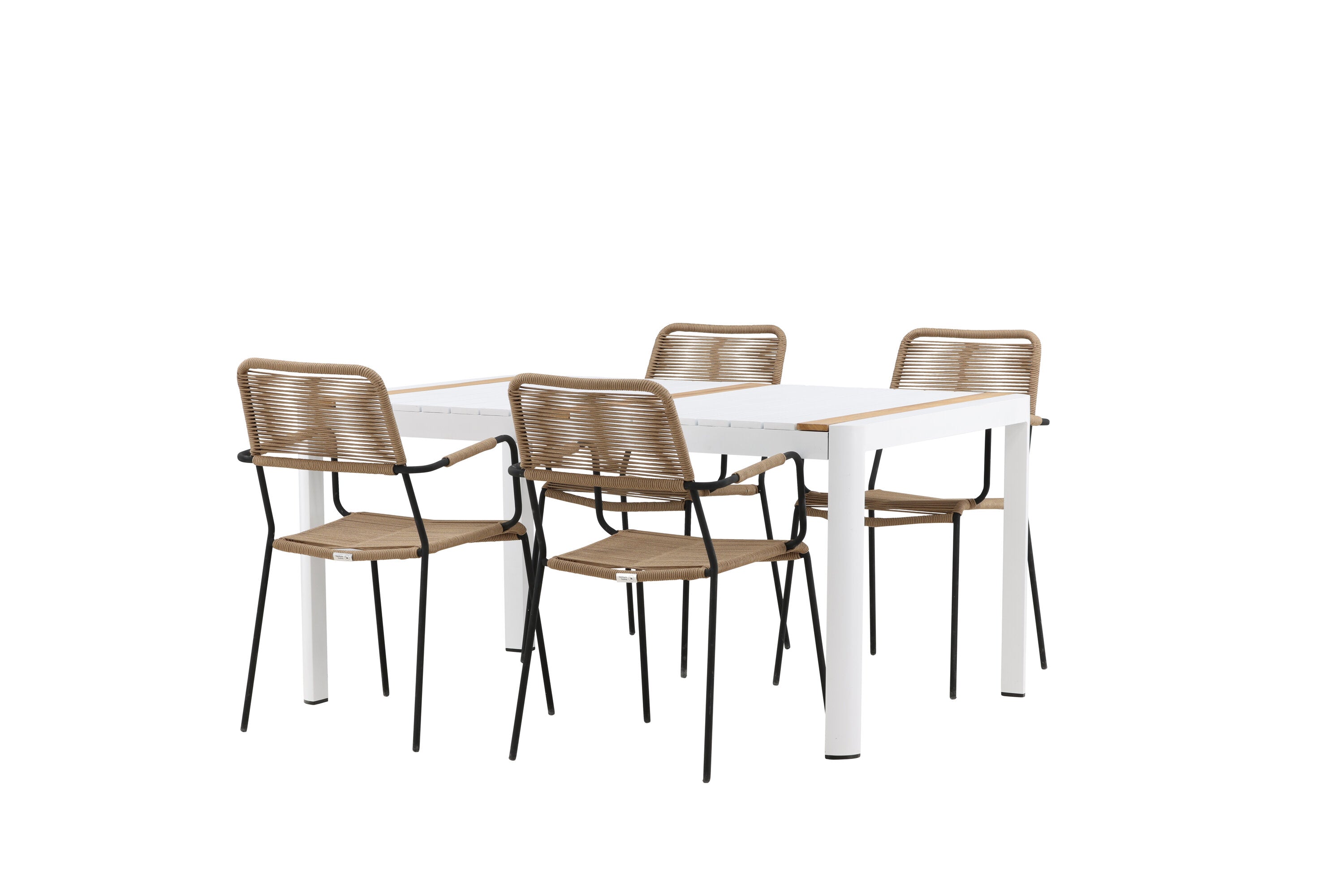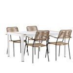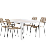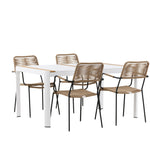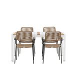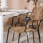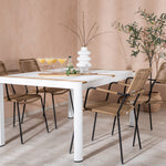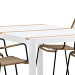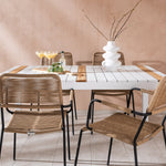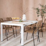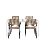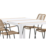 Vytvořte trendový – bezpečný poutač, který zaujme – tato skupina potravin je poutavá i trvanlivá! Jídelní stůl Togo má vkusnou verzi s obdélníkovou deskou stolu v bílé a teakové barvě dřeva a bílým hliníkovým podvozkem. Rozměry: 150 x 100 cm. Zde v moderní kombinaci s jídelními židlemi v barvě latte ze série Lindos. Židle mají stylové úzké nohy z černého hliníku a sedák z odolného béžového provazu. Zemitá barva působí na nábytek hřejivým dojmem. Pozvěte dopředu na mnoho příjemných jídel!