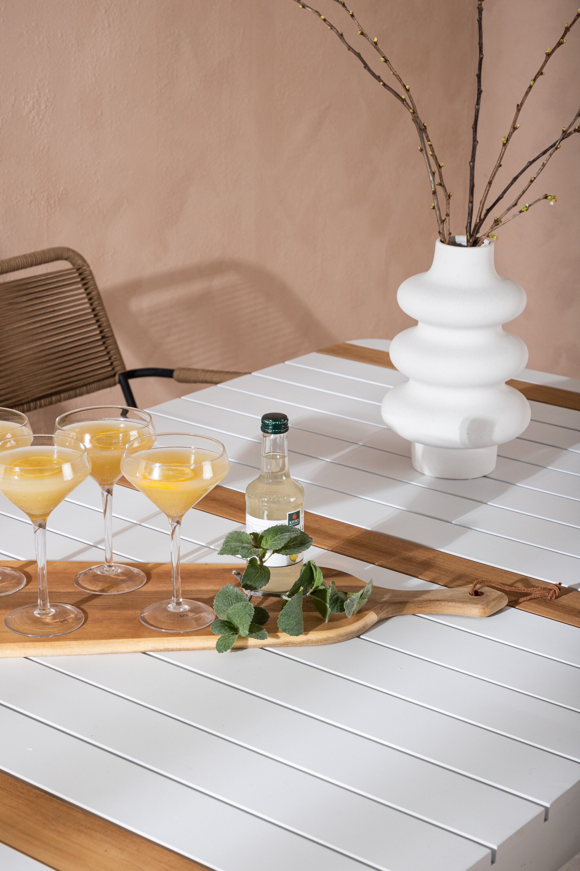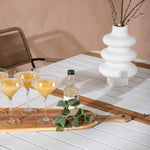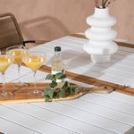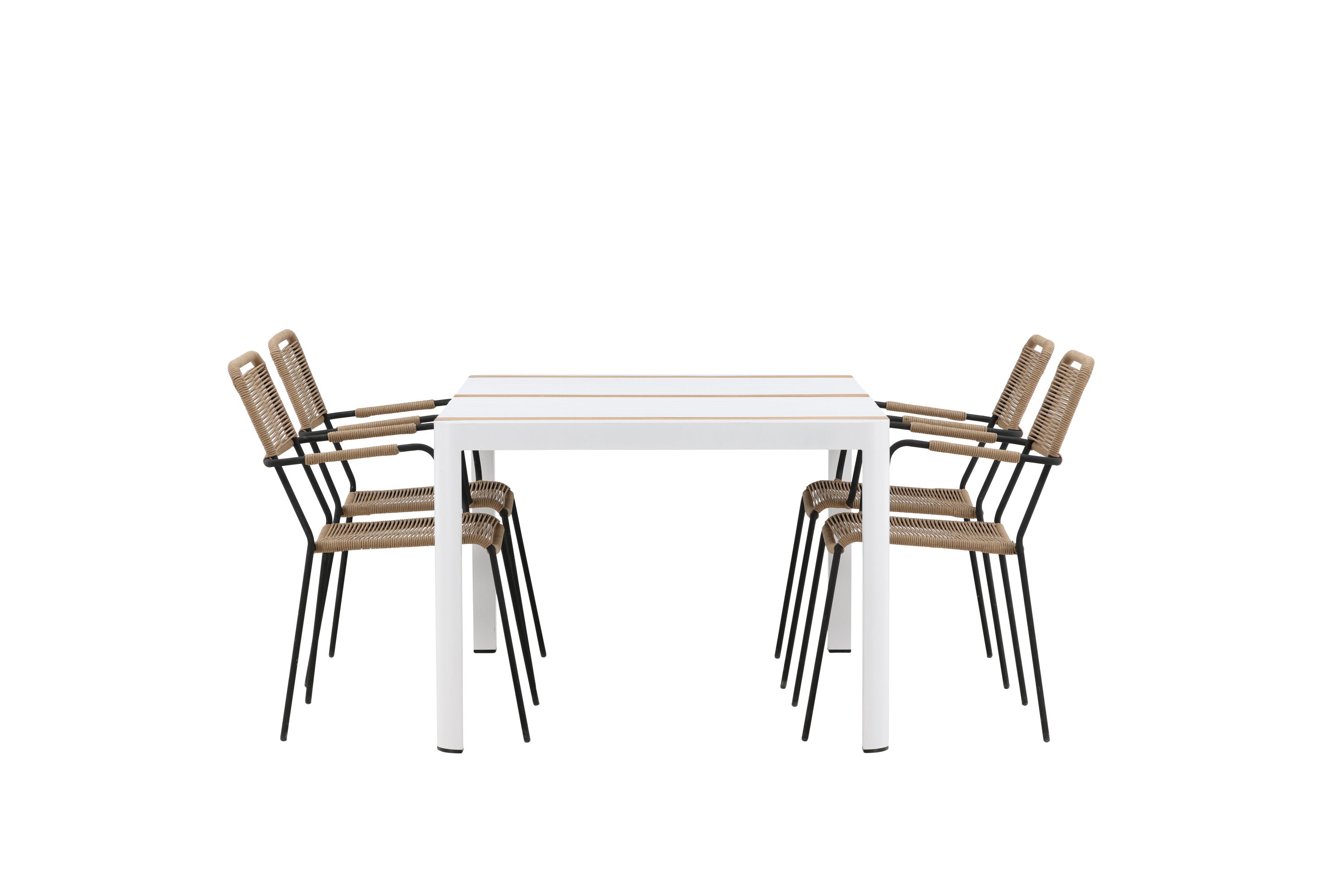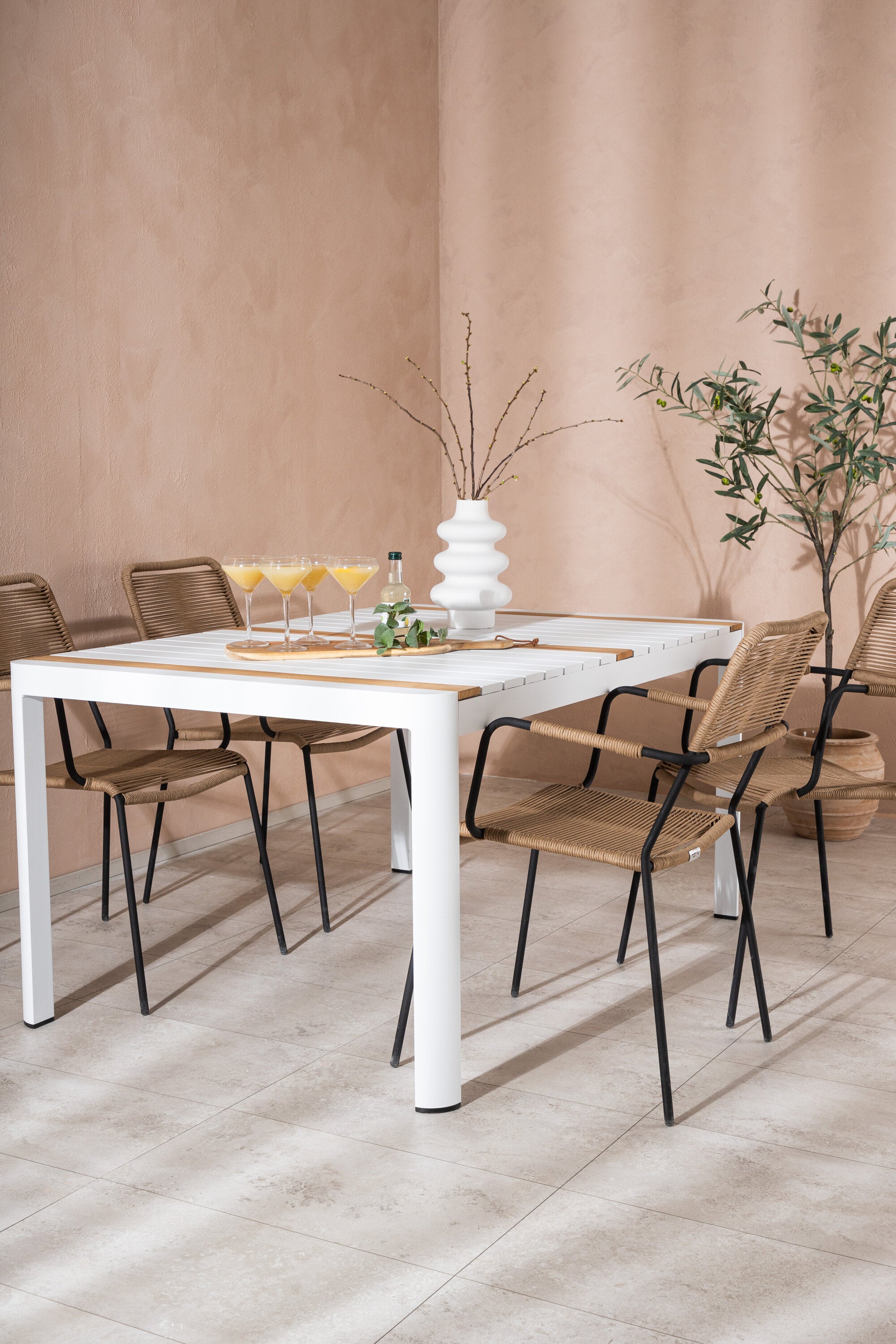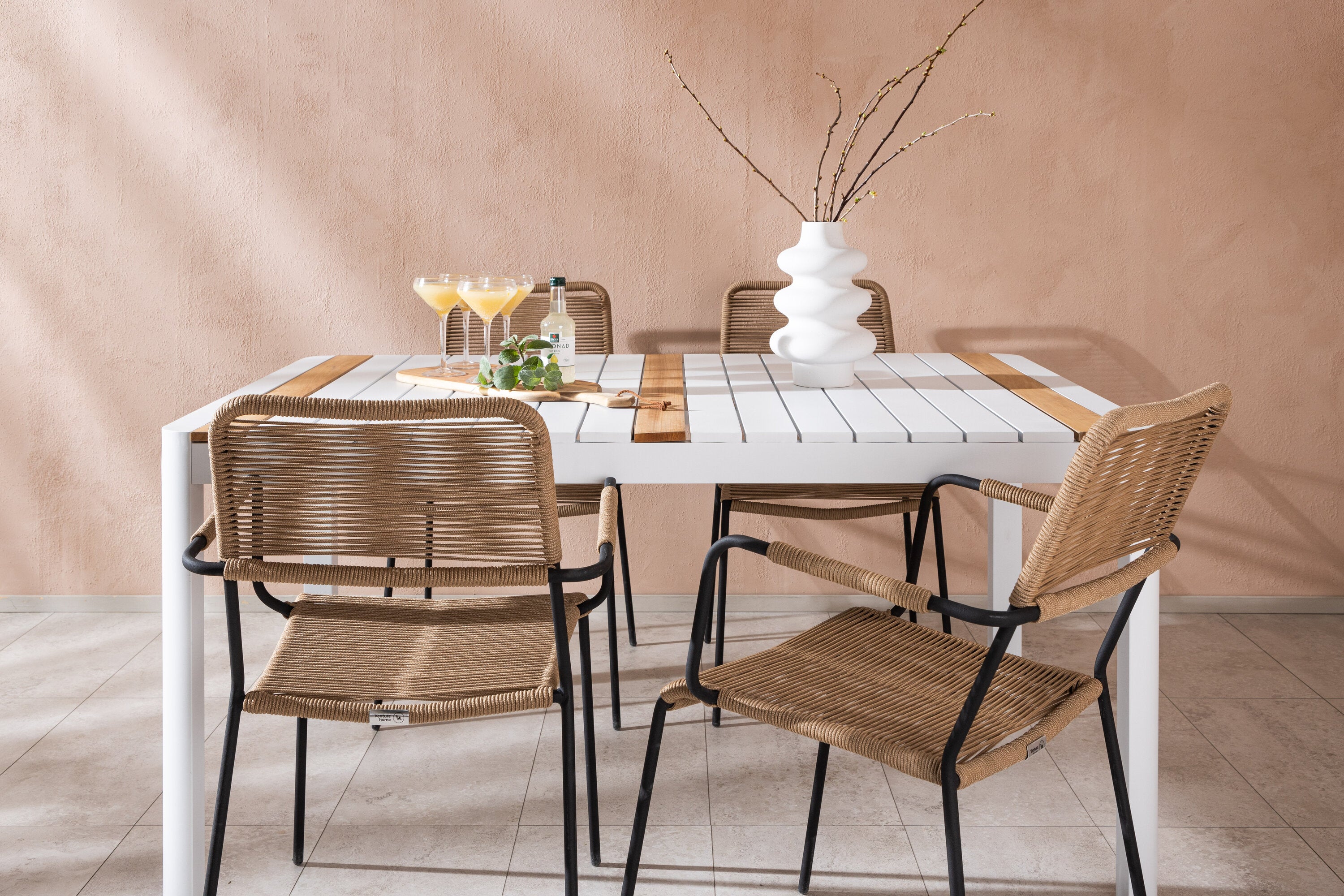 Vytvořte trendový – bezpečný poutač, který zaujme – tato skupina potravin je poutavá i trvanlivá! Jídelní stůl Togo má vkusnou verzi s obdélníkovou deskou stolu v bílé a teakové barvě dřeva a bílým hliníkovým podvozkem. Rozměry: 150 x 100 cm. Zde v moderní kombinaci s jídelními židlemi v barvě latte ze série Lindos. Židle mají stylové úzké nohy z černého hliníku a sedák z odolného béžového provazu. Zemitá barva působí na nábytek hřejivým dojmem. Pozvěte dopředu na mnoho příjemných jídel!