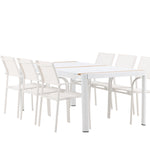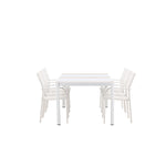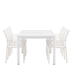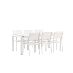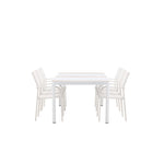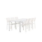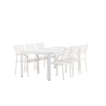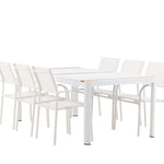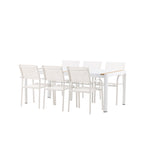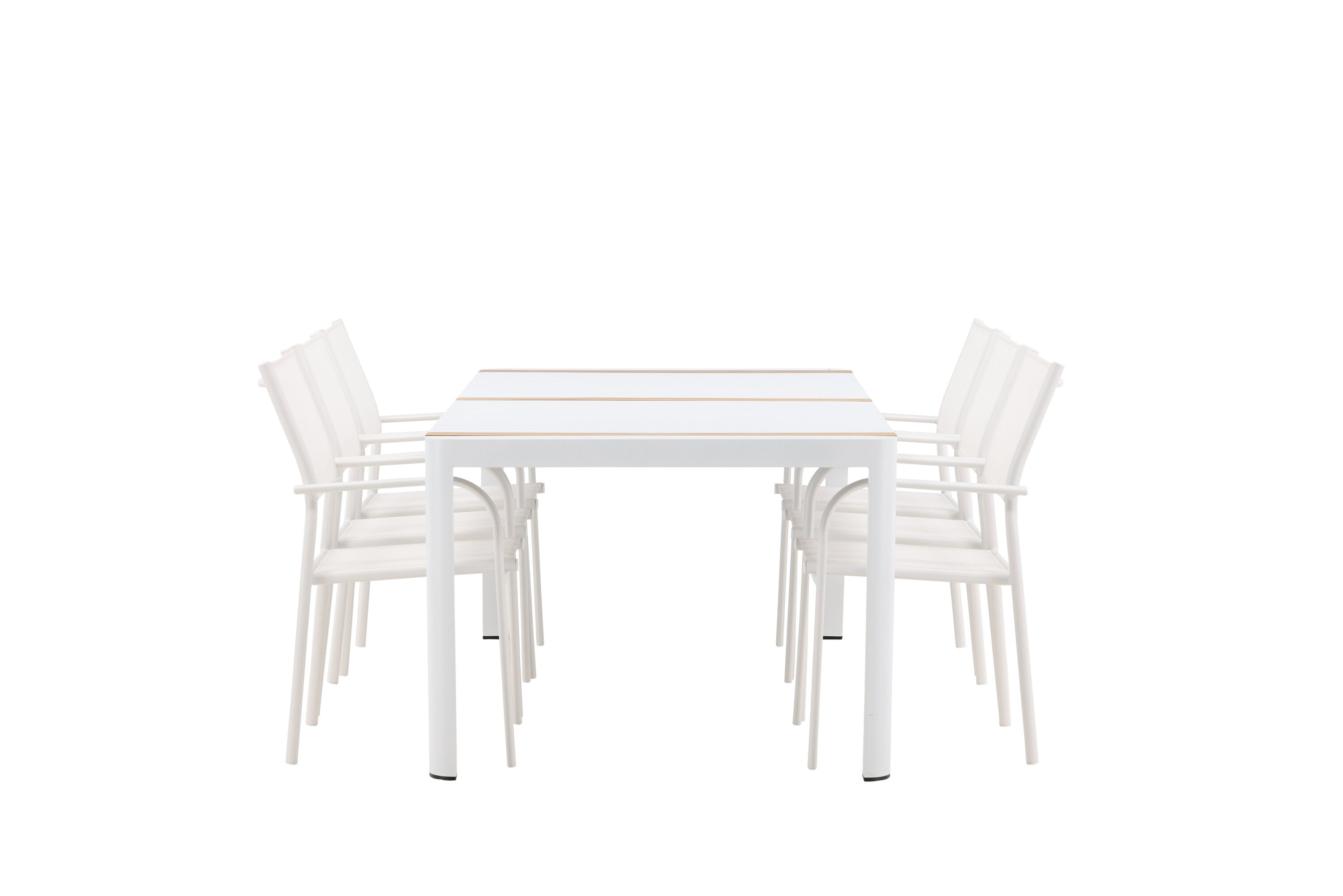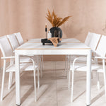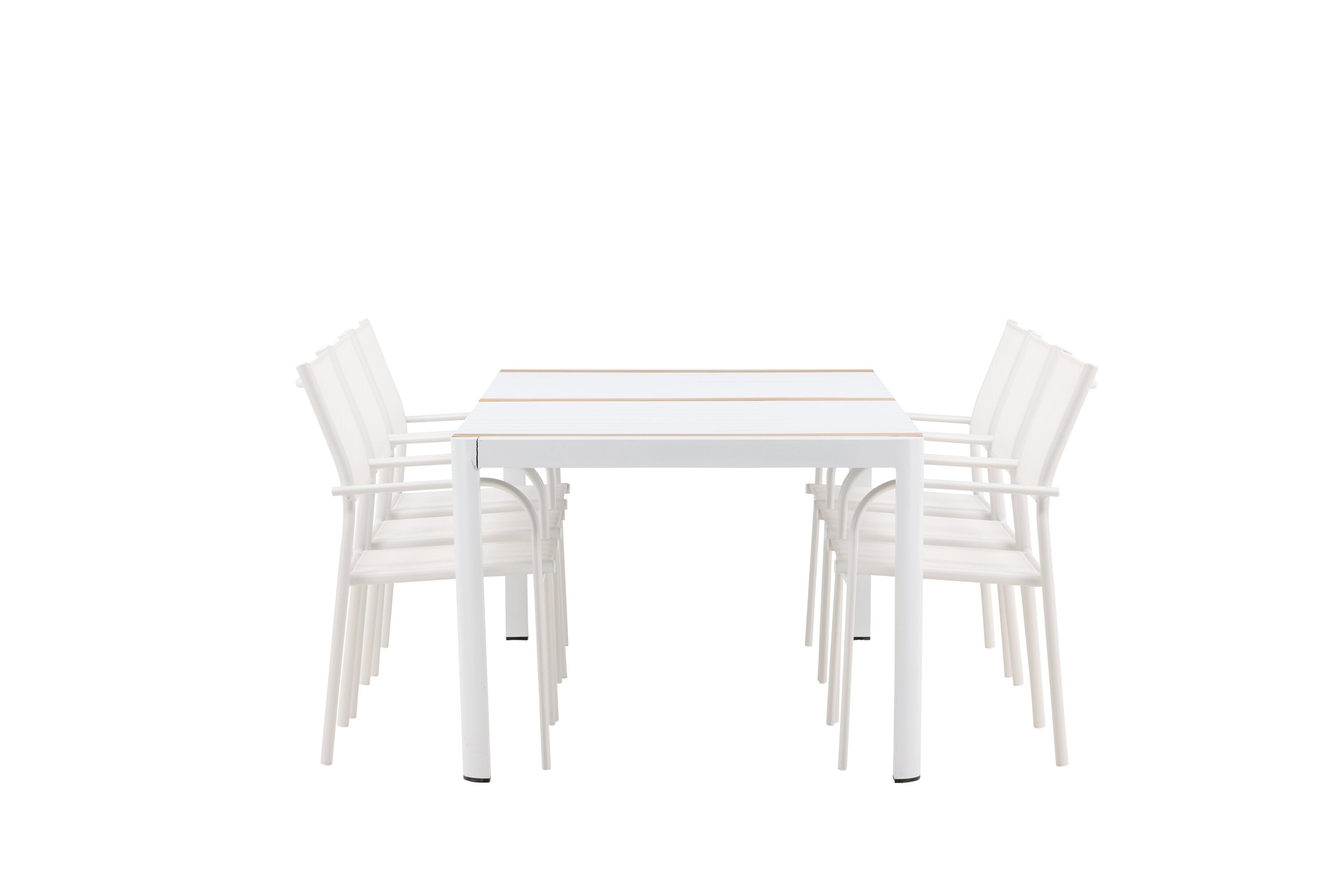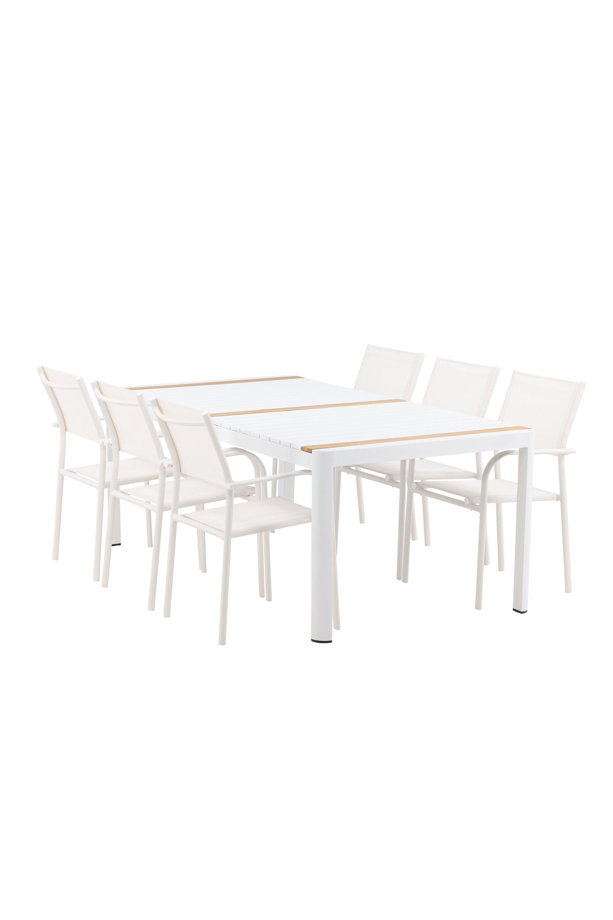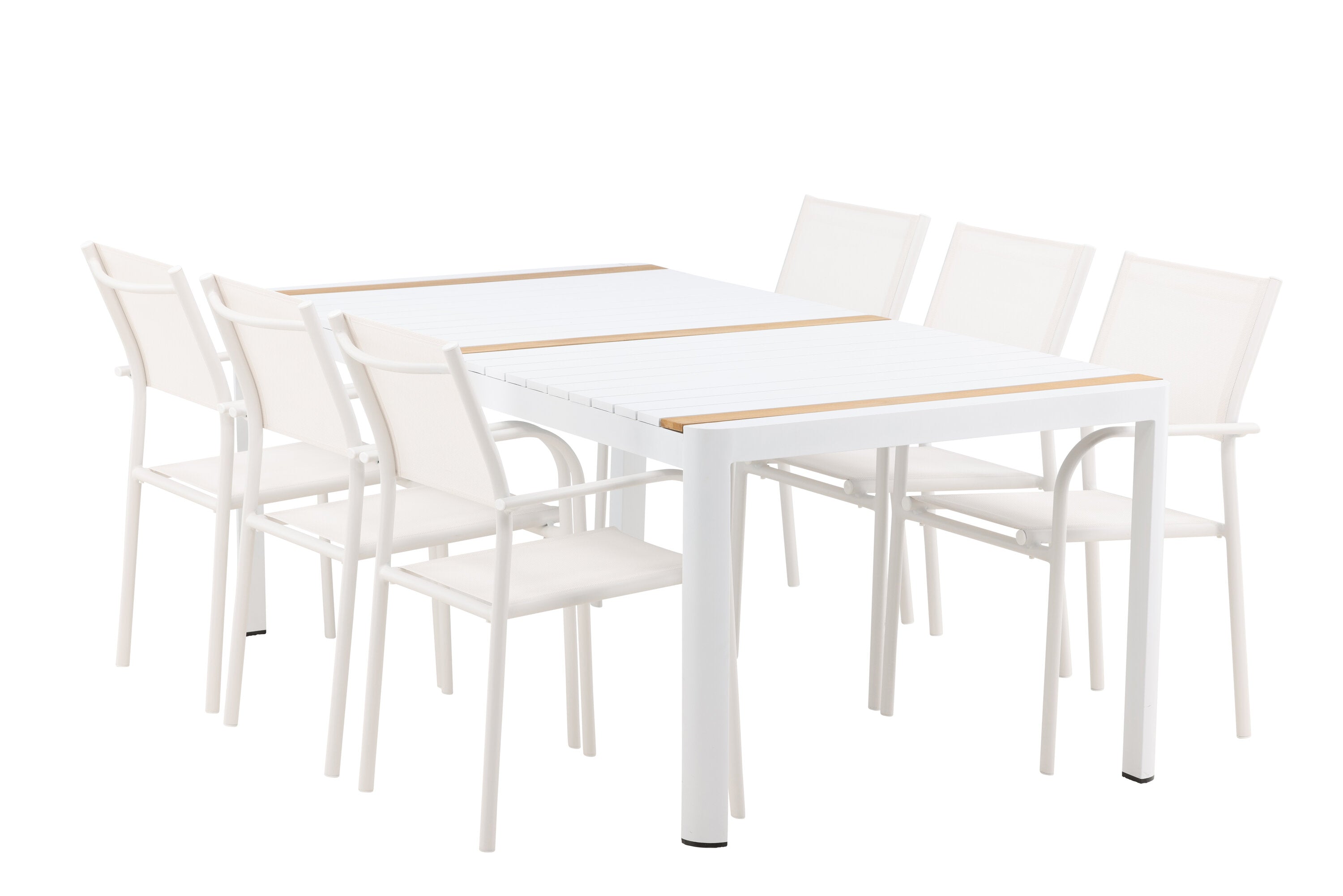 Vybavte si terasu lákavě a okouzlující skupinou jídel, která křičí luxusem! Jídelní stůl Togo má vkusnou verzi s obdélníkovou deskou stolu v bílé a teakové barvě dřeva a bílým hliníkovým podvozkem. Rozměry: 200x100. Zde v kombinaci Smaster s pěknými jídelními židlemi ze série Santorini. Židle mají rovné severské tvary s integrovanými područkami z hliníku a sedákem z bílého textilu. Jsou také stohovatelné pro praktické skladování. Užijte si toto léto jídlo venku!