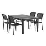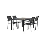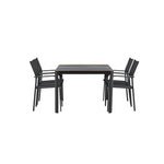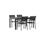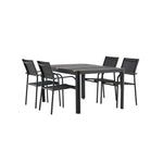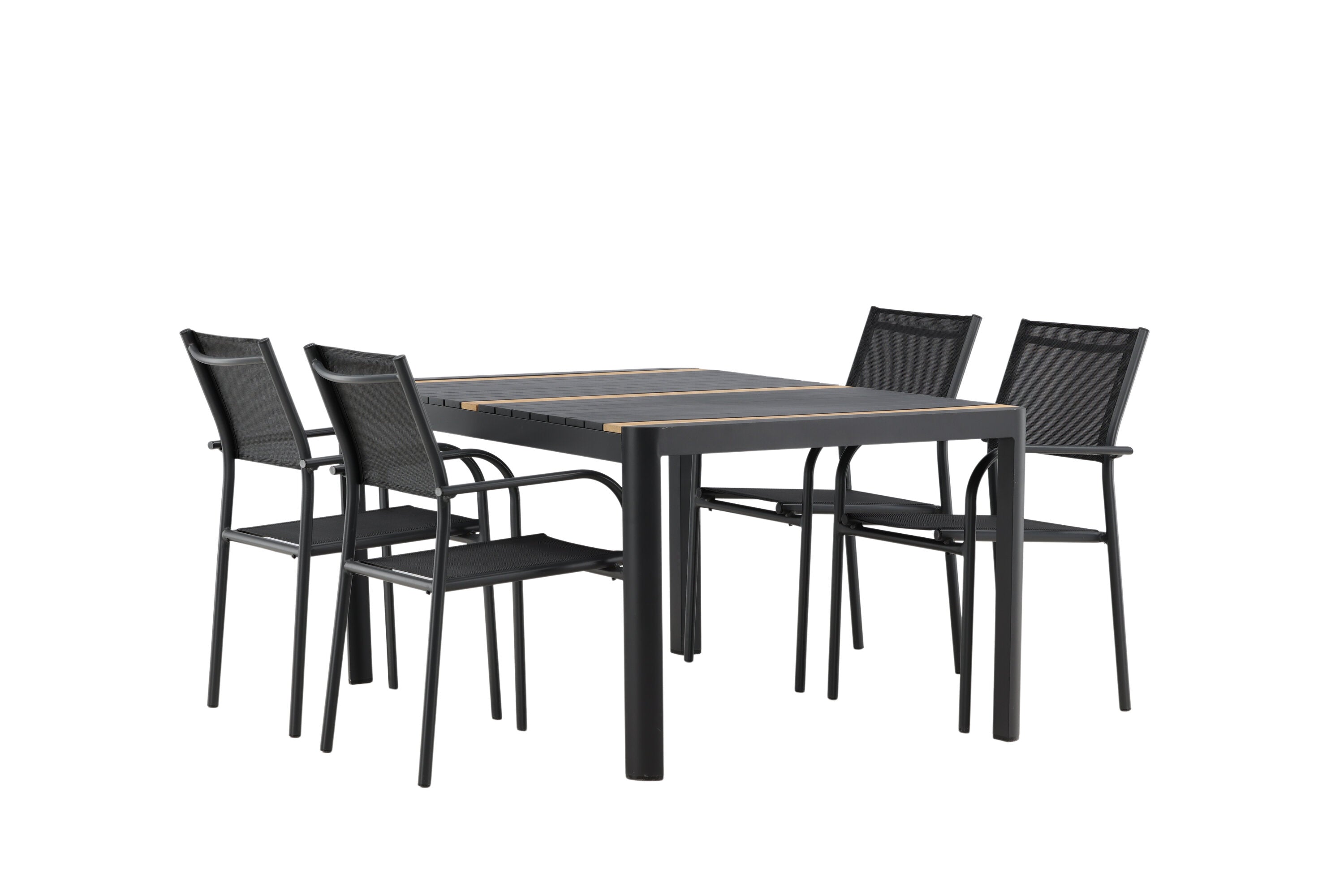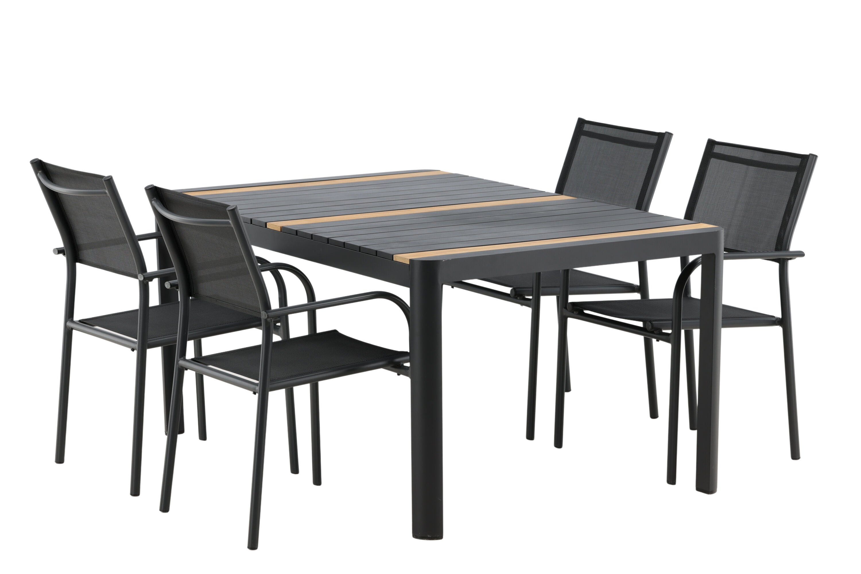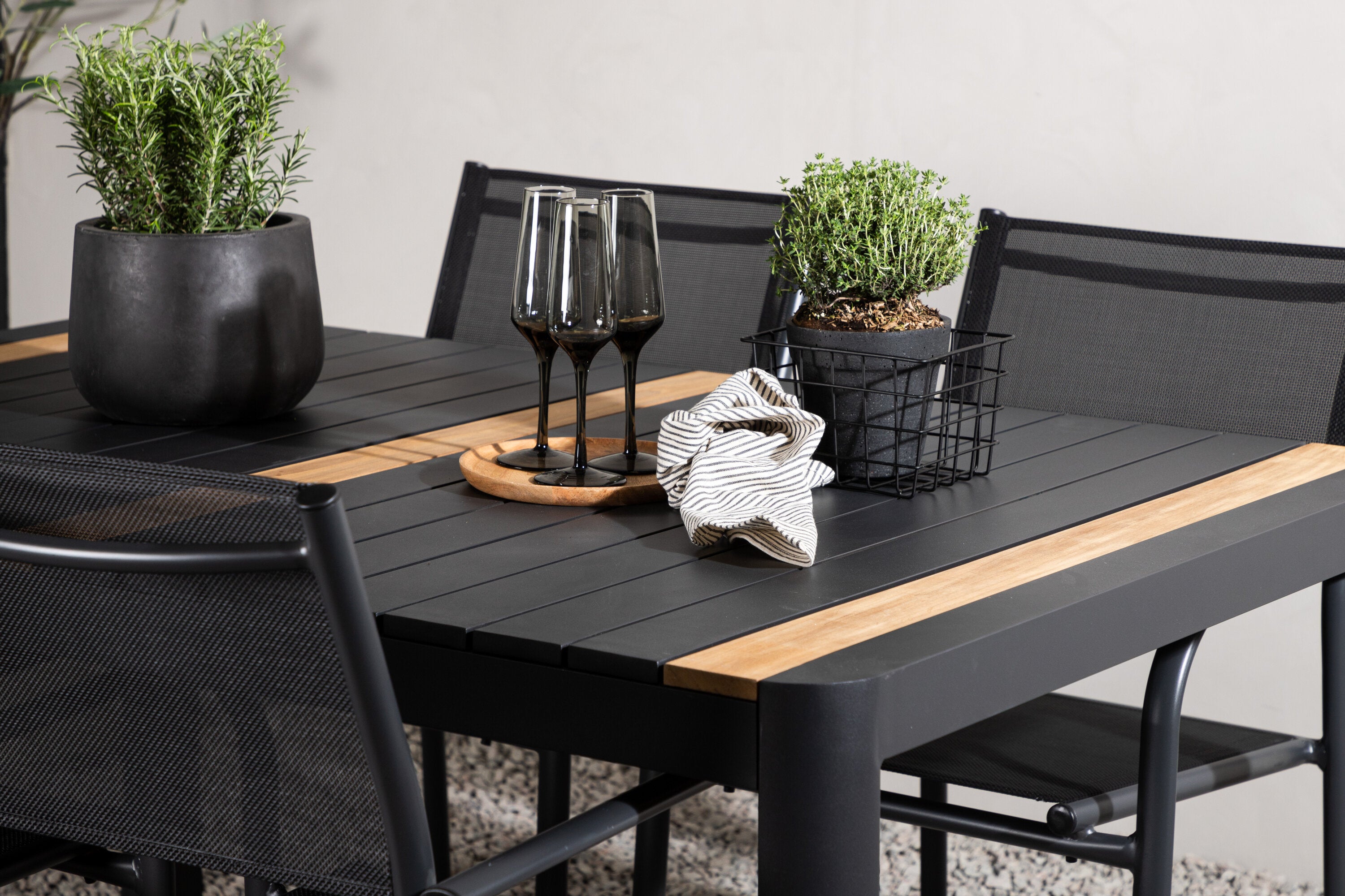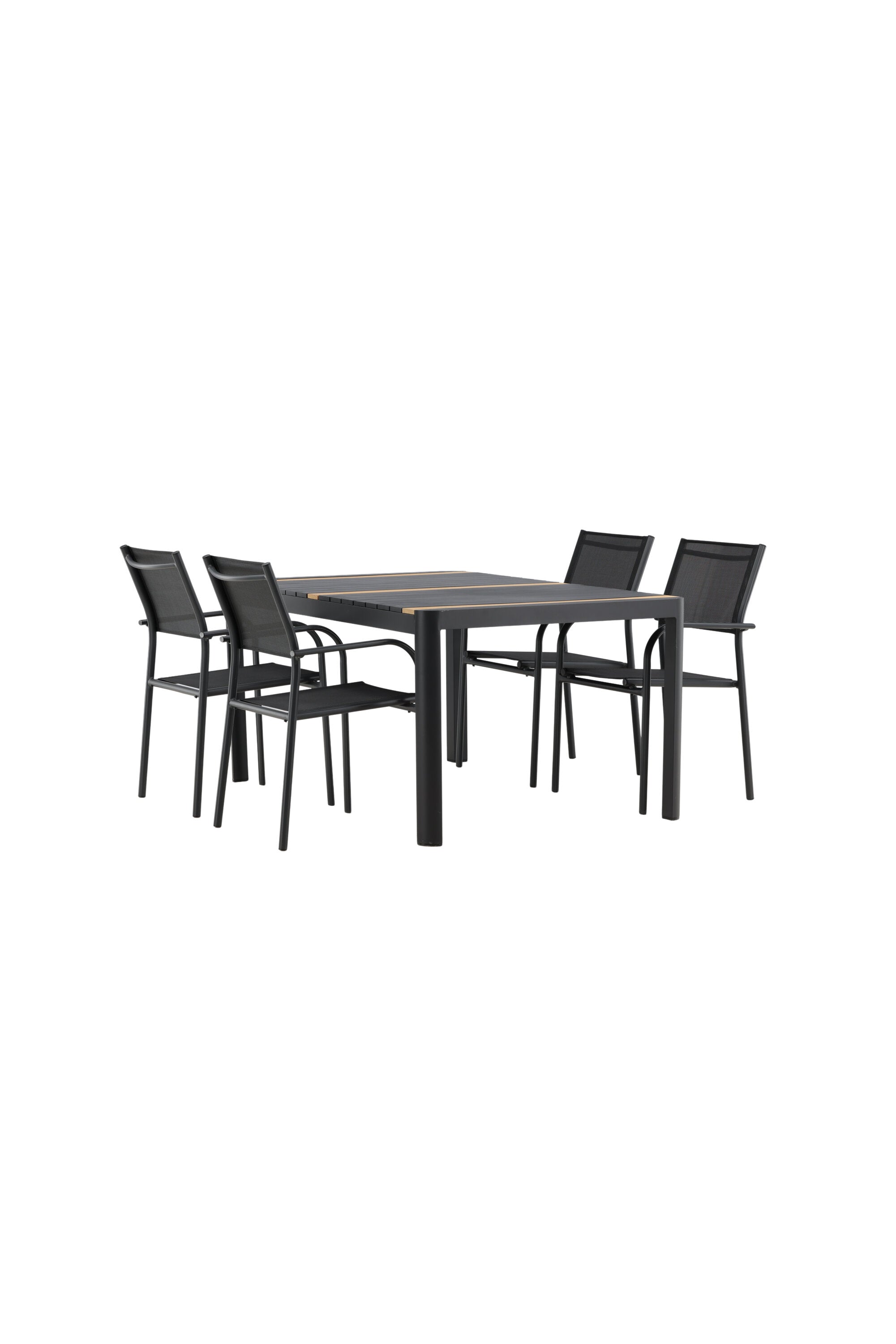 Togo - Jídelní stůl - Černá / Teak - Allu / Teak - 150*100 _1+ křeslo Santorini (stohovatelné) - Černá alu / Černá textilie _4