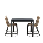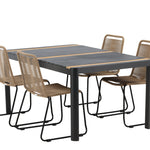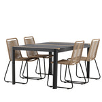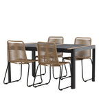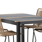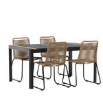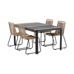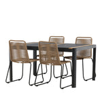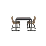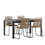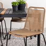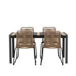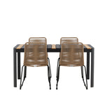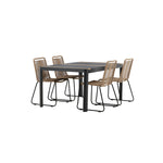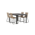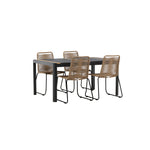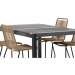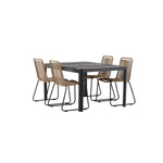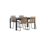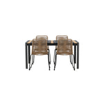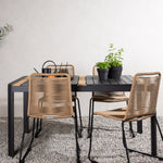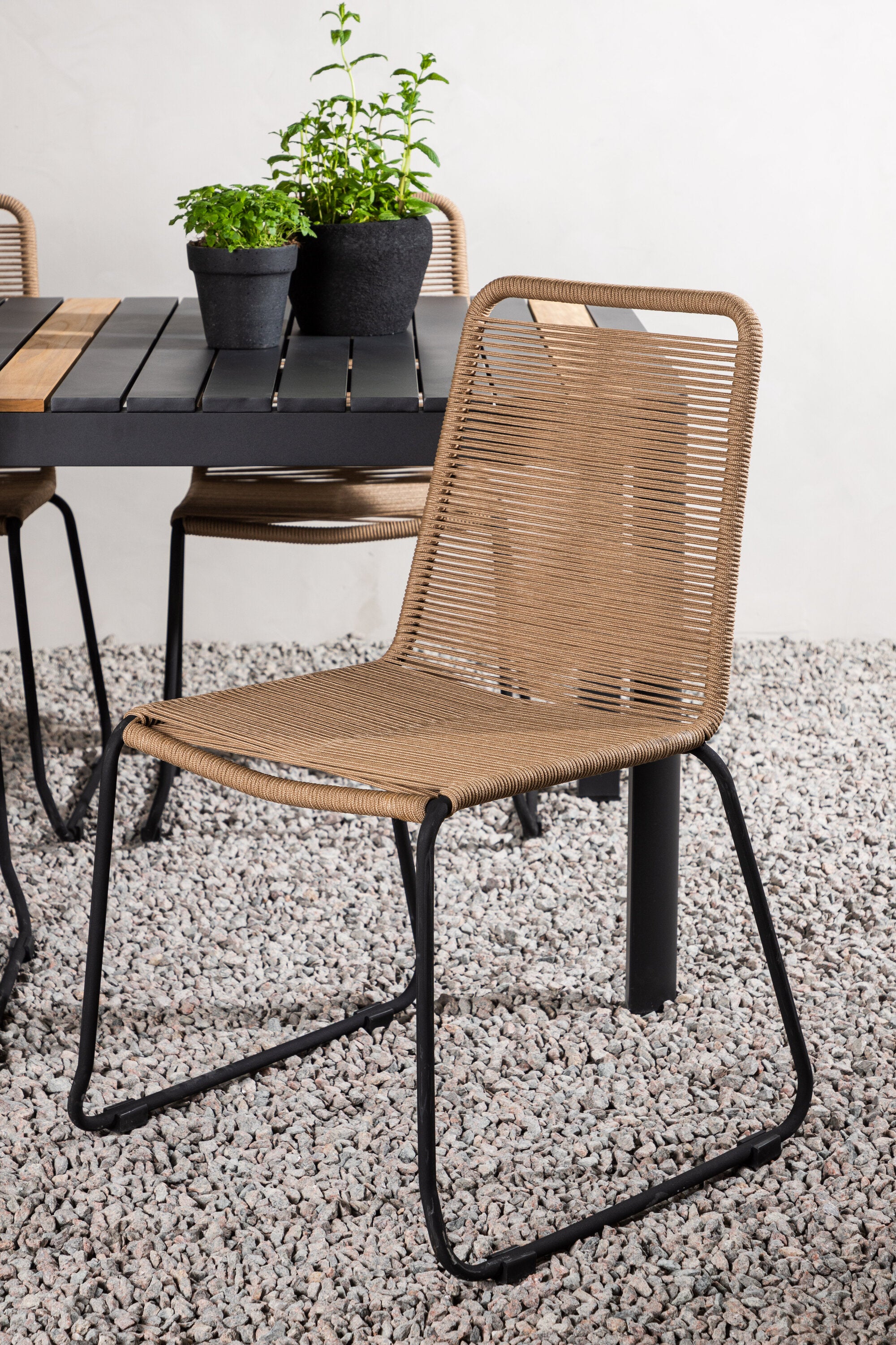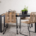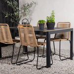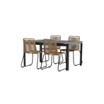 Stylový, odolný a elegantní – skupina potravin, kde má každý pravdu! Jídelní stůl Togo má vkusnou verzi s obdélníkovou stolní deskou v černé a teakové barvě dřeva a podvozkem v černém hliníku. Přímý severský design je klasický i nadčasový. Rozměry: 150x100 cm. Zde v moderní kombinaci s jídelními židlemi v barvě latte ze série Lindos. Židle mají stylové úzké nohy z černé oceli a sedák z odolného béžového provazu. Zemitá barva působí na nábytek hřejivým dojmem. Pozvěte dopředu na mnoho příjemných jídel!