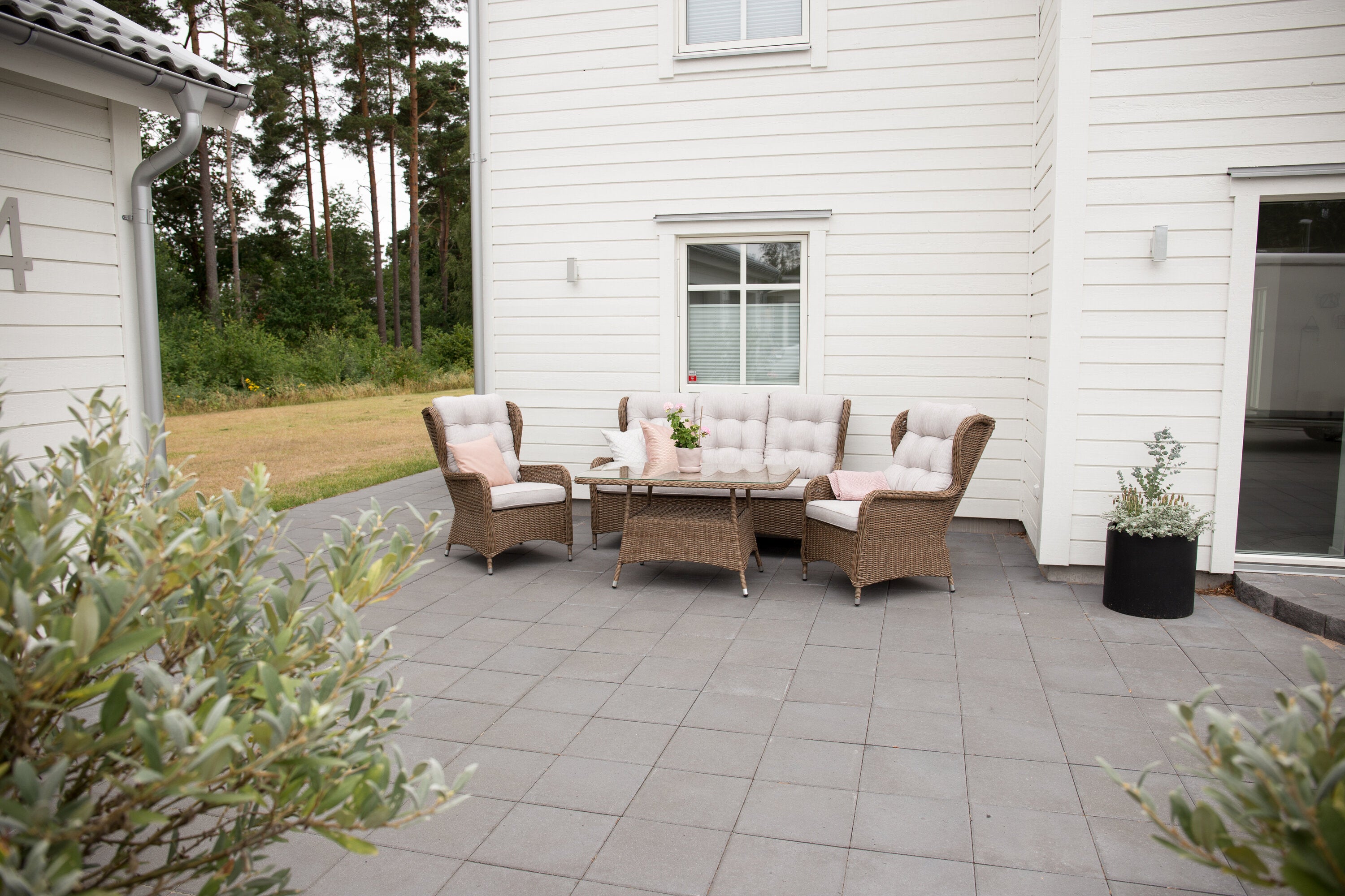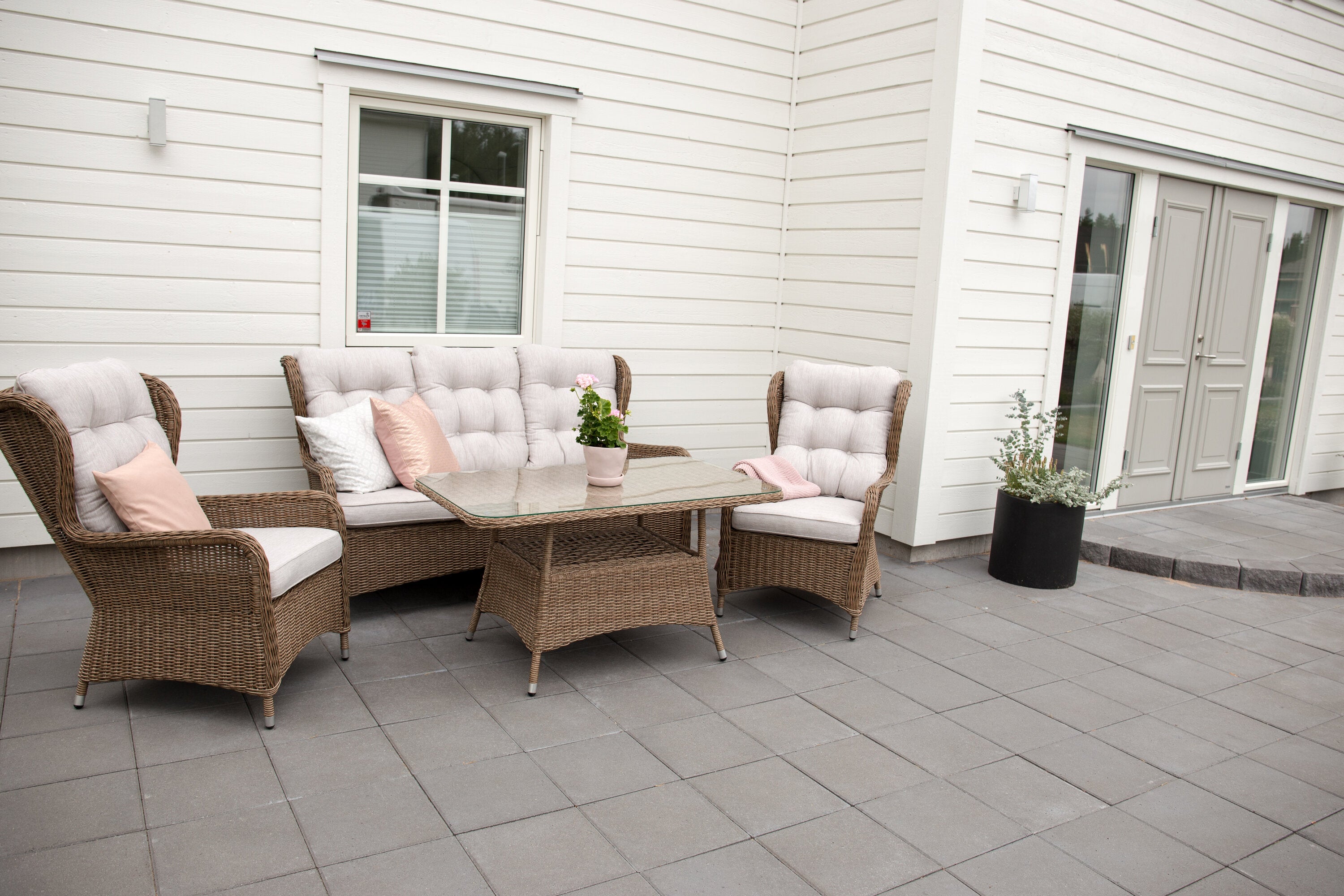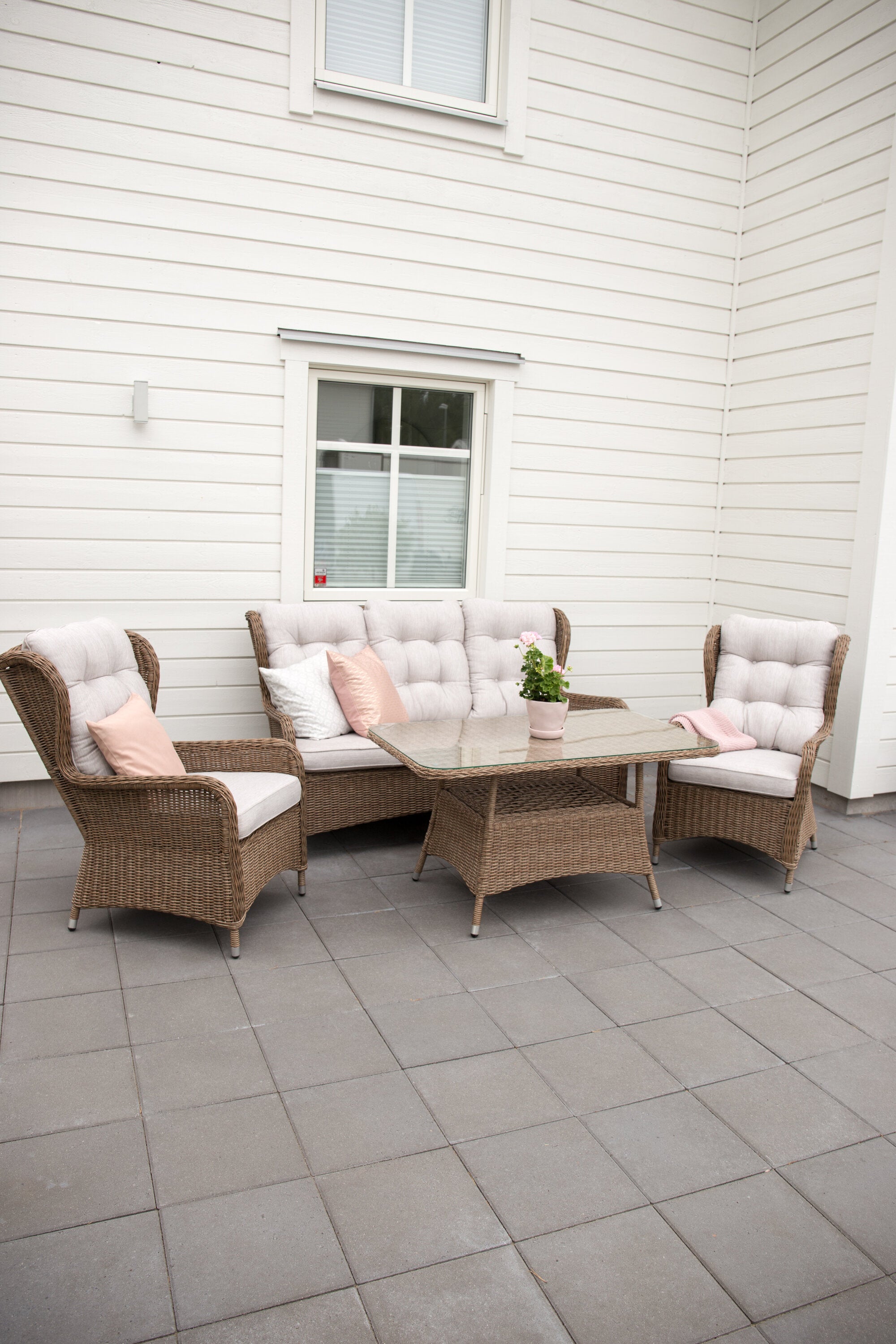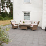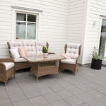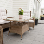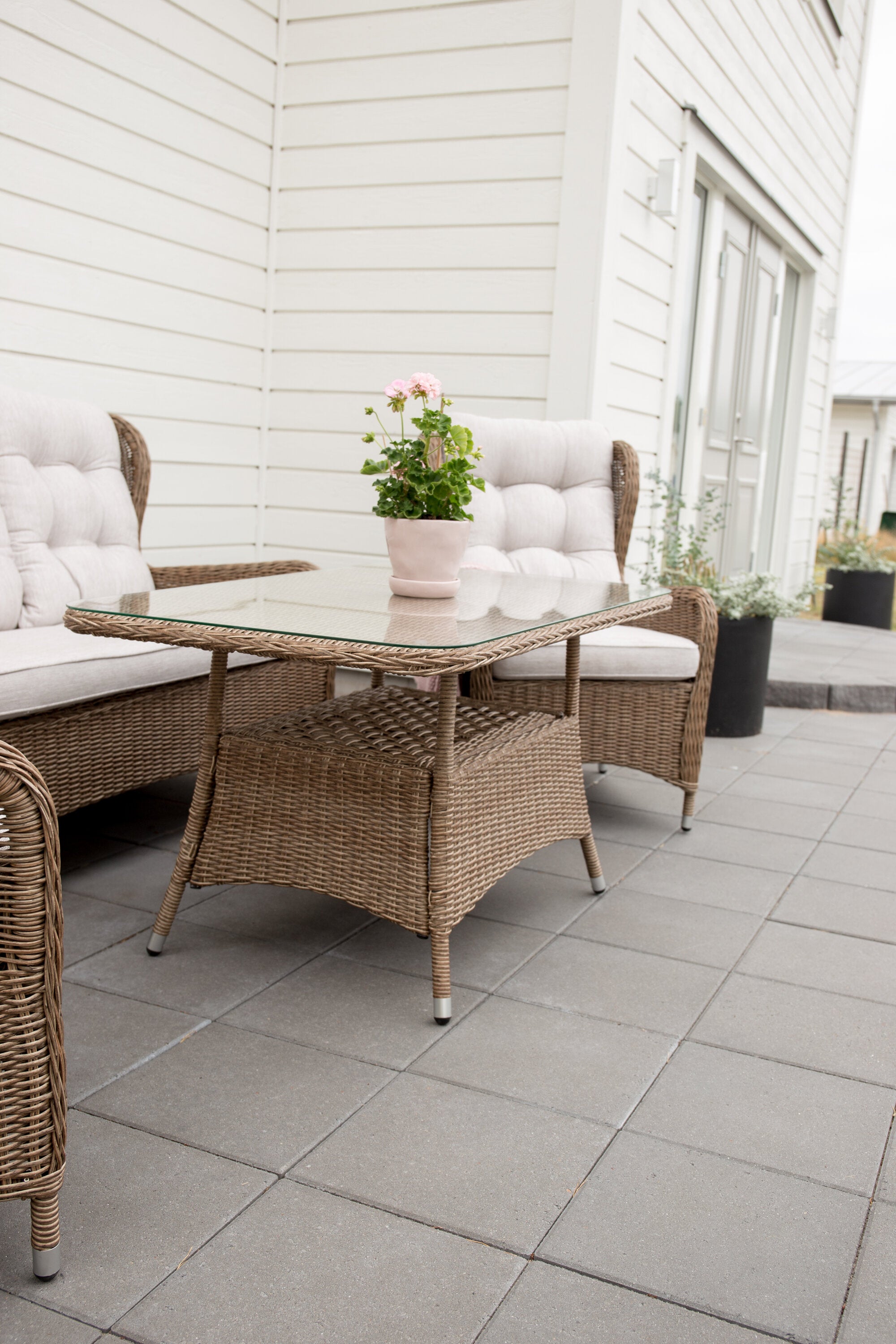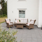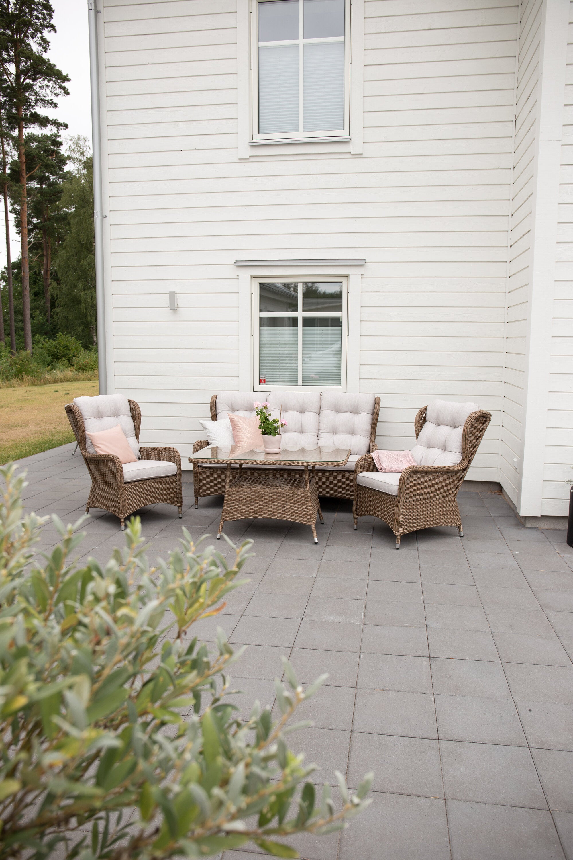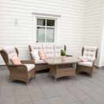 Exkluzivní salonek s kombinací nadčasového designu a fantastického pohodlí na vaší terase nebo terase. Sedací soupravu tvoří třímístná pohovka, dvě rámová křesla a vyšší konferenční stolek s reliéfní policí a skleněnou deskou stolu. Vyrobeno z umělého ratanu v přírodní barvě s hliníkovým rámem. Včetně měkkých, tlustých béžových nakládaných polštářů.