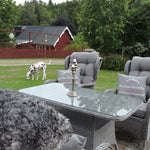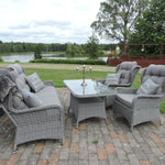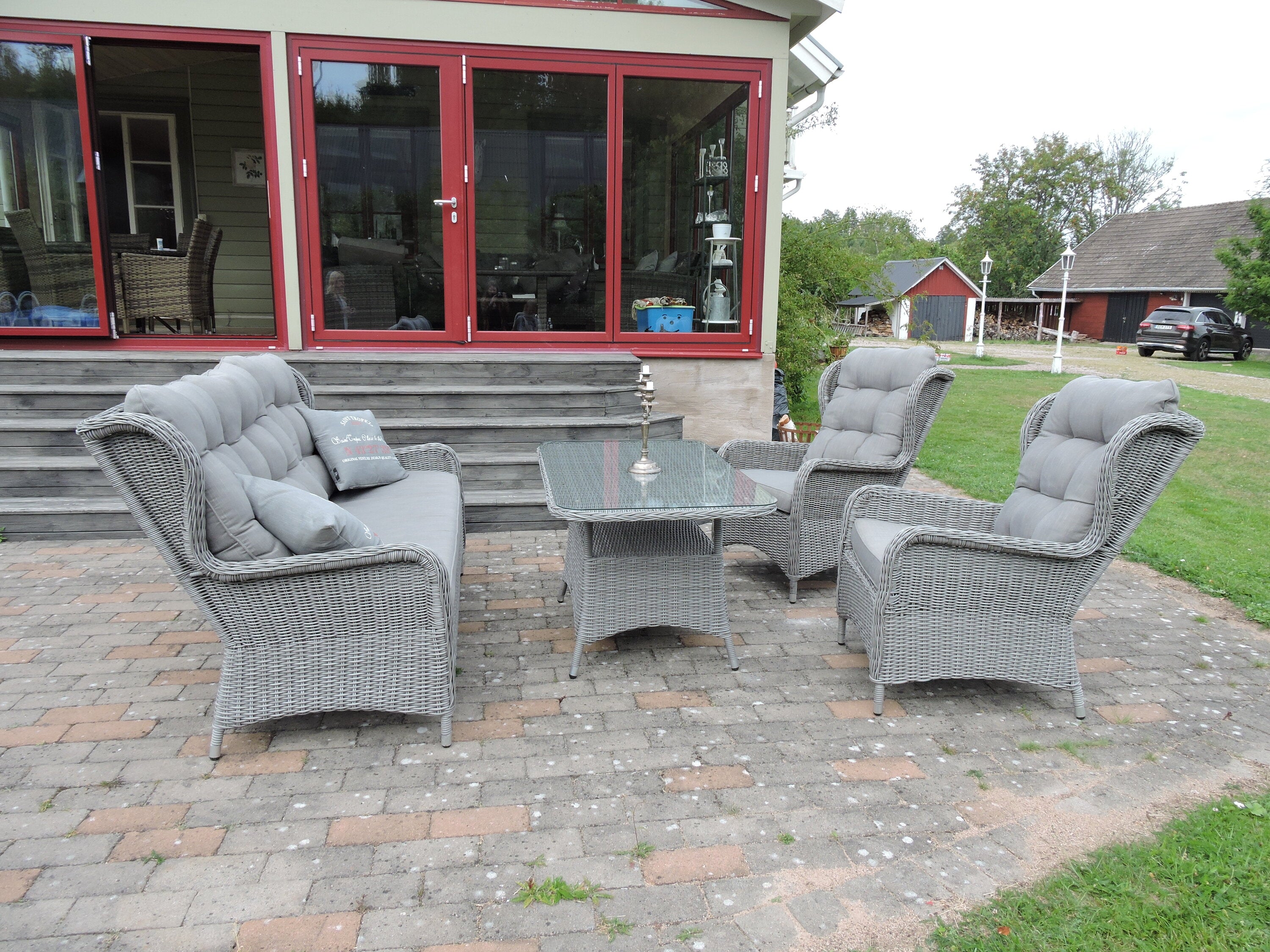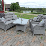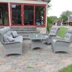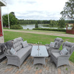 Exkluzivní salonek s kombinací nadčasového designu a fantastického pohodlí pro vaši terasu nebo terasu! Sedací sestavu ze série Washington tvoří trojmístná pohovka, dvě křesla, dále vyšší konferenční stolek s poličkou a stolová deska ze skla. Vyrobeno ze světle šedého umělého ratanu s hliníkovým rámem. Součástí jsou měkké, silné světle šedé nakládané polštáře. Pohodlně se usaďte a připravte se na nádherný noční život tohoto léta!