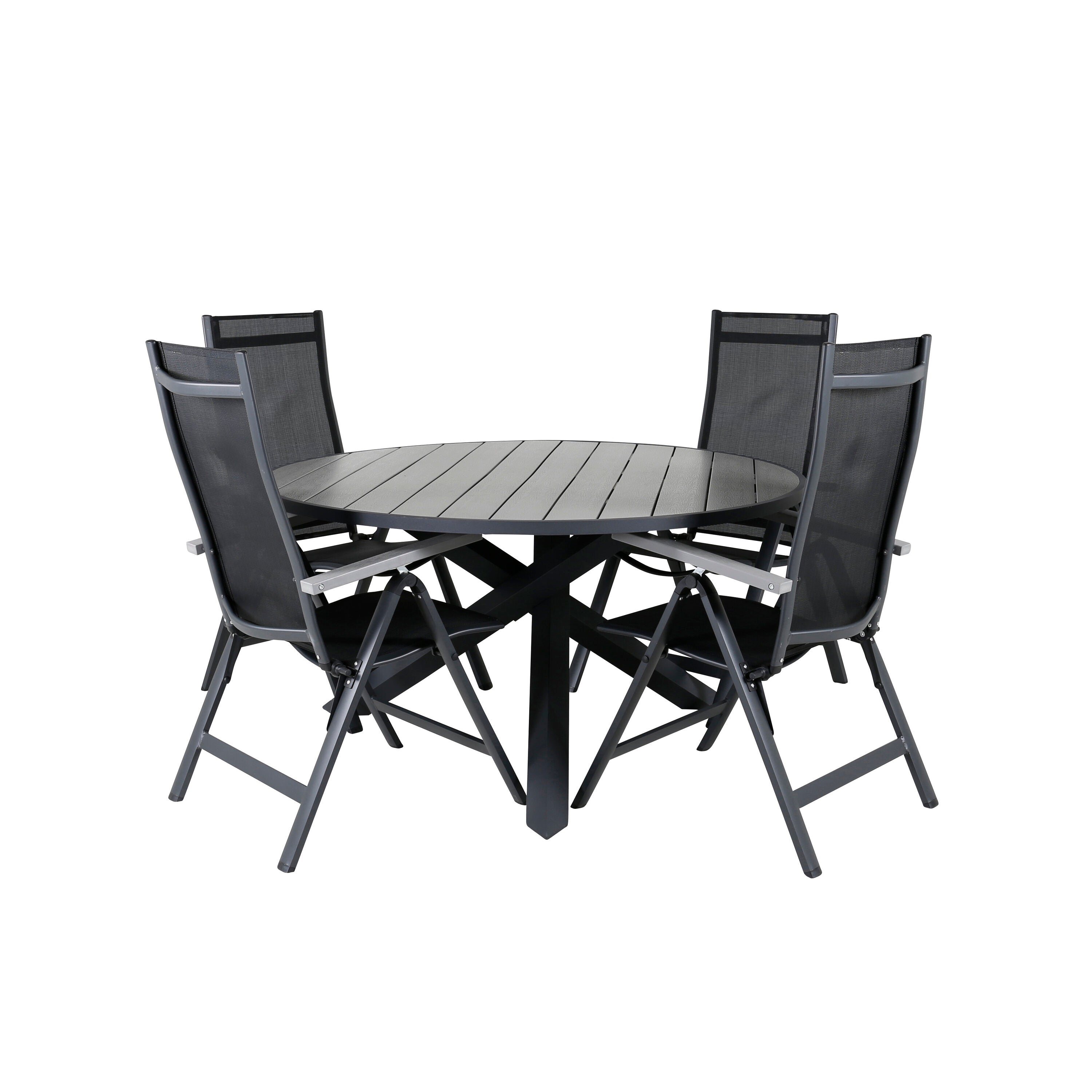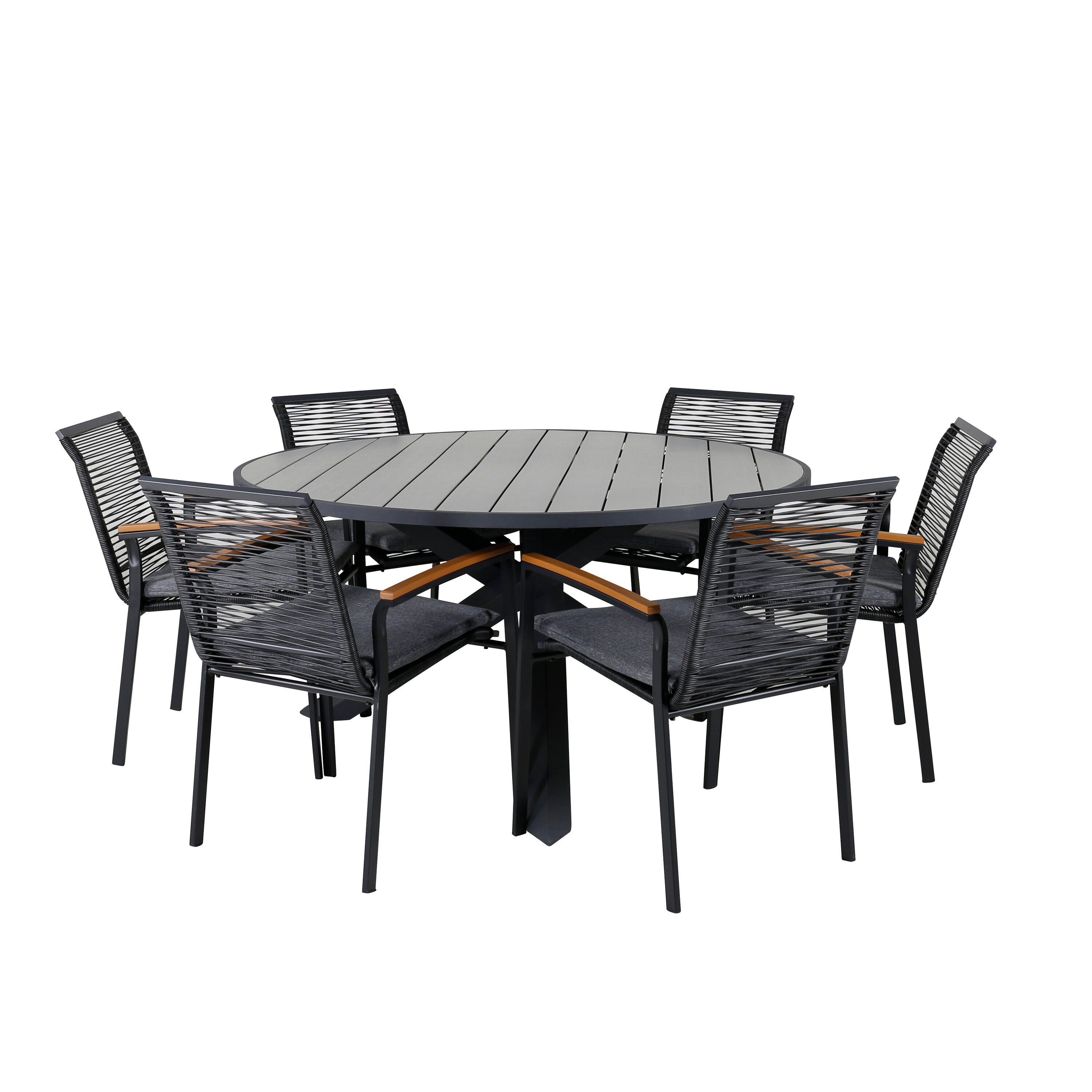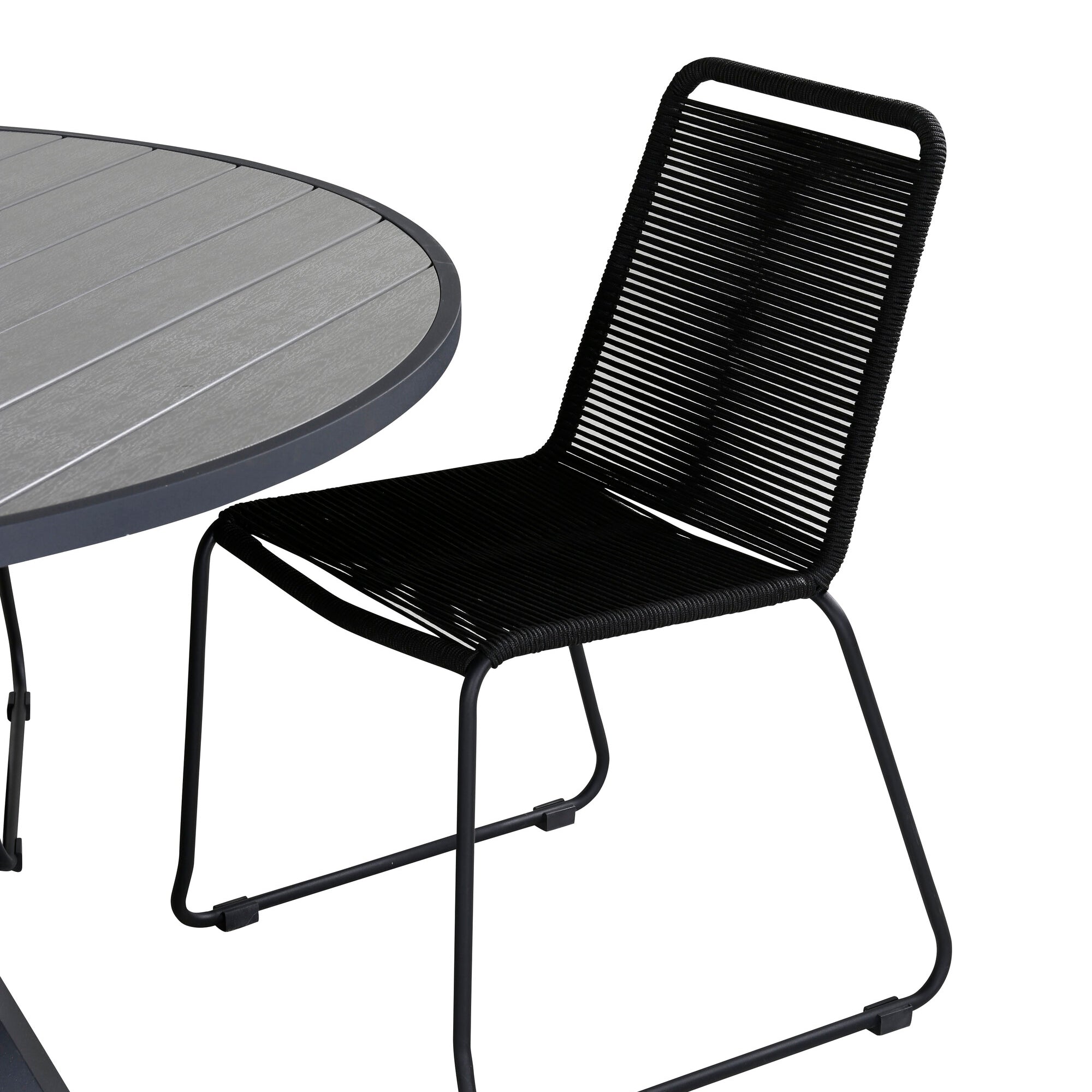 Parma - Stůl ø 140 - Black Alu / Grey Aintwood+Lindos Stohovací židle - Black Alu / Black Rope_4