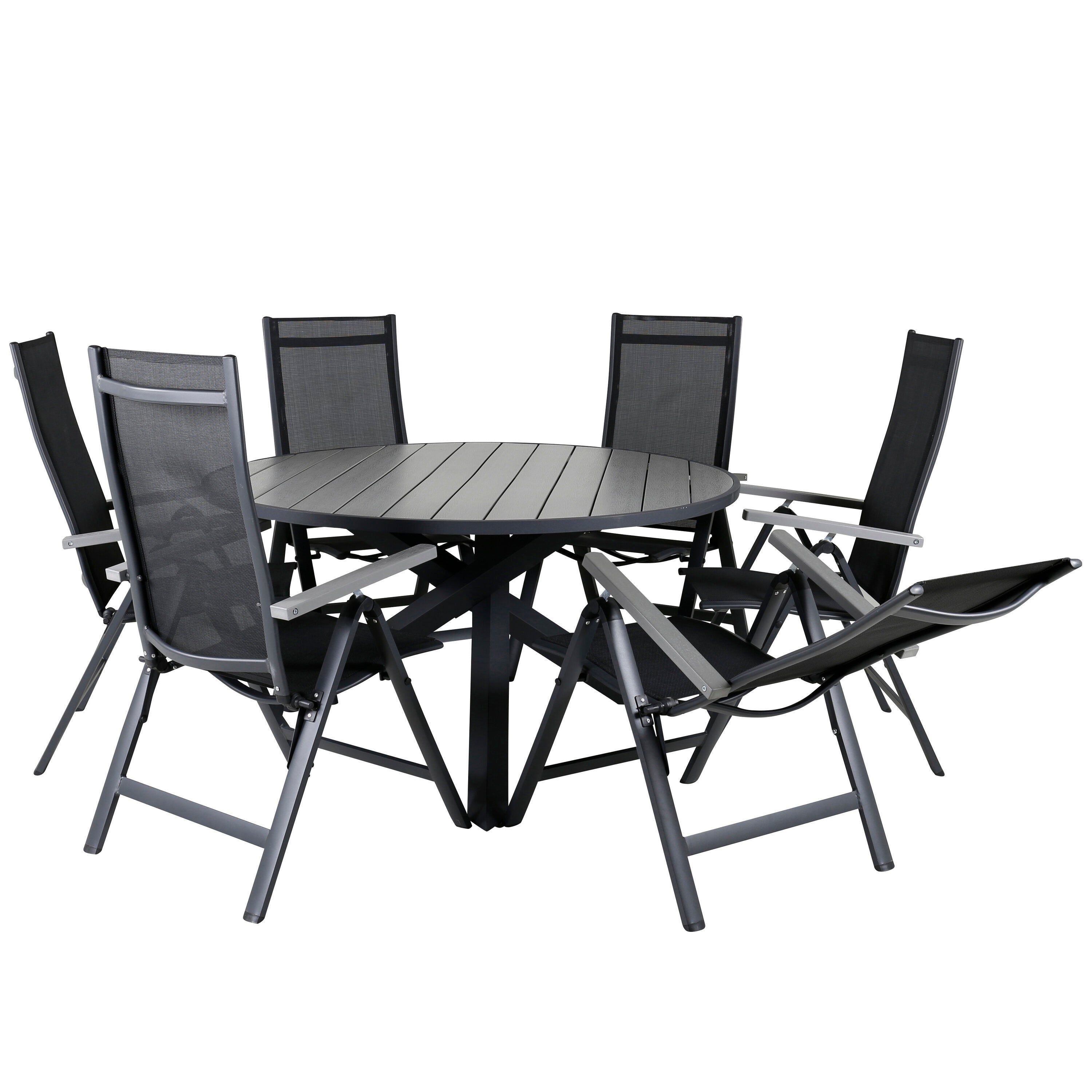 Parma - Stůl ø 140 - Black Alu / Grey Aintwood+Lindos Stohovací židle - Black Alu / Black Rope_6