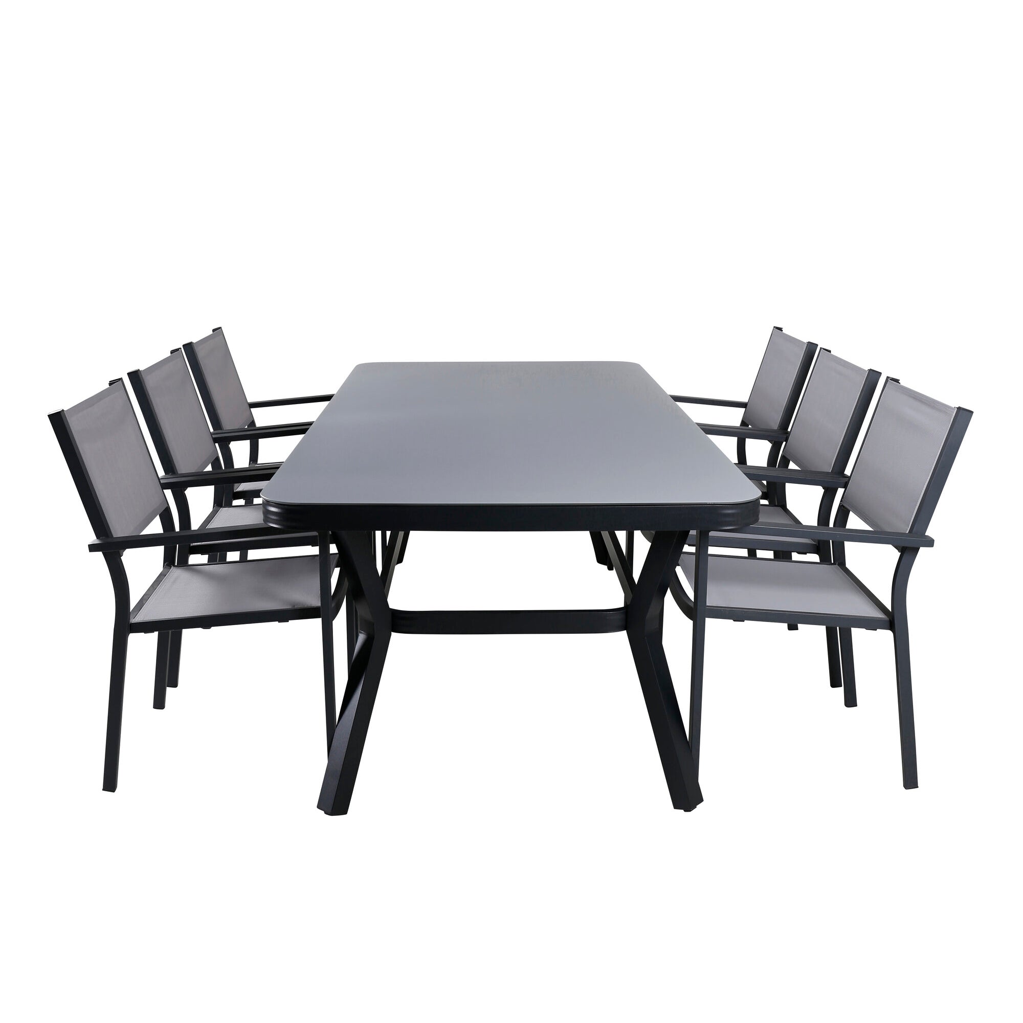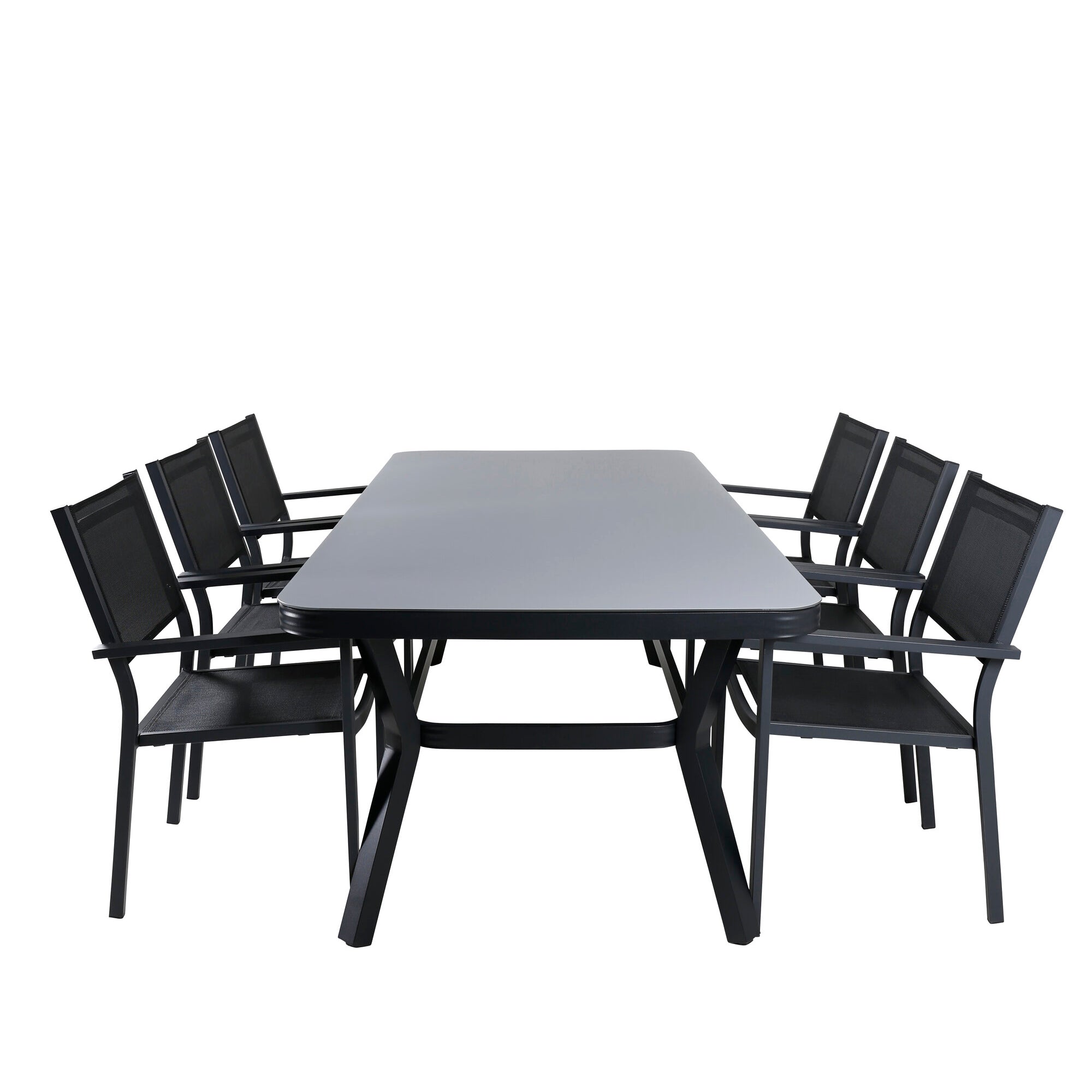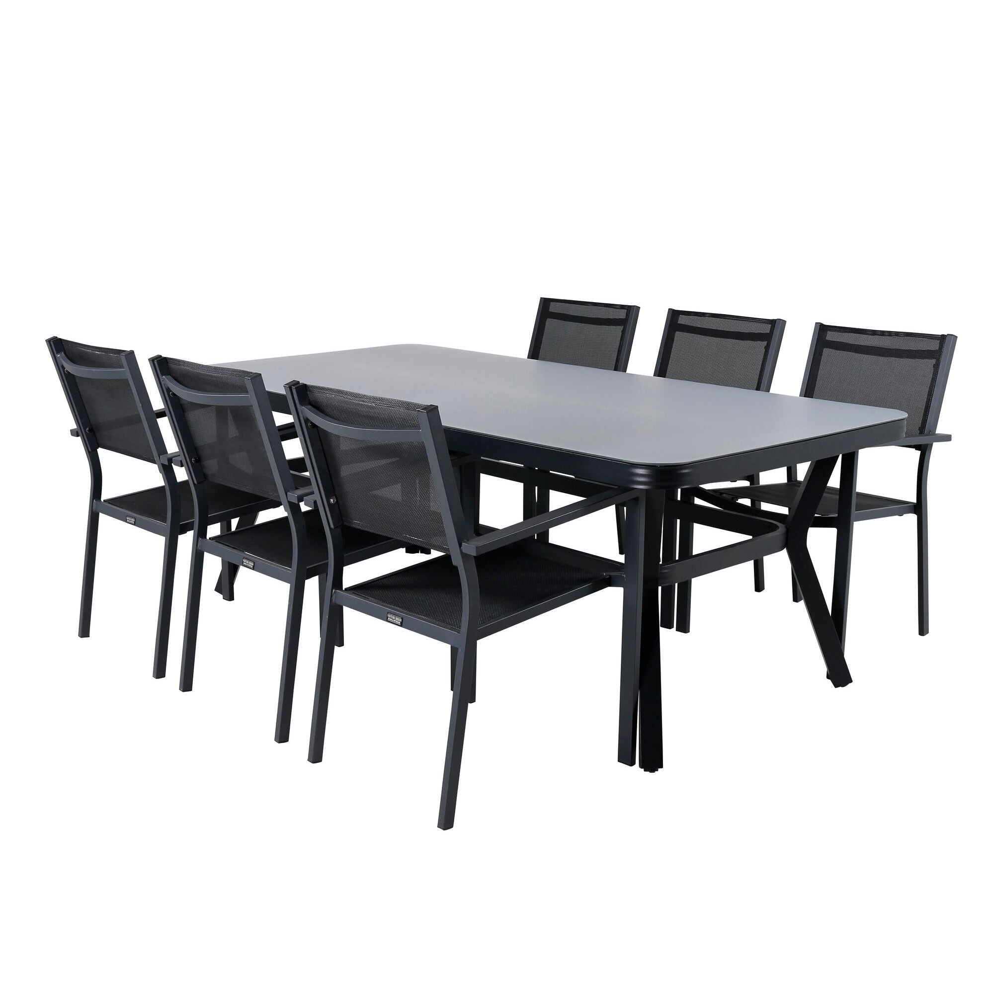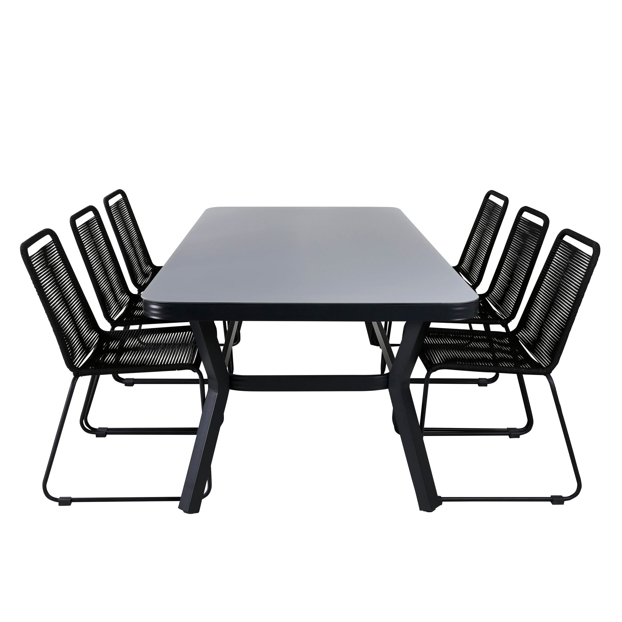 Jídelní stůl Virya - černá Alu / šedé sklo - velký stůl + stohovací židle Lindos - černá Alu / černé lano_6