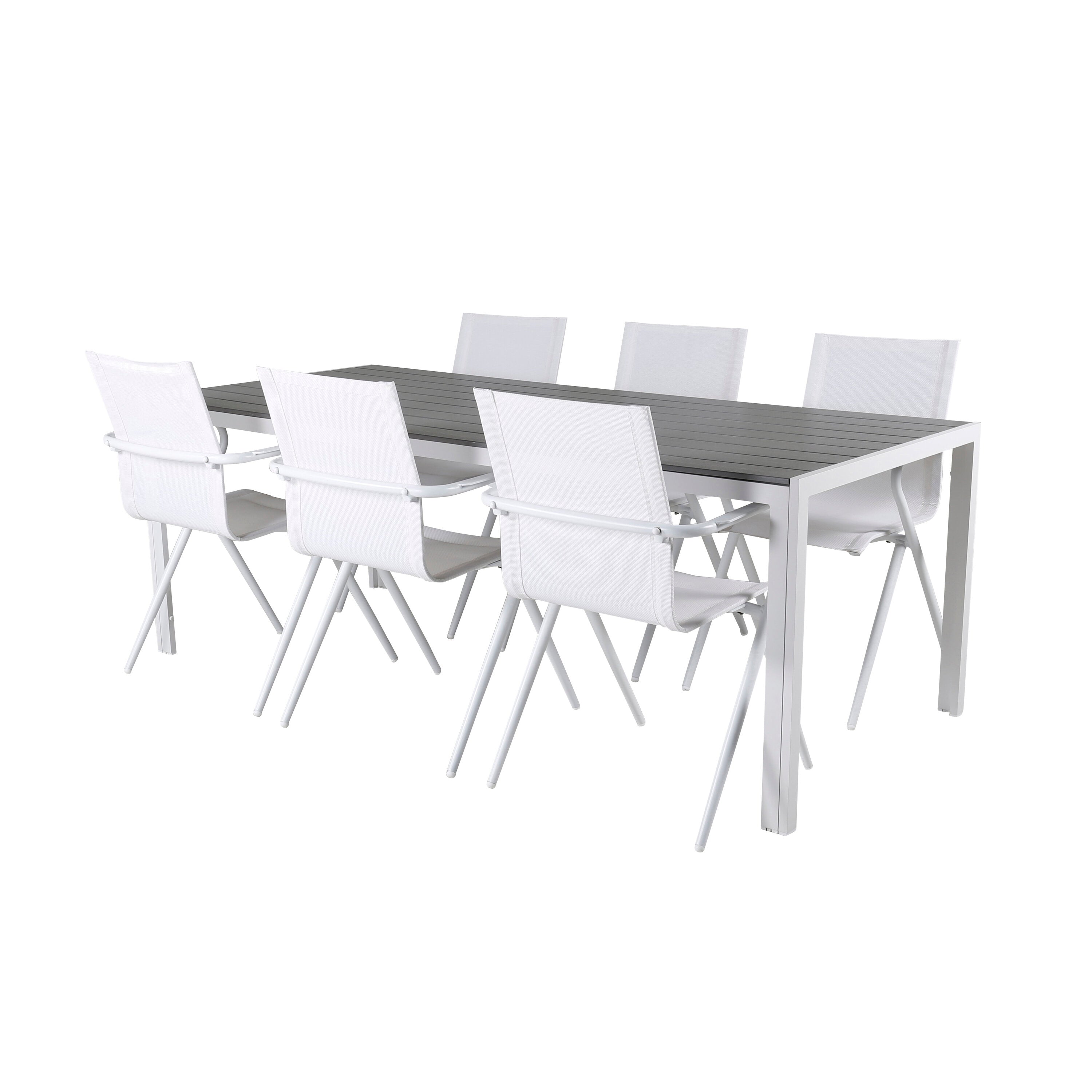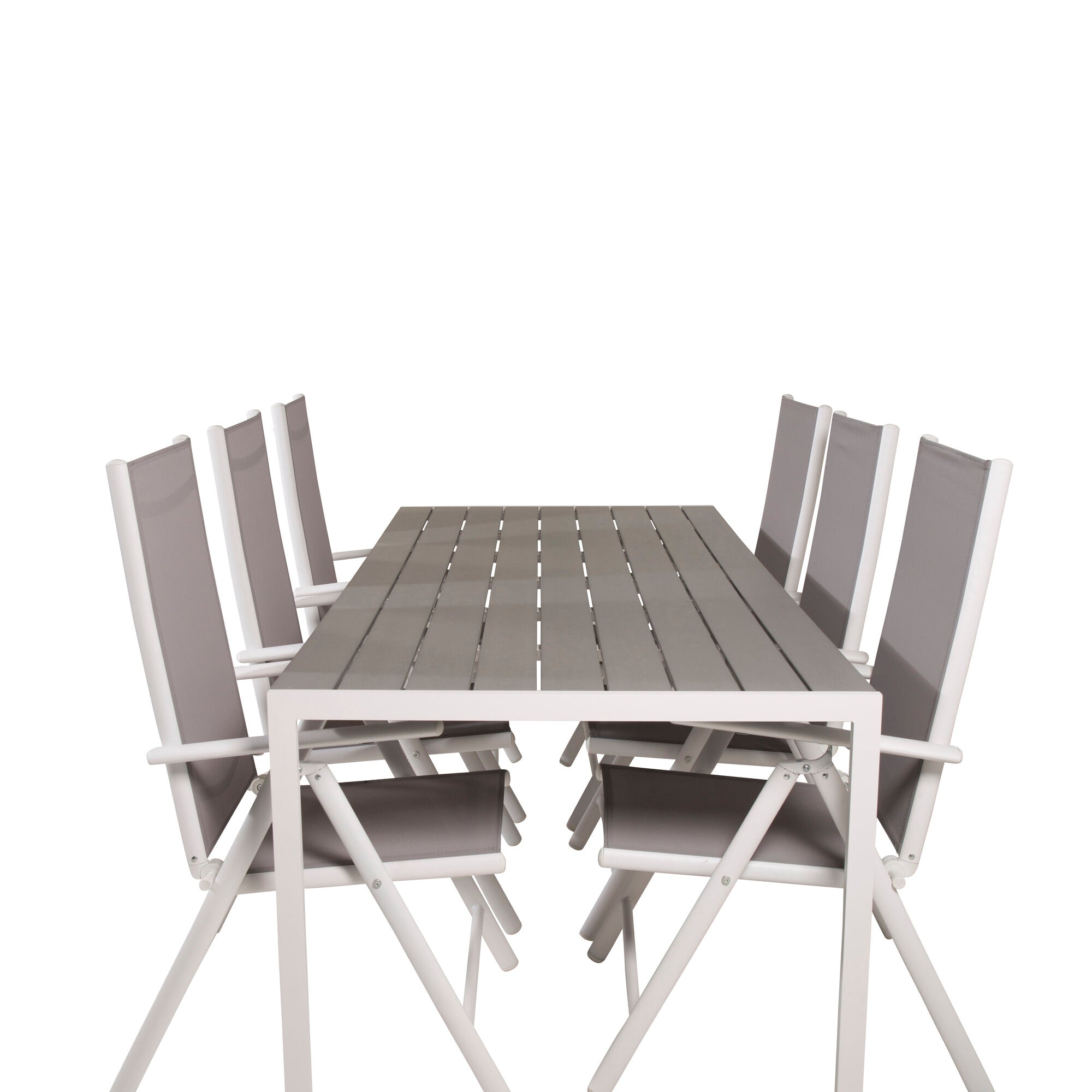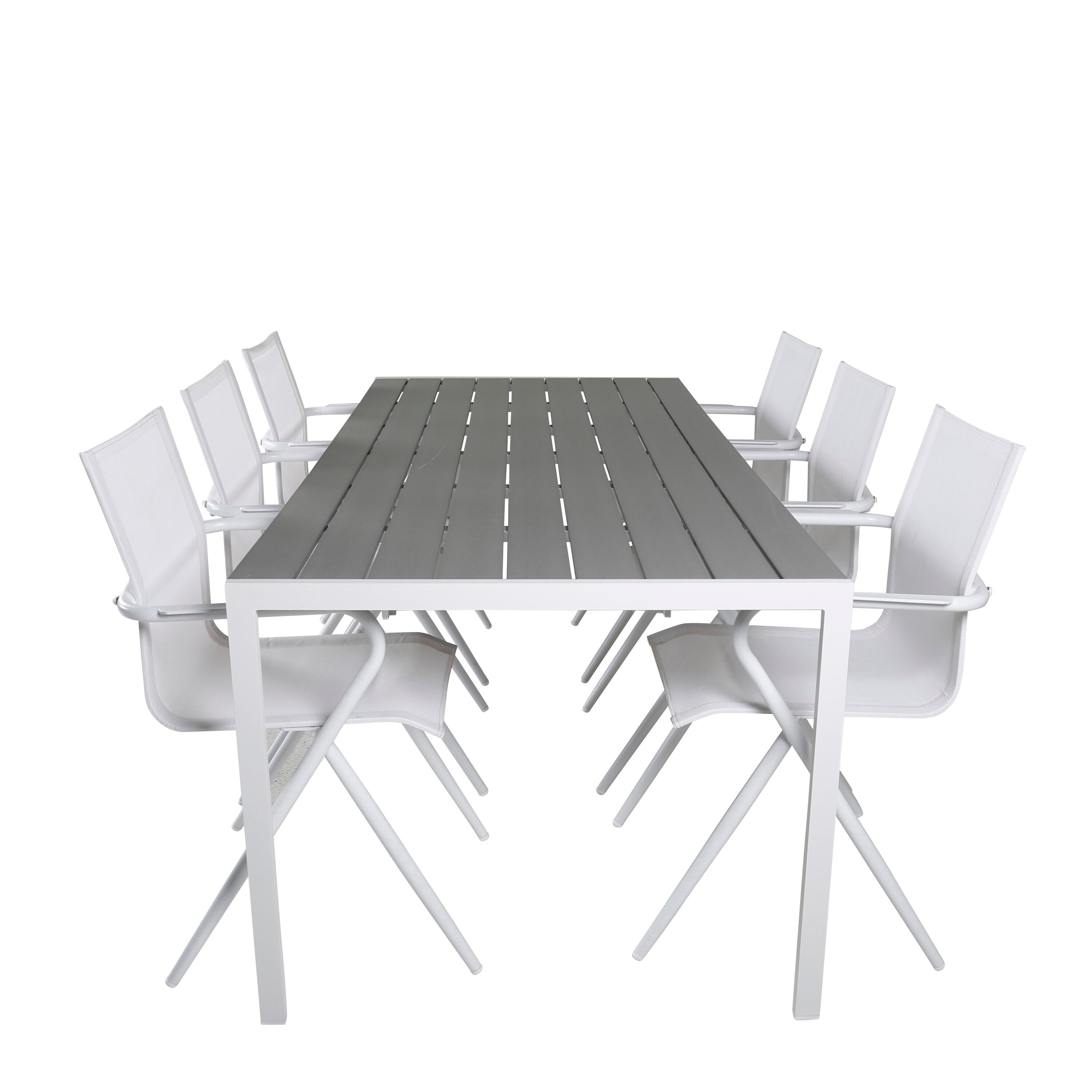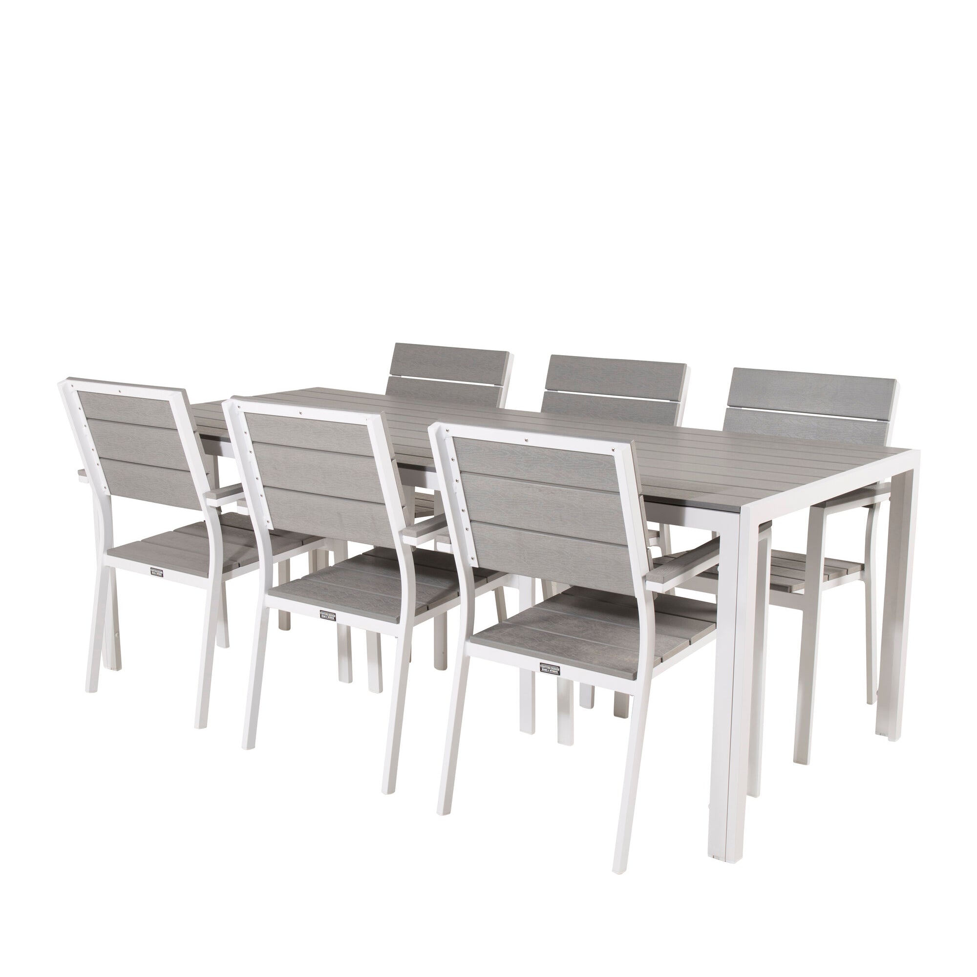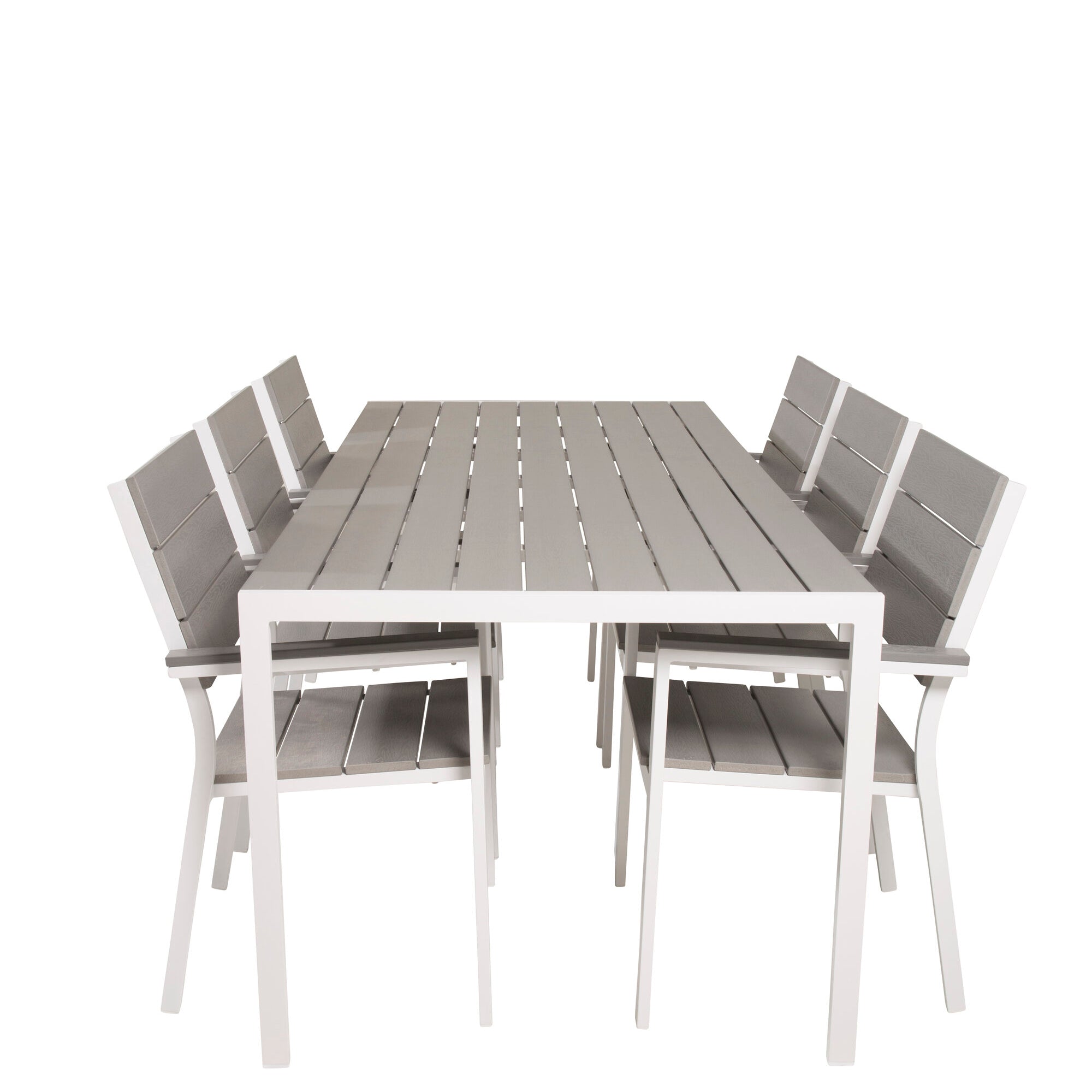 Break matbord - Vit alu / grå aintwood - 205*90+Anna Karmstol (stapelbar) - Grå