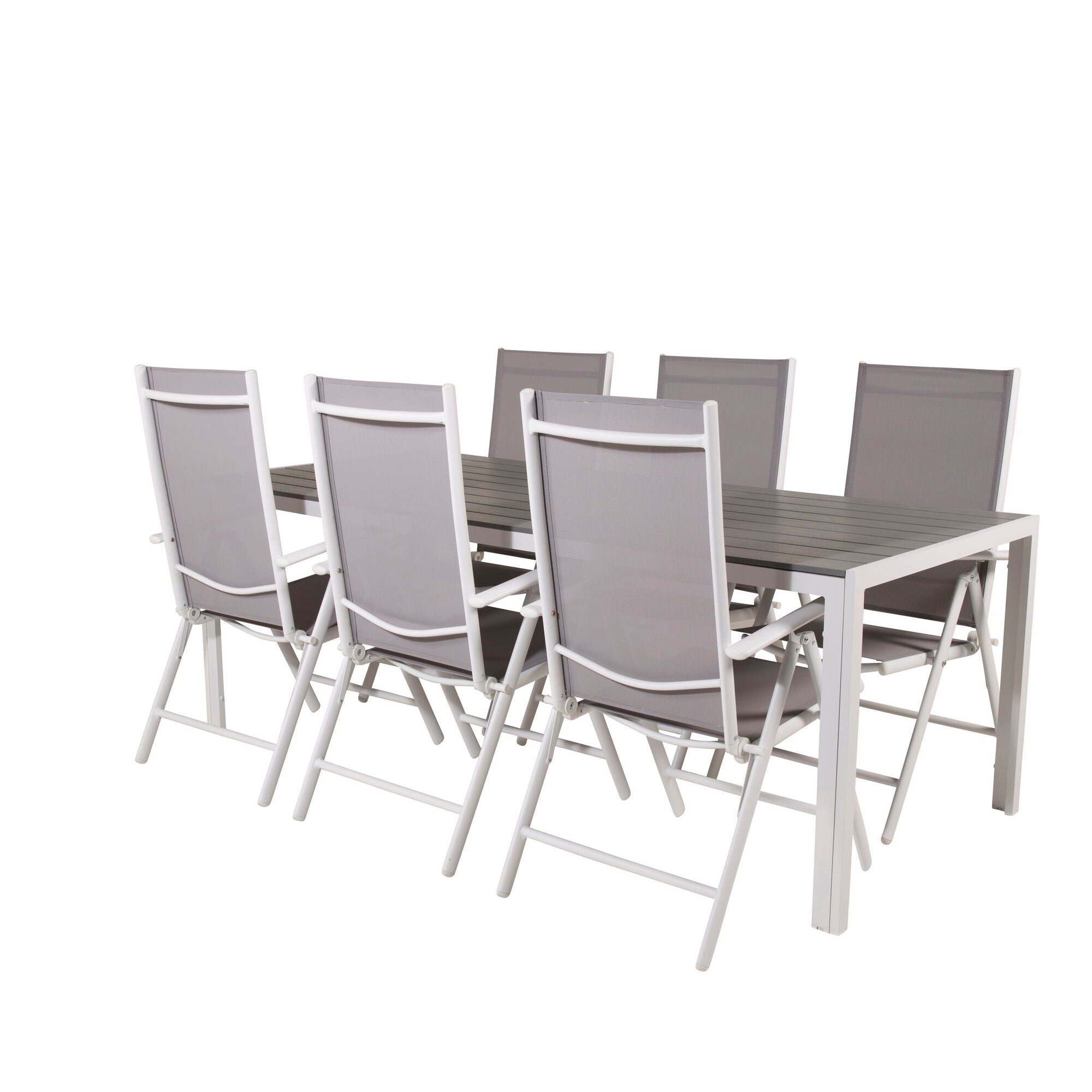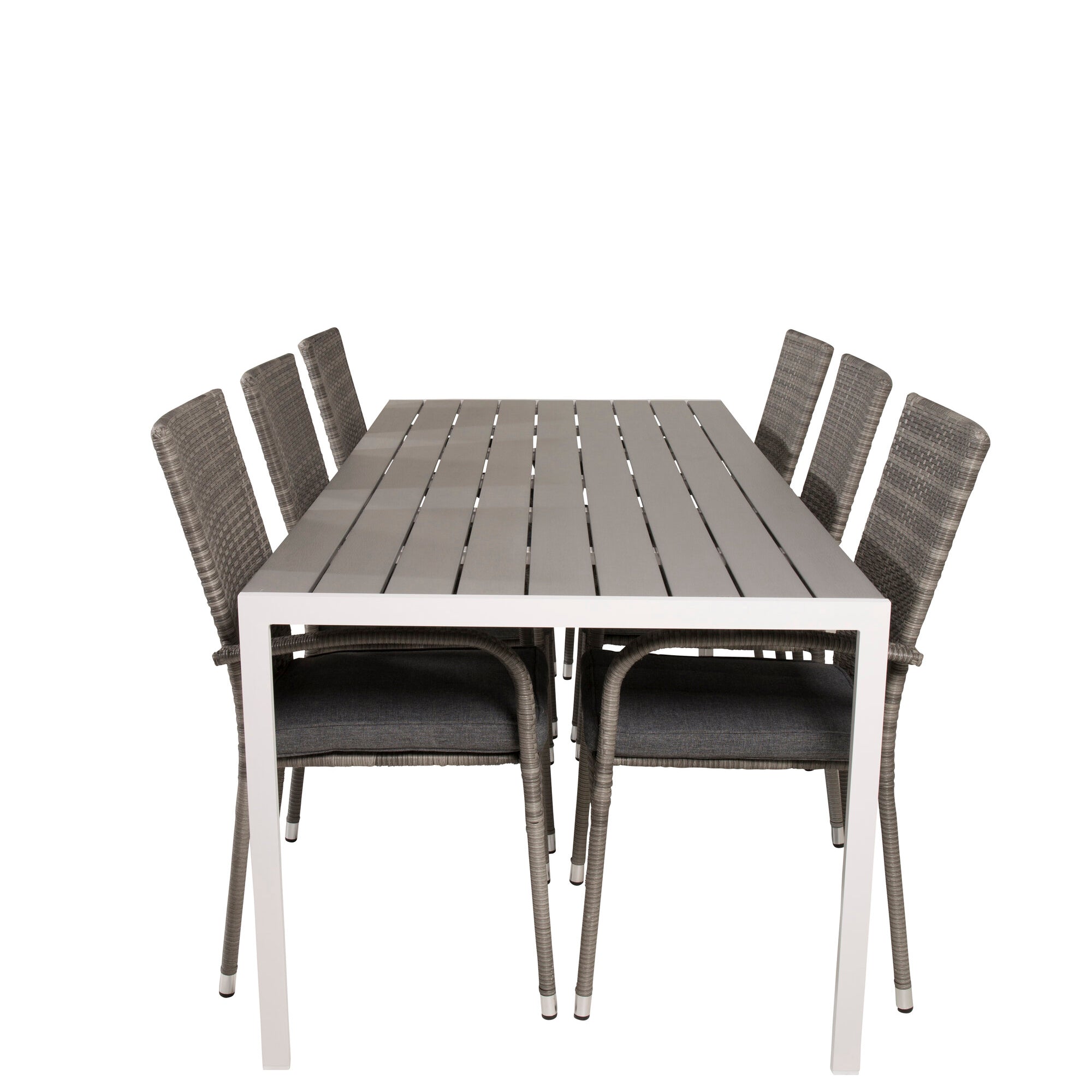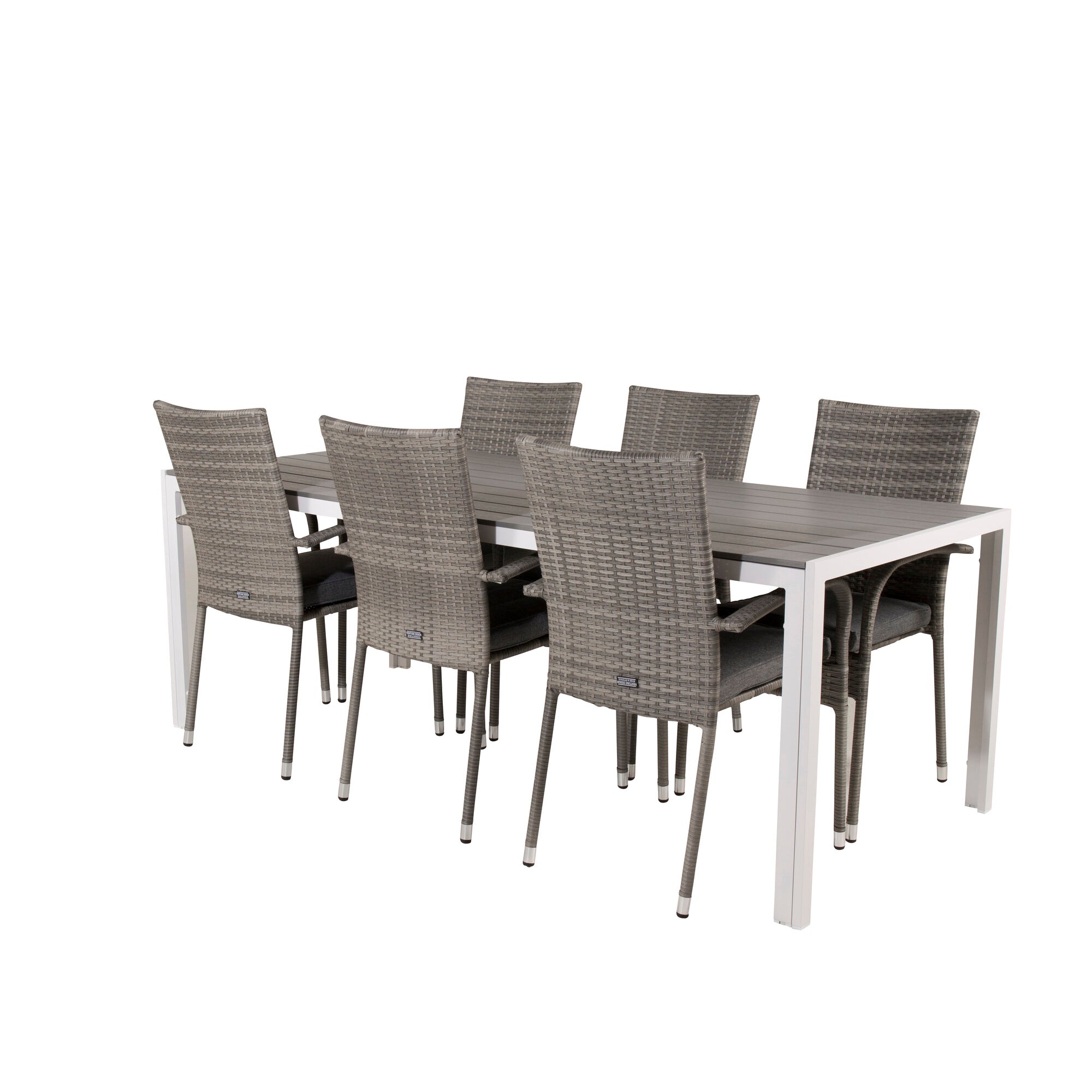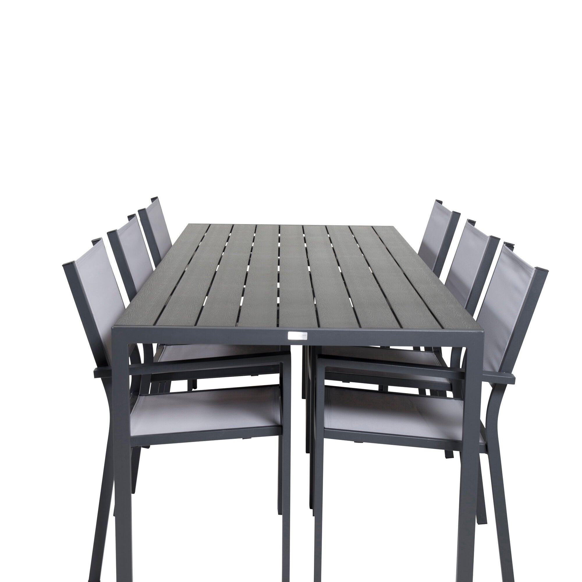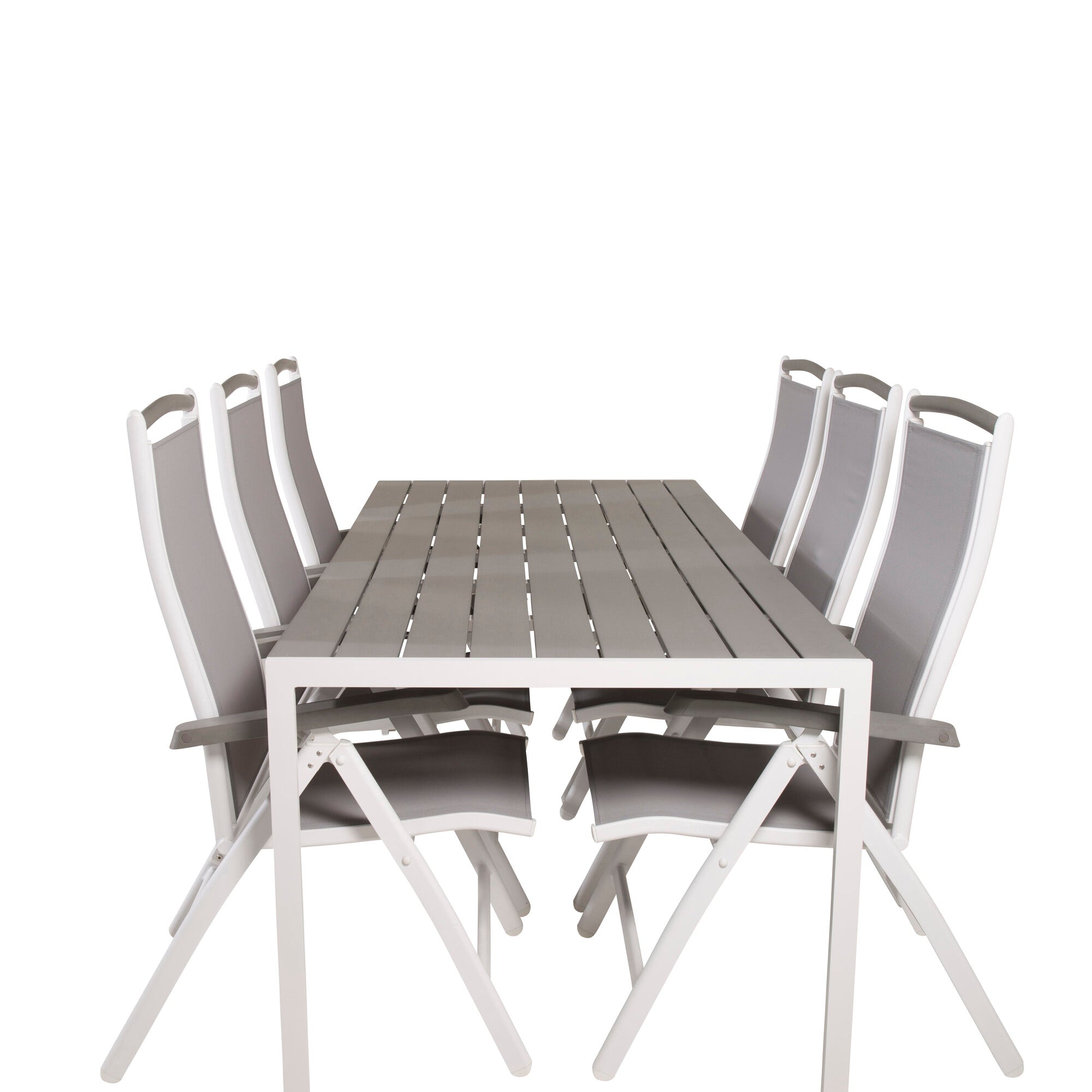 Break matbord - Vit alu / grå aintwood - 205*90+Anna Karmstol (stapelbar) - Grå