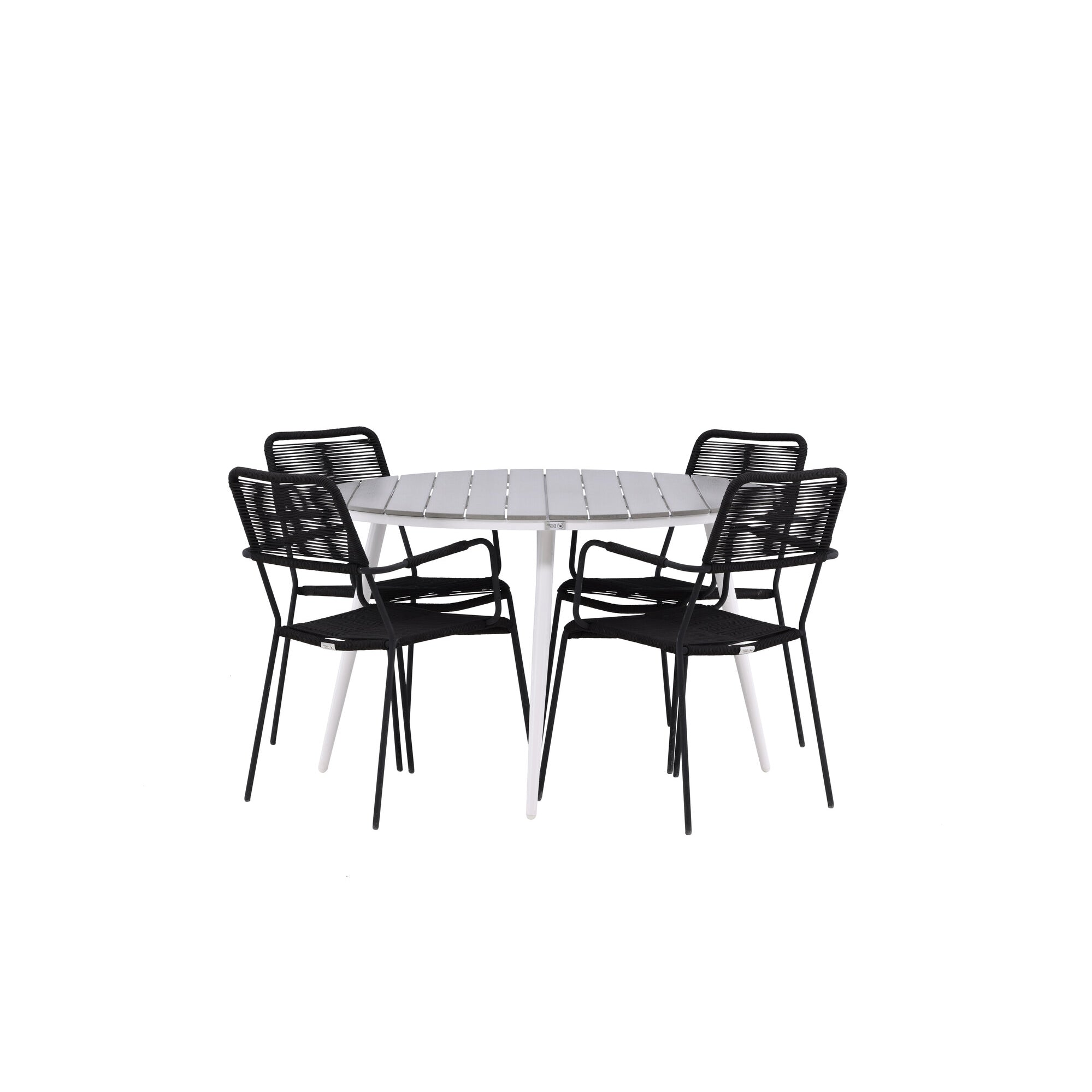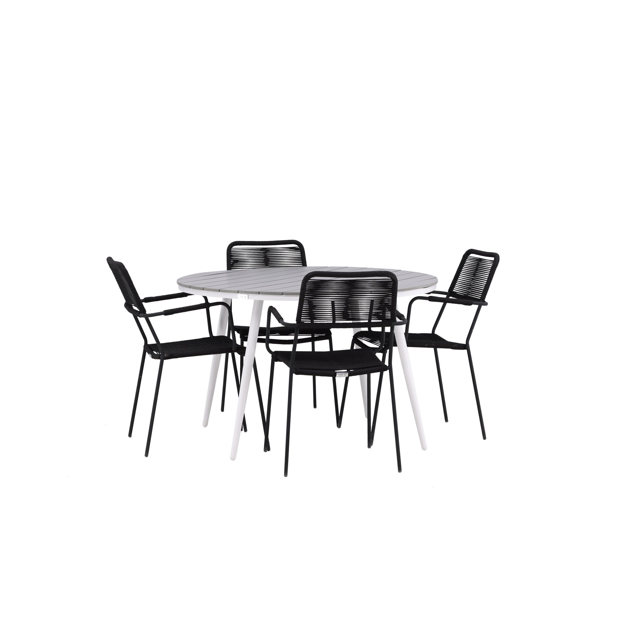 Break - Jídelní stůl kulatý- Bílá / Šedá - Alu / Aintwood - 120ø _1+ Křeslo Lindos - Černá Alu / Černé lano _4