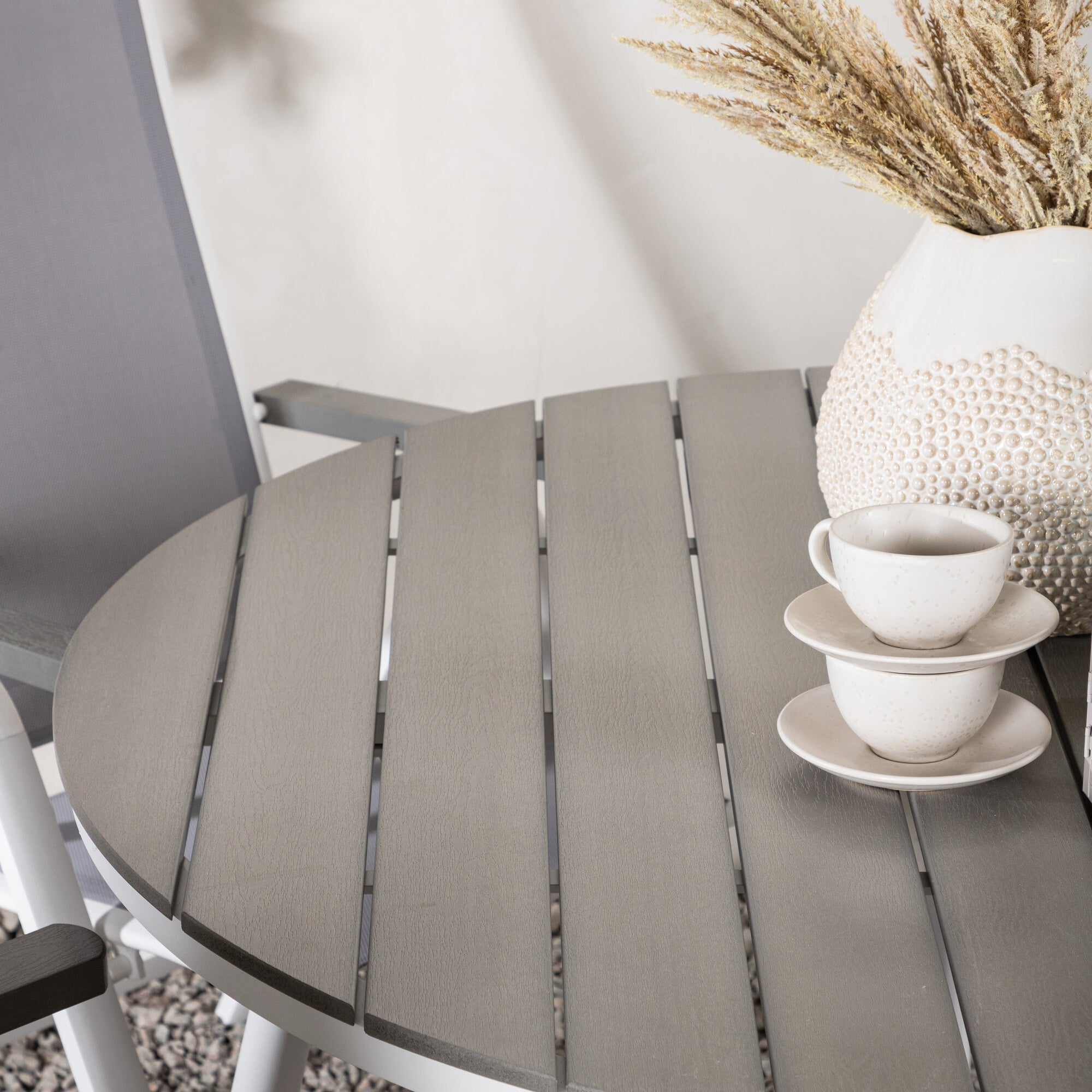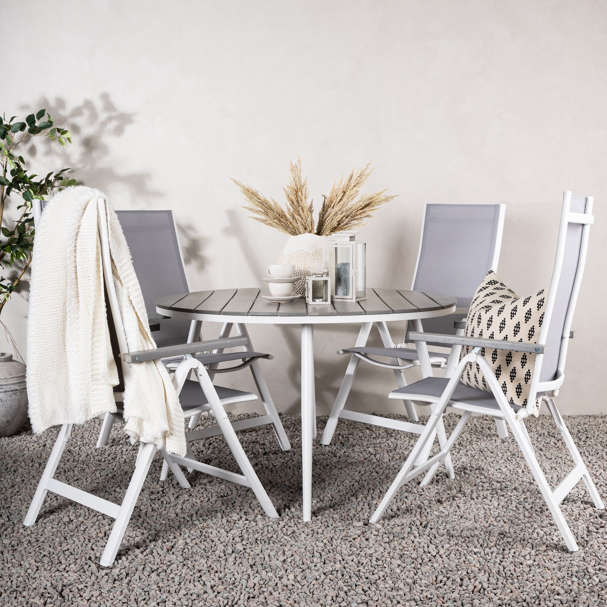Break - Jídelní stůl kulatý - Bílá / Šedá - Alu / Aintwood - 120ø _1+ Lindos Stohovací židle - Černá Alu / Černé lano _4
