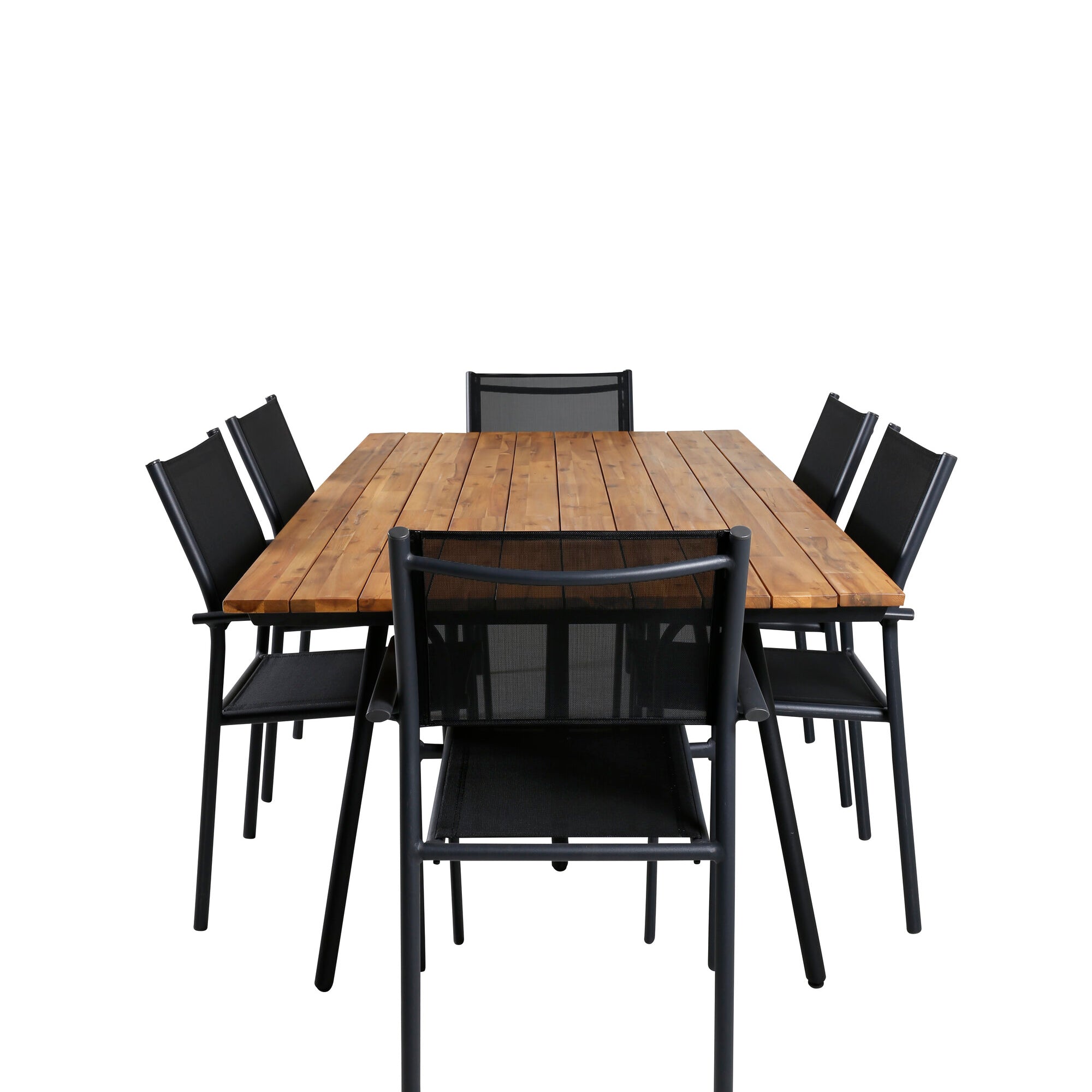 Jídelní stůl Chan – černá ocel / akácie (vzhled teak) – 200 cm + křeslo Santorini (stohovatelné) – černá alu / černá textilie_6